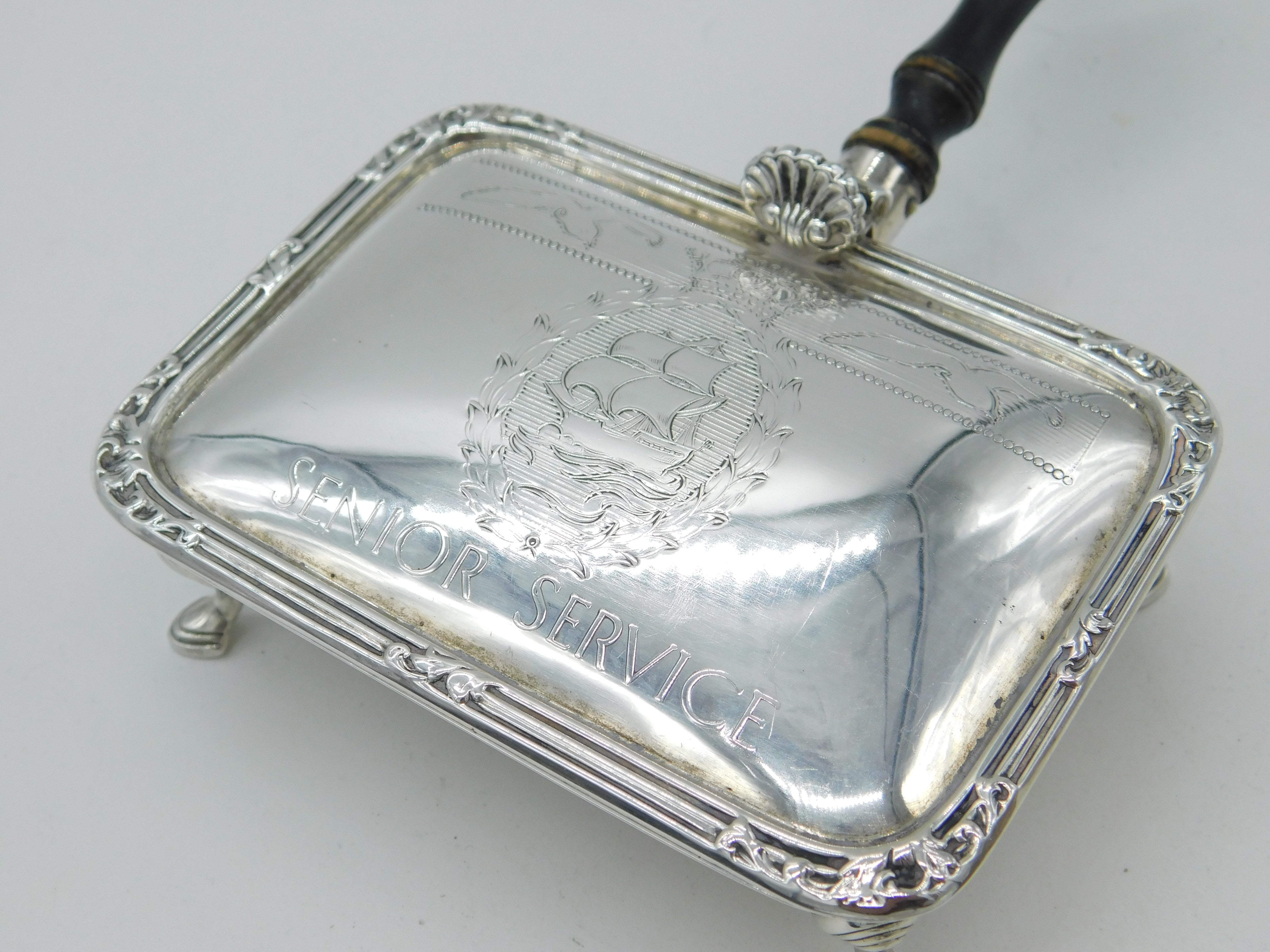 Details: A fantastic and wonderfully designed mid-century sterling silver wooden handle ashtray issued by Senior Service cigarettes almost certainly to executives hallmarked Birmingham 1959 to the edge. This is a wonderful item that would make a perfect gift or addition to any collection. The BOX pictured is for PRESENTATION ONLY and is NOT included in the listings but used to frame the pictures unless specifically stated otherwise.