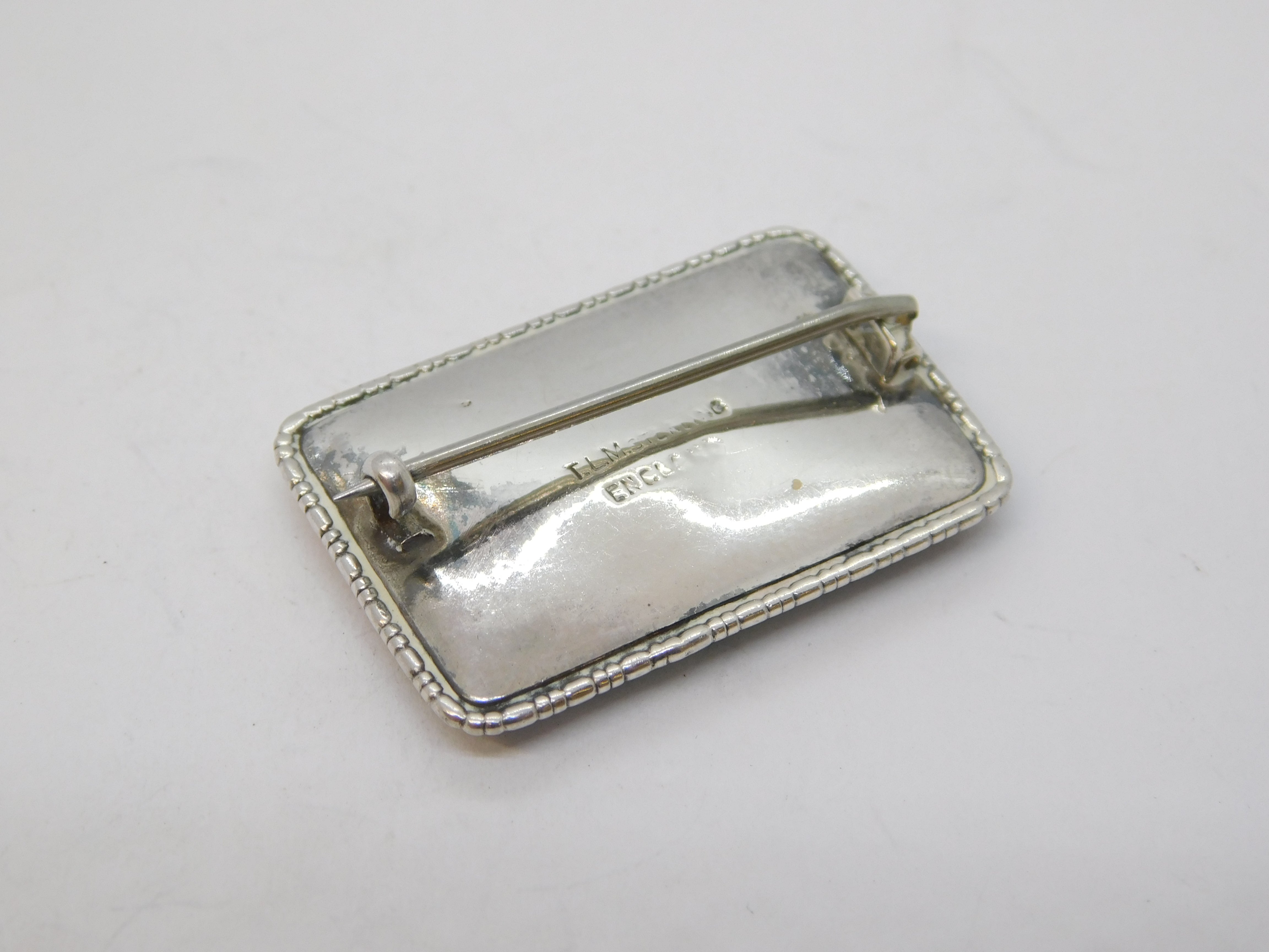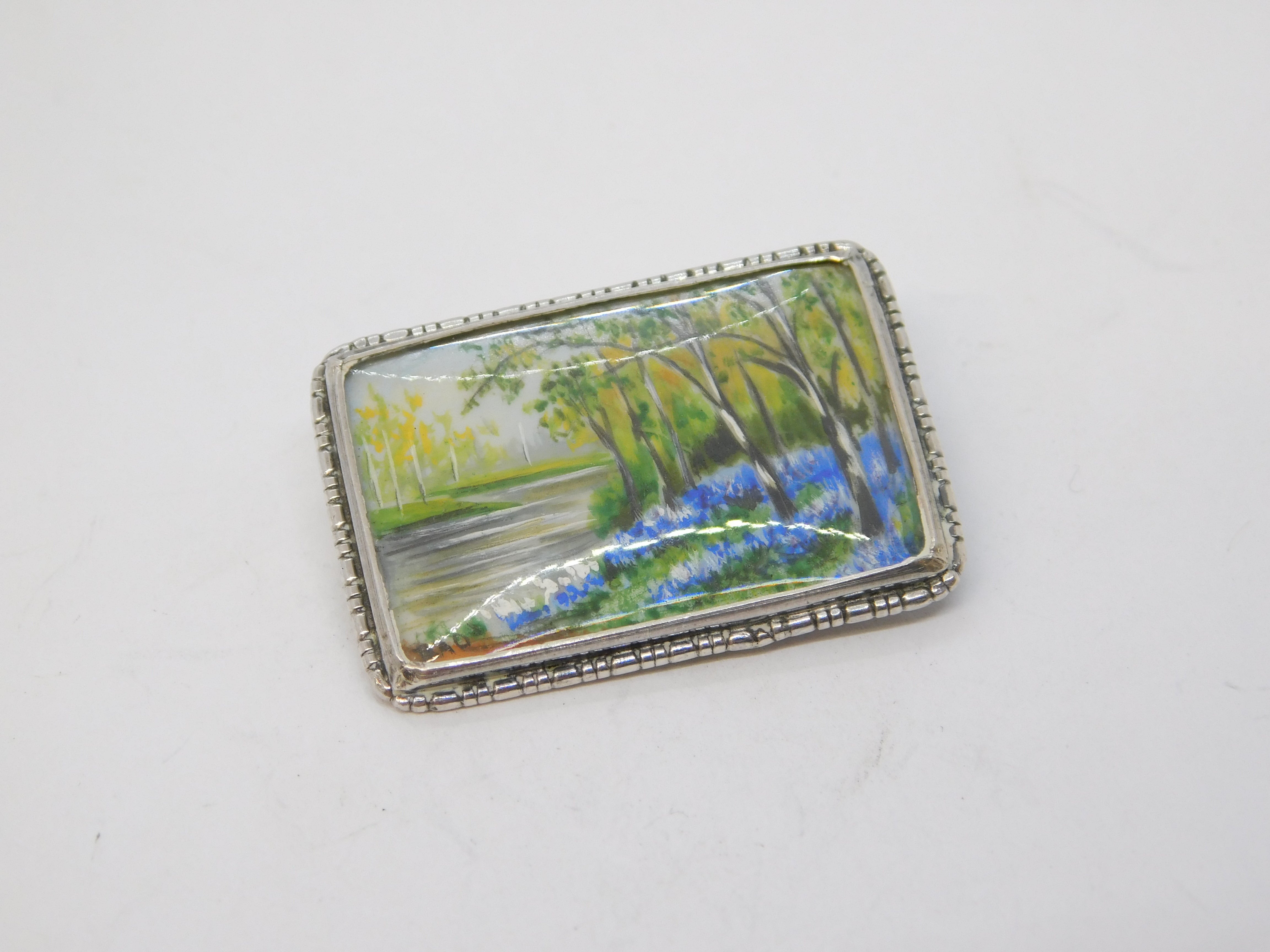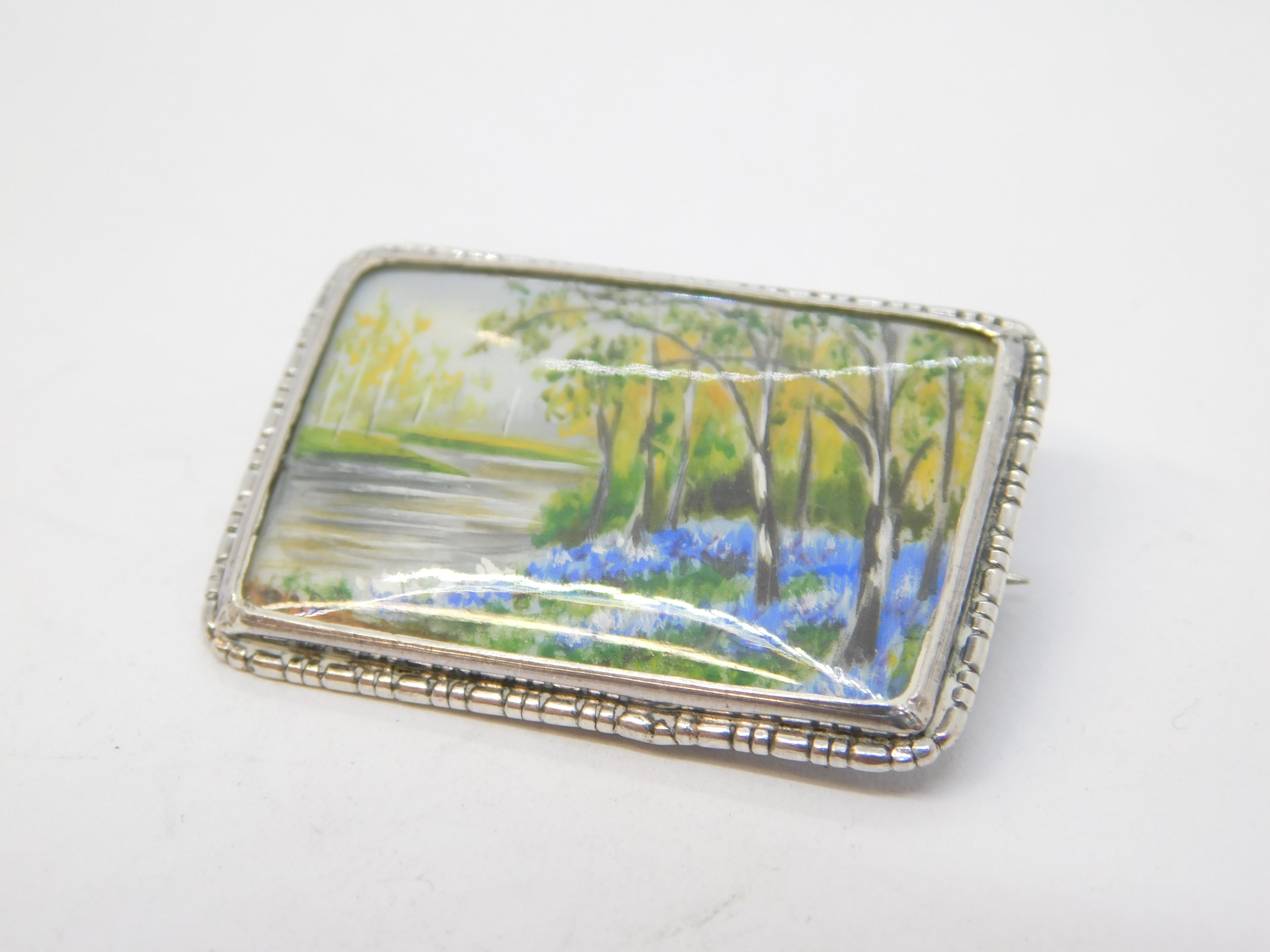 TLM Sterling Silver Mounted Painting Spring Woodland Brooch Antique c1920