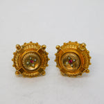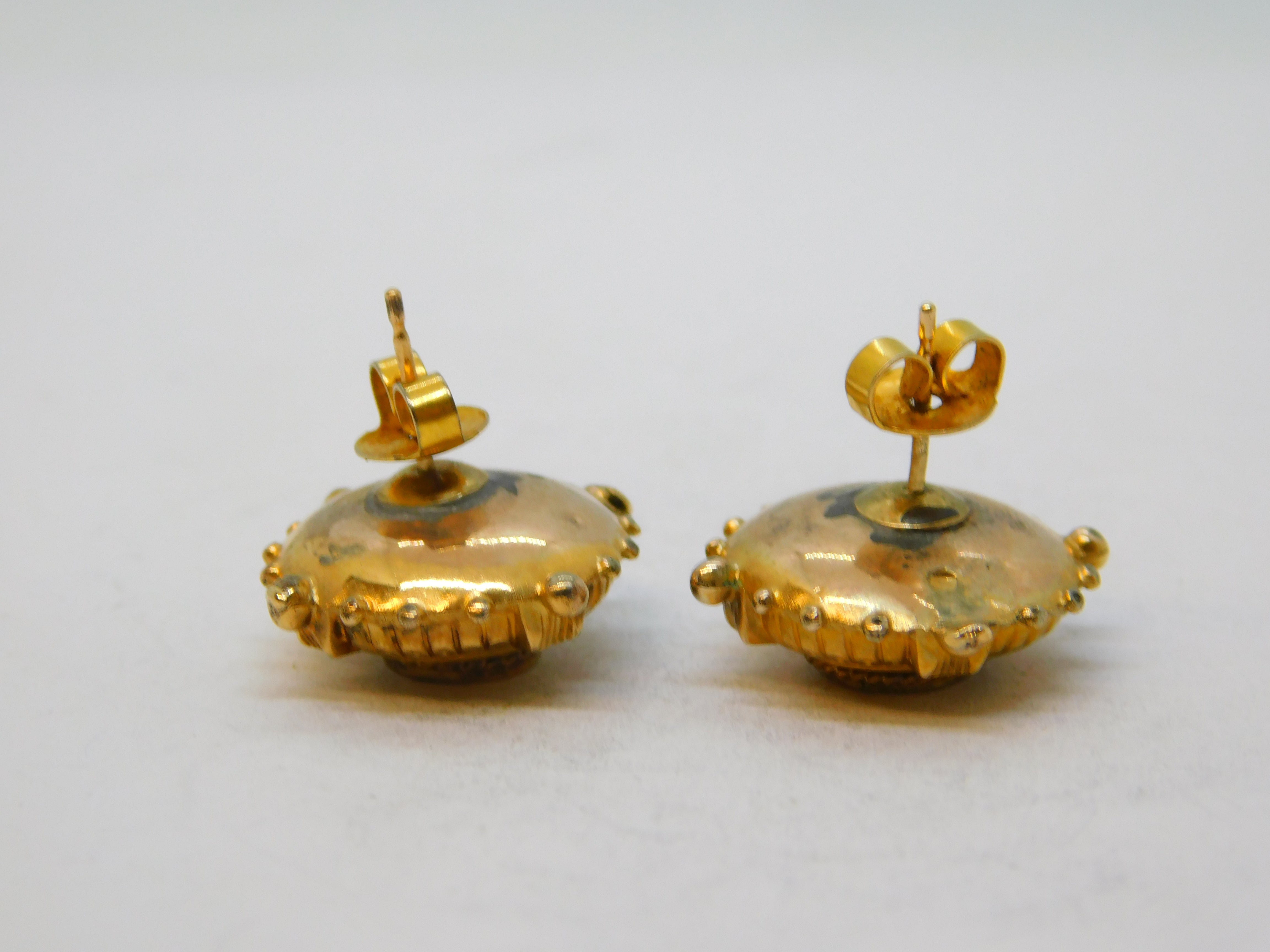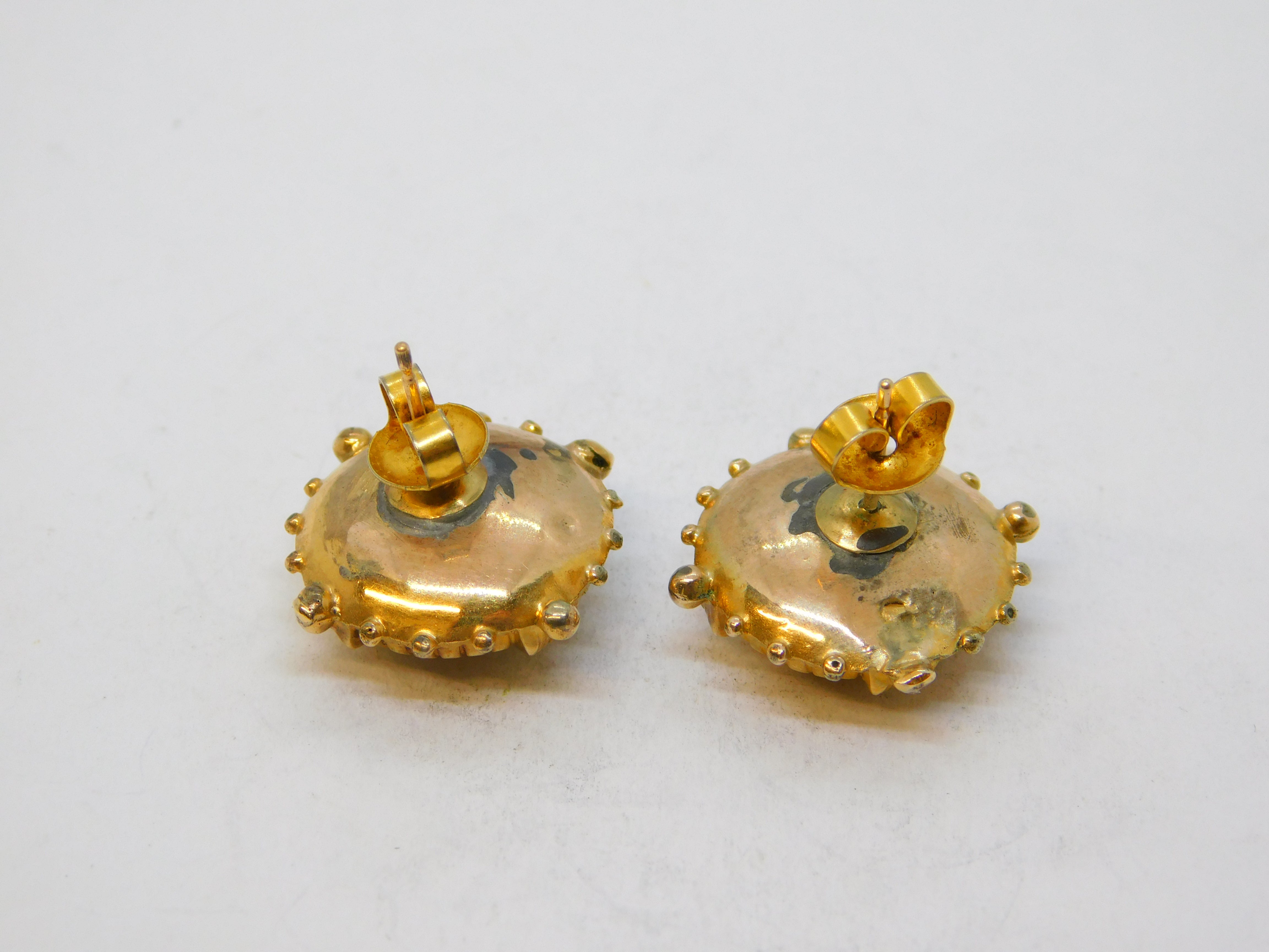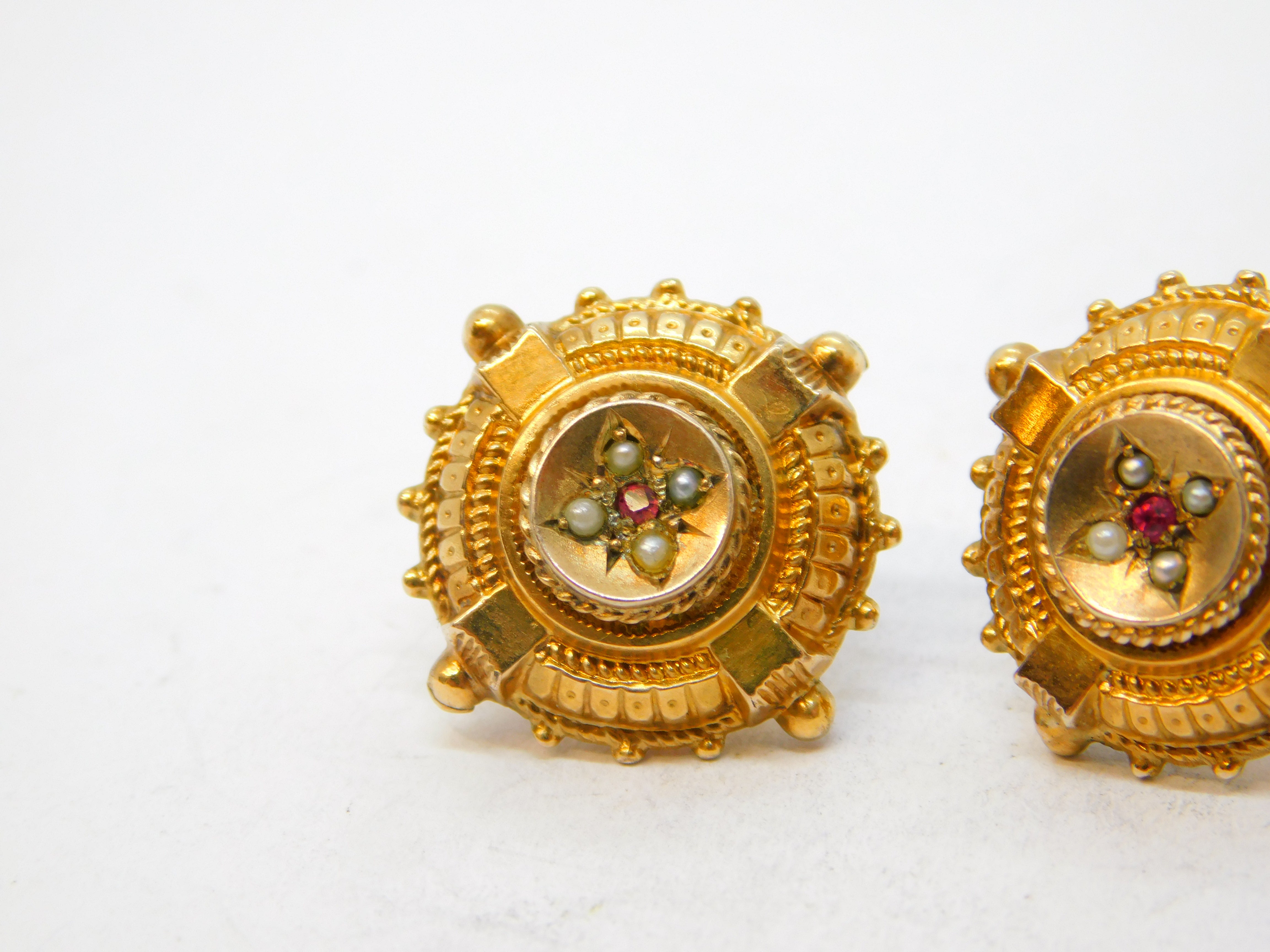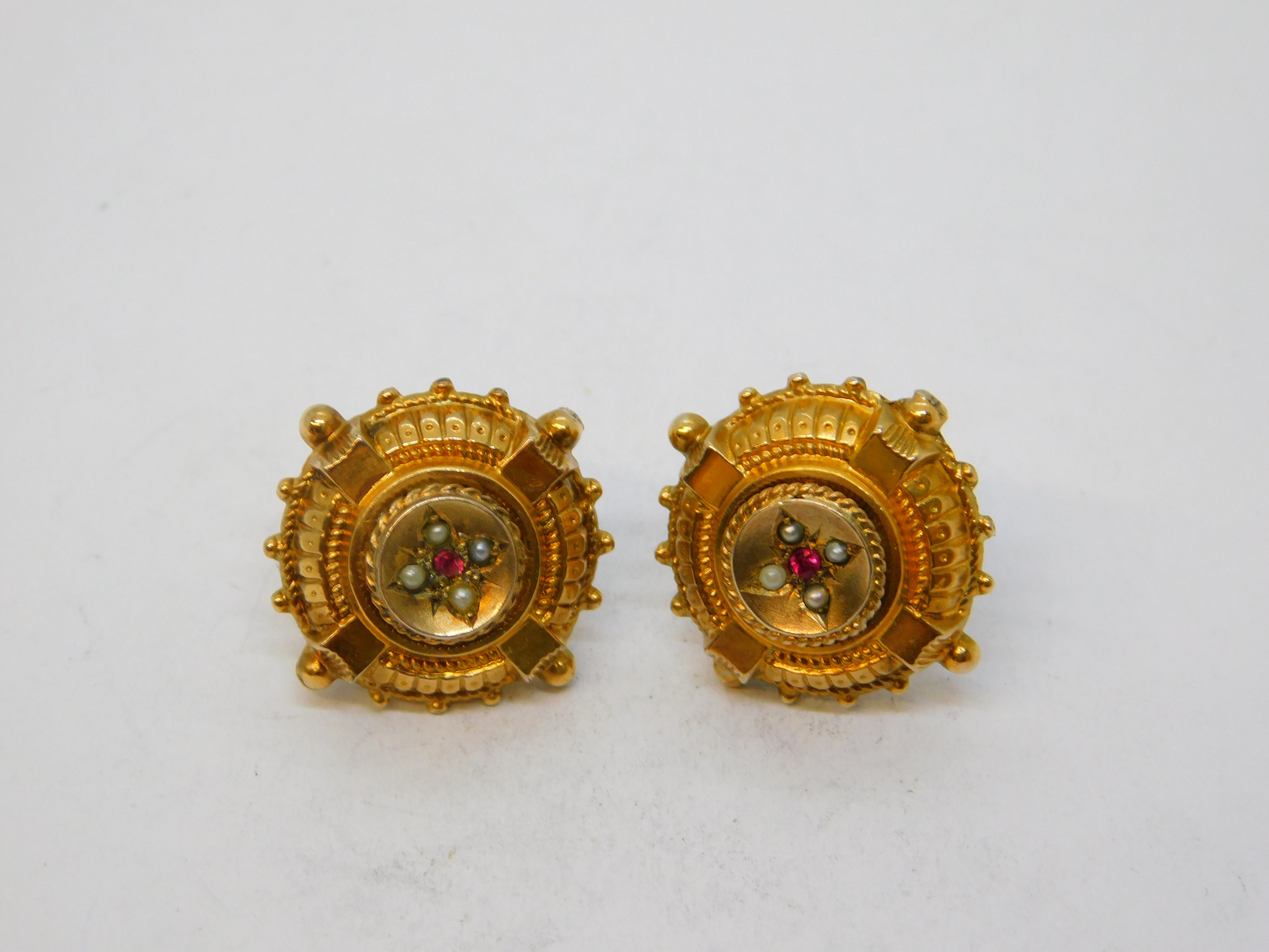 Victorian 10ct Gold, Ruby, Seed Pearl Etruscan Style Stud Earrings Antique c1890