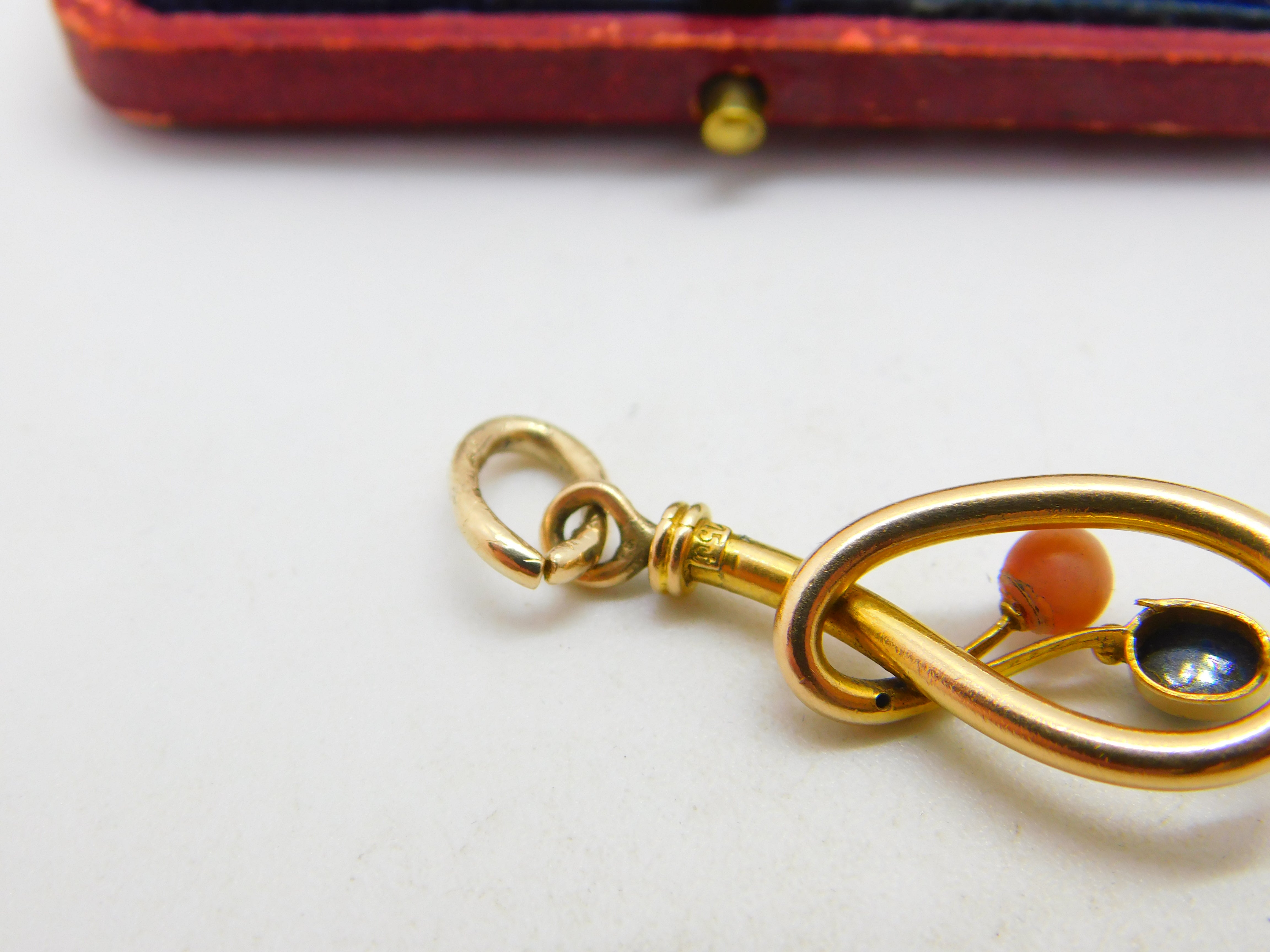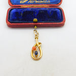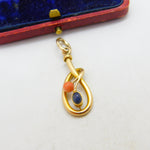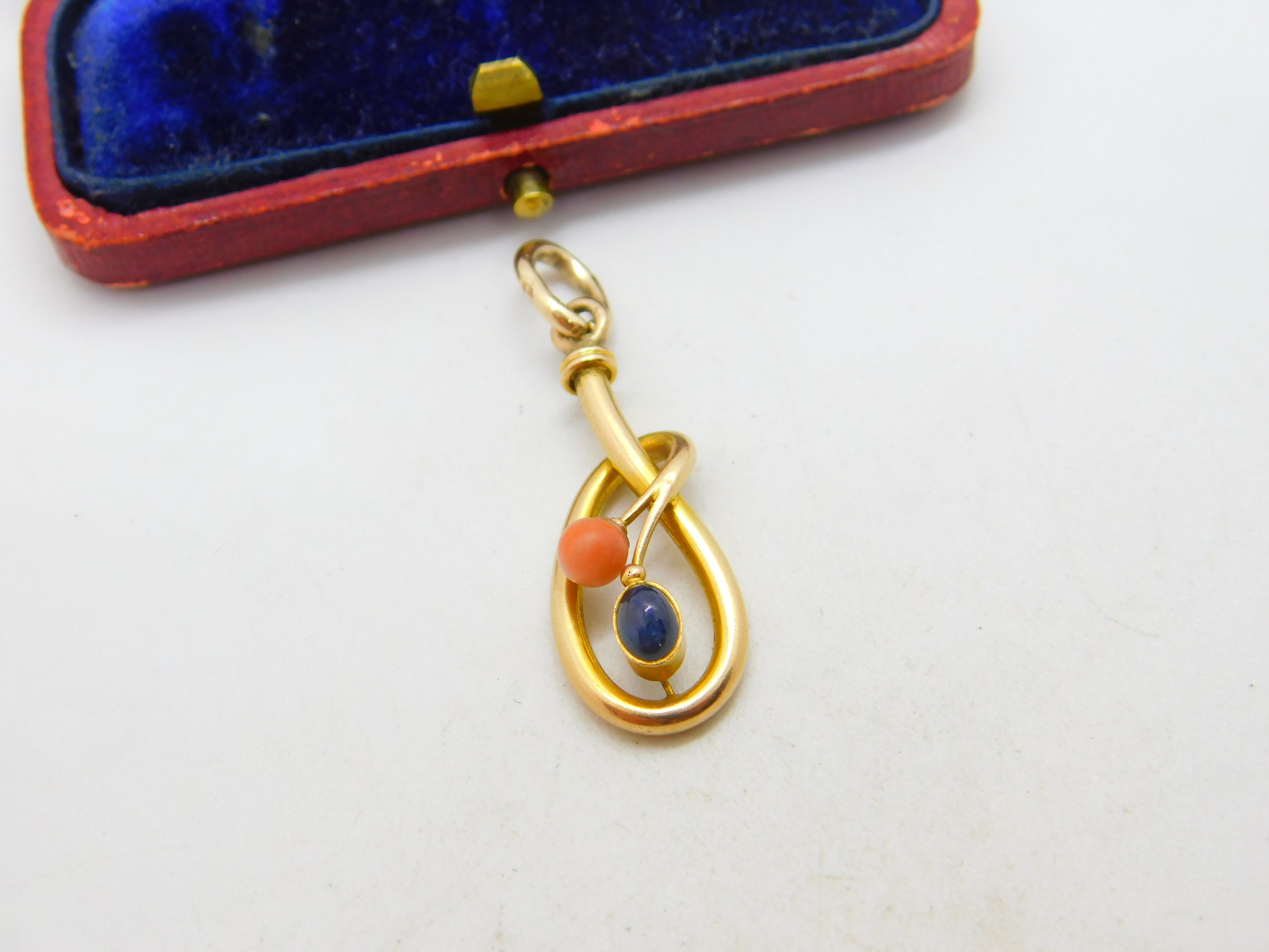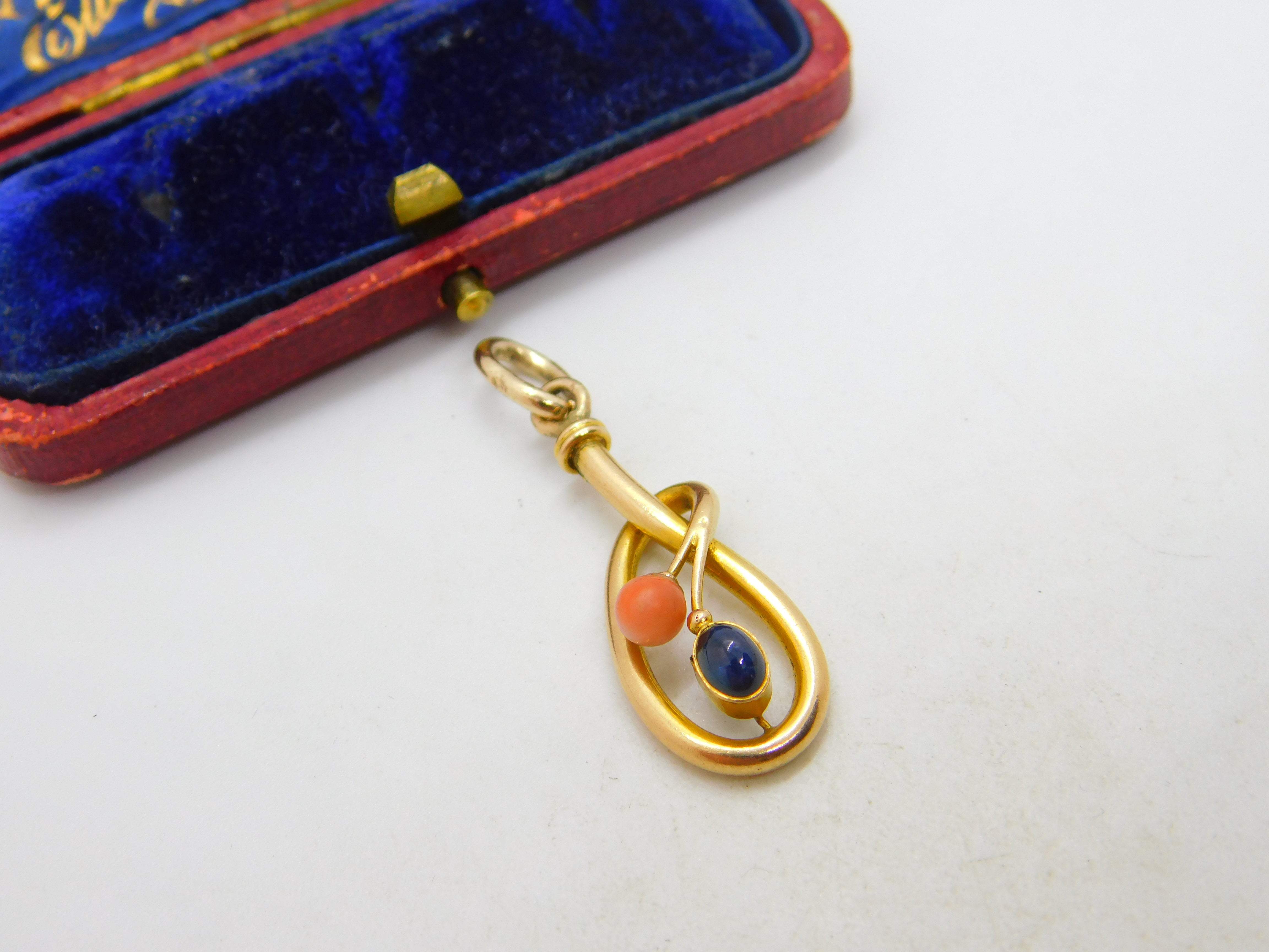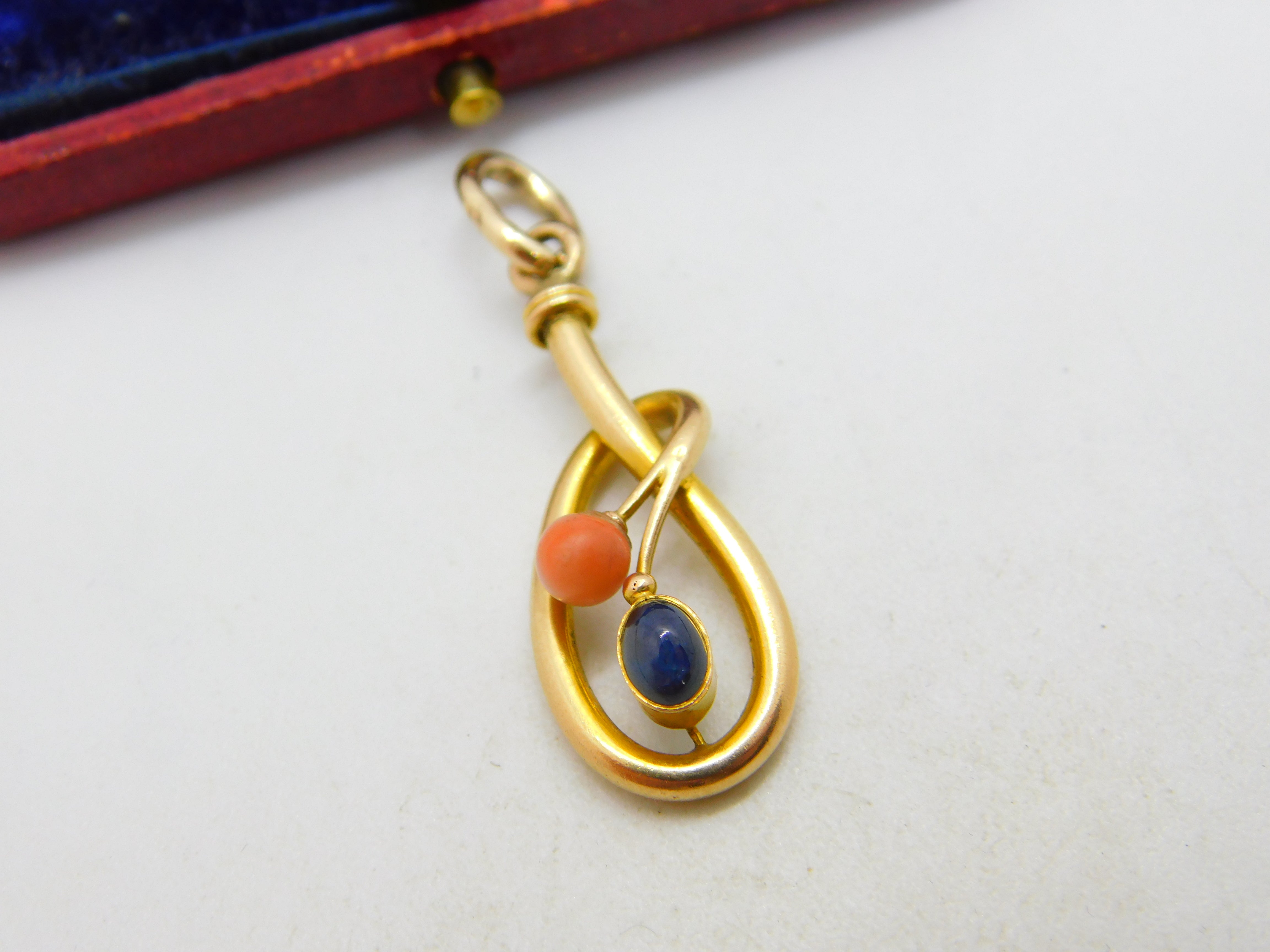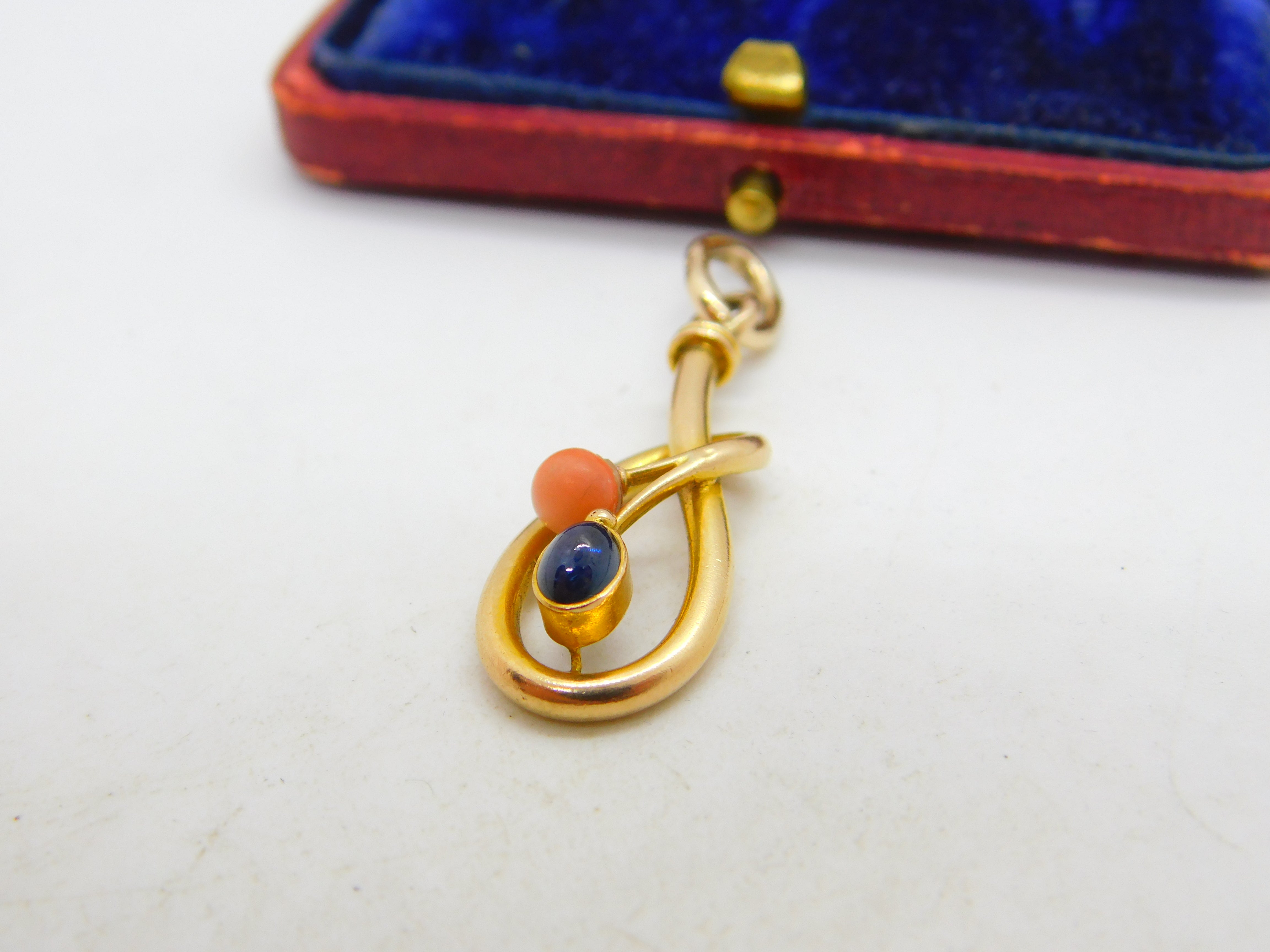 Victorian 15ct Gold, Coral & Cabochon Sapphire Art Nouveau Drop Pendant c1900