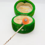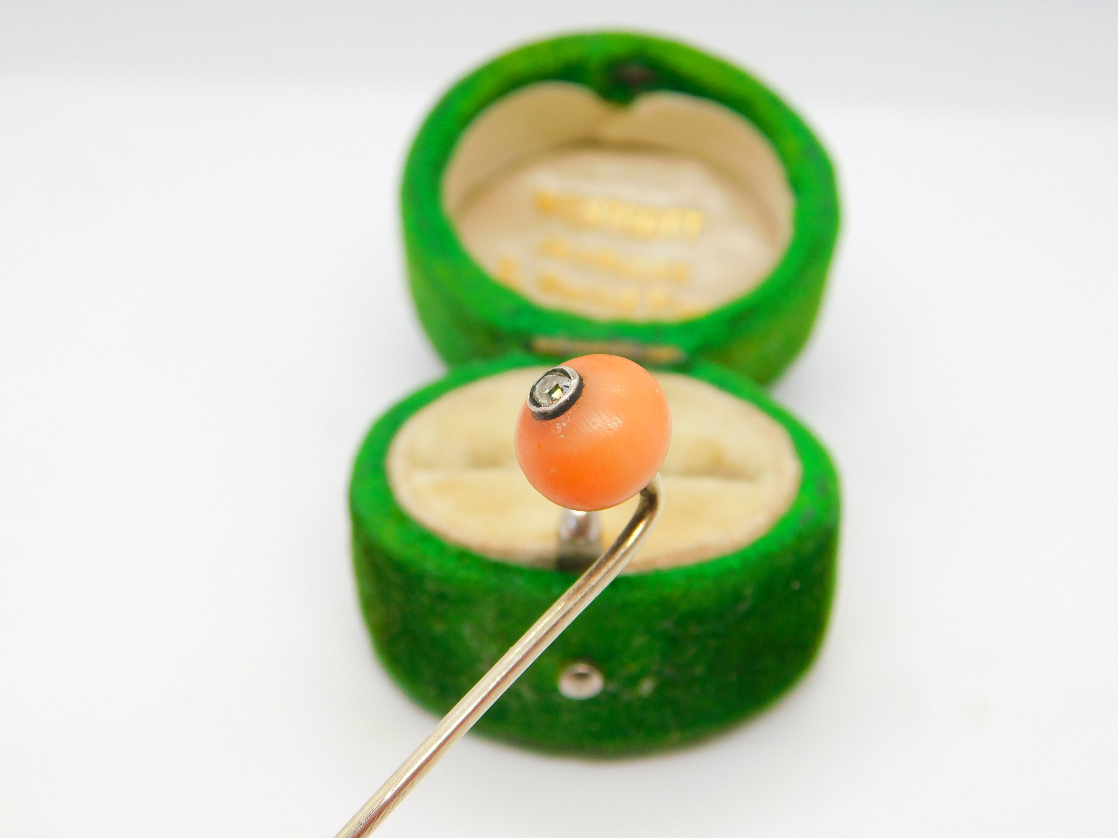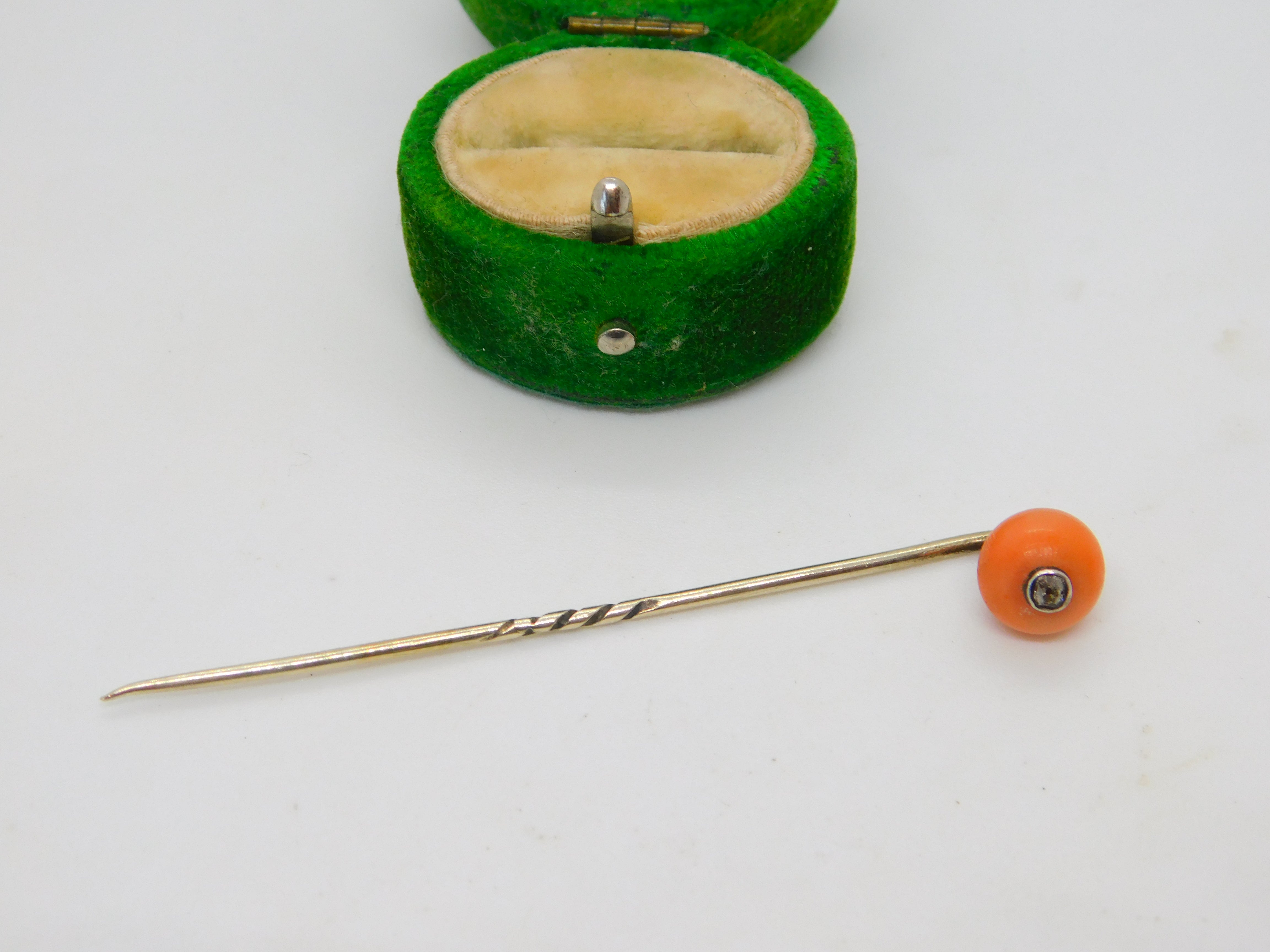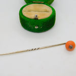 Victorian 15ct Gold, Red Coral & Old Cut Diamond Stick Pin Antique c1840
