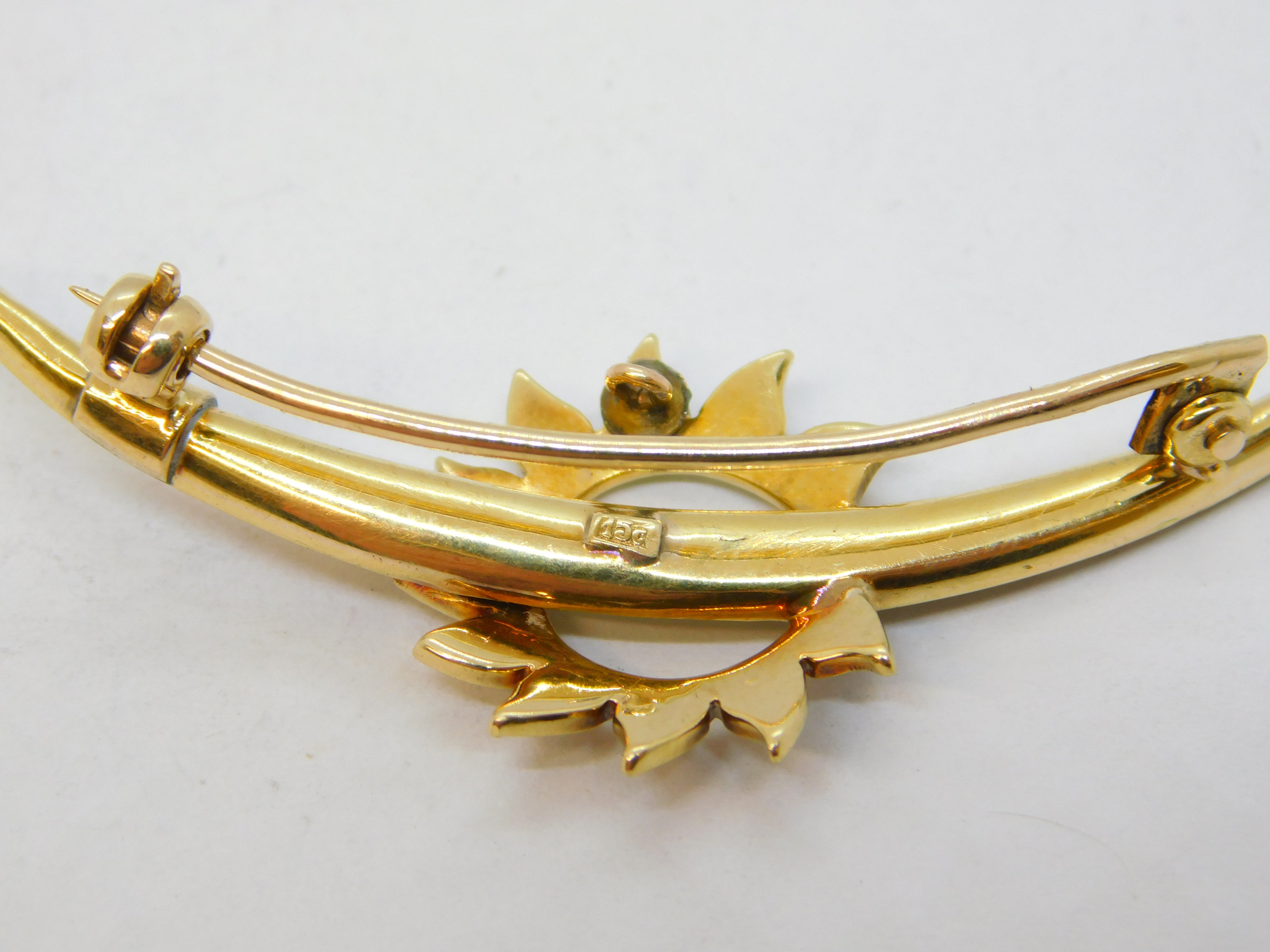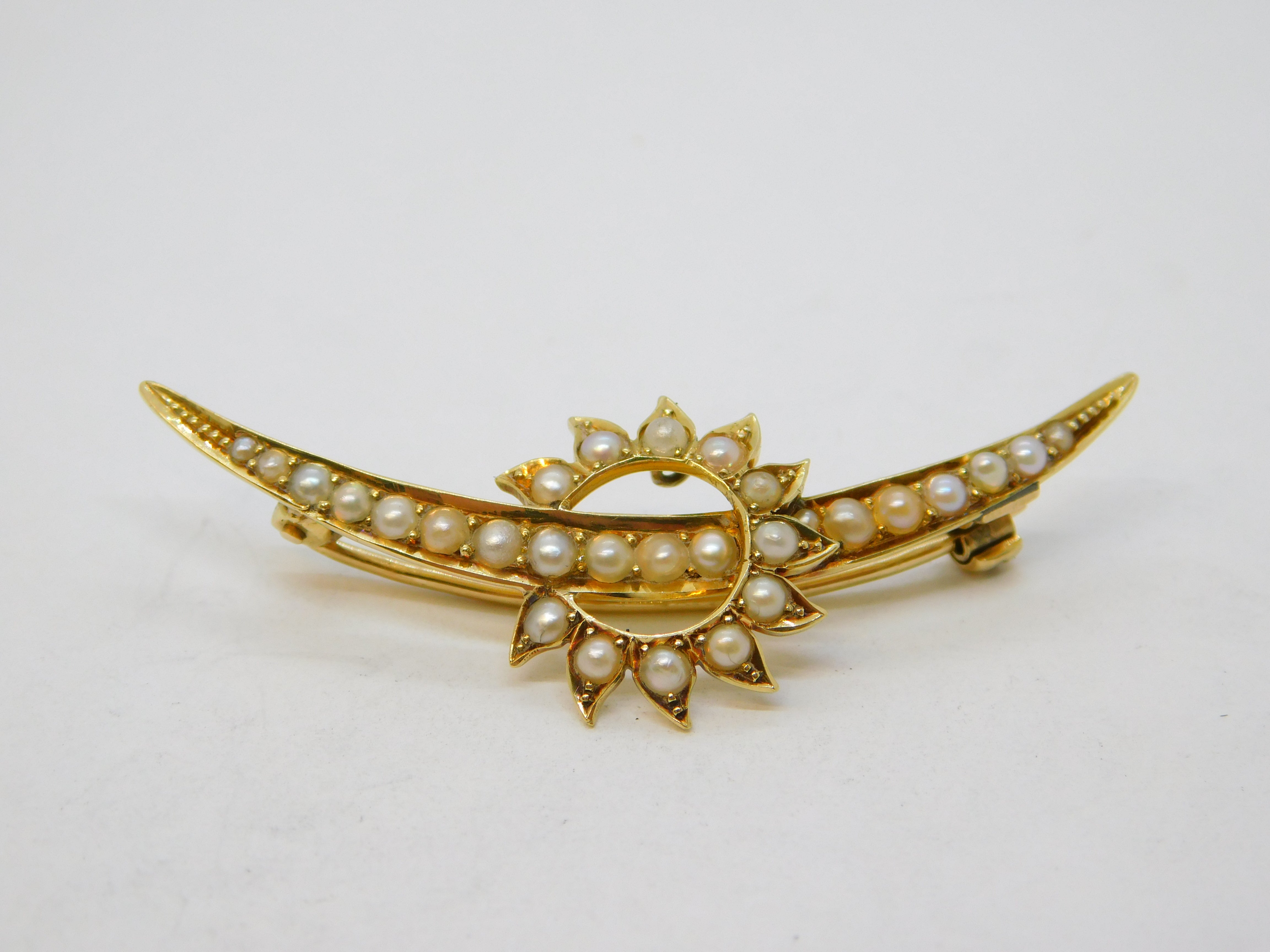 Victorian 15ct Gold & Seed Pearl Sunburst & Crescent Brooch Antique c1900
