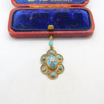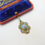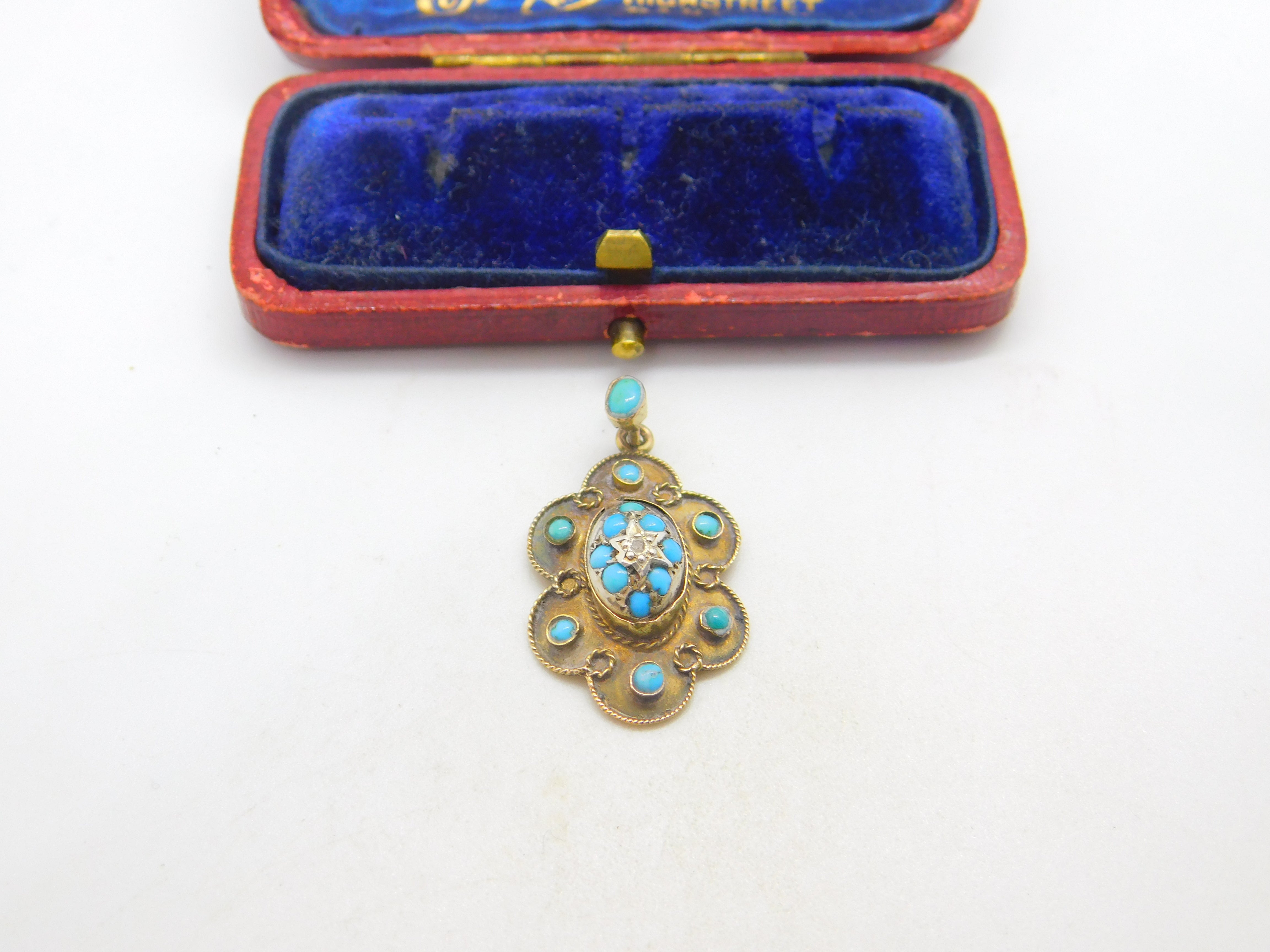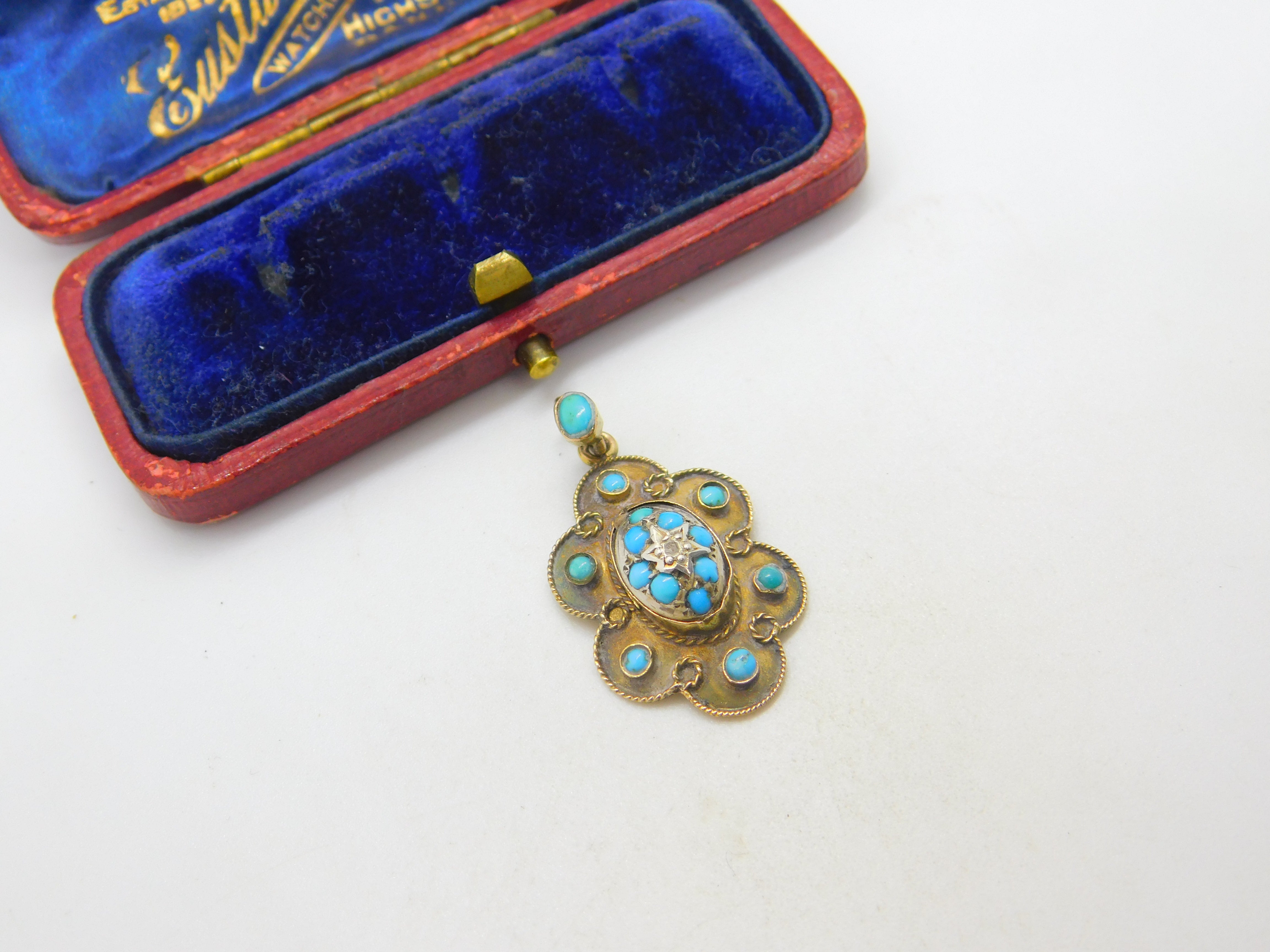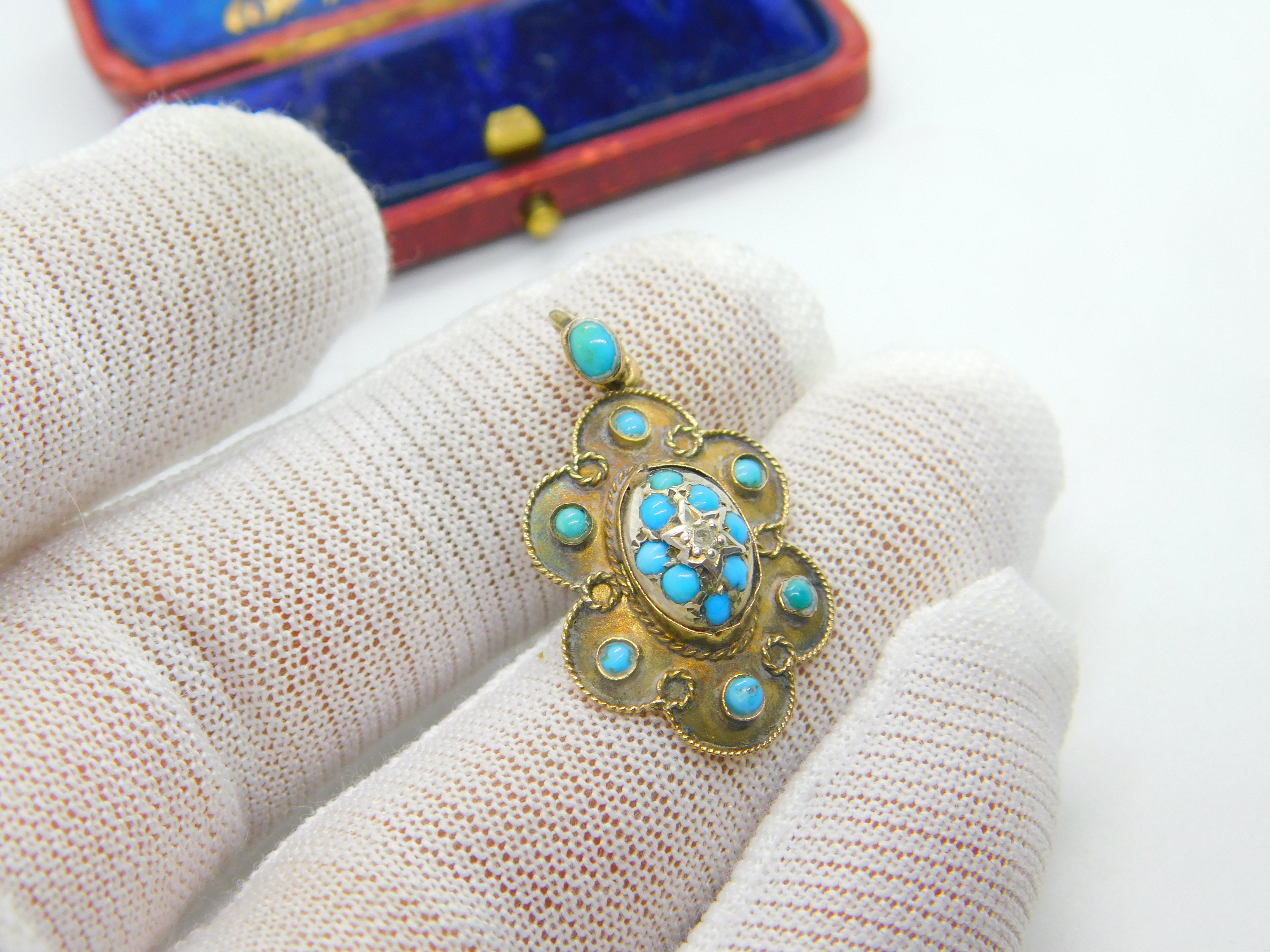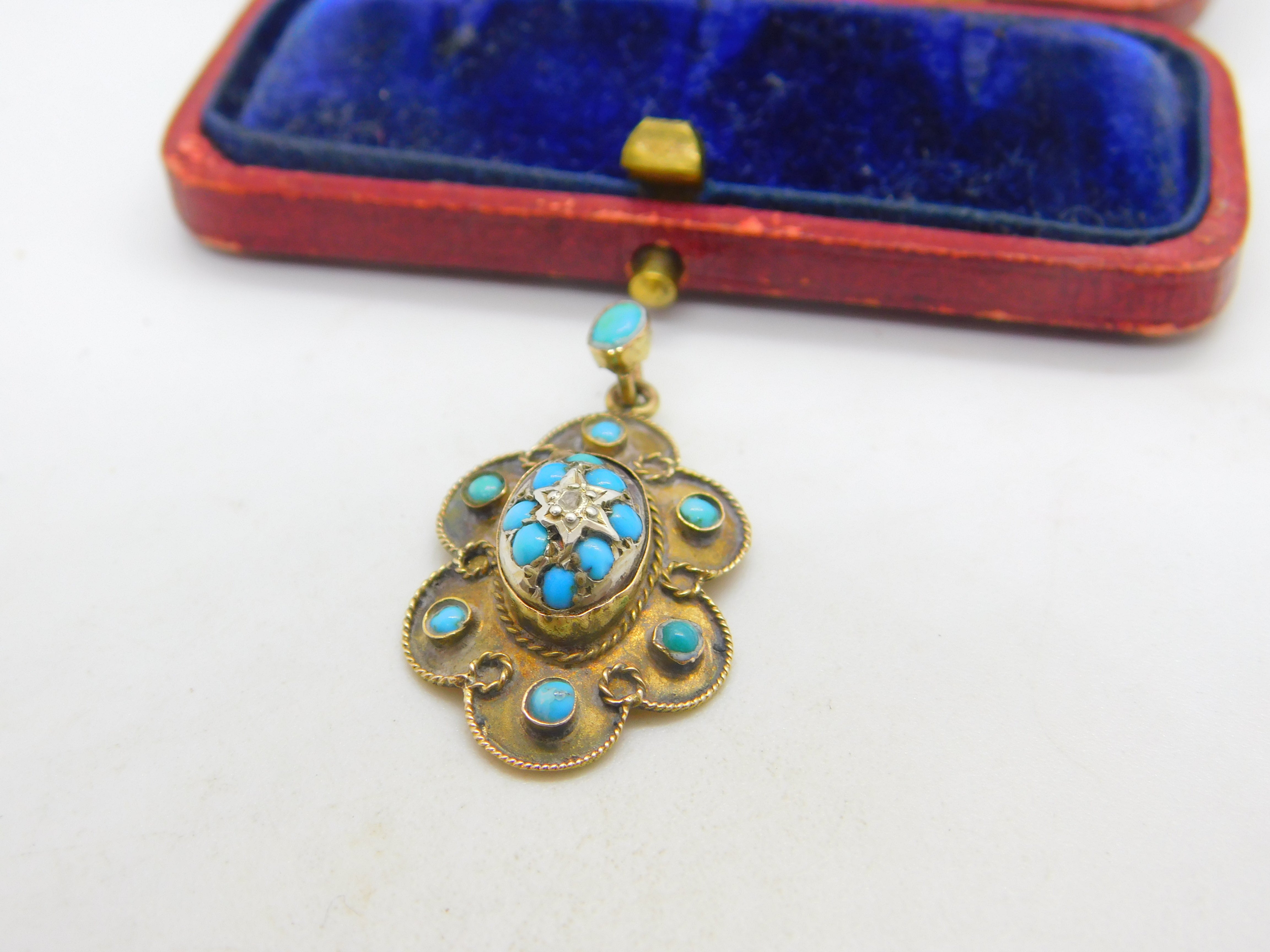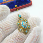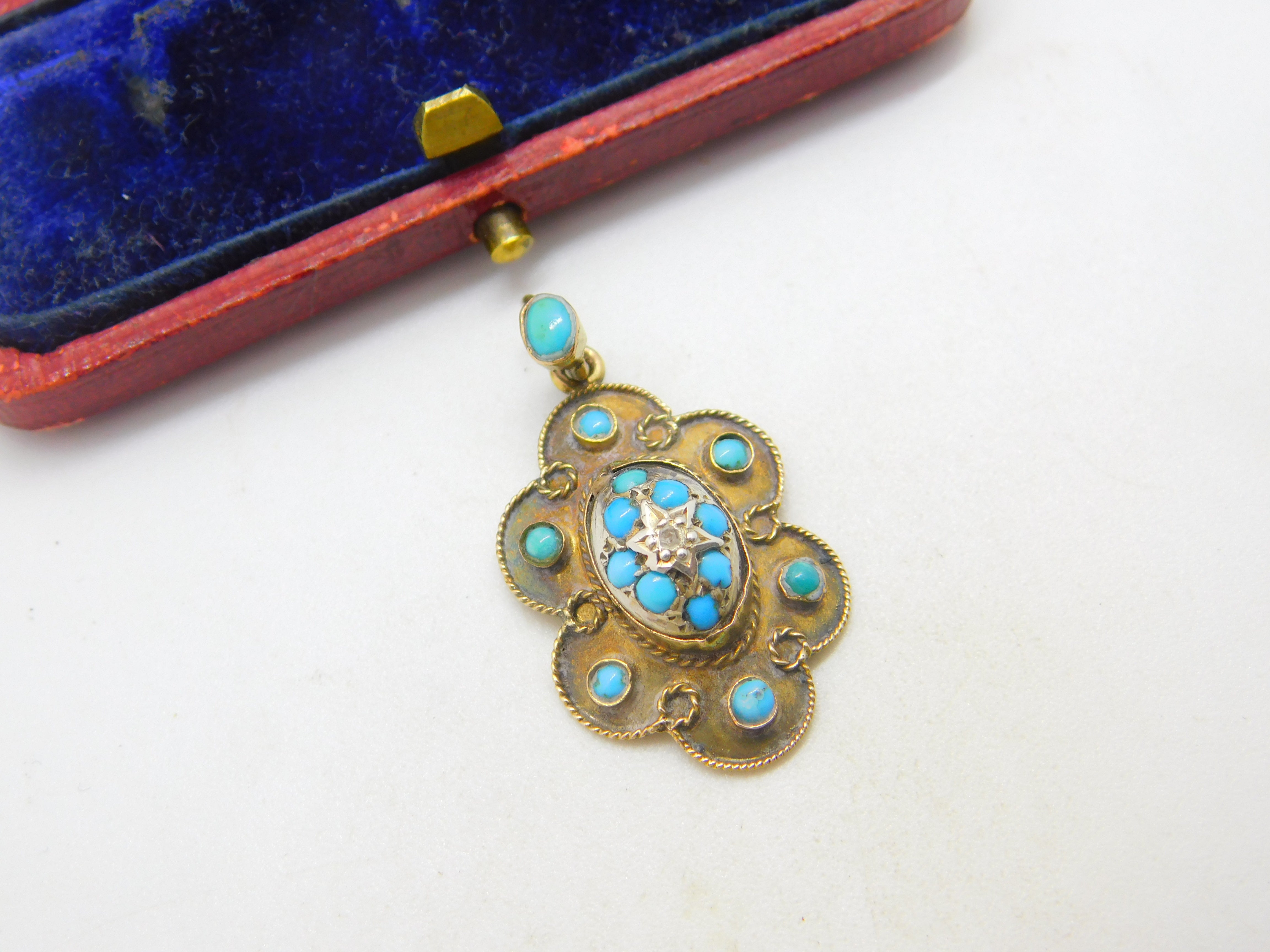 Victorian 15ct Gold, Turquoise & Diamond Floral Drop Pendant c1860 Antique