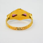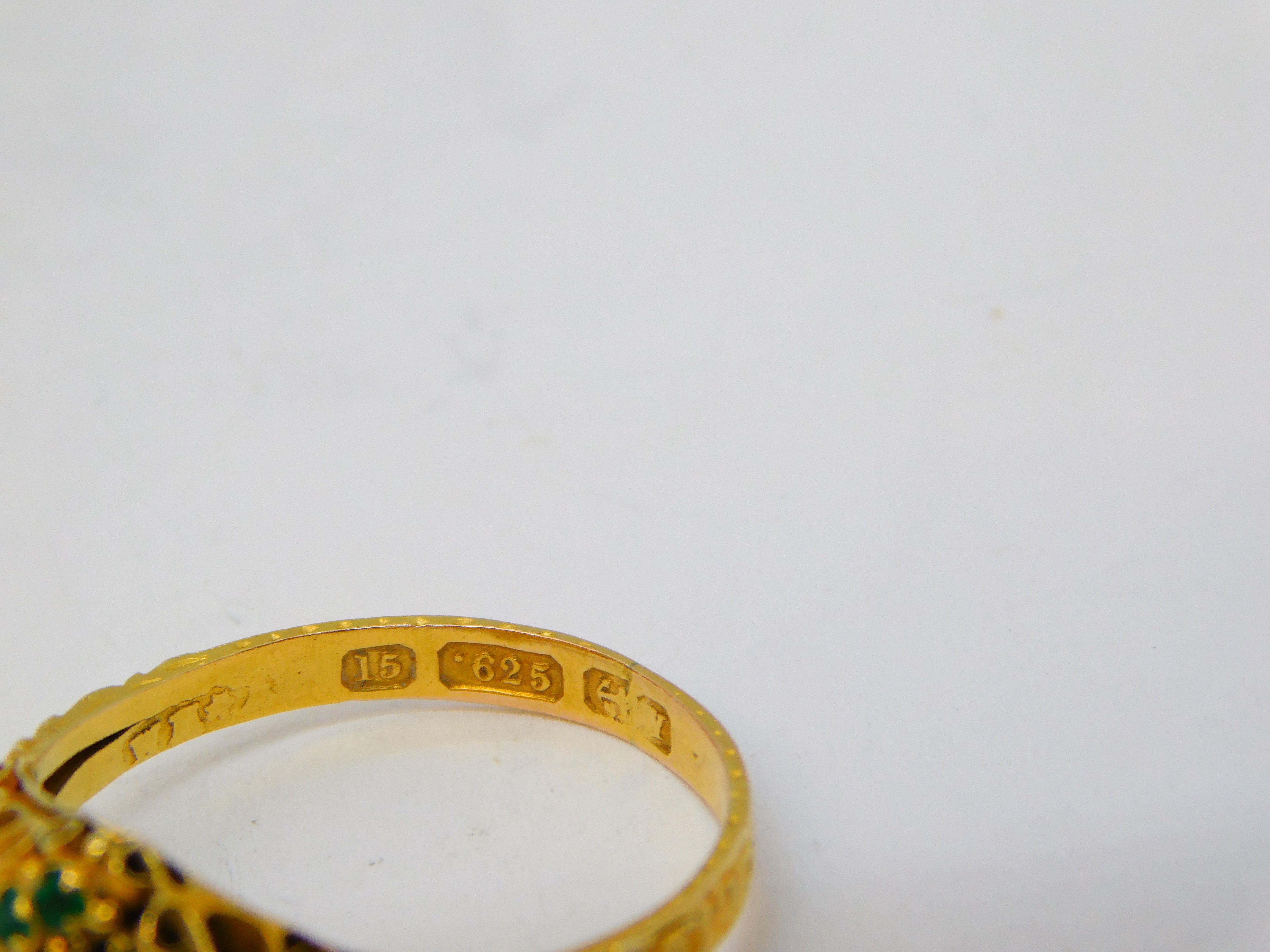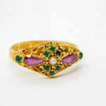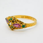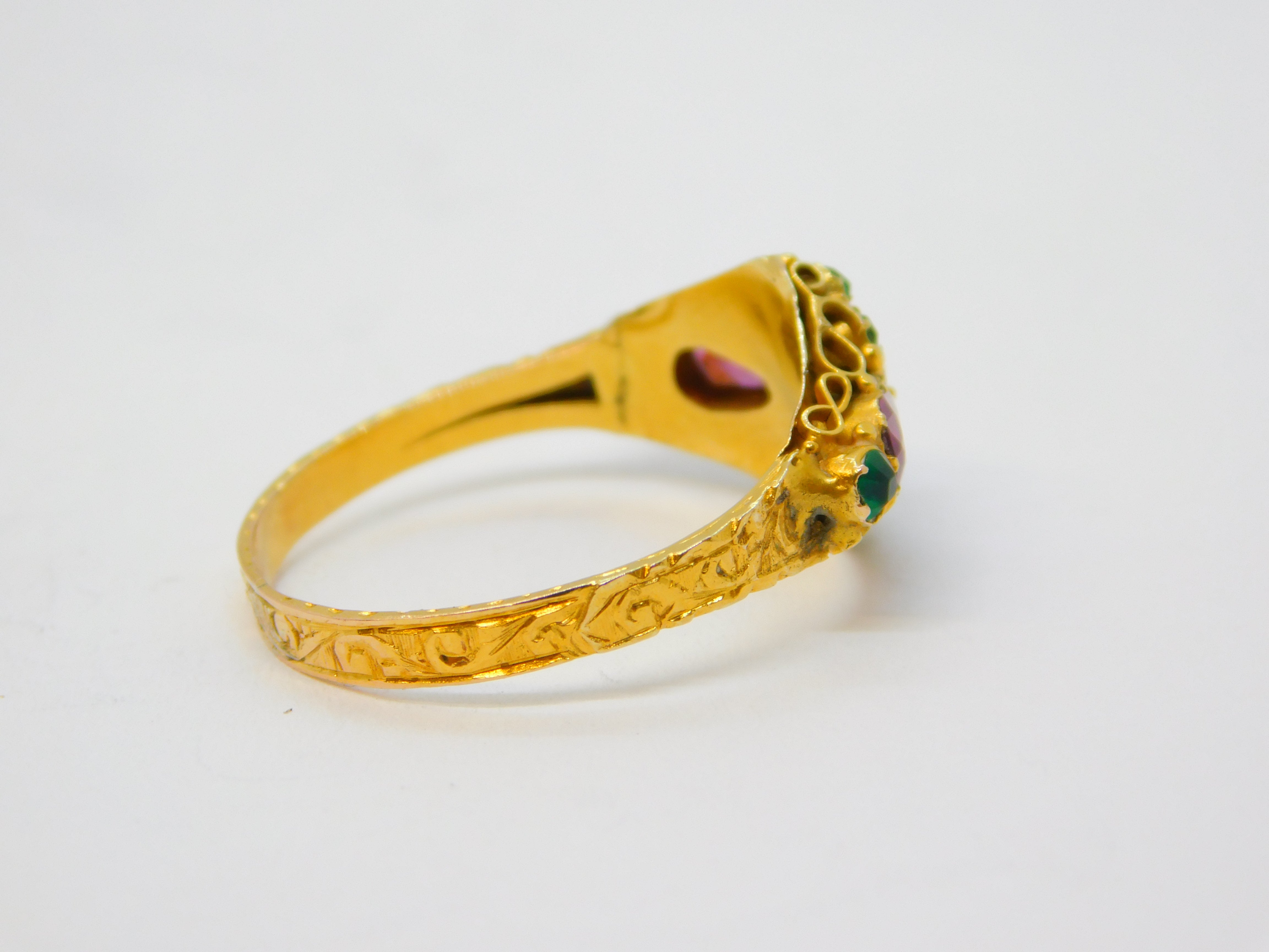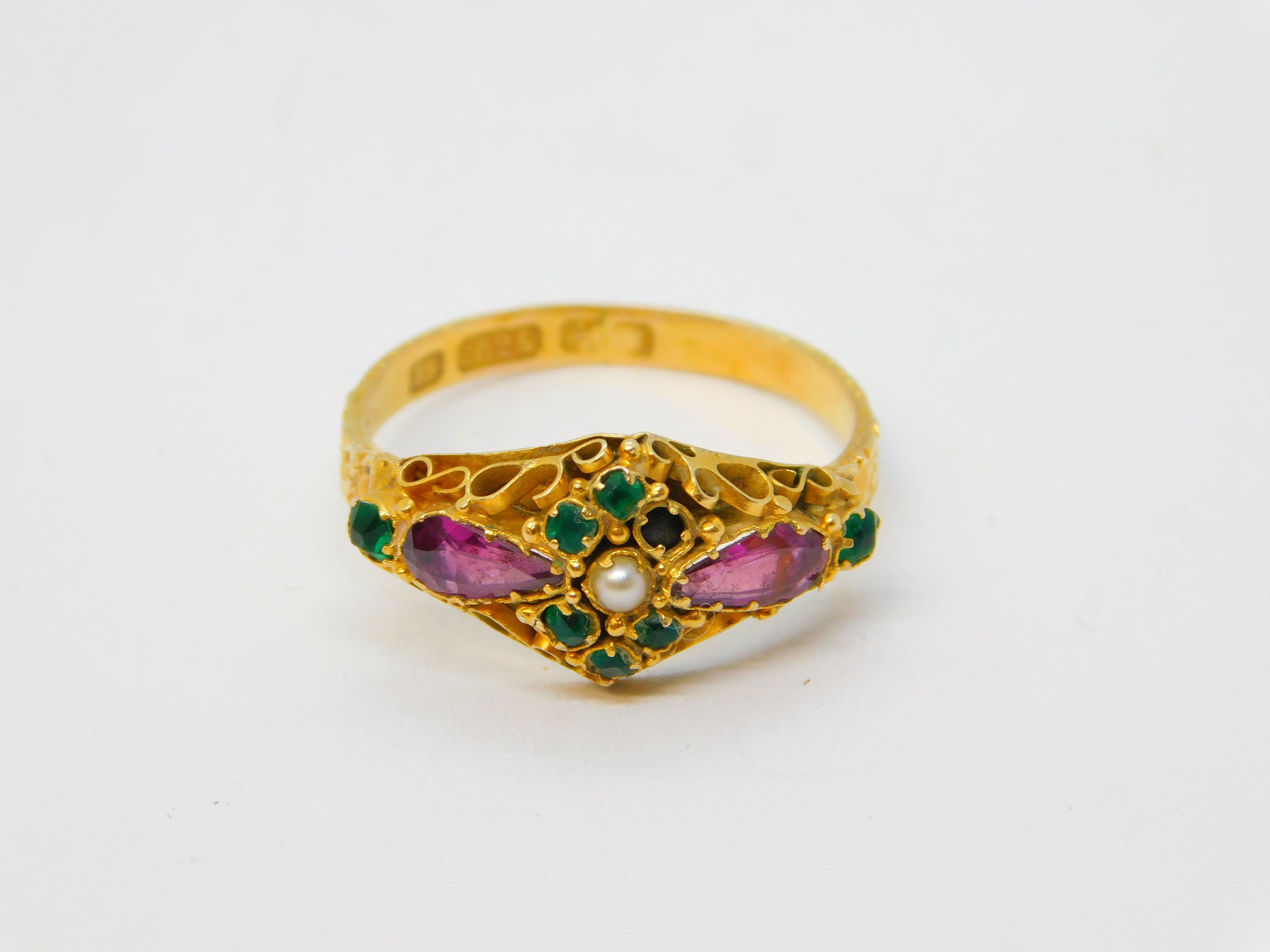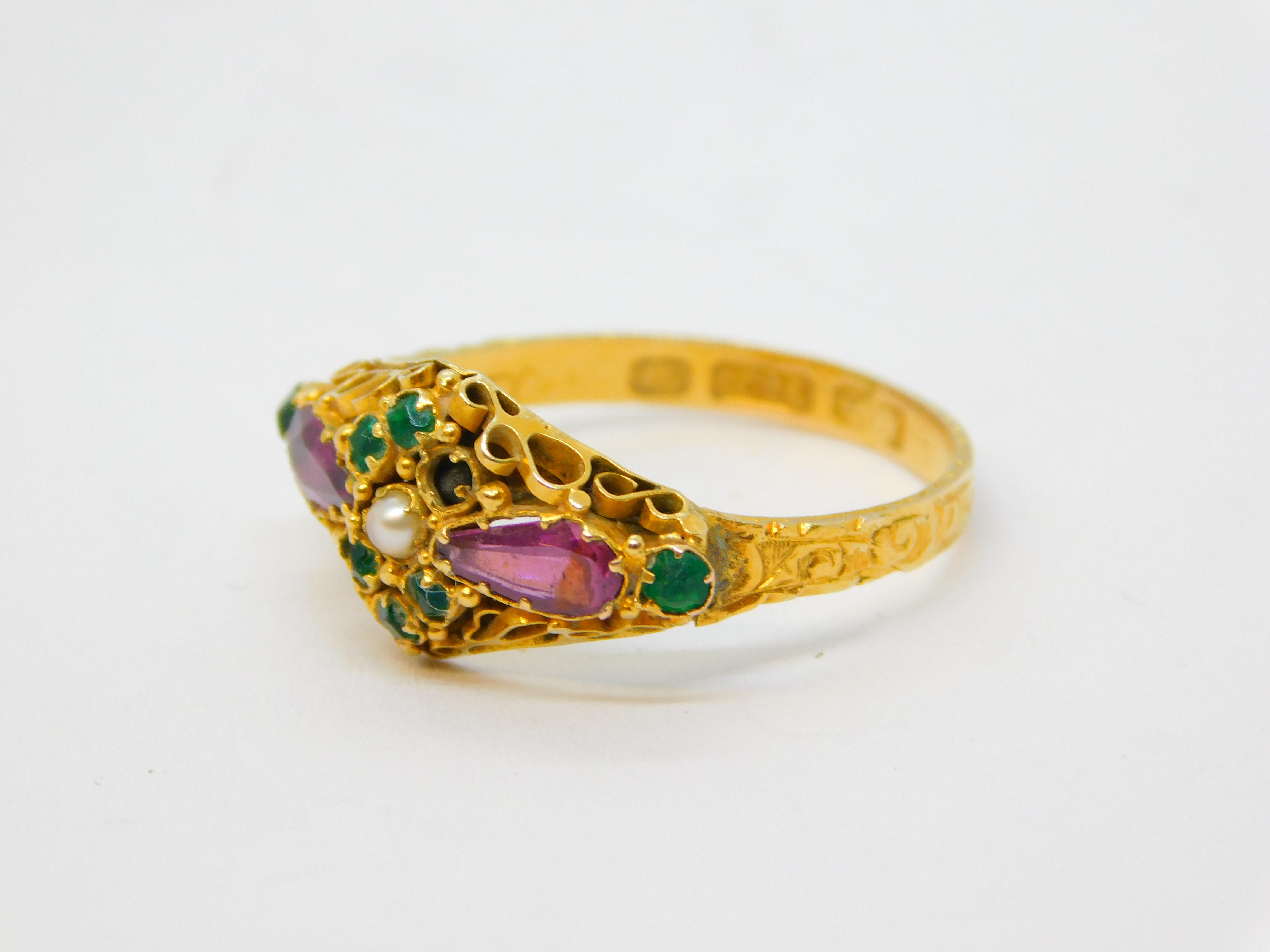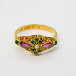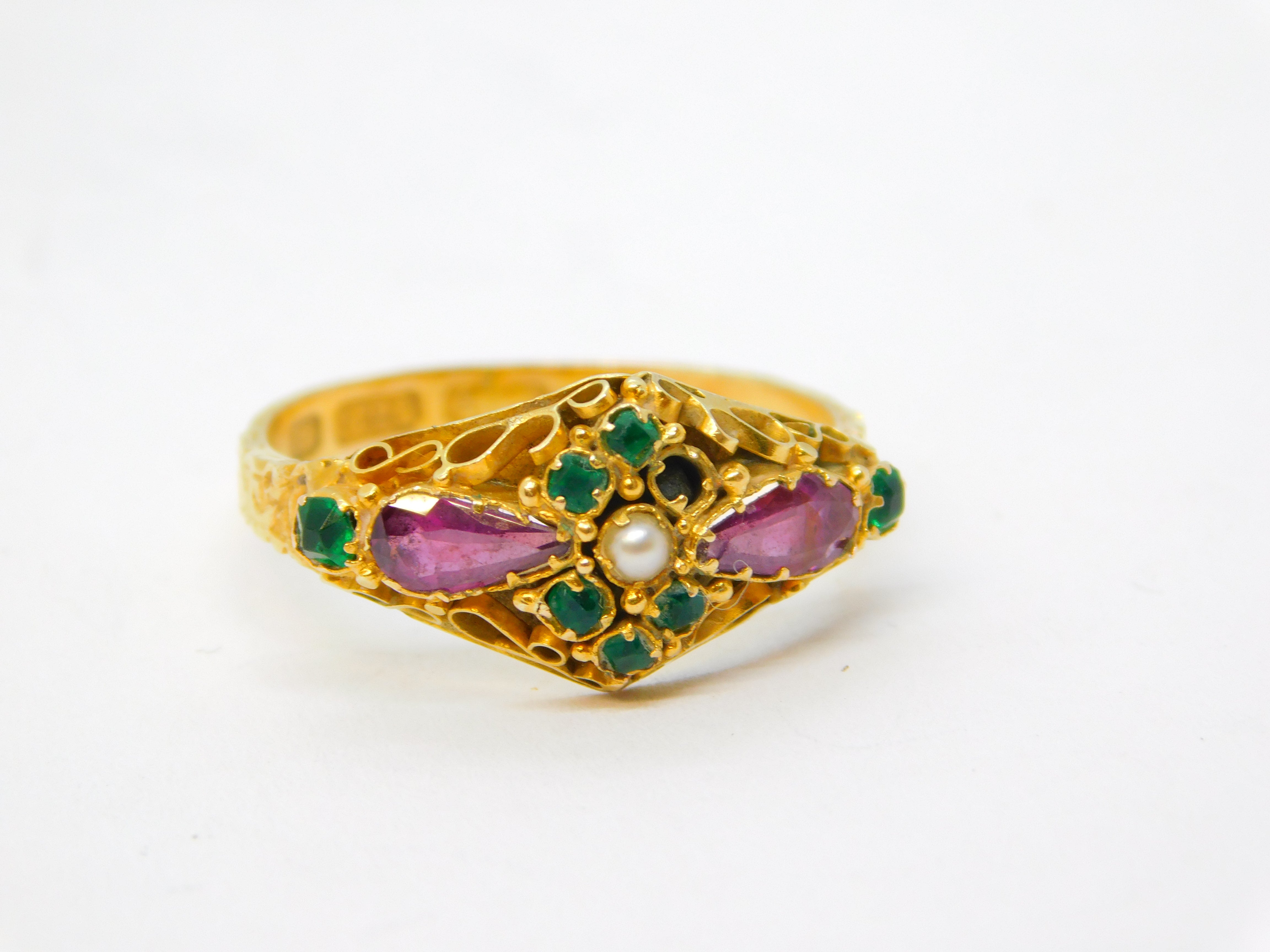 Victorian 15ct Yellow Gold, Emerald, Almandine Garnet, Seed Pearl Dress Ring Birmingham 1870
