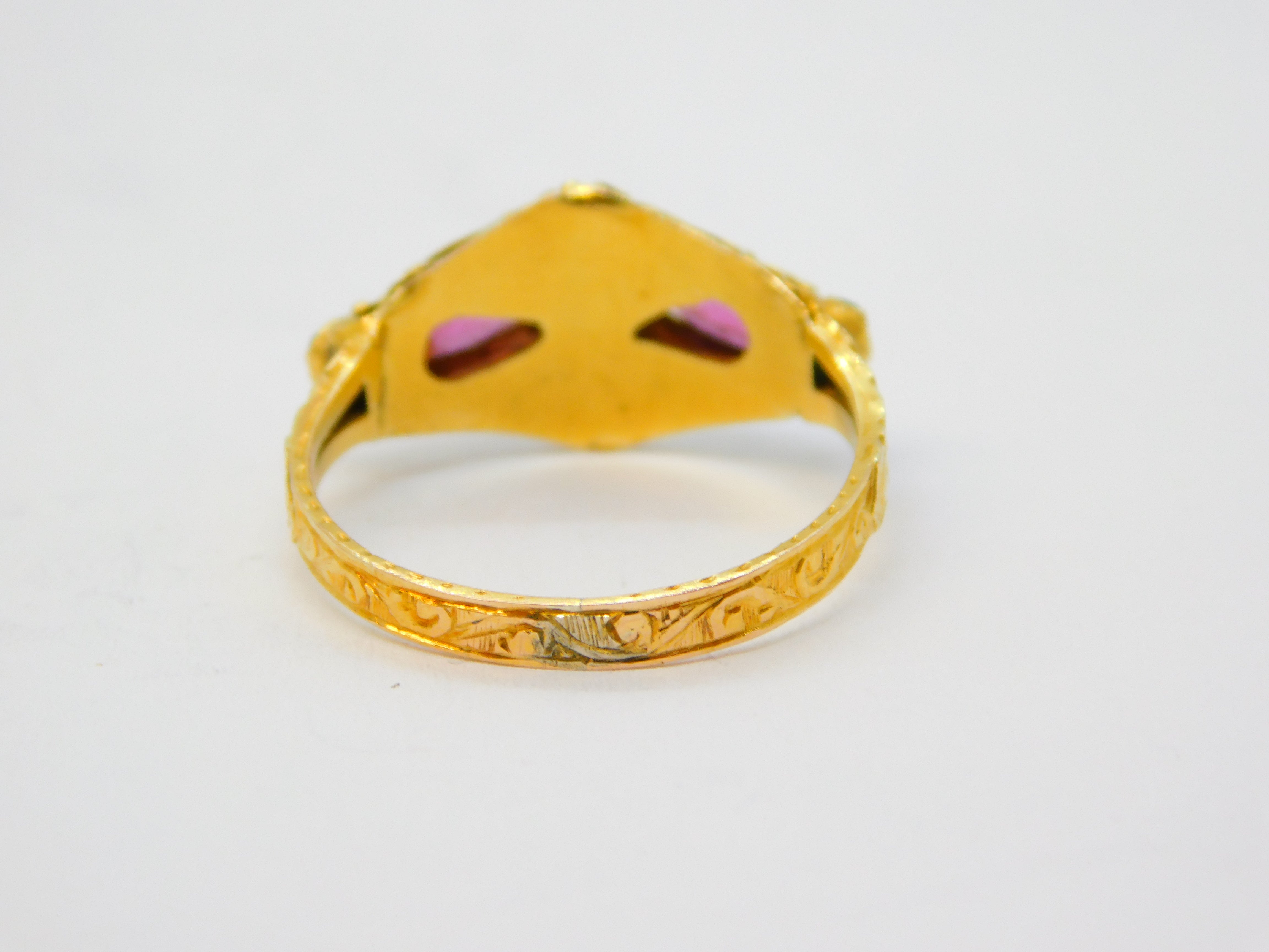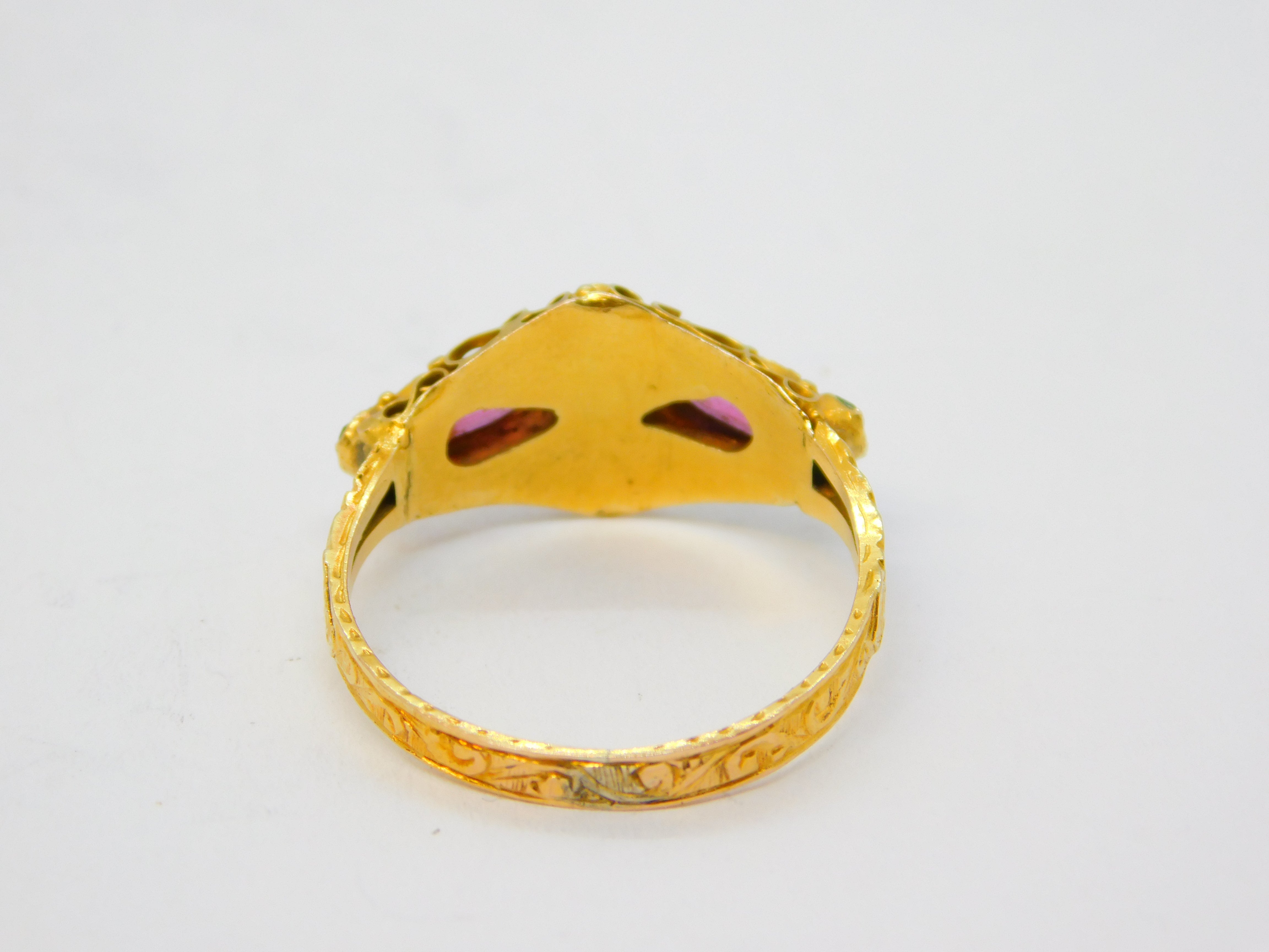 Details: A fantastic and wonderfully designed antique Victorian 15ct yellow gold sweetheart dress ring set with stunning pear-cut almandine garnets flanked with emeralds around a central seed pearl, hallmarked Birmingham 1870 with clear '625' 15ct marks, missing one small emerald stone although easily replaced, a gorgeous ring in georgian style. This is a wonderful item that would make a perfect gift or addition to any collection. We are more than happy to provide XRF reports for items upon request.