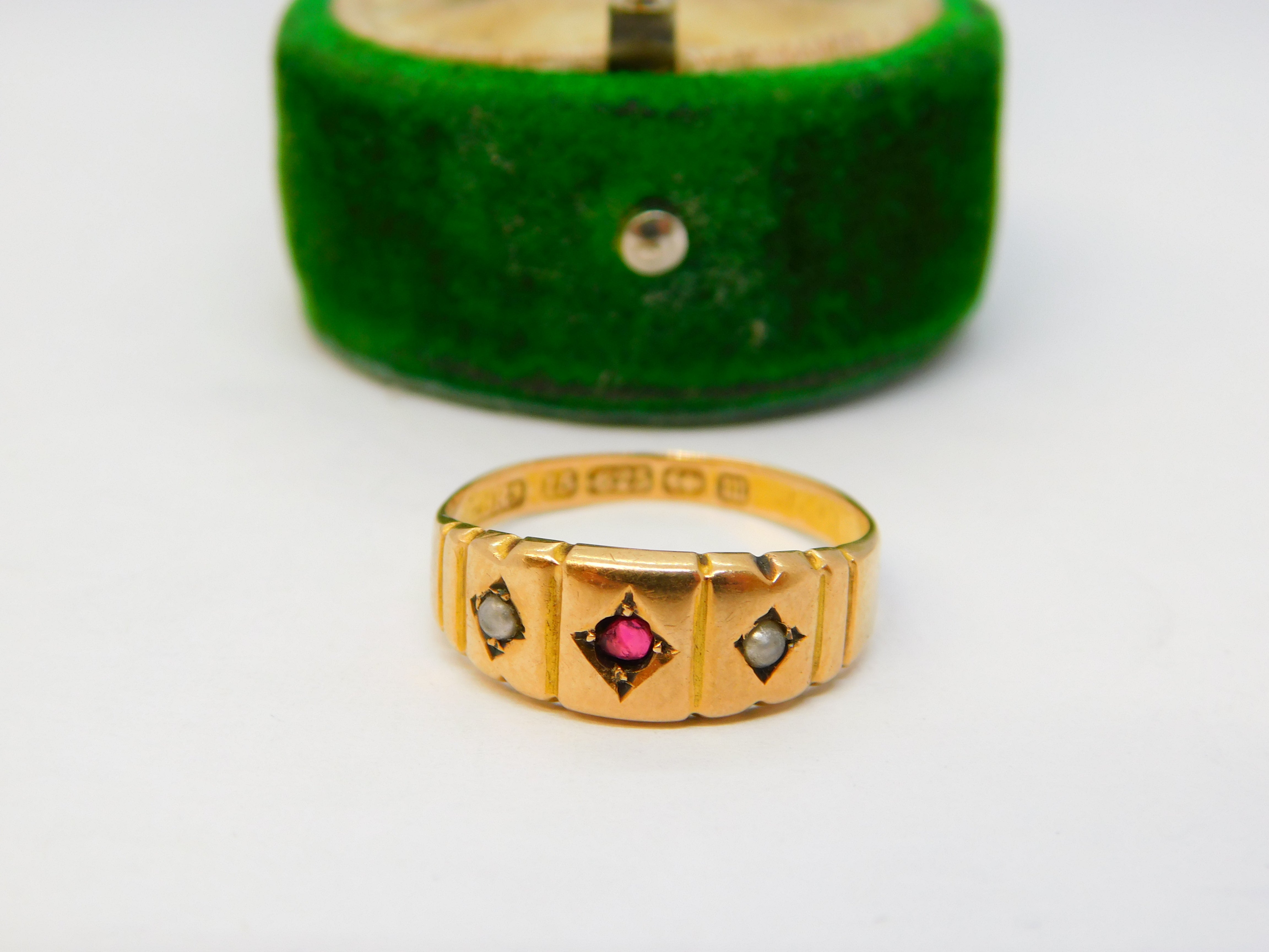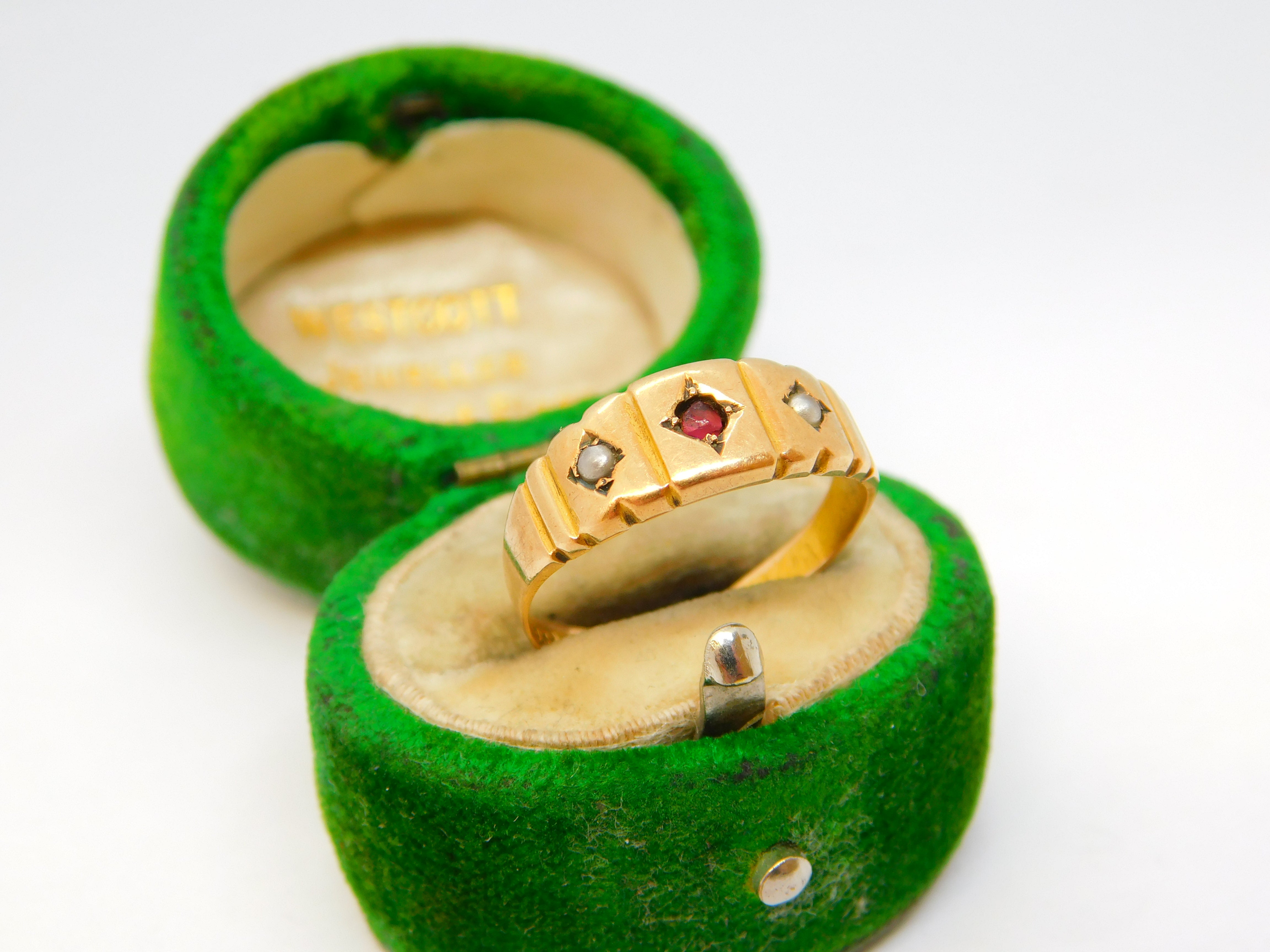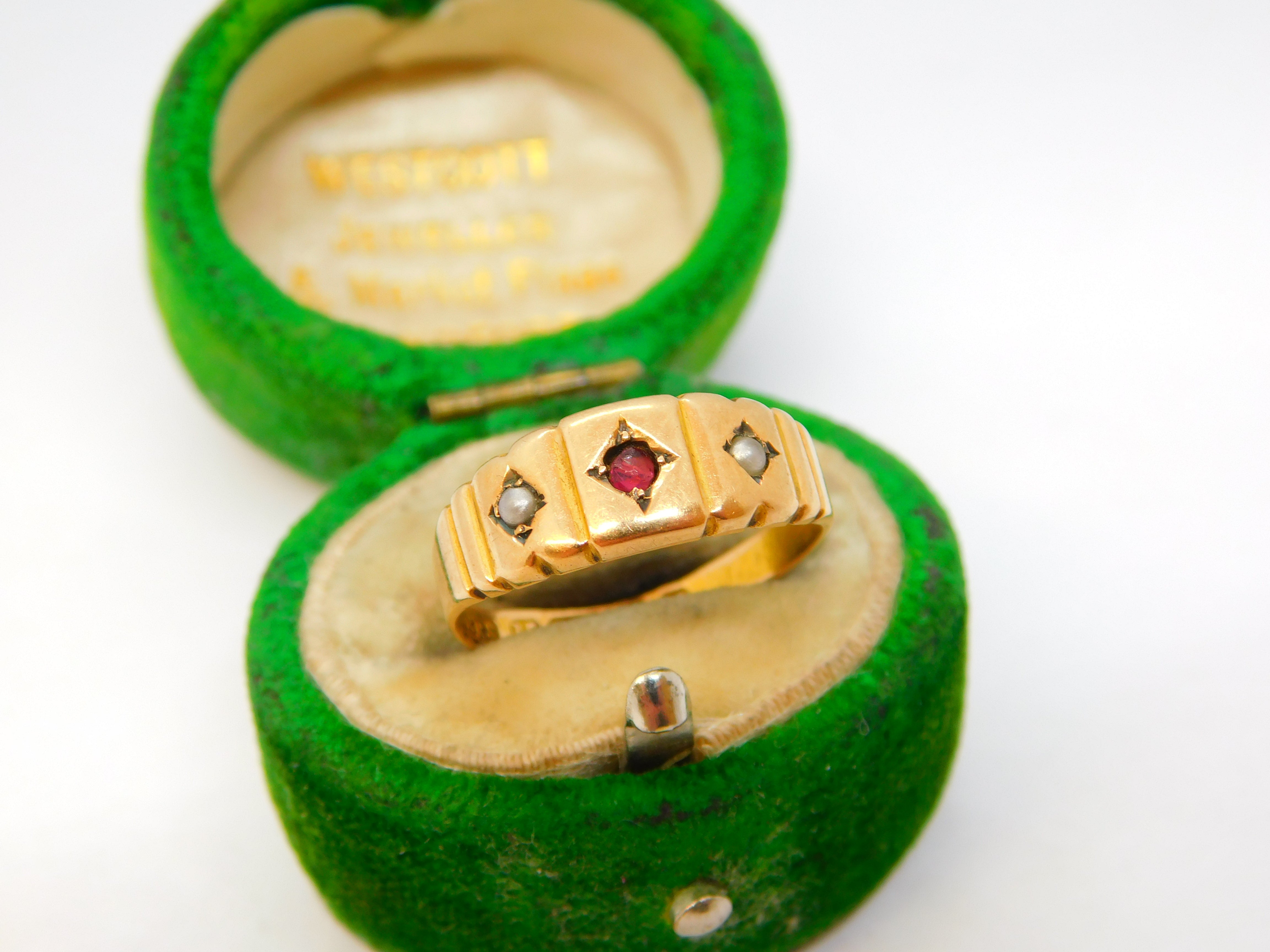 Details: A fantastic and wonderfully designed antique Victorian 15ct yellow gold boat ring set with two seed pearls flanking a central almandine garnet hallmarked crisply to the interior Birmingham 1886. This is a wonderful item that would make a perfect gift or addition to any collection. The BOX pictured is for PRESENTATION ONLY and is NOT included in the listings but used to frame the pictures unless specifically stated otherwise.