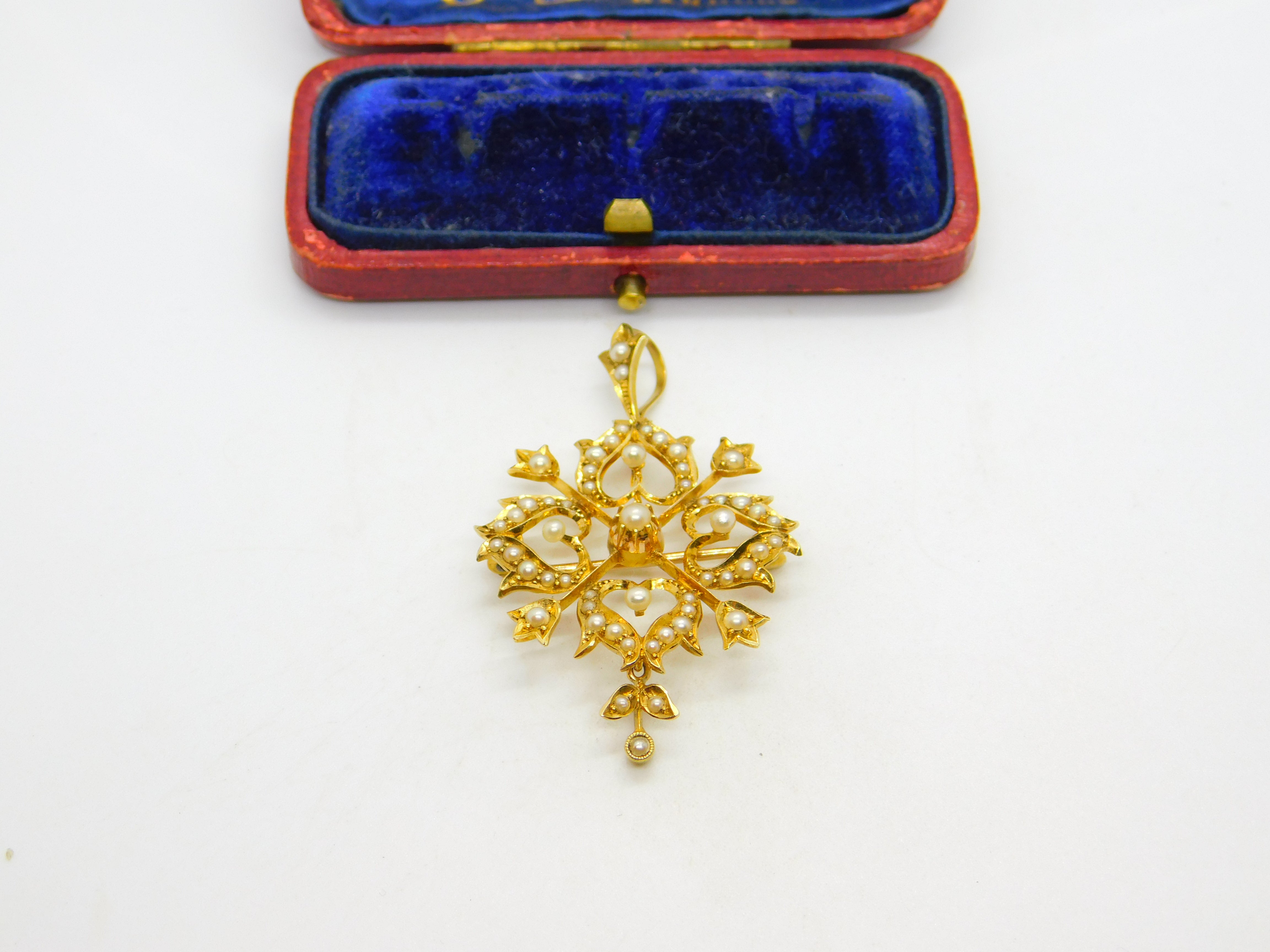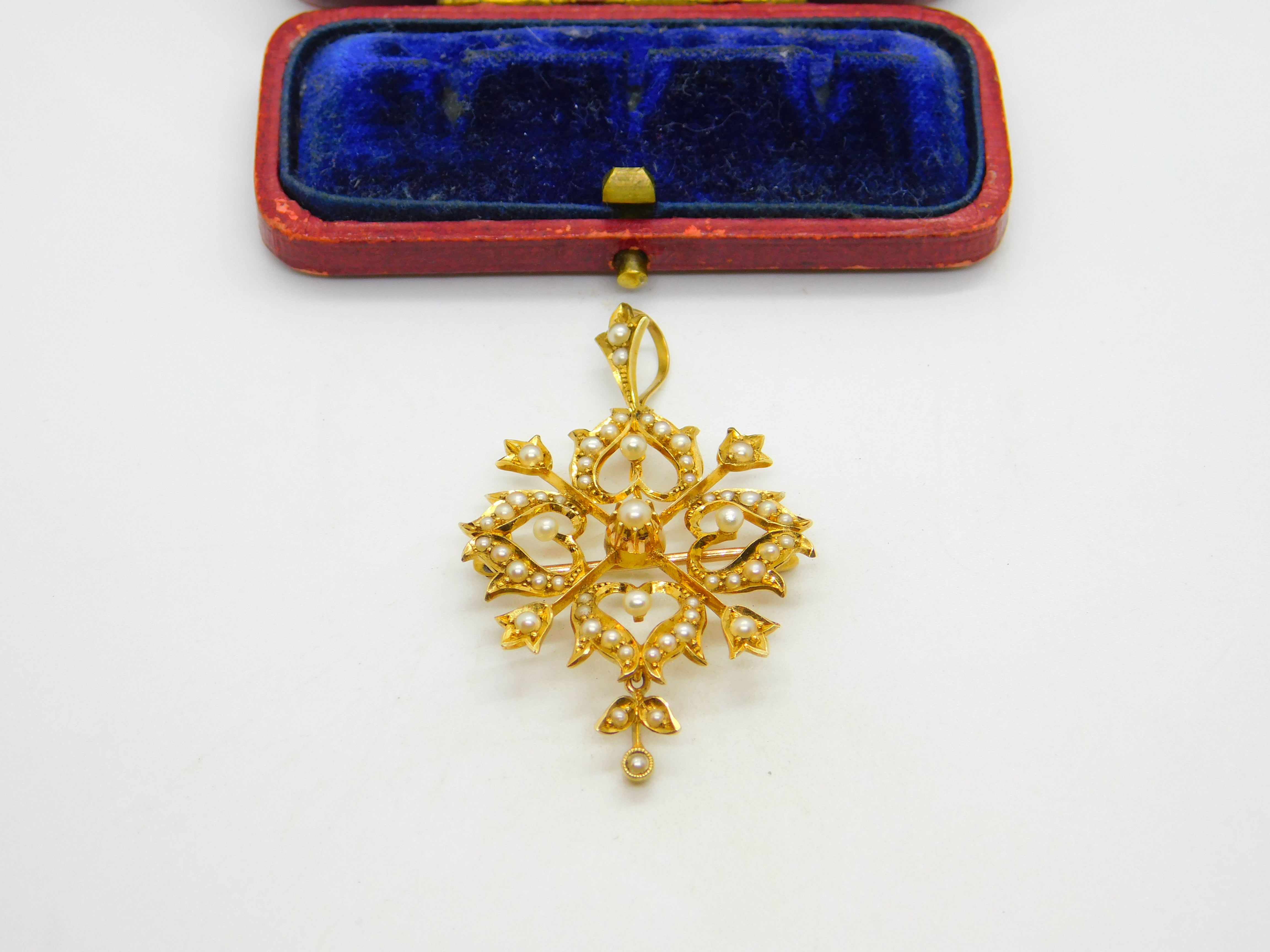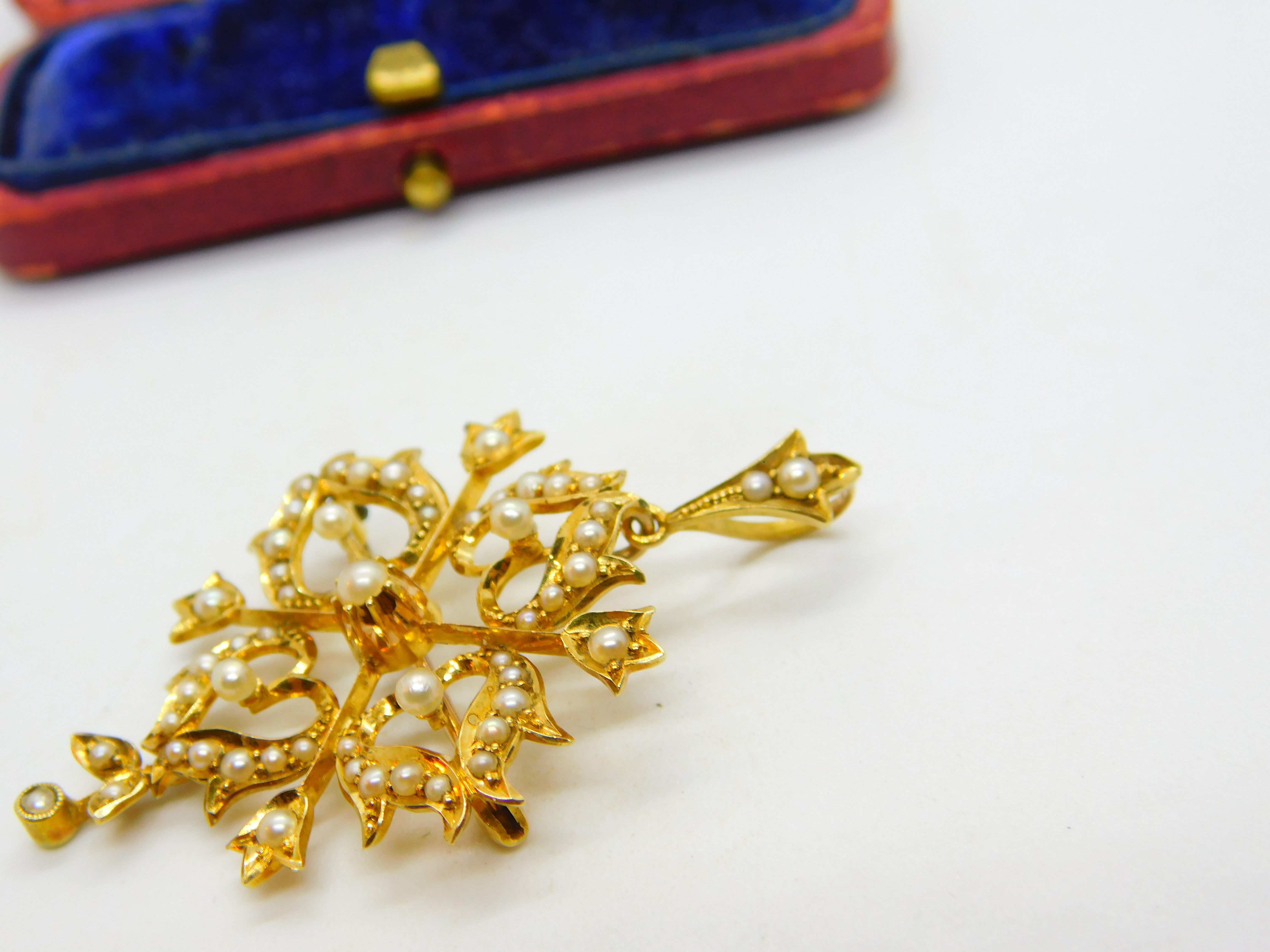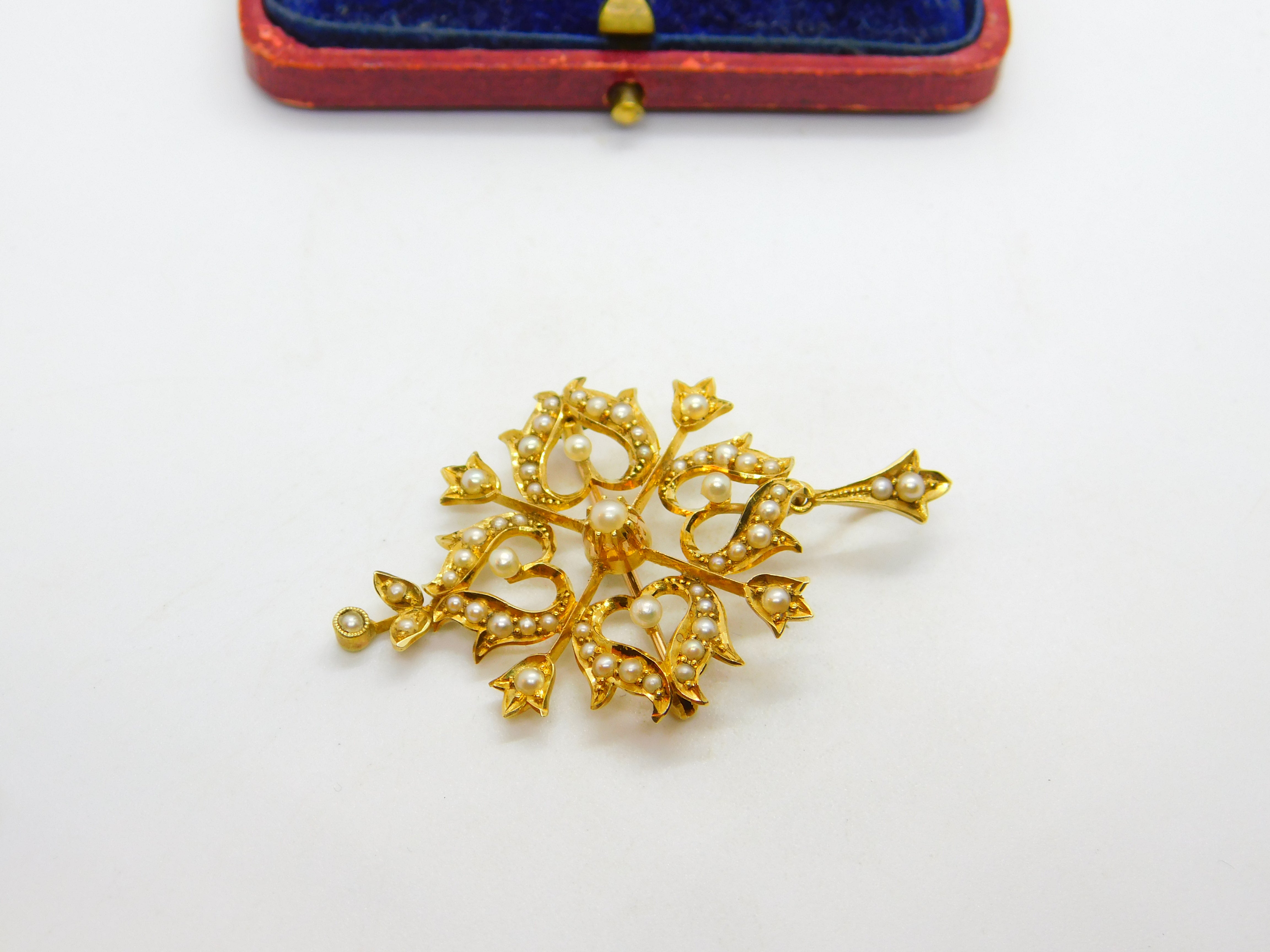 Details: A fantastic and wonderfully designed antique Victorian 15ct yellow gold floral lavalier drop pendant set throughout with seed pearls hallmarked '15ct' to the reverse c1890. Superb condition, could also be worn as a brooch.  This is a wonderful item that would make a perfect gift or addition to any collection. The BOX pictured is for PRESENTATION ONLY and is NOT included in the listings but used to frame the pictures unless specifically stated otherwise.