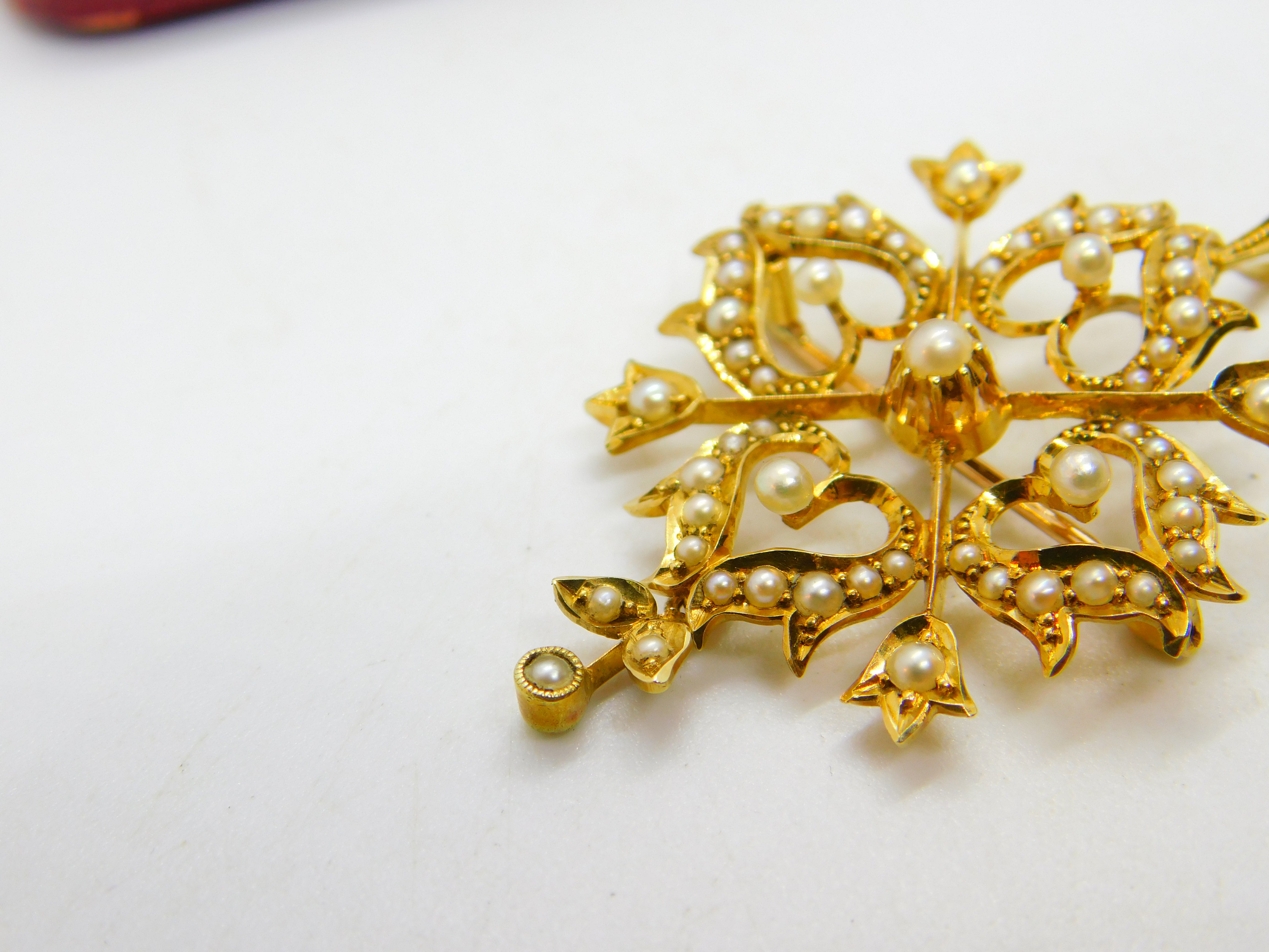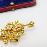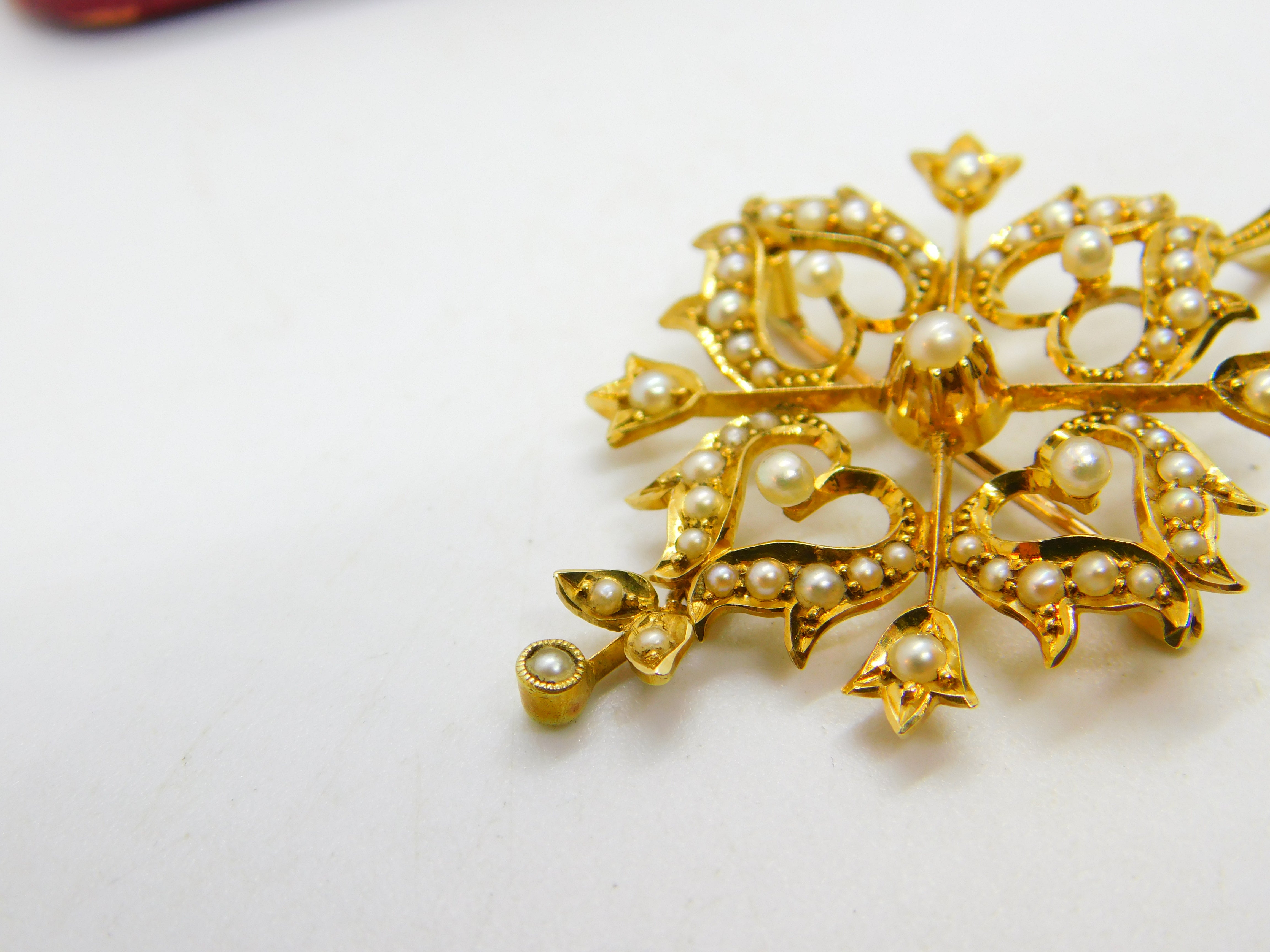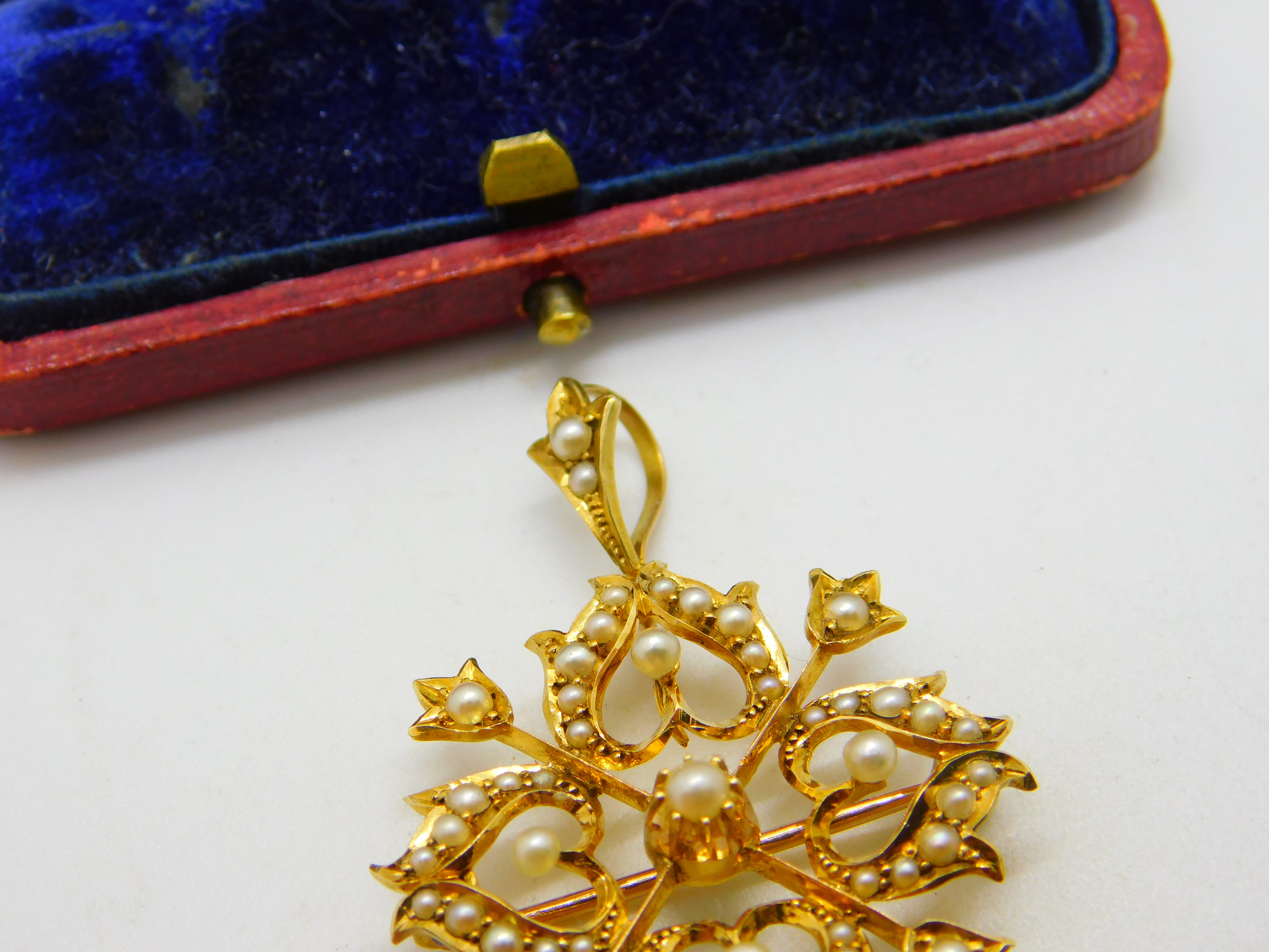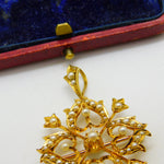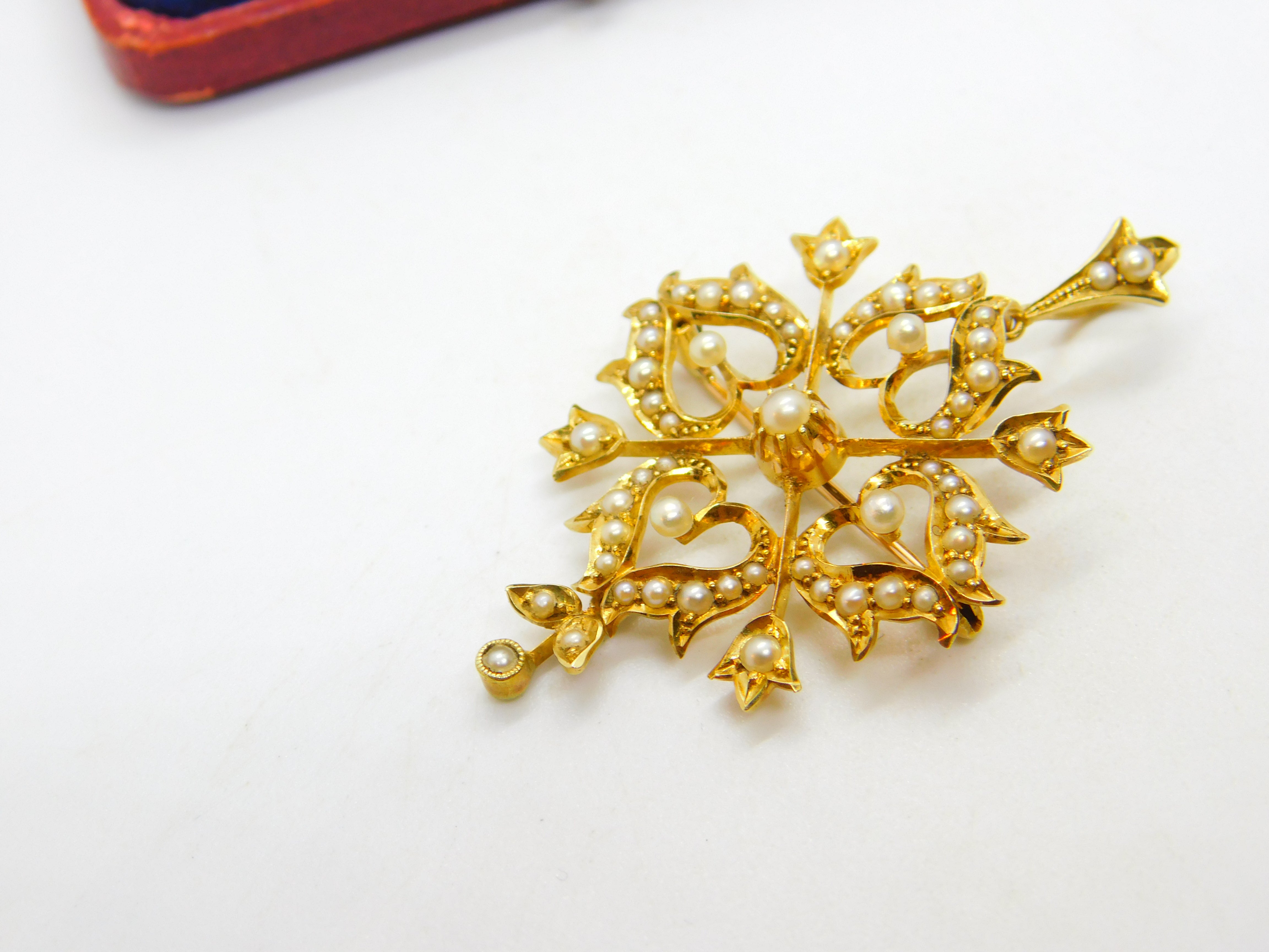 Details: A fantastic and wonderfully designed antique Victorian 15ct yellow gold floral lavalier drop pendant set throughout with seed pearls hallmarked '15ct' to the reverse c1890. Superb condition, could also be worn as a brooch.  This is a wonderful item that would make a perfect gift or addition to any collection. The BOX pictured is for PRESENTATION ONLY and is NOT included in the listings but used to frame the pictures unless specifically stated otherwise.