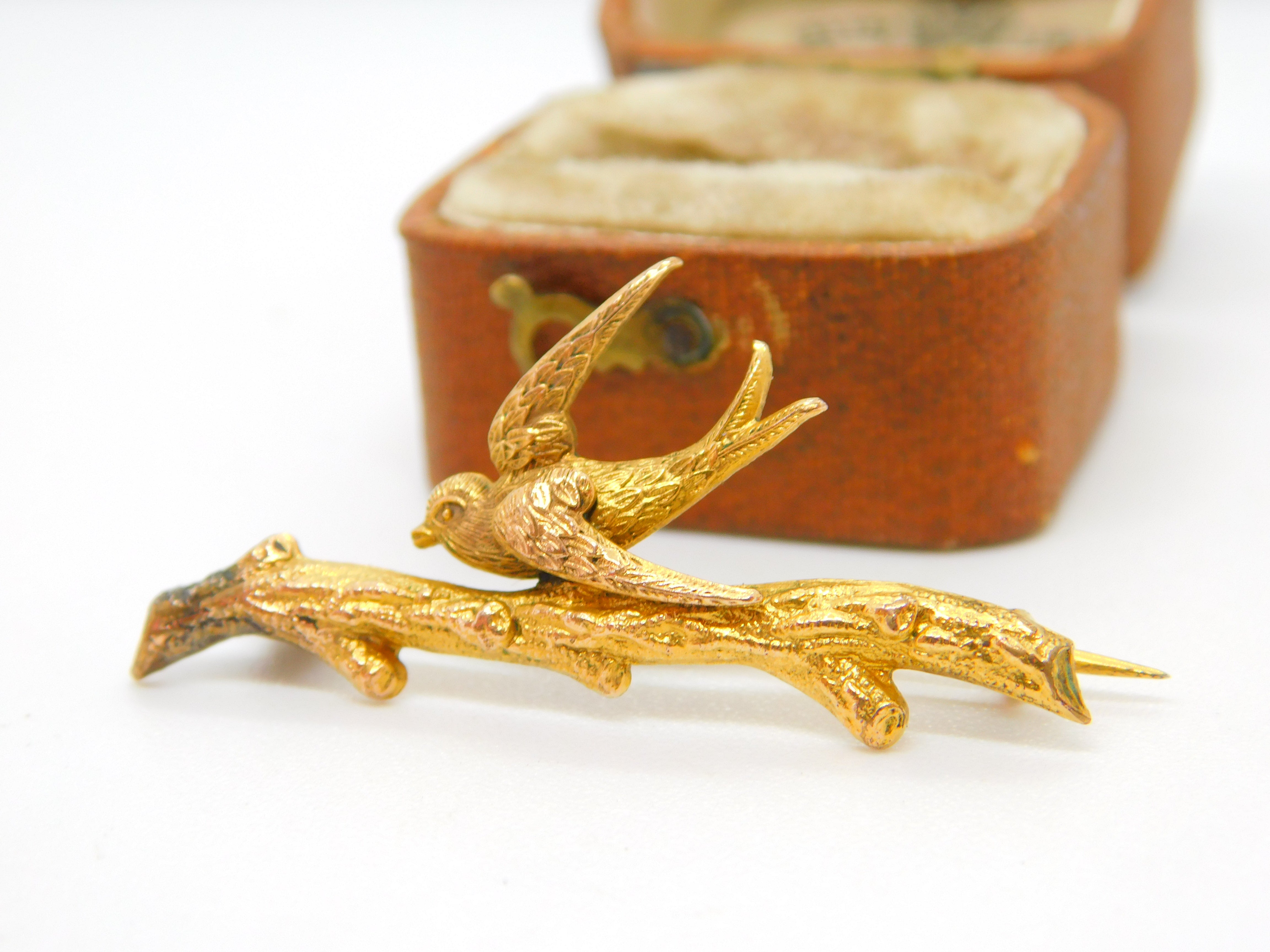 Details: A fantastic and wonderfully designed antique Victorian 15ct yellow gold swallow bird sweetheart brooch with lovely detailing, the swallow perched on a branch c1880, the gold has been XRF tested as it is unmarked. This is a wonderful item that would make a perfect gift or addition to any collection. The BOX pictured is for PRESENTATION ONLY and is NOT included in the listings but used to frame the pictures unless specifically stated otherwise.