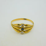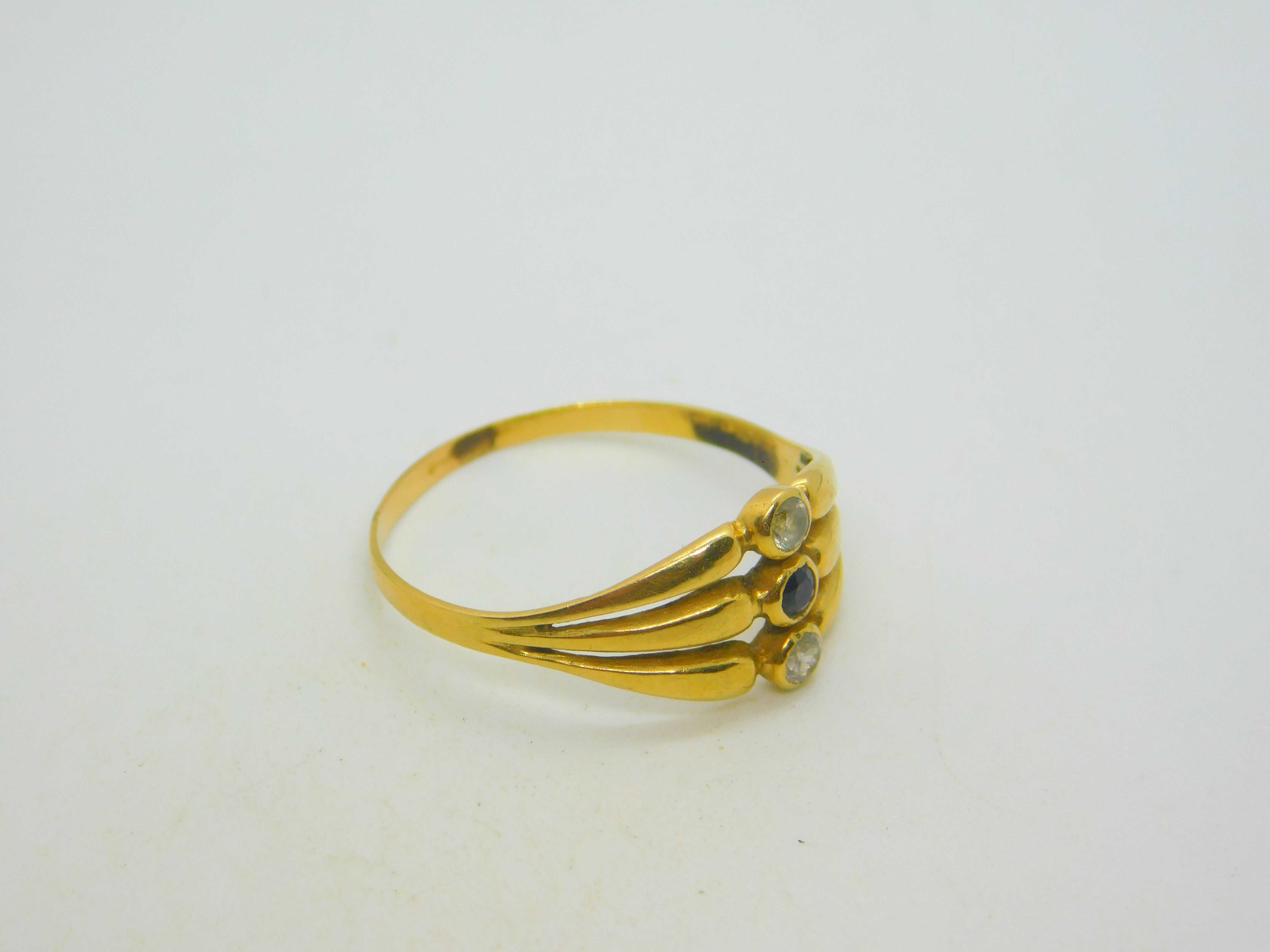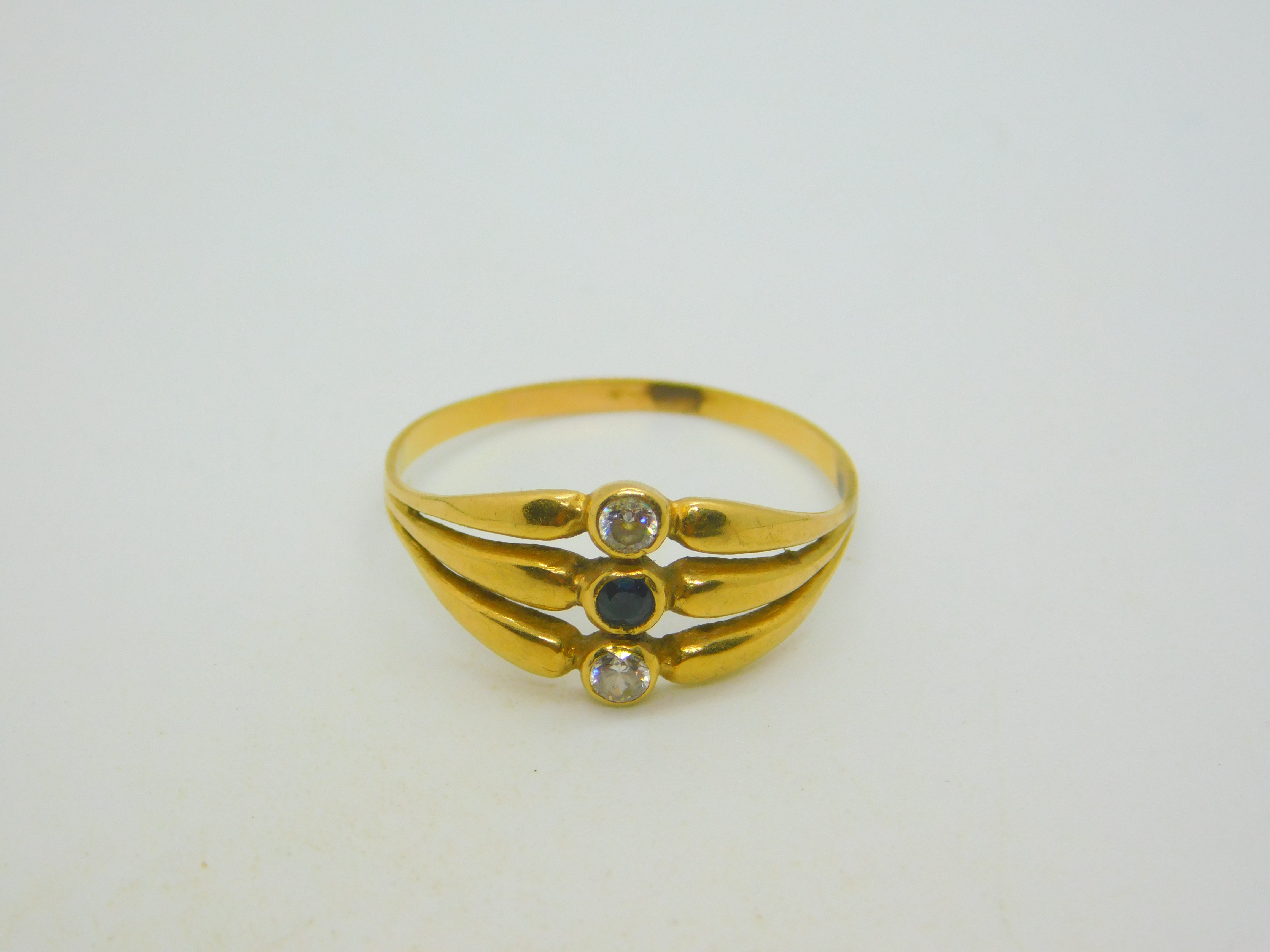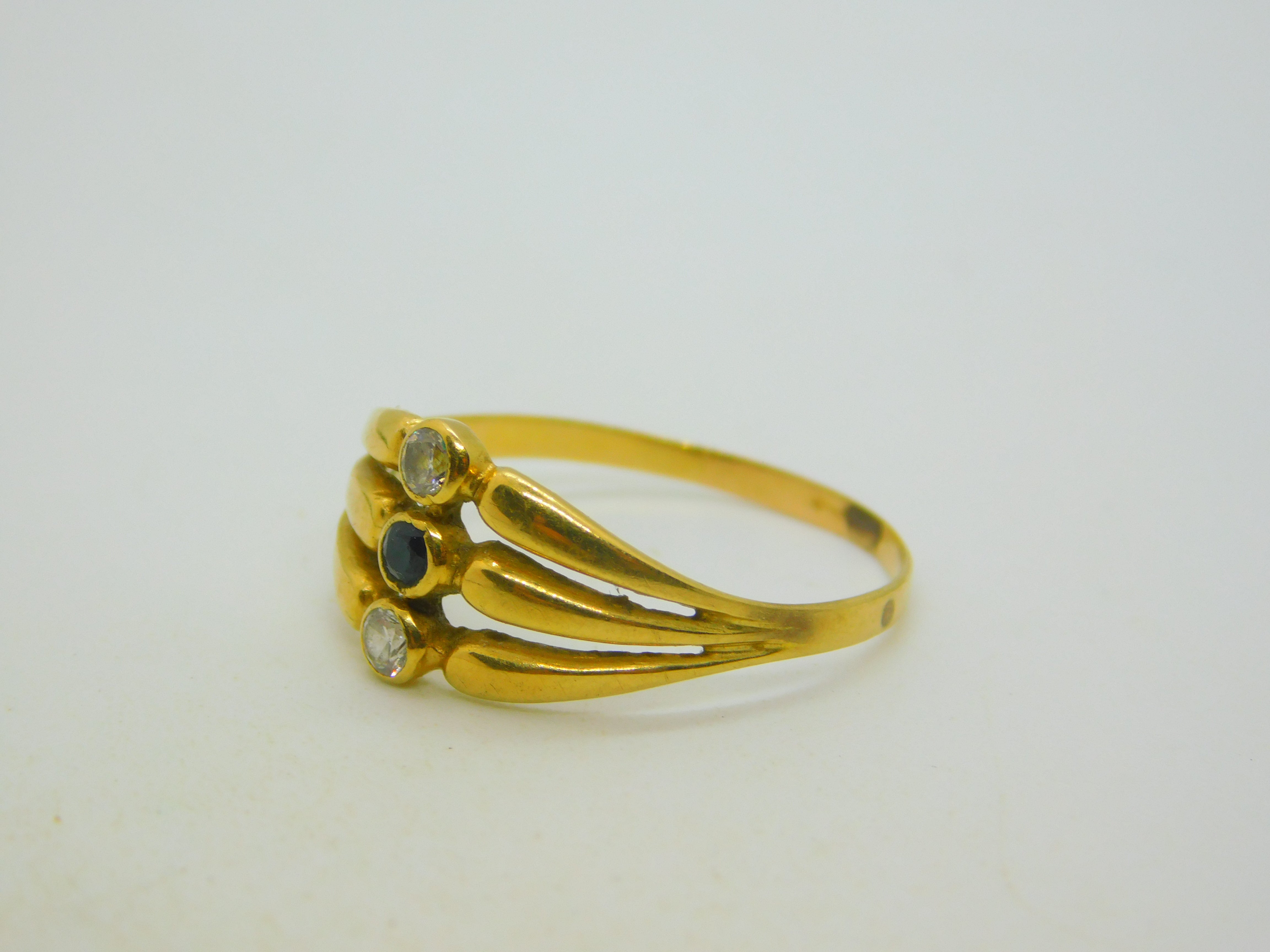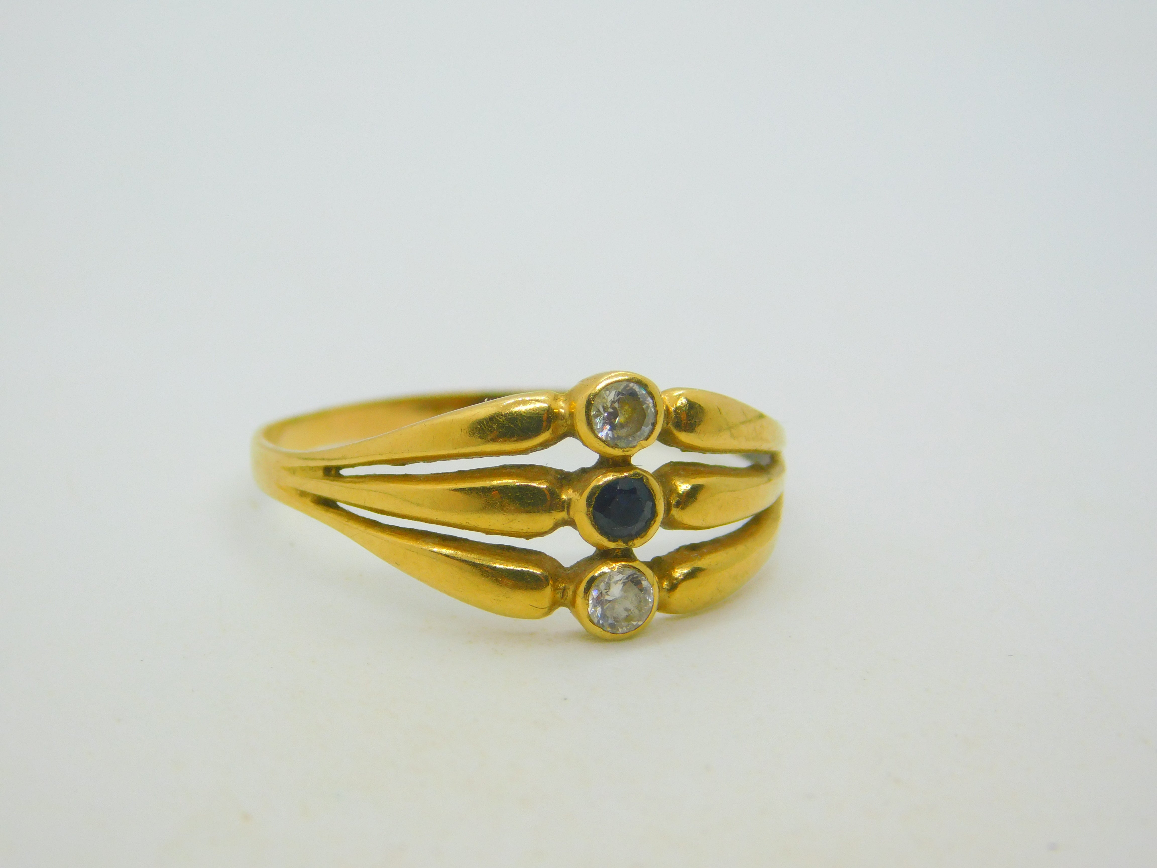 Details: A fantastic and wonderfully designed antique Victorian 18ct yellow gold triple-band dress ring set with two diamonds flanking a central sapphire c1890, the gold has been XRF tested, the stones have been tested. This is a wonderful item that would make a perfect gift or addition to any collection. The BOX pictured is for PRESENTATION ONLY and is NOT included in the listings but used to frame the pictures unless specifically stated otherwise.