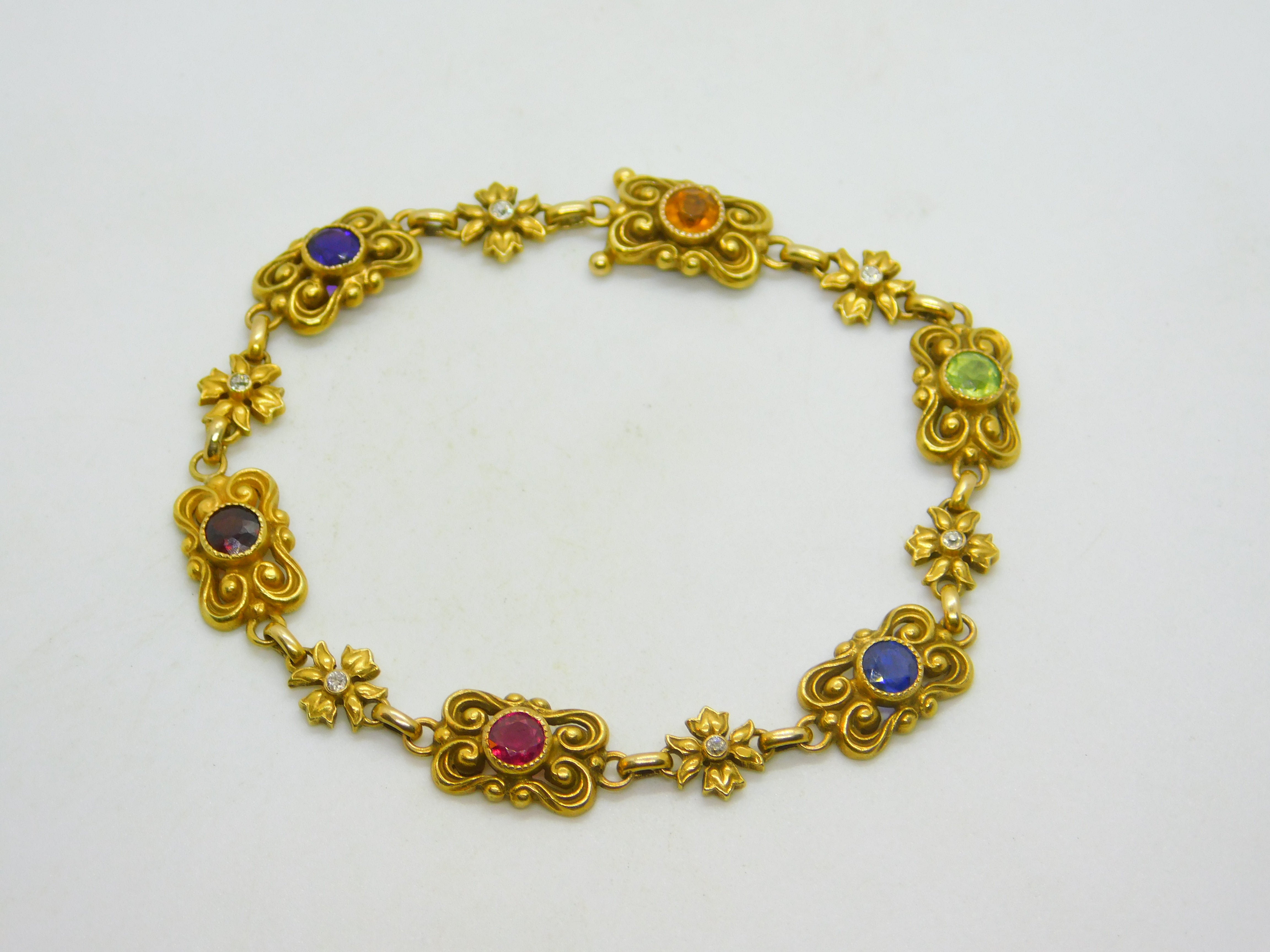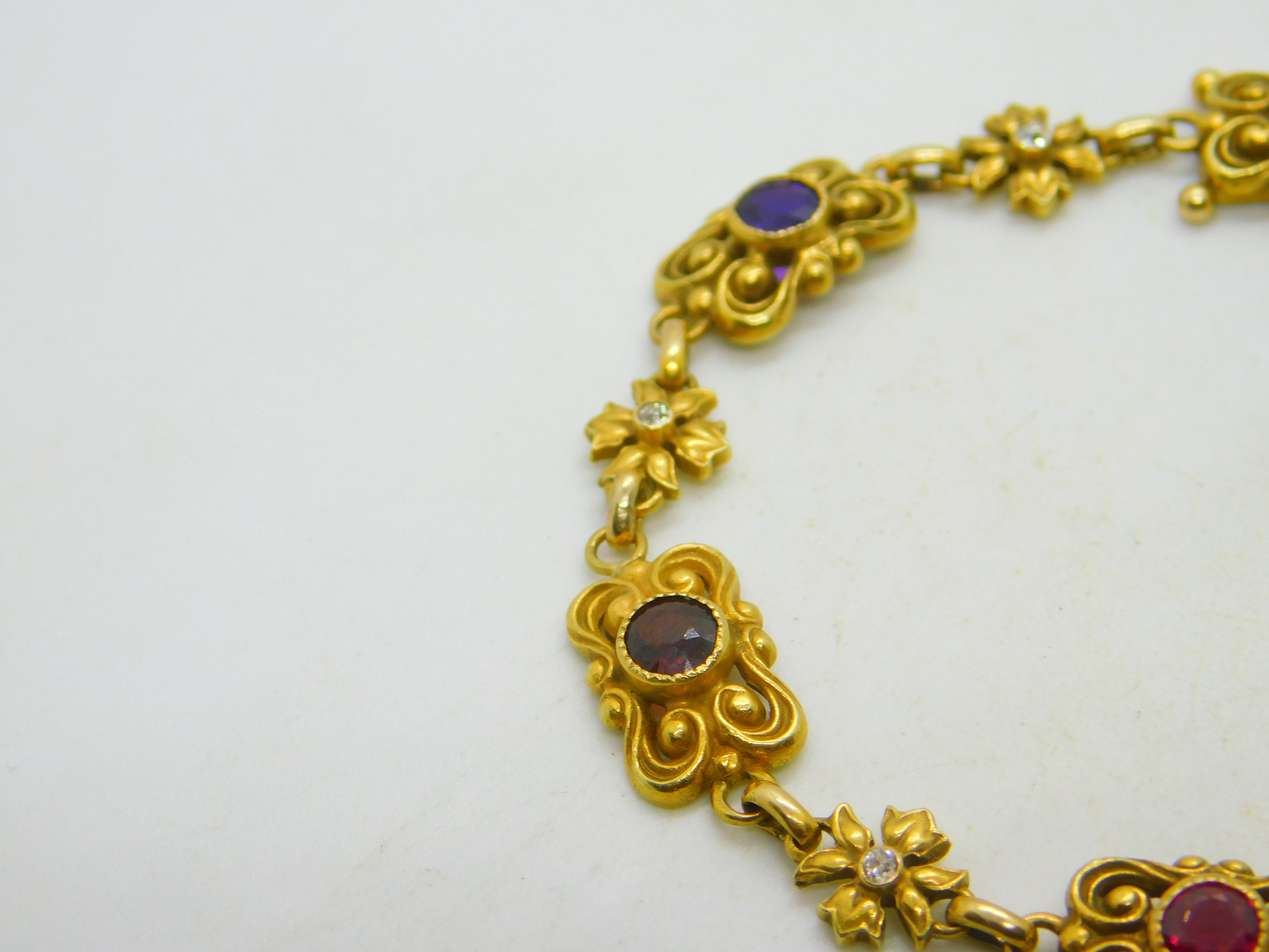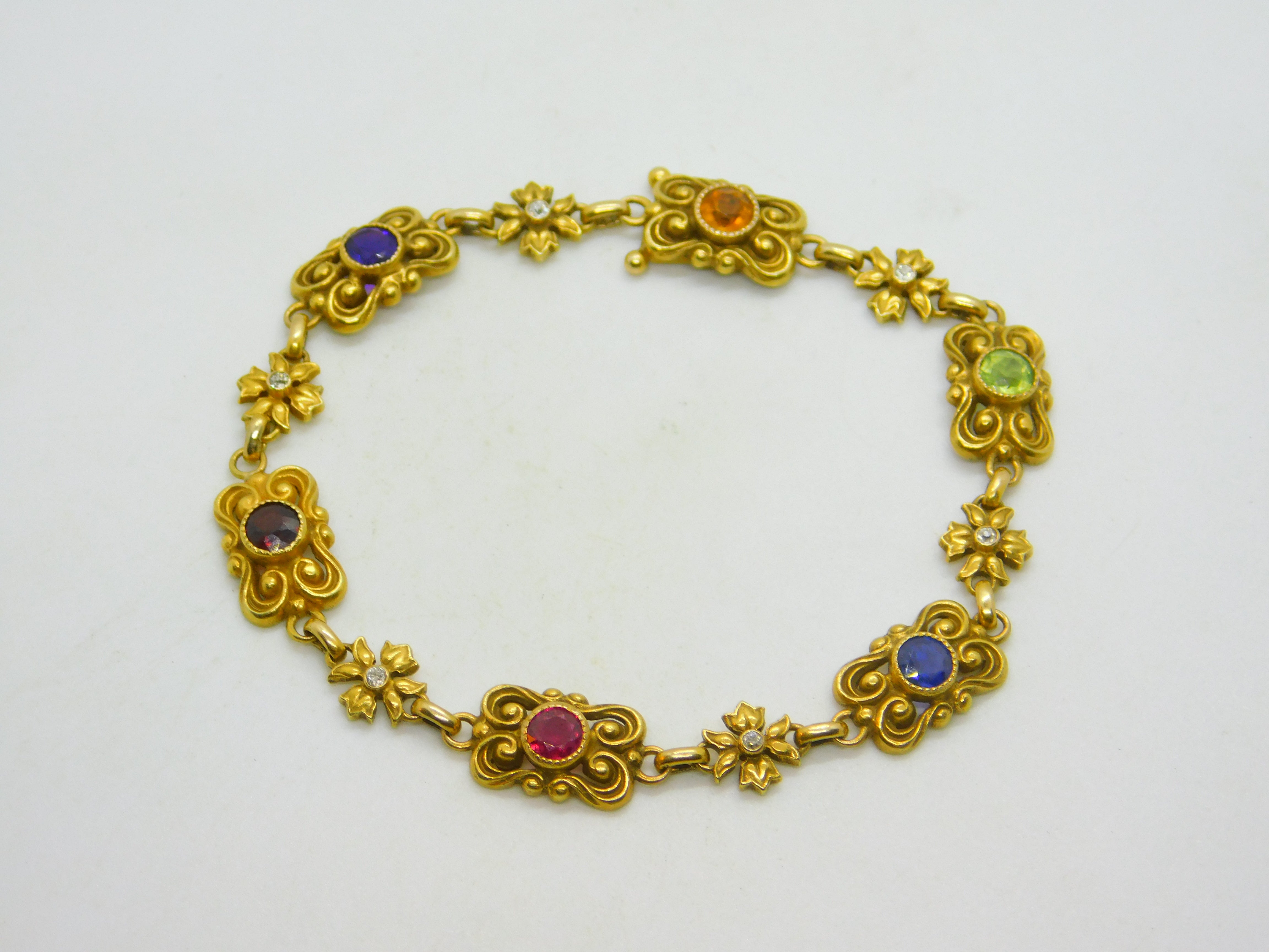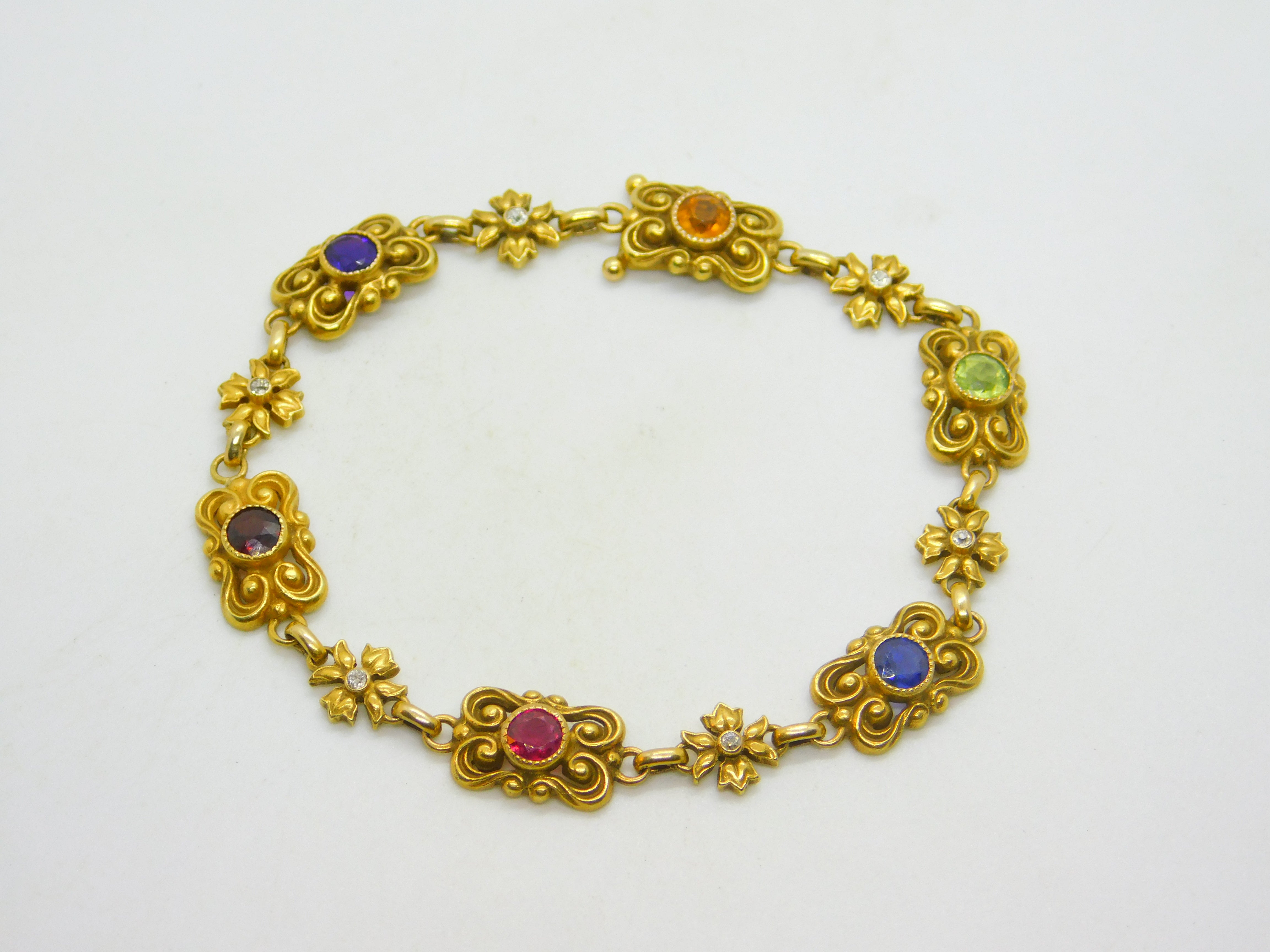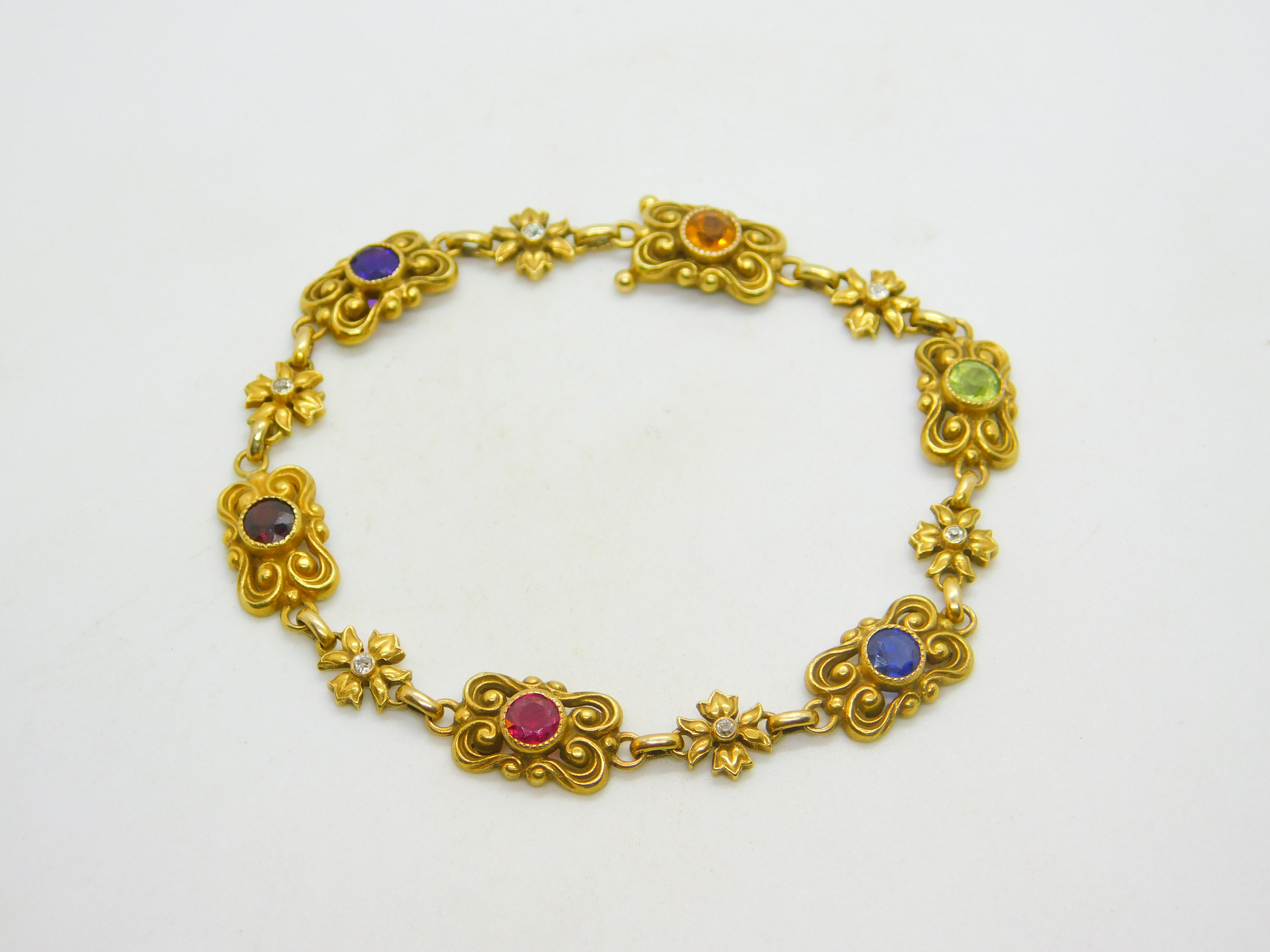 Details: A fantastic and wonderfully designed antique Victorian 18ct yellow gold acrostic style floral panel bracelet set with amethyst, Garnet, Ruby, Sapphire, Peridot & Citrine with small diamonds set in each intervening panel. The gold has been XRF tested as it is unmarked and the item dates from the 1880s, the stones have all bess tested. a truly exquisite example. This is a wonderful item that would make a perfect gift or addition to any collection. The BOX pictured is for PRESENTATION ONLY and is NOT included in the listings but used to frame the pictures unless specifically stated otherwise.