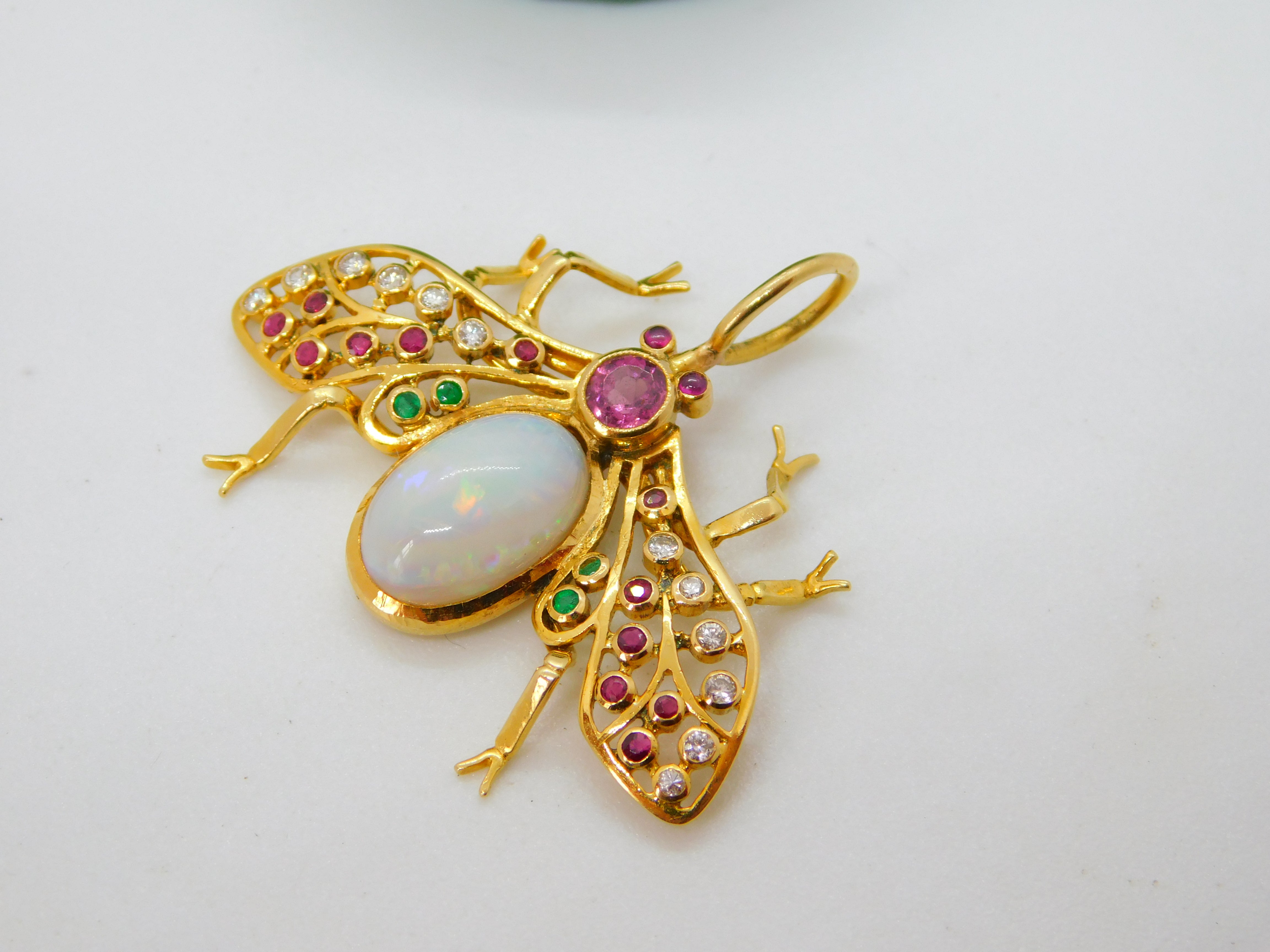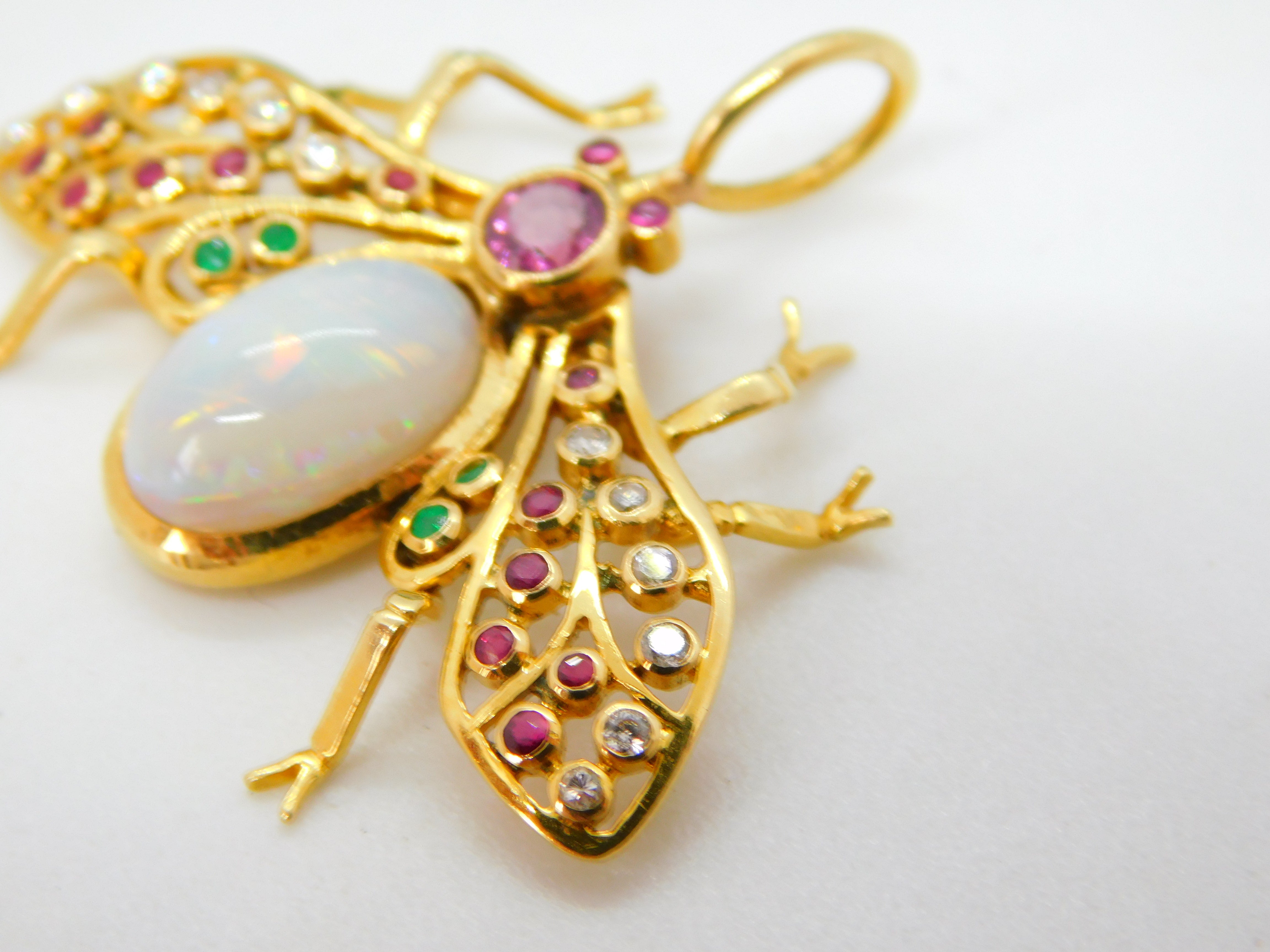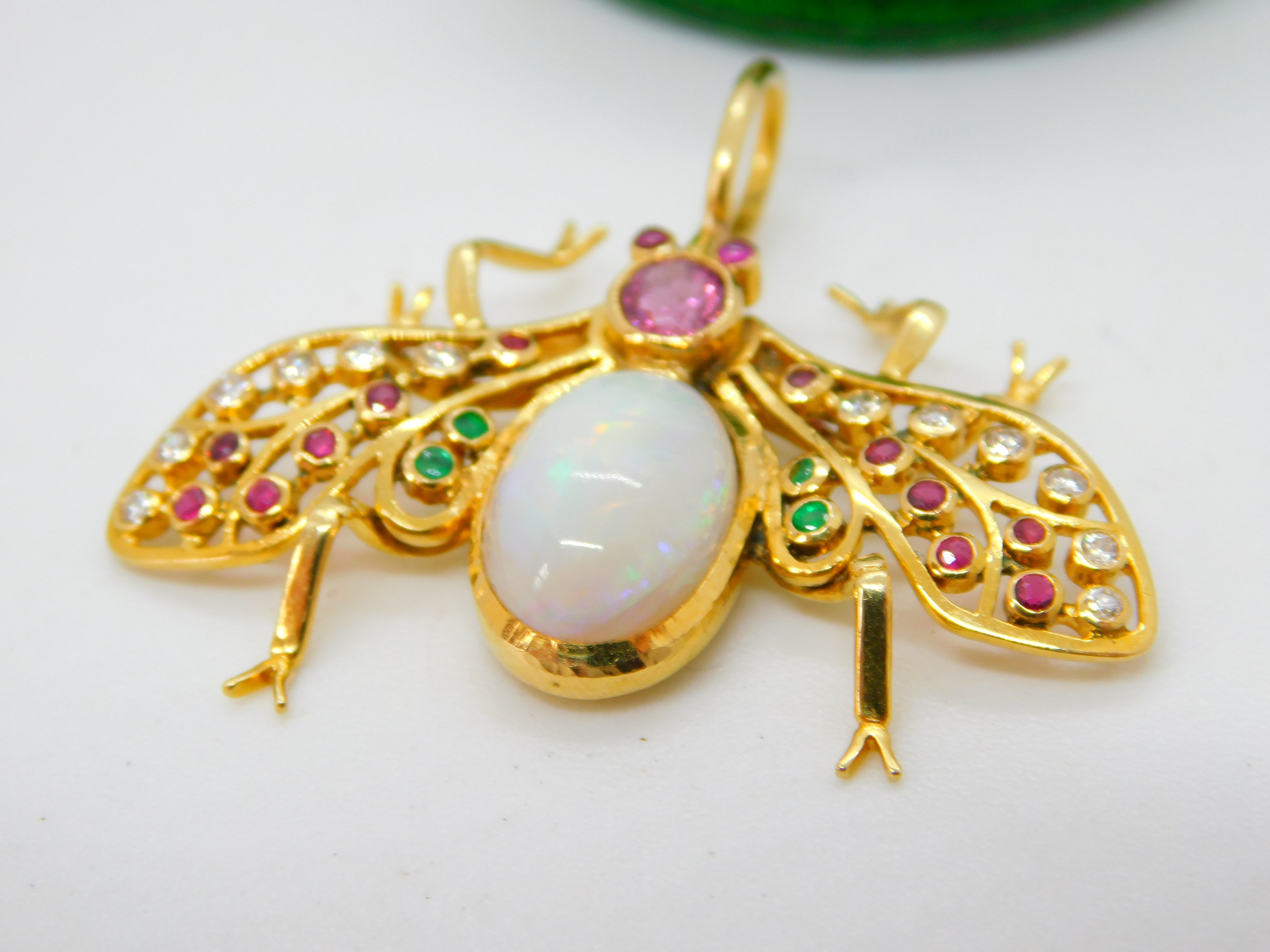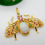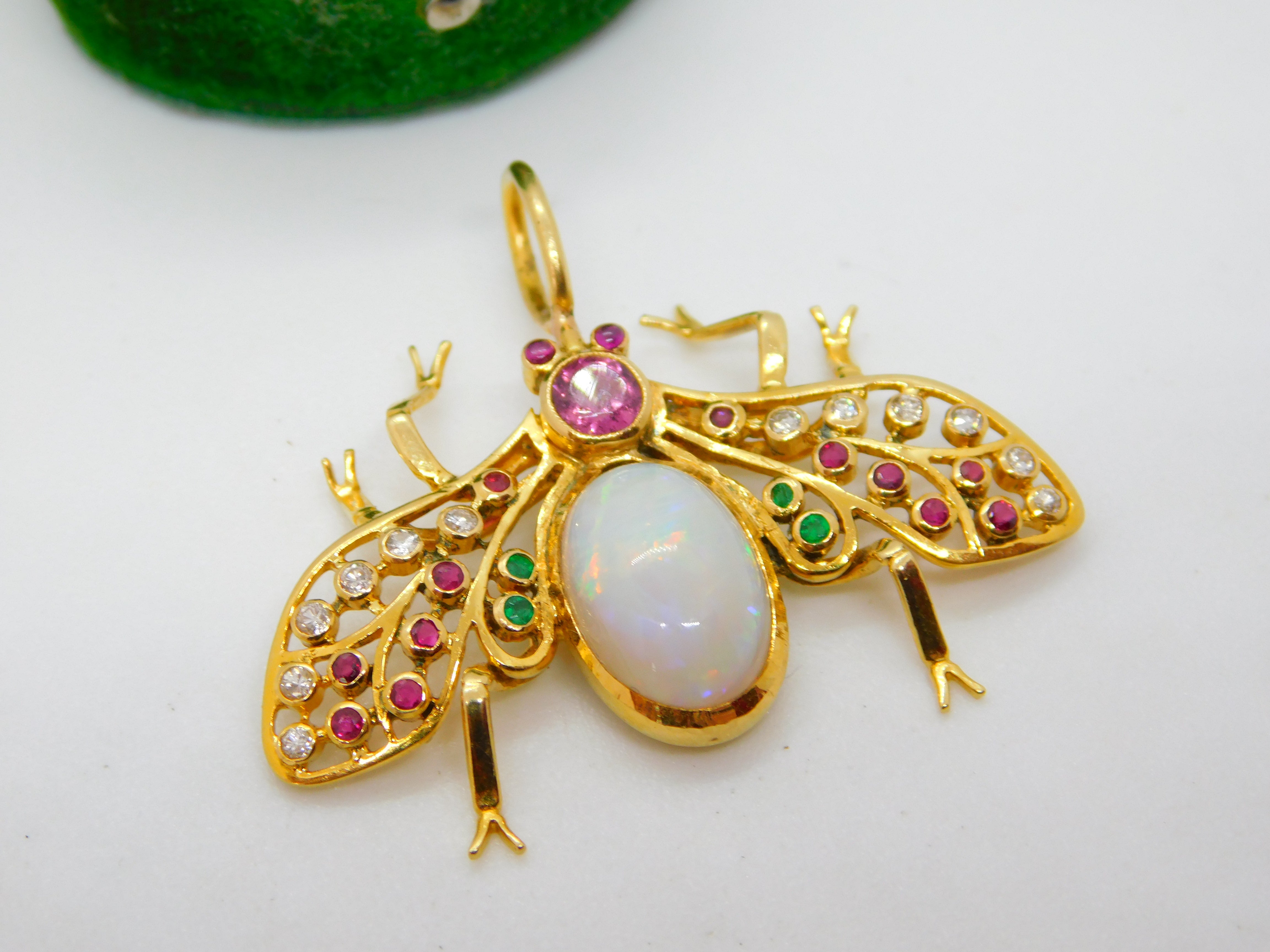 Details: A fantastic and wonderfully designed antique Victorian 18ct yellow gold honey bee or insect sweetheart drop pendant set with diamonds, rubies, emeralds, topaz & large cabochon opal to the centrepiece. The gold has been XRF tested as it is unmarked and all the surrounding stones have been tested. A stunning example of Victorian jewellery. This is a wonderful item that would make a perfect gift or addition to any collection. The BOX pictured is for PRESENTATION ONLY and is NOT included in the listings but used to frame the pictures unless specifically stated otherwise.