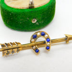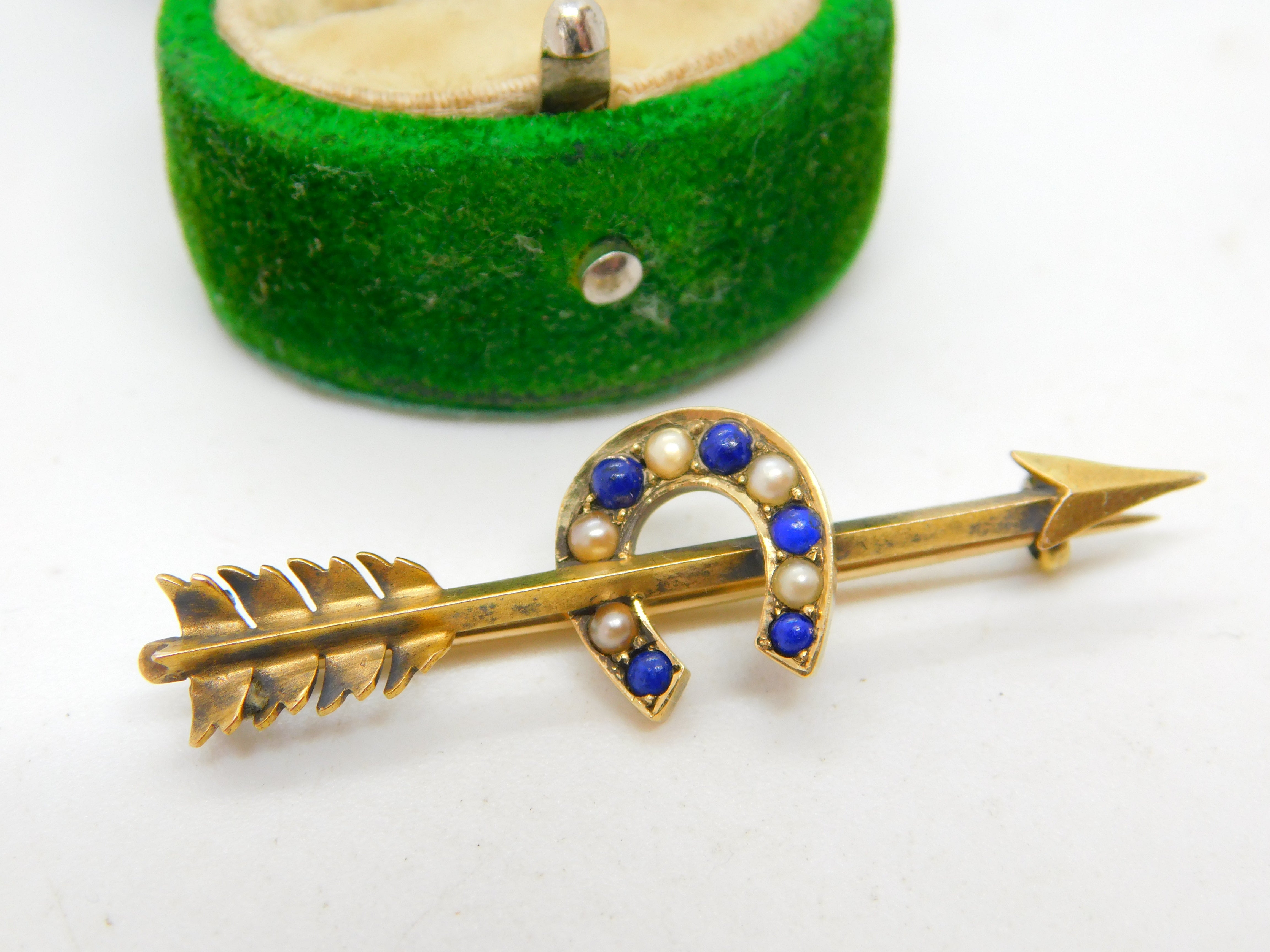 Victorian 18ct Gold, Lapis & Seed Pearl Arrow & Horseshoe Lucky Brooch c1890