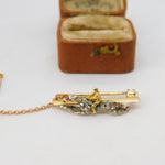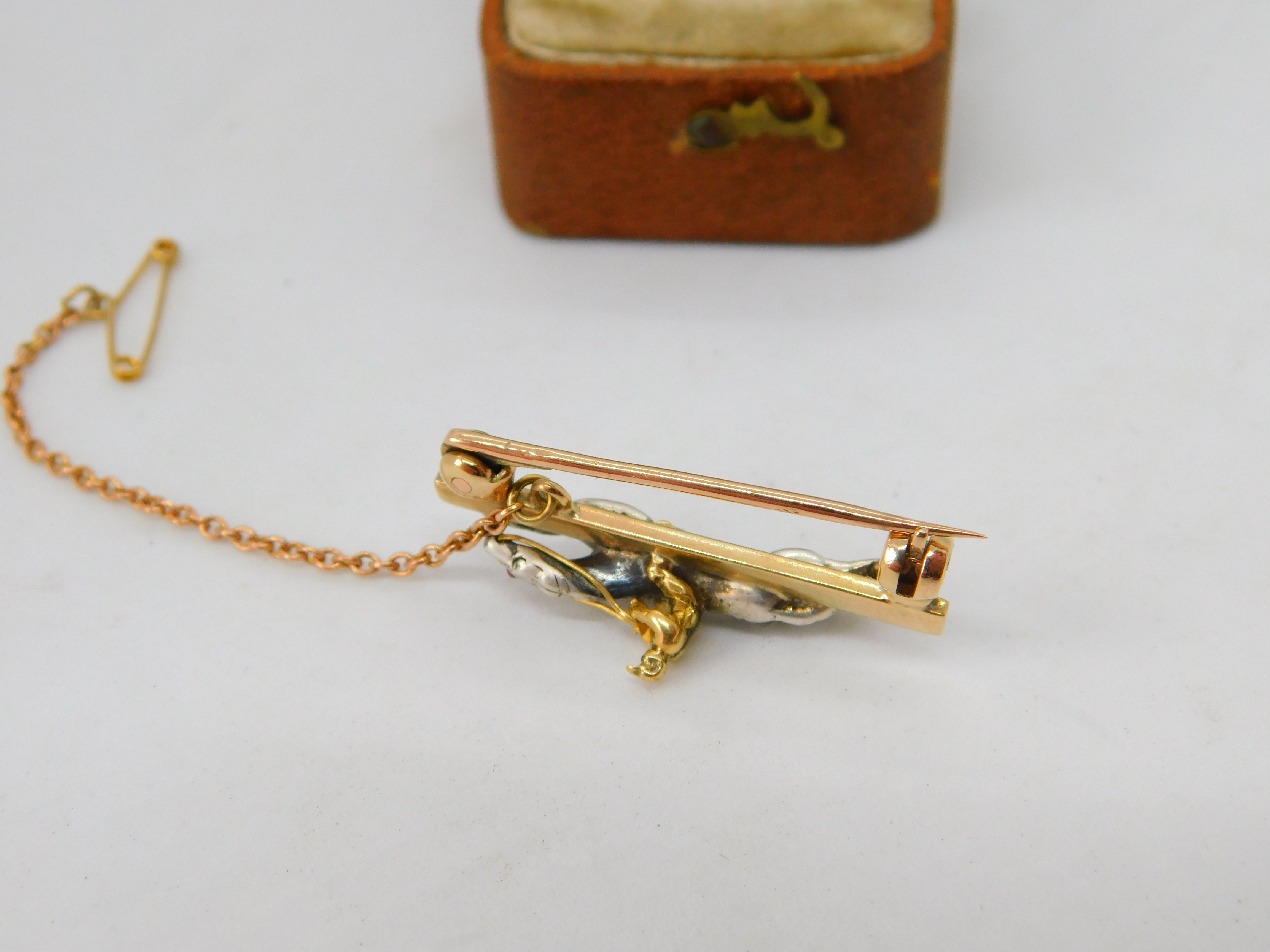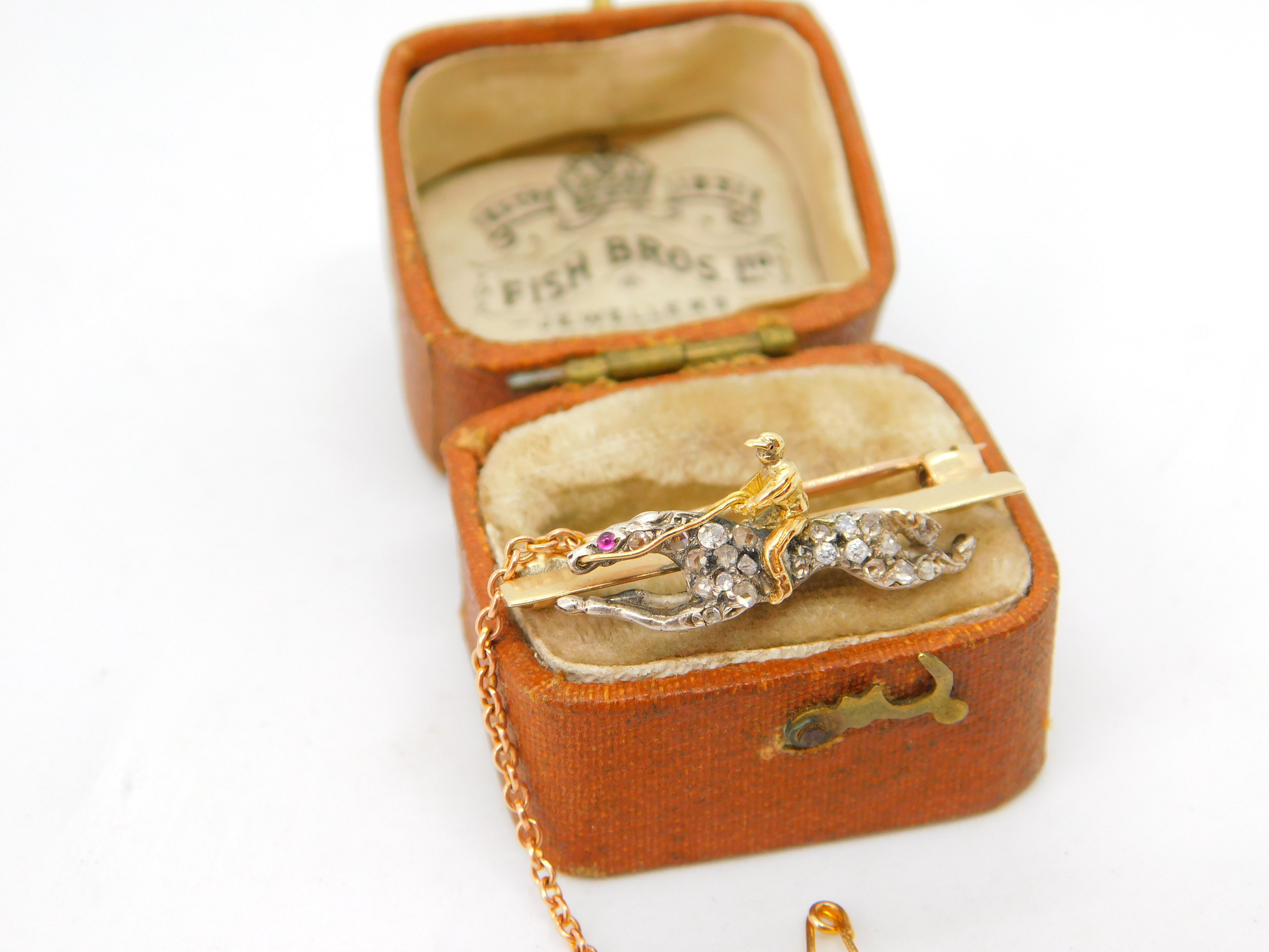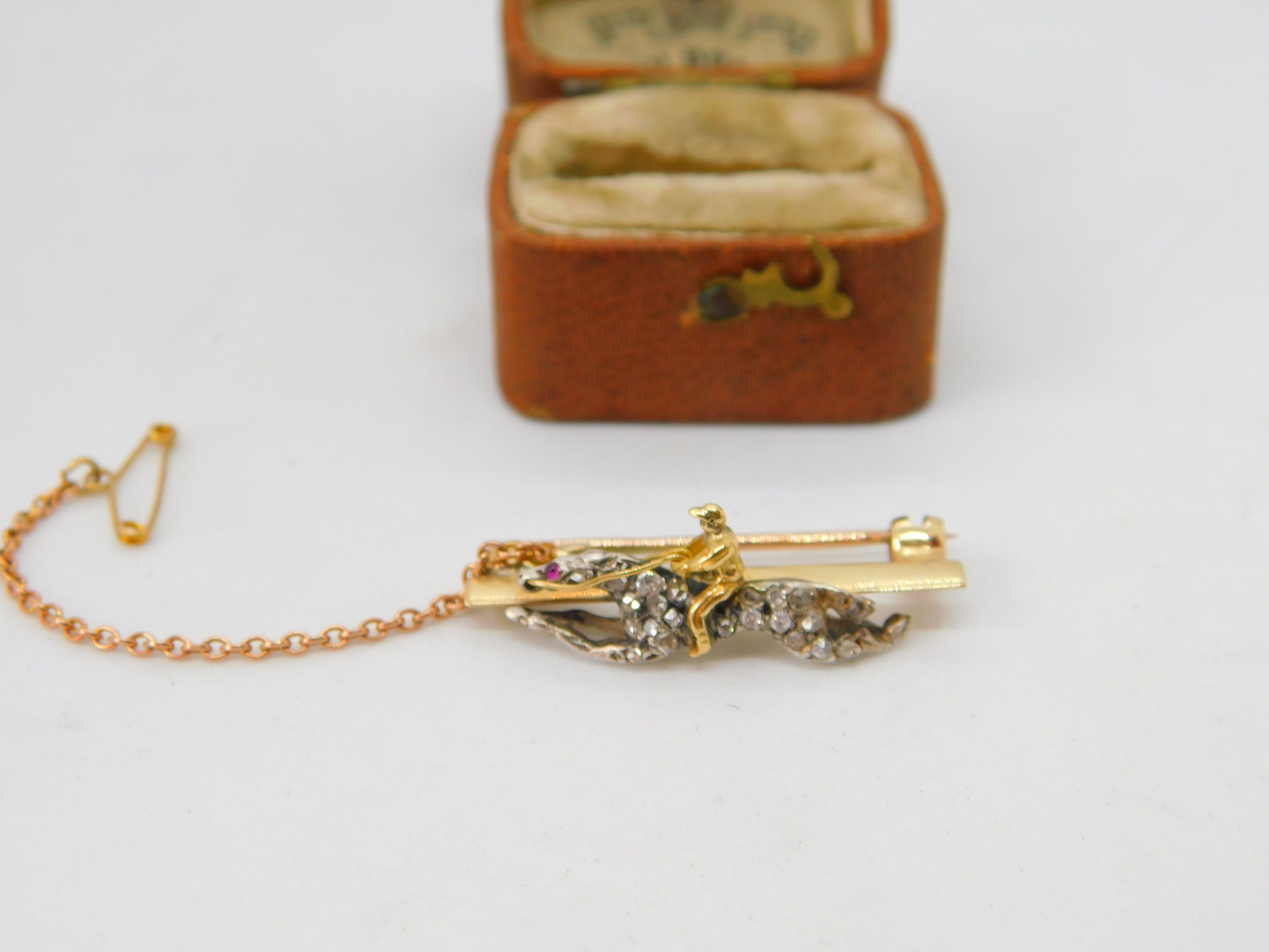 Details: A fantastic and wonderfully designed antique Victorian 18ct yellow gold horse racing jockey lucky brooch pin adorned with pave set diamonds and rubies and secured with a safety chain c1860. The gold has been XRF tested as it is unmarked. The diamonds have been tested. This is a wonderful item that would make a perfect gift or addition to any collection. The BOX pictured is for PRESENTATION ONLY and is NOT included in the listings but used to frame the pictures unless specifically stated otherwise.