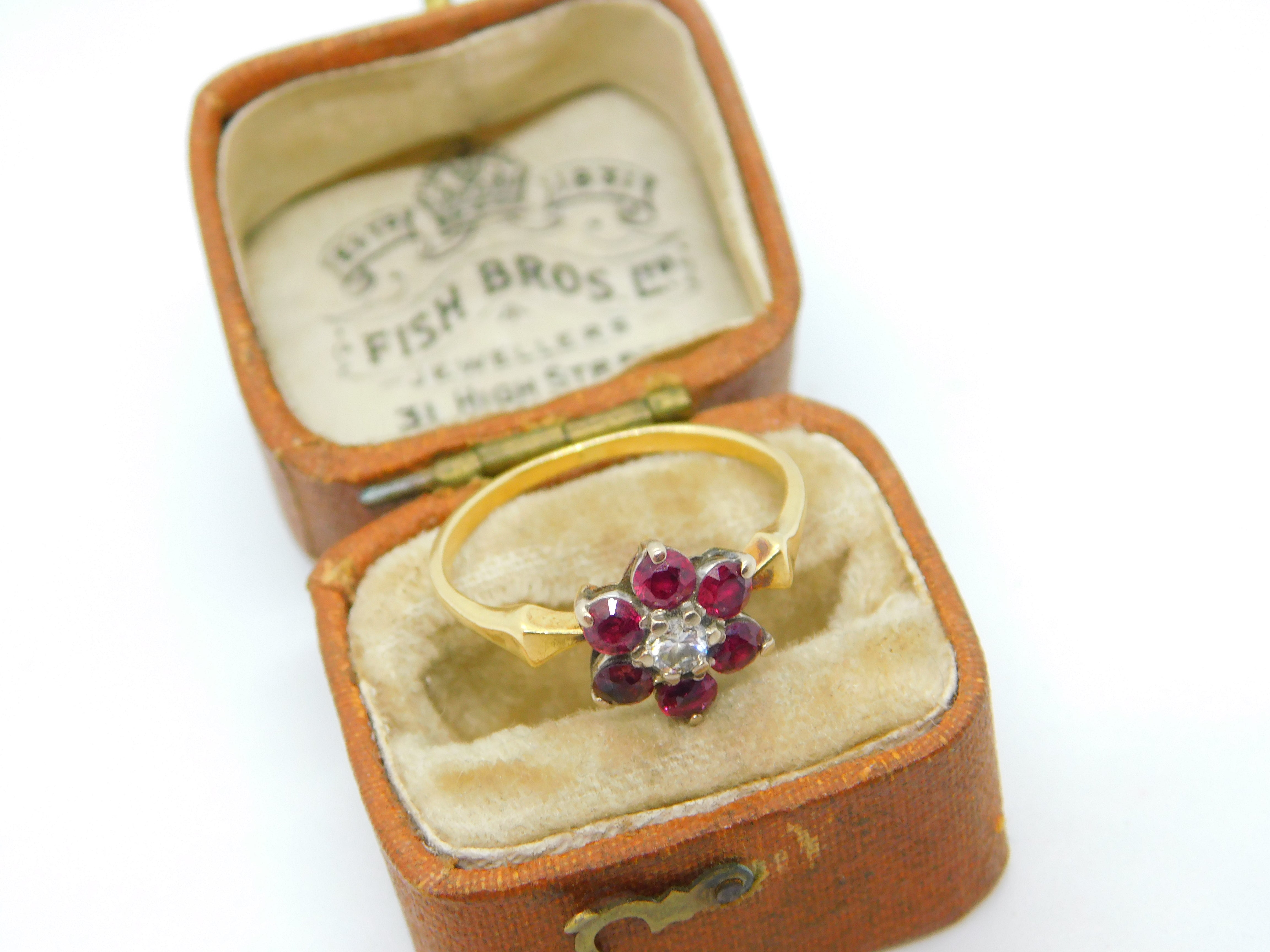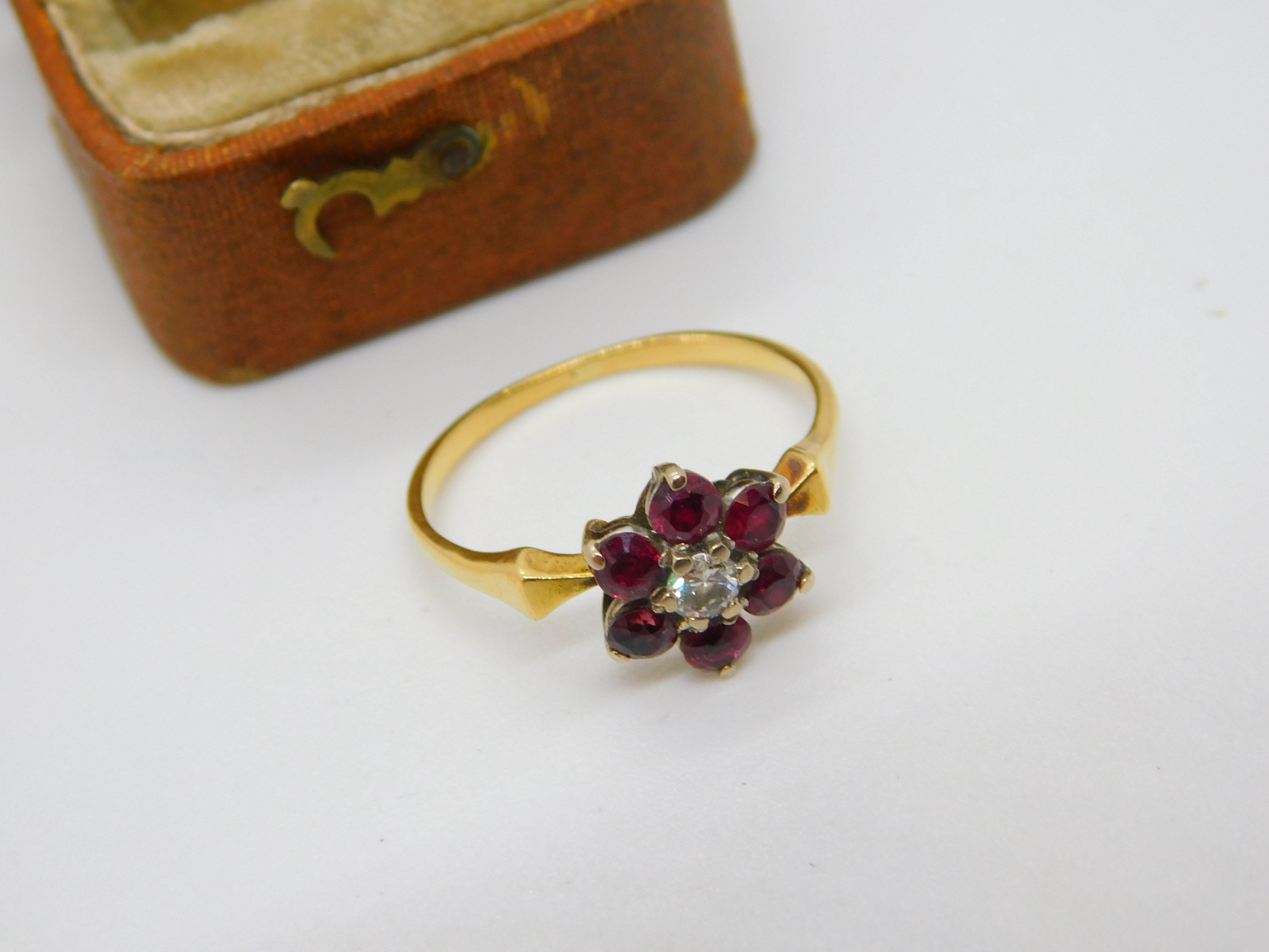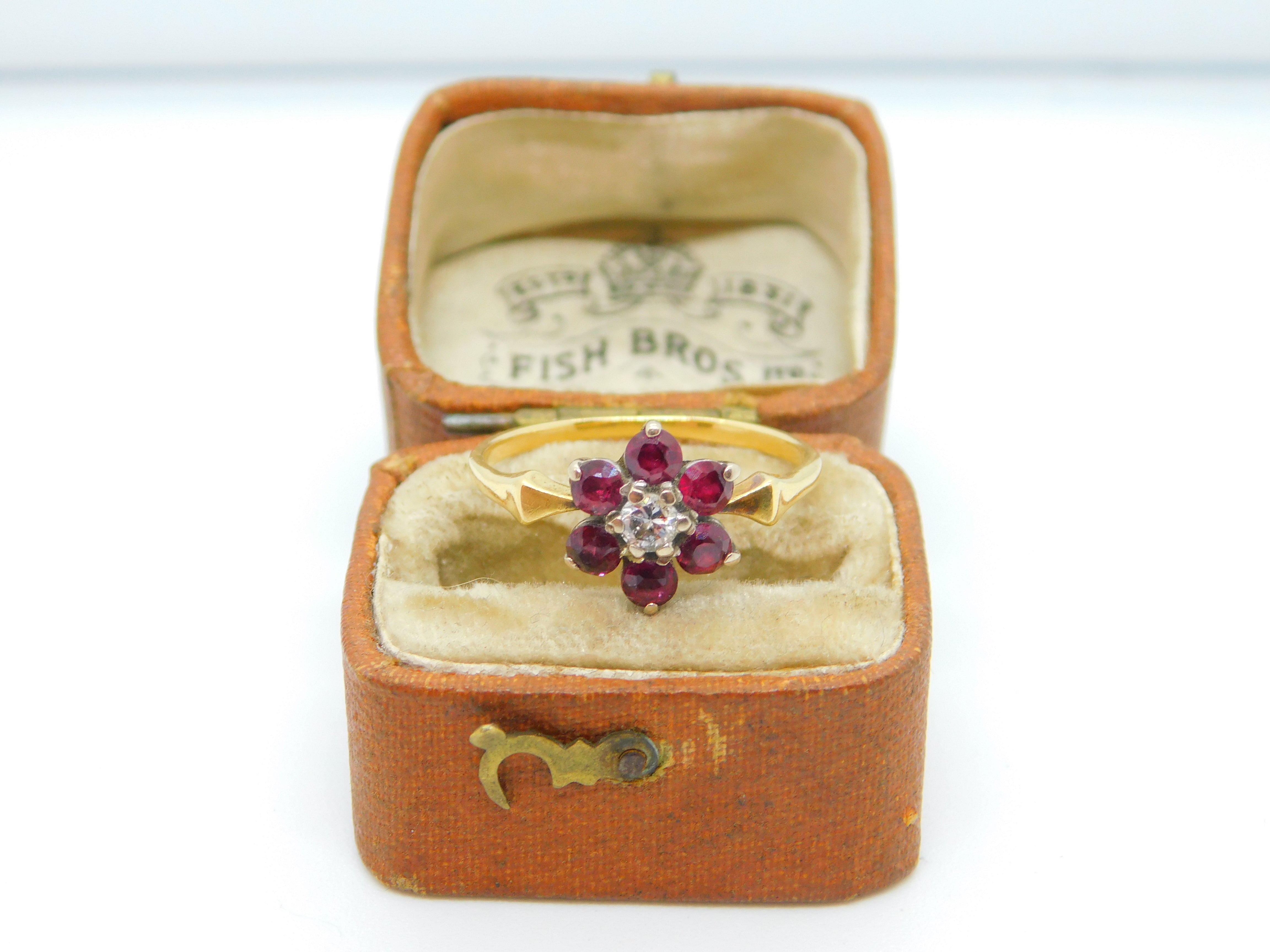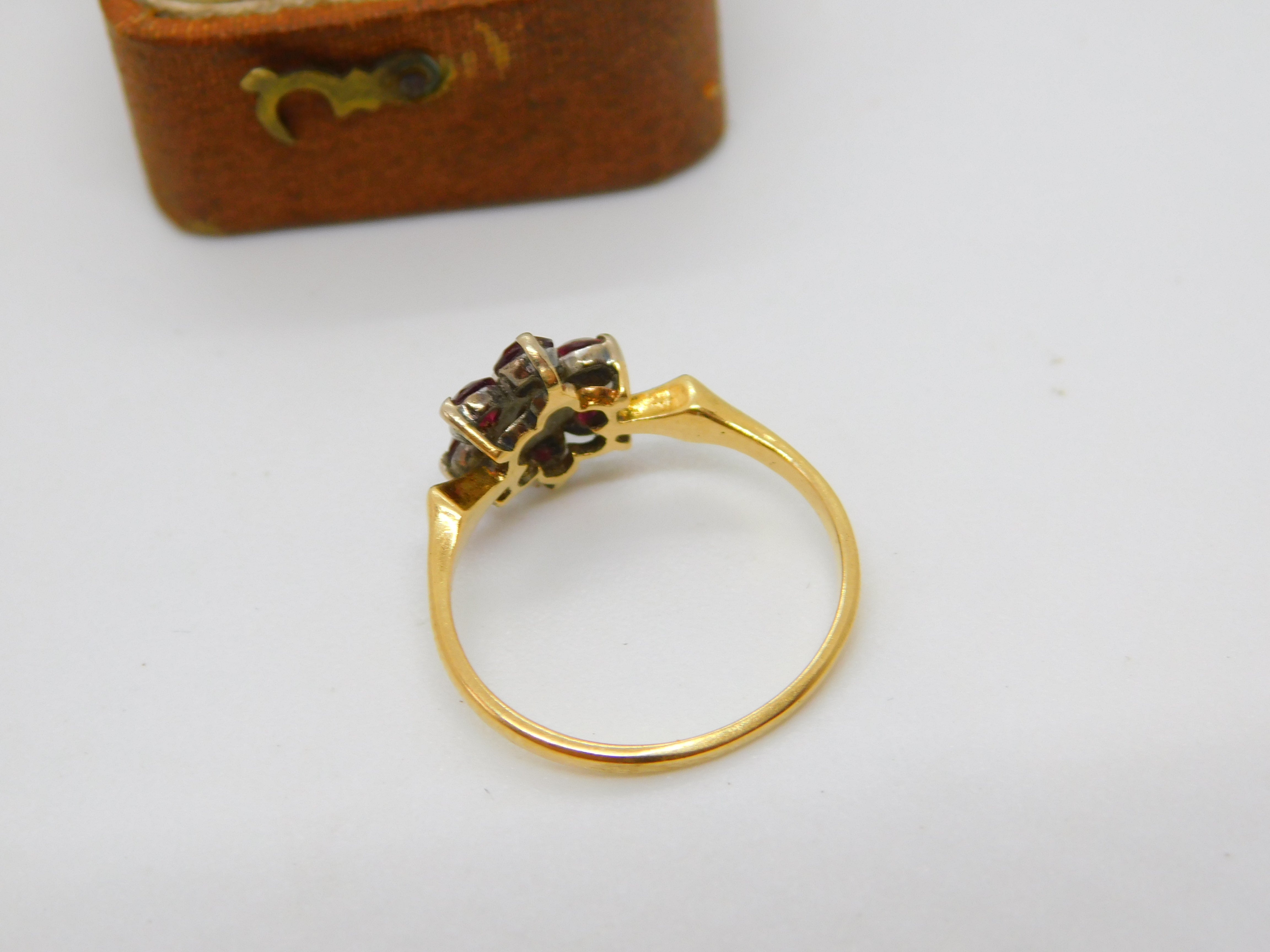 Details: A fantastic and wonderfully designed antique Victorian 18ct yellow gold daisy flower cluster ring set with rubies around a 0.1ct rose cut diamond c1860, the gold has been XRF tested and all the stones have been tested. This is a wonderful item that would make a perfect gift or addition to any collection. The BOX pictured is for PRESENTATION ONLY and is NOT included in the listings but used to frame the pictures unless specifically stated otherwise.