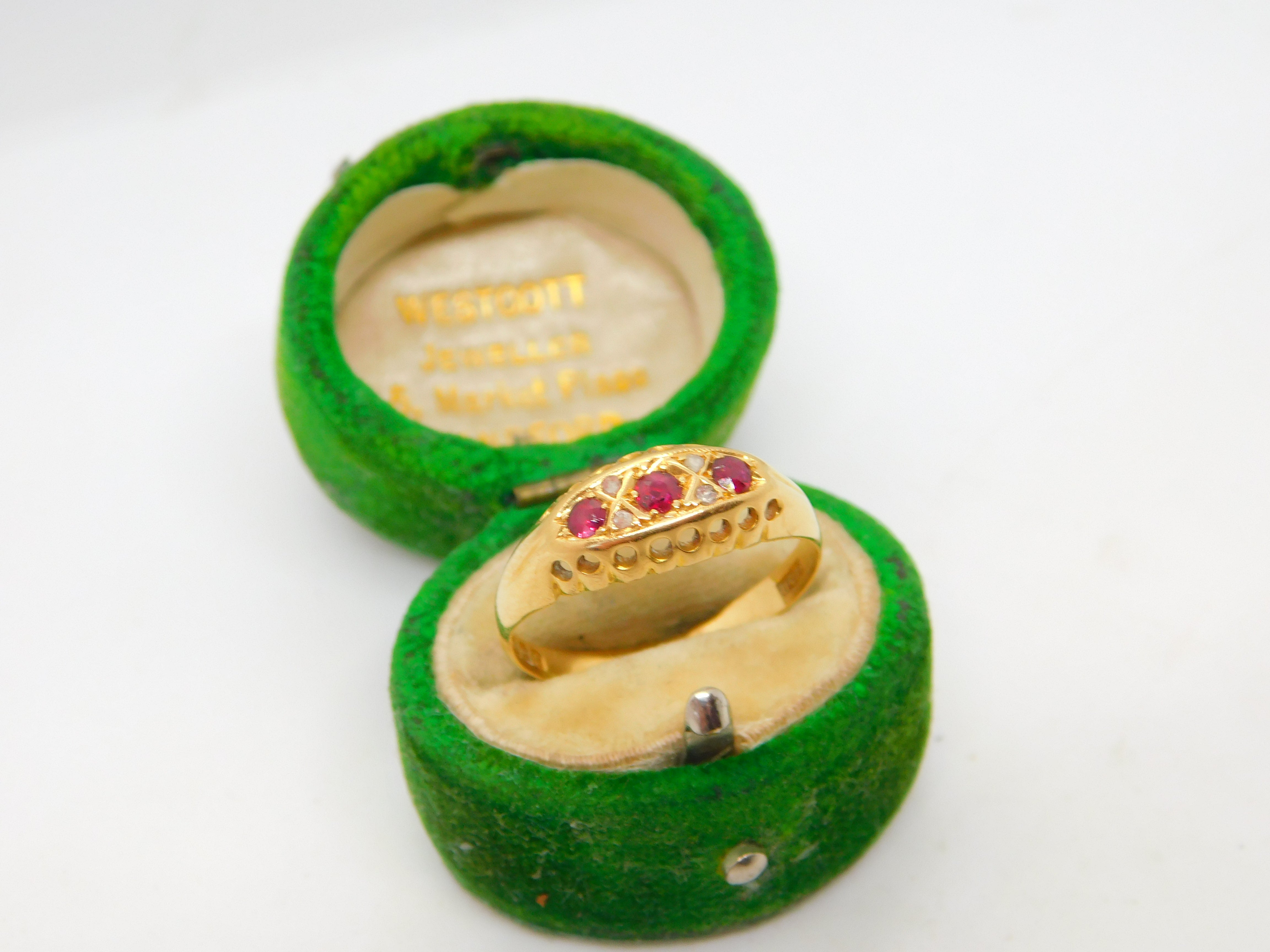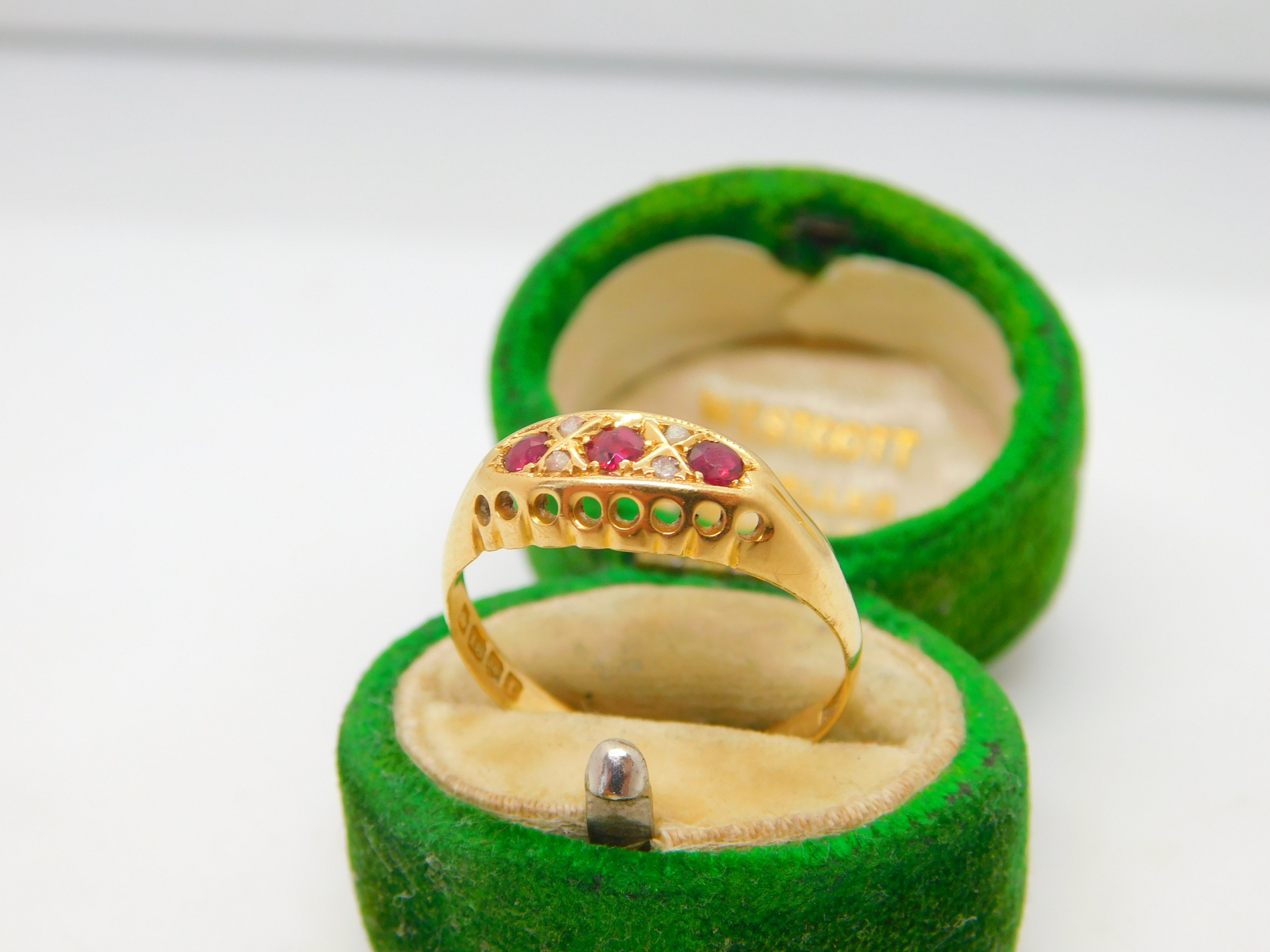 Details: A fantastic and wonderfully designed antique Victorian 18ct yellow gold boat ring set with rubies & diamond hallmarked Birmingham 1893 with nice clear hallmarks. This is a wonderful item that would make a perfect gift or addition to any collection. The BOX pictured is for PRESENTATION ONLY and is NOT included in the listings but used to frame the pictures unless specifically stated otherwise.