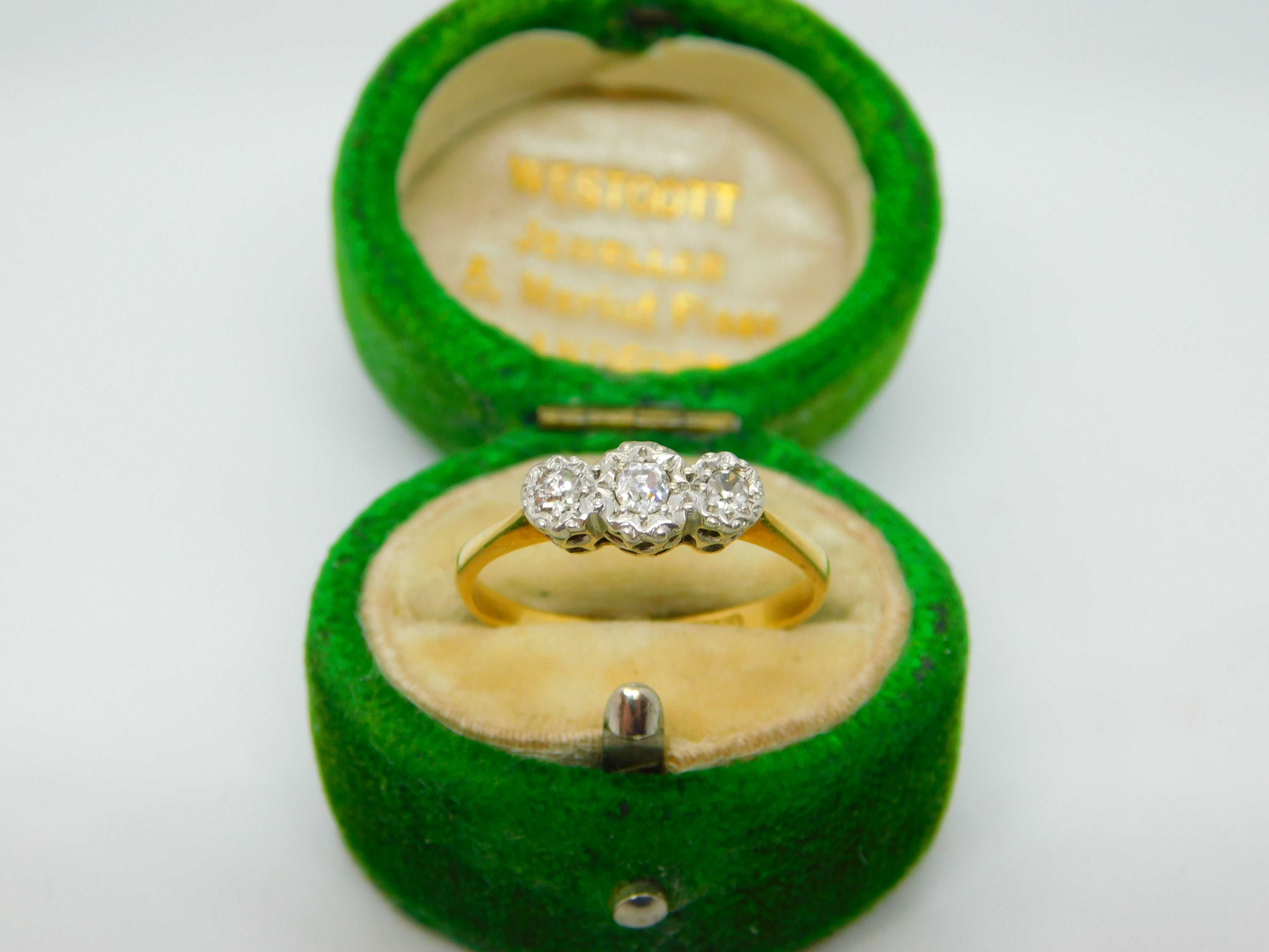 Details: A fantastic and wonderfully designed antique Victorian 18ct yellow gold three stone dress ring set with diamonds, the central stone approximately 0.1ct hallmarked to the interior band c1890. This is a wonderful item that would make a perfect gift or addition to any collection. The BOX pictured is for PRESENTATION ONLY and is NOT included in the listings but used to frame the pictures unless specifically stated otherwise.