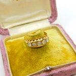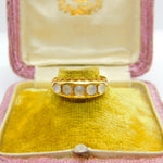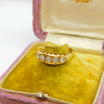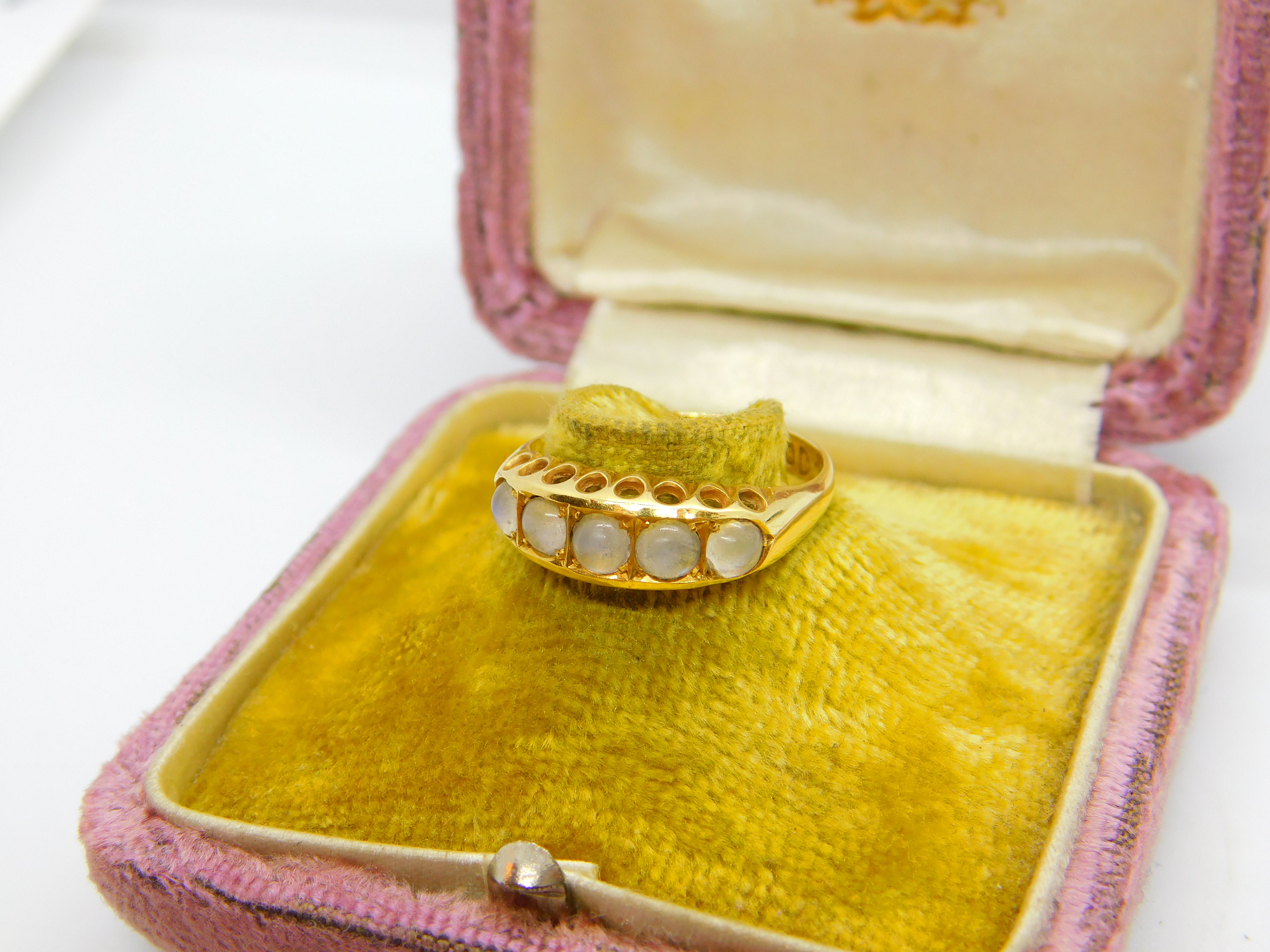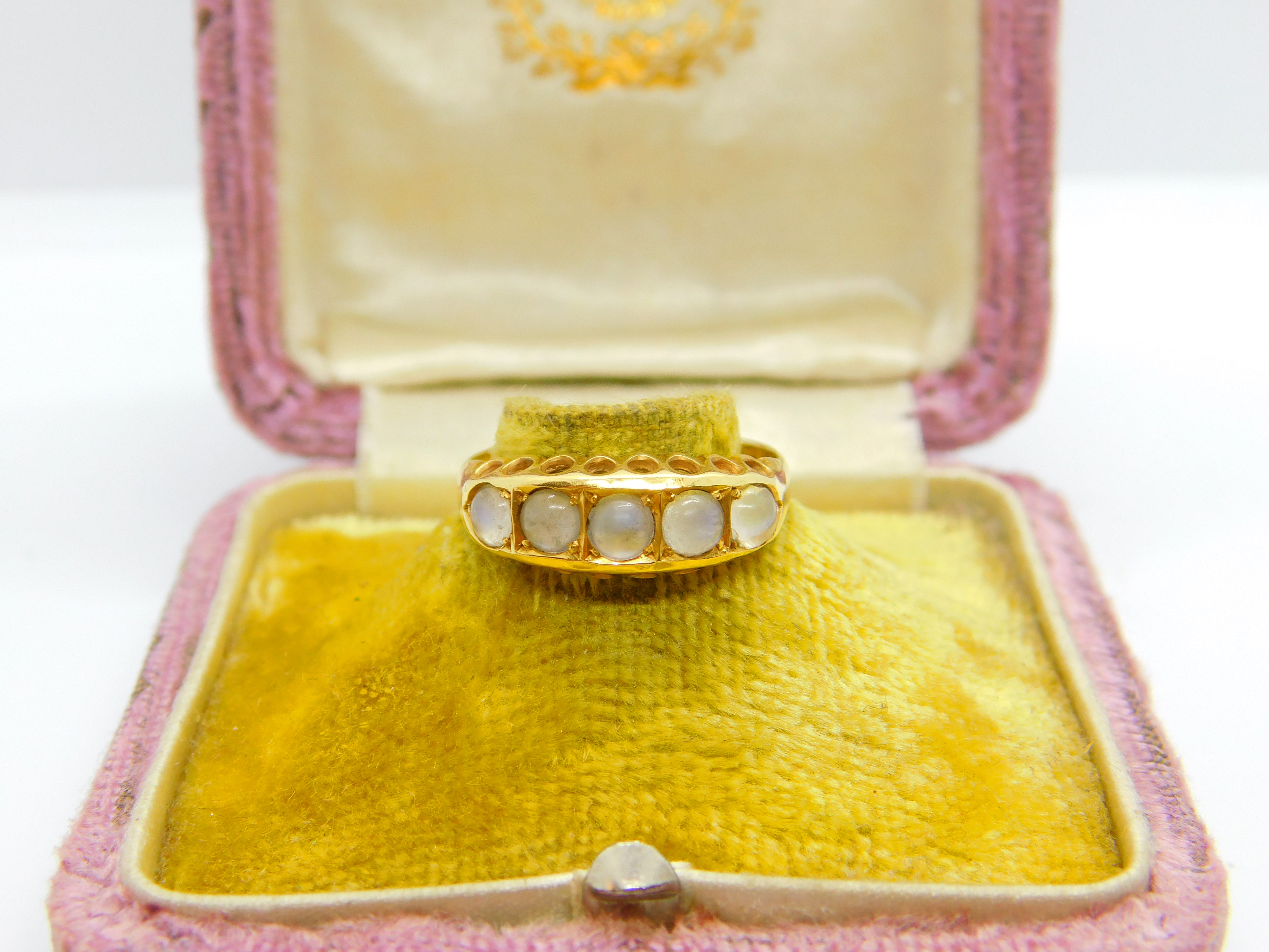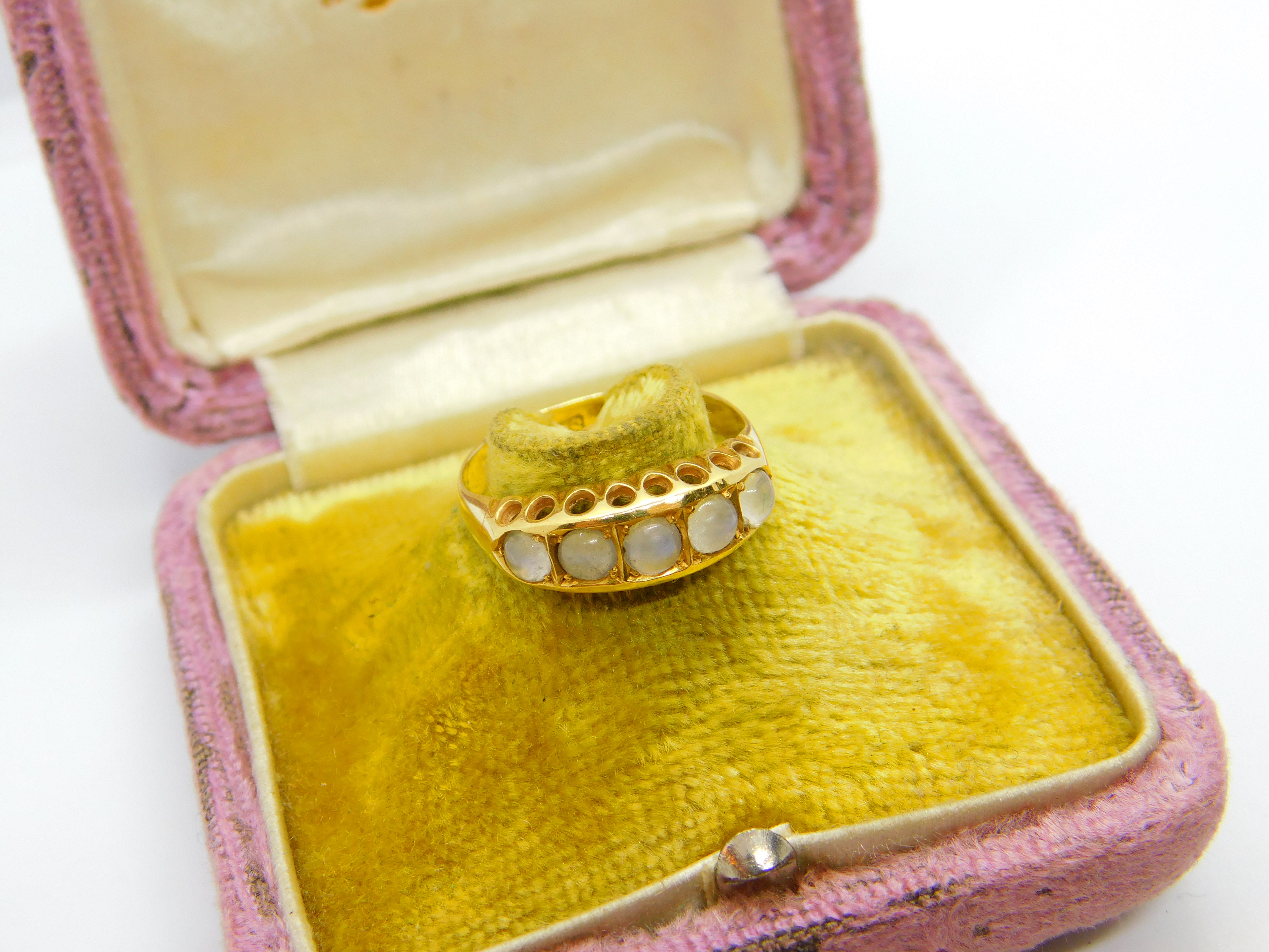 Details: A fantastic and wonderfully designed antique Victorian 18ct yellow gold boat ring set with five cabochon cut moonstones hallmarked Chester 1899 to the interior band. This is a wonderful item that would make a perfect gift or addition to any collection. The BOX pictured is for PRESENTATION ONLY and is NOT included in the listings but used to frame the pictures unless specifically stated otherwise.