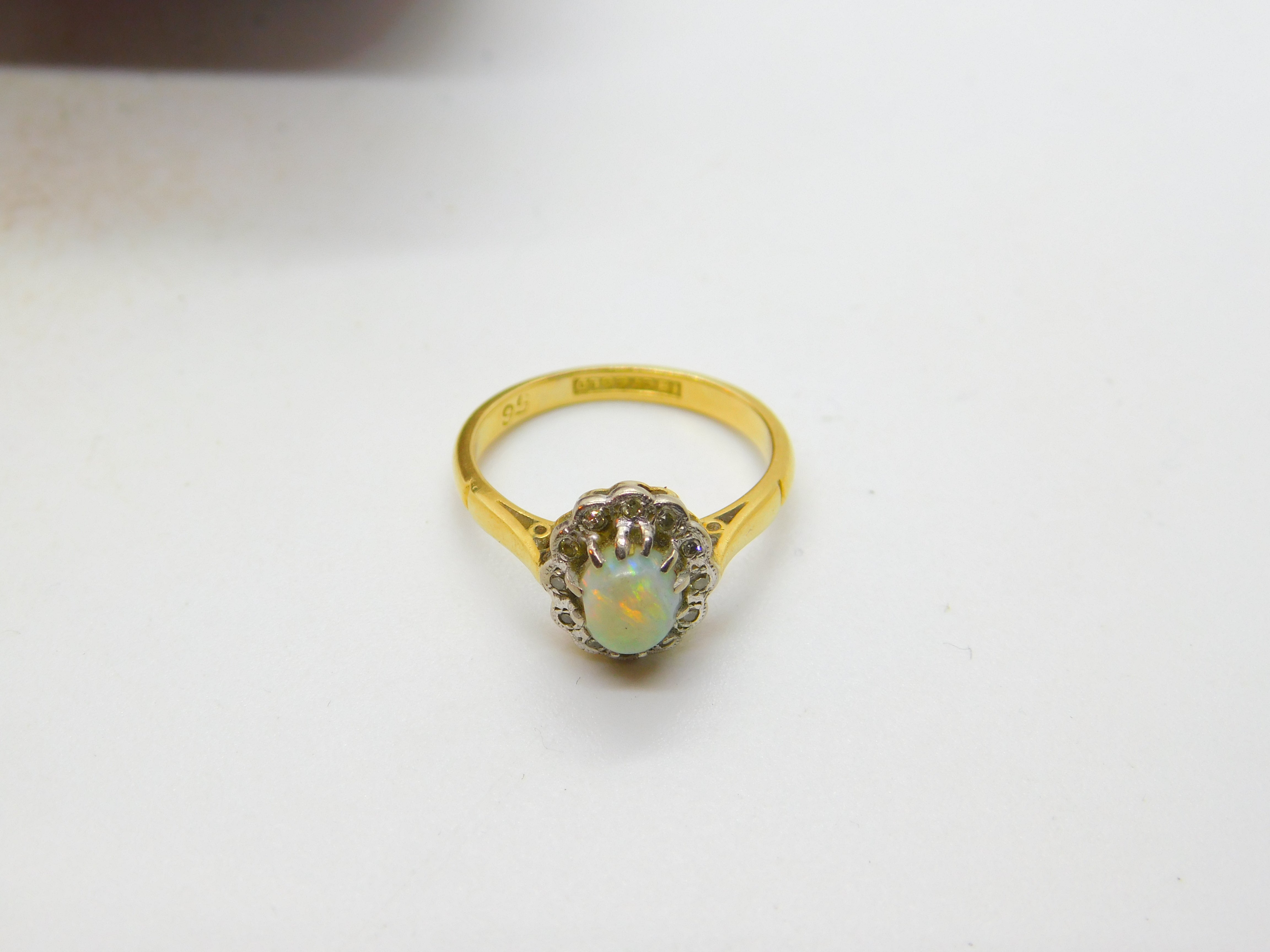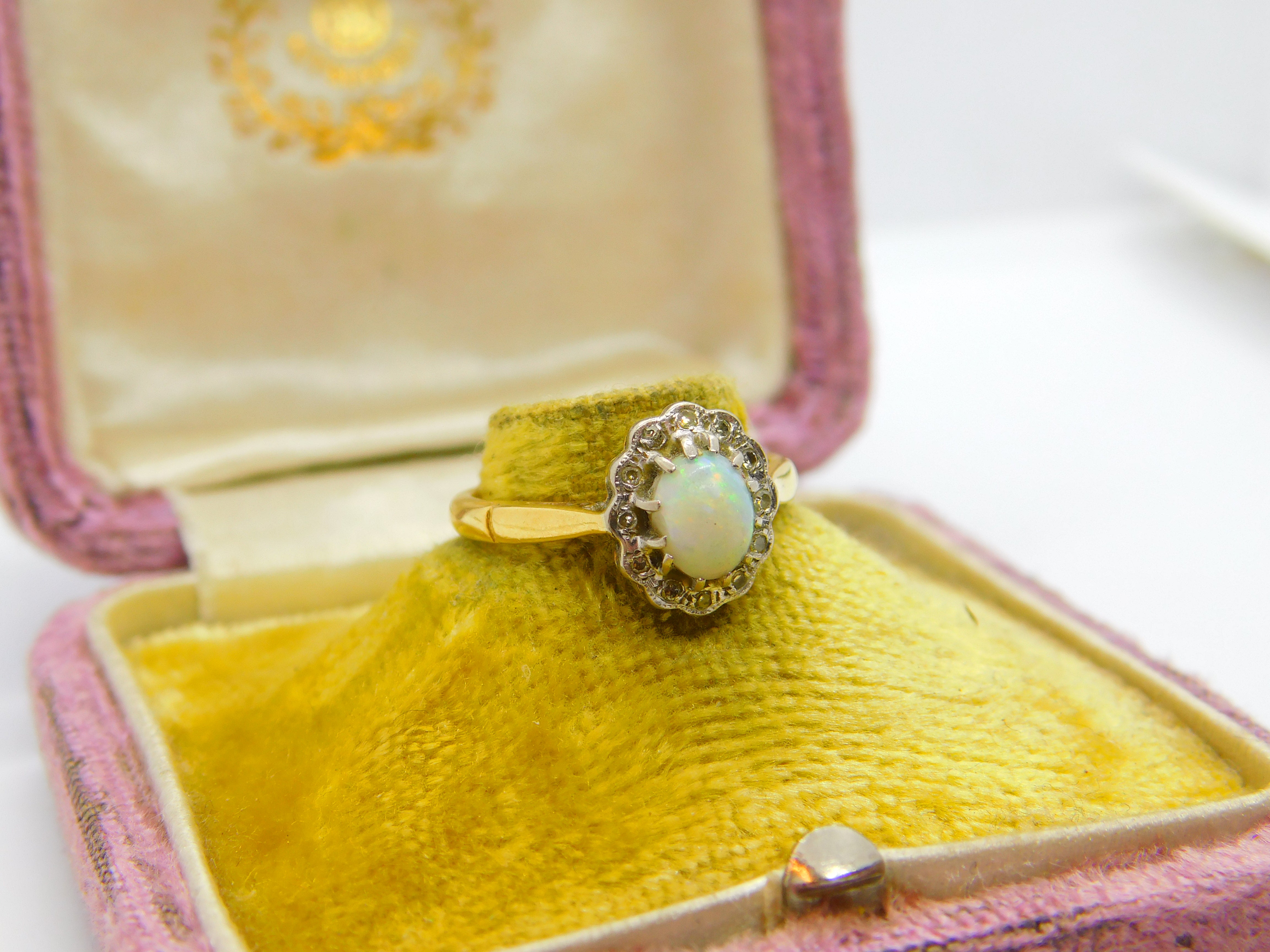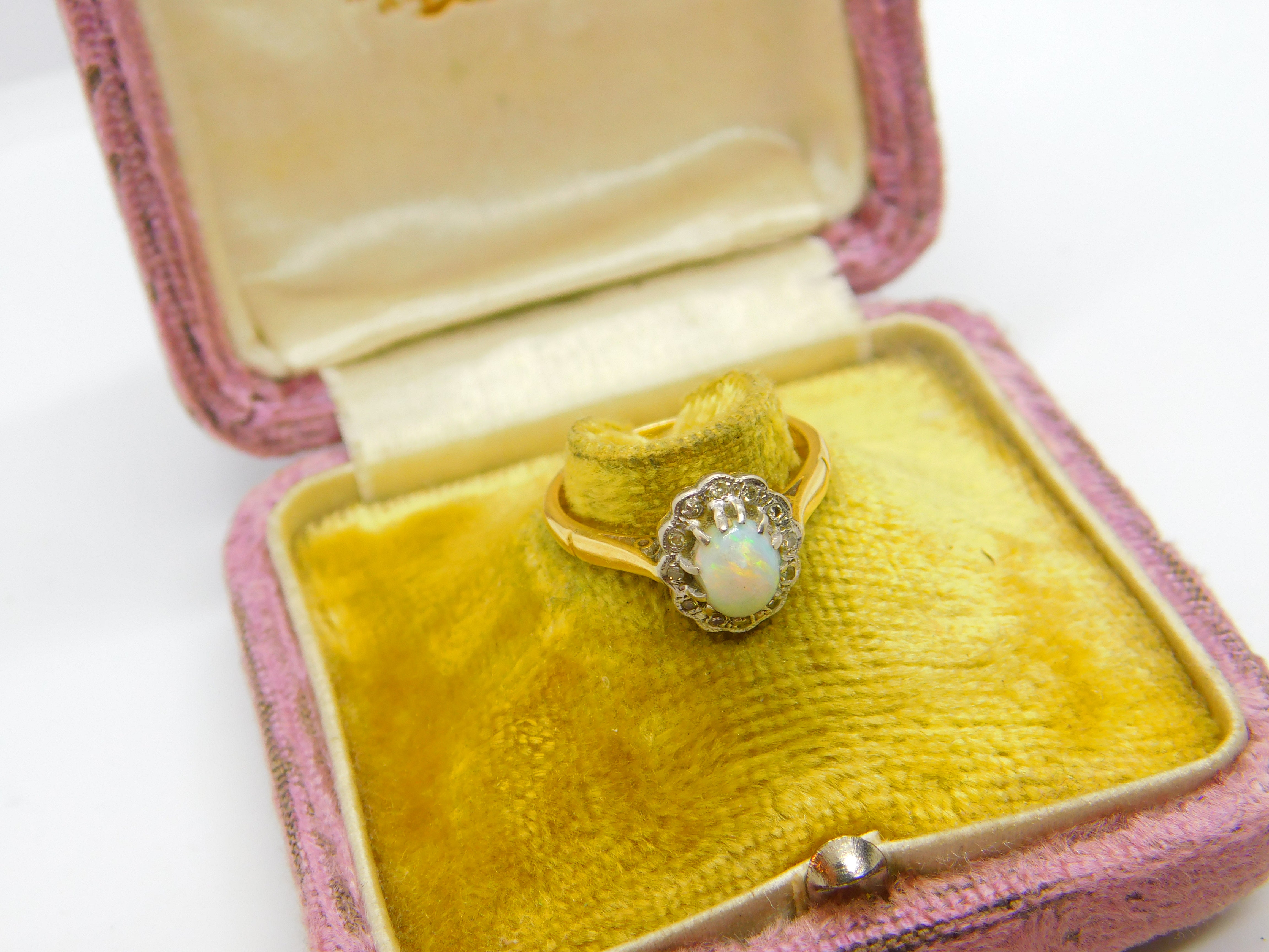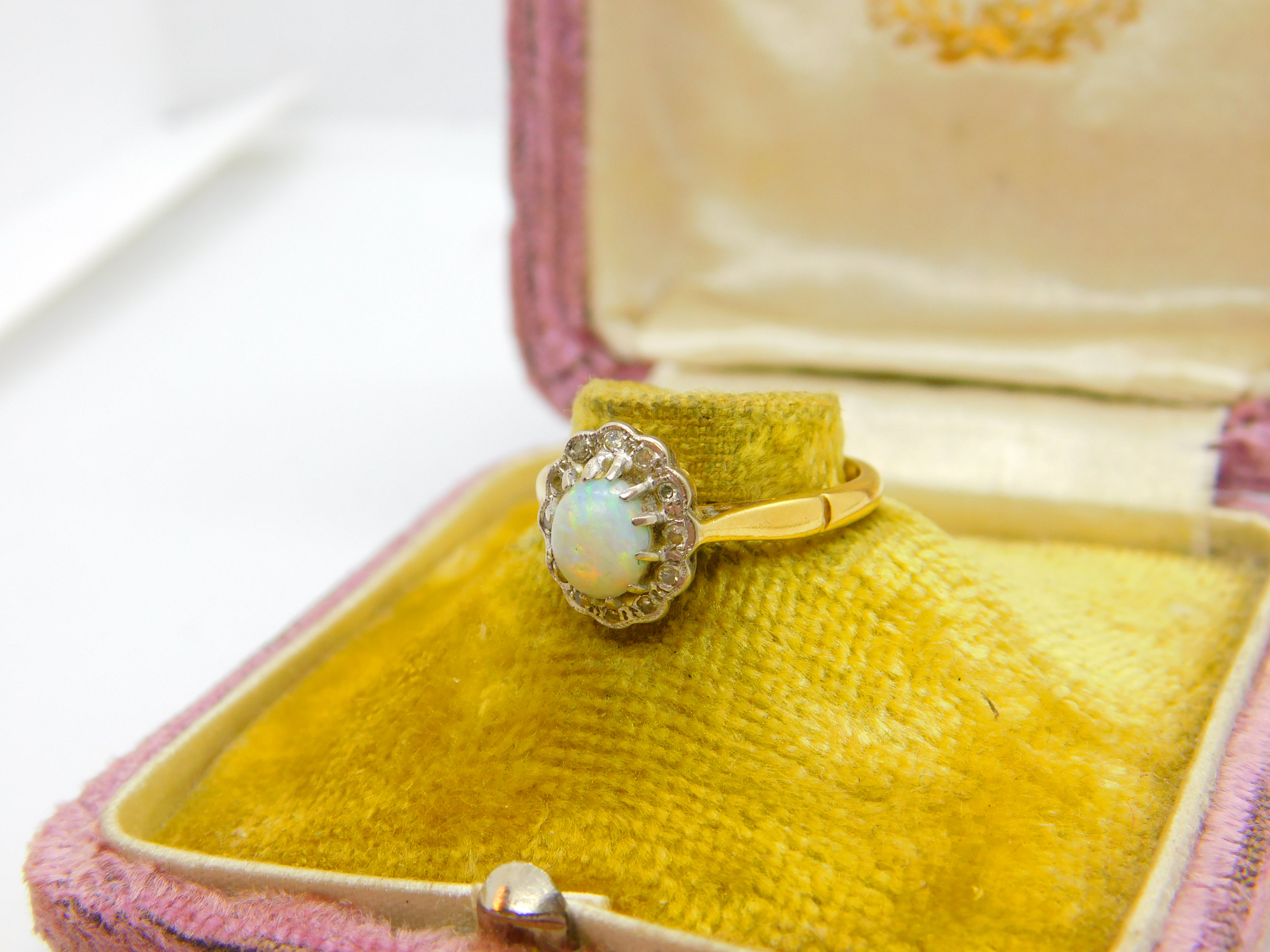 Details: A fantastic and wonderfully designed antique Victorian 18ct yellow gold floral cluster ring set with cabochon opal surrounded by diamonds hallmarked to the interior c1890, the stones have been tested. This is a wonderful item that would make a perfect gift or addition to any collection. The BOX pictured is for PRESENTATION ONLY and is NOT included in the listings but used to frame the pictures unless specifically stated otherwise.
