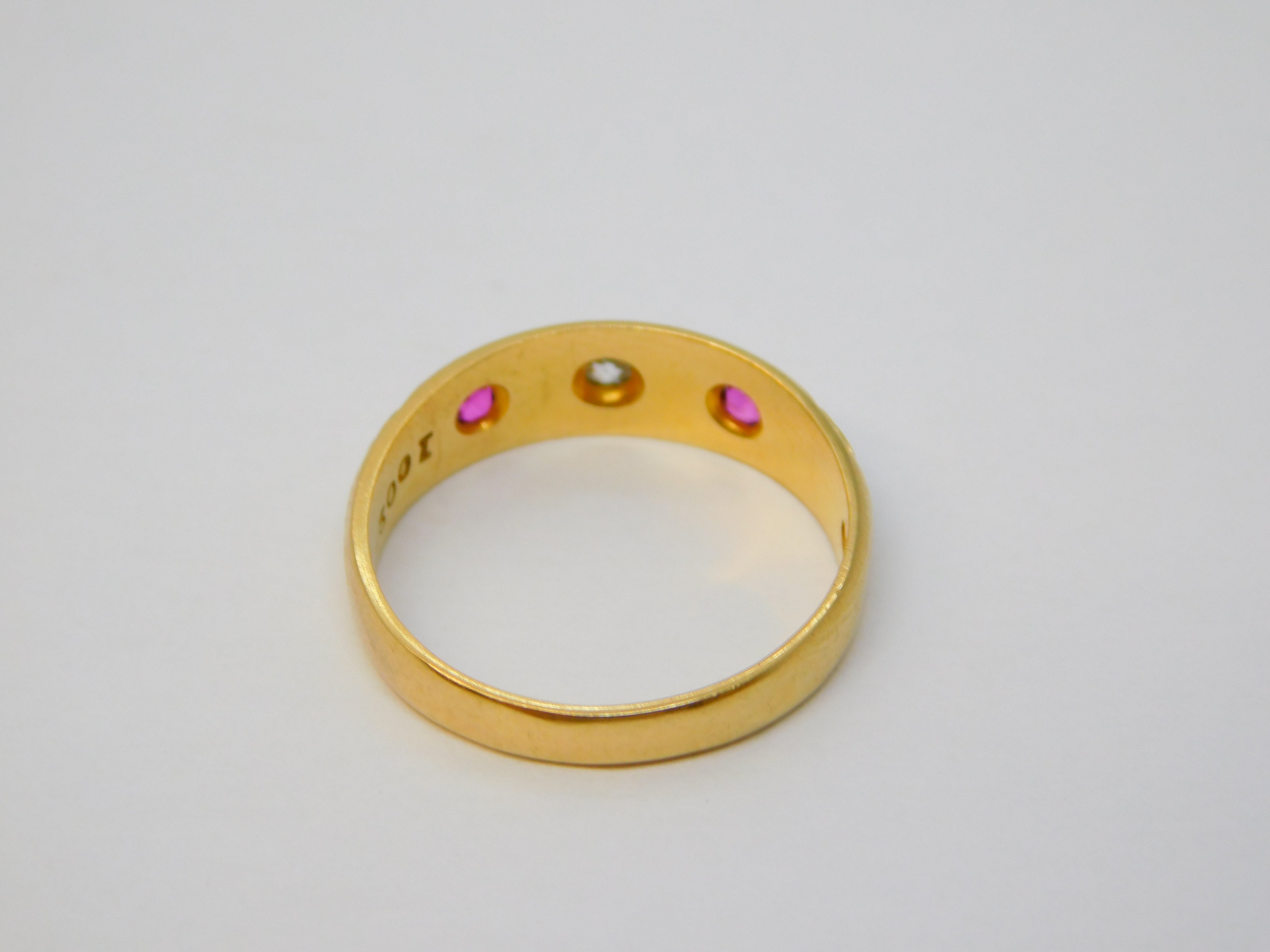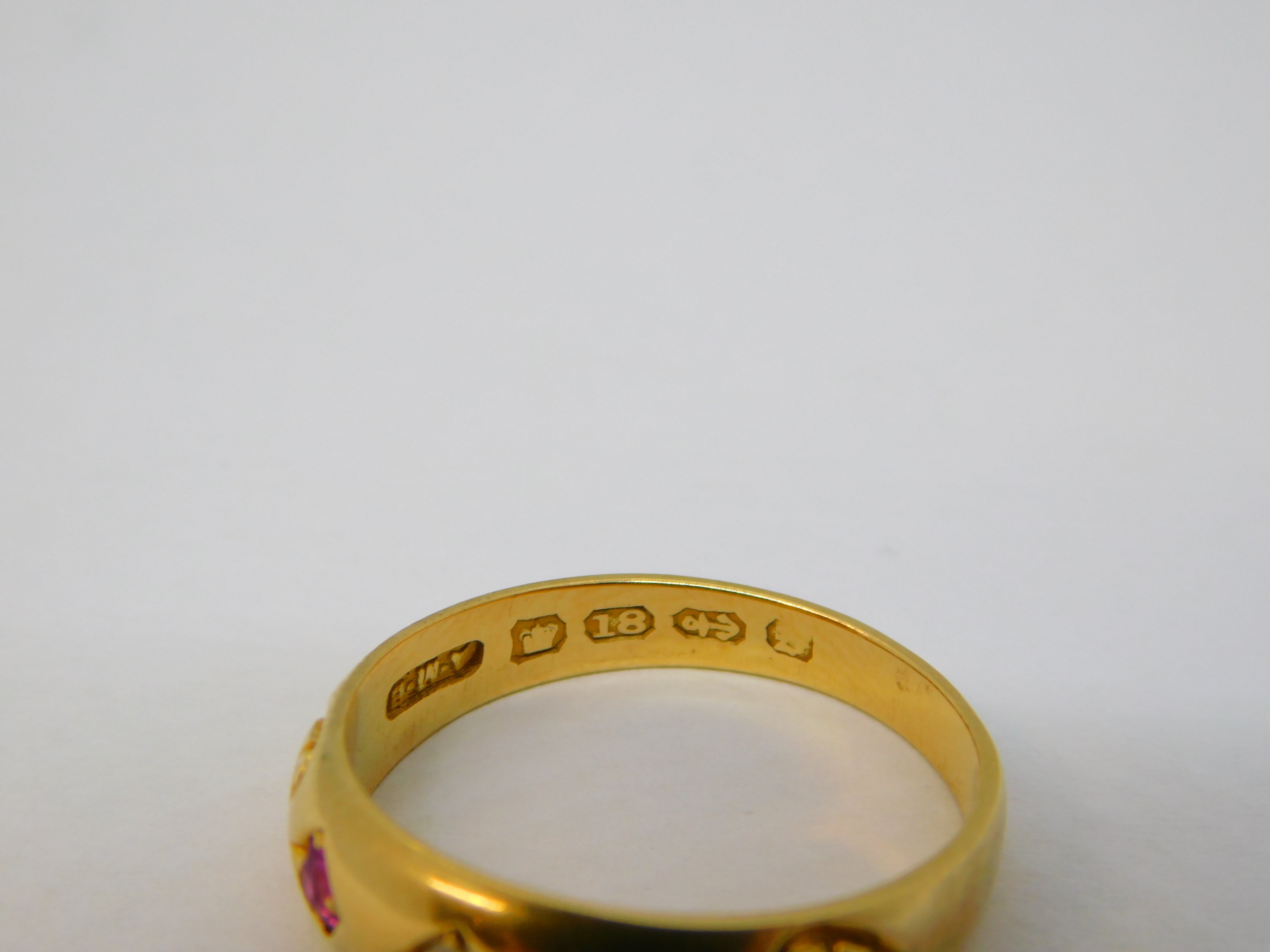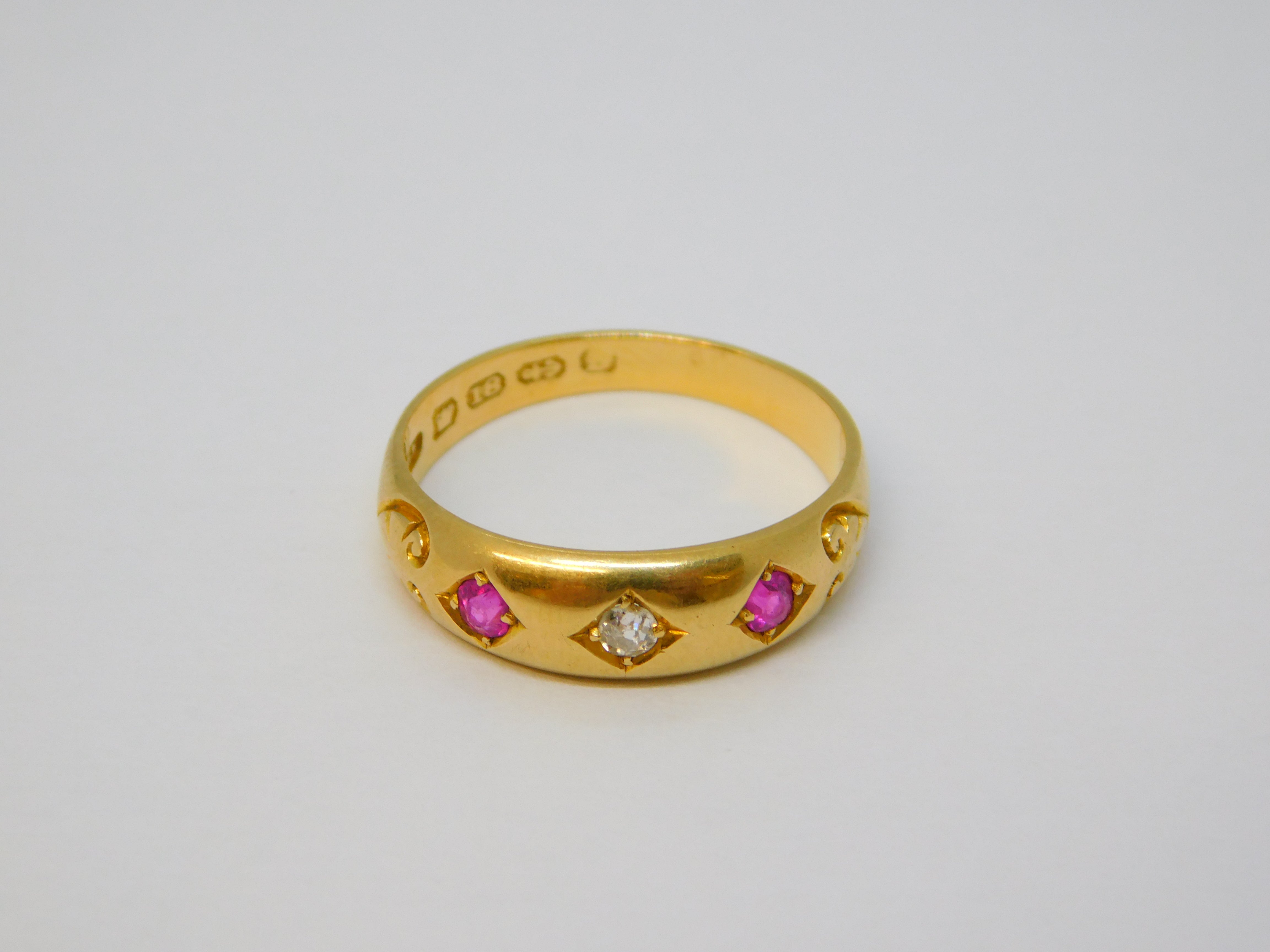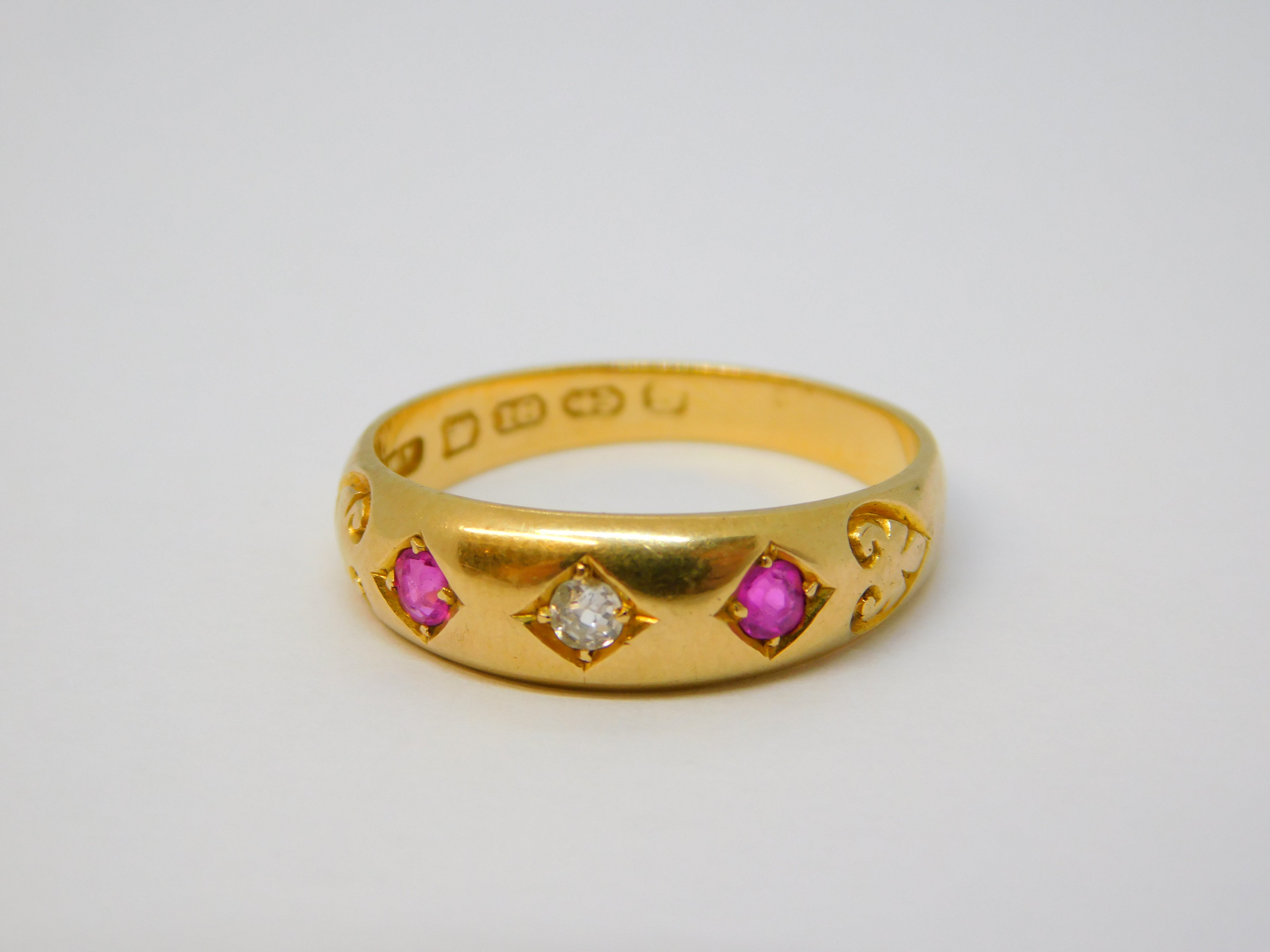 Details: A fantastic and wonderfully designed antique Victorian 18ct yellow gold boat ring set with two rubies flanking a central 0.1ct diamond hallmarked Birmingham 1892 to the interior, the stones have been tested. This is a wonderful item that would make a perfect gift or addition to any collection.