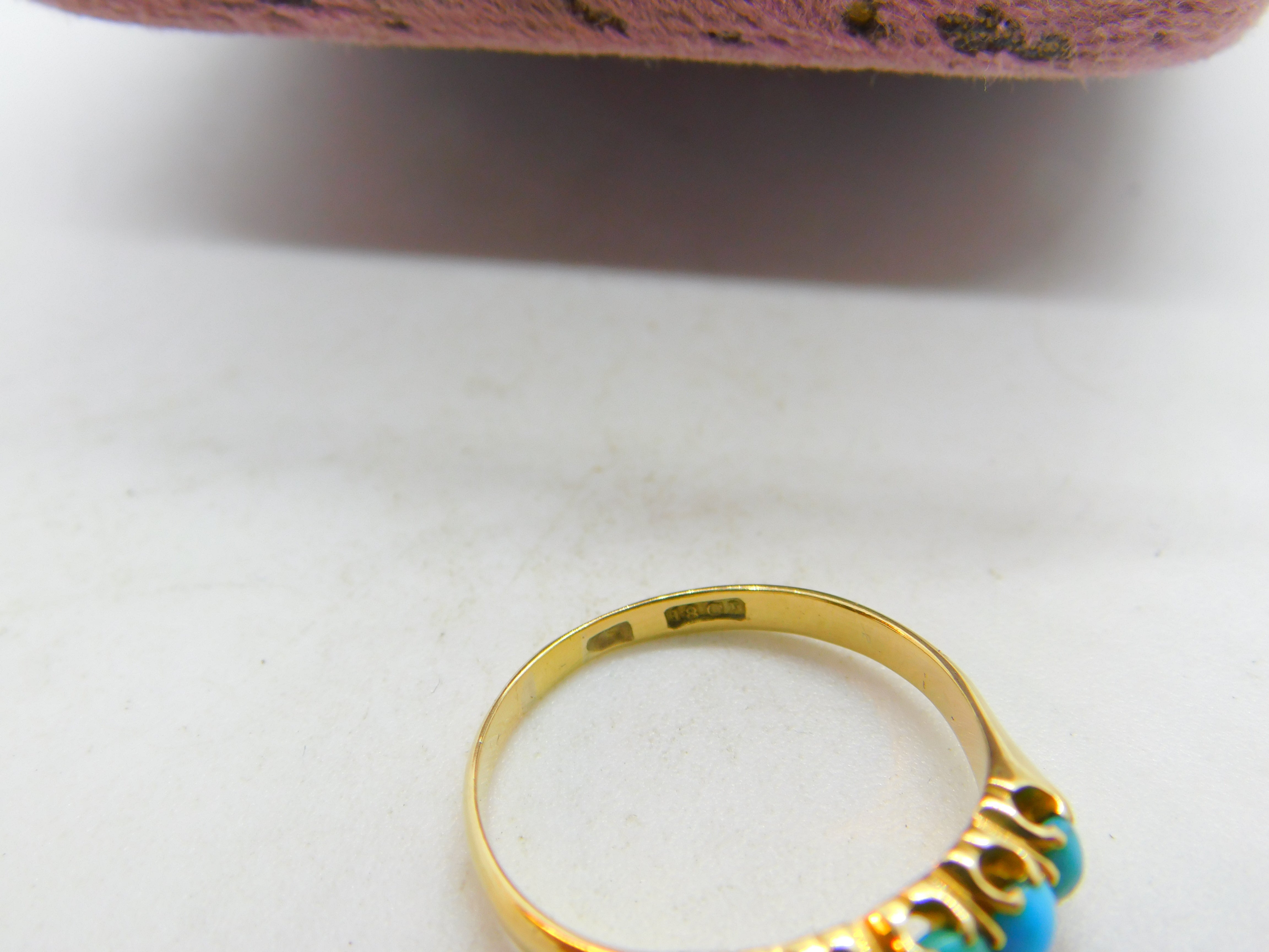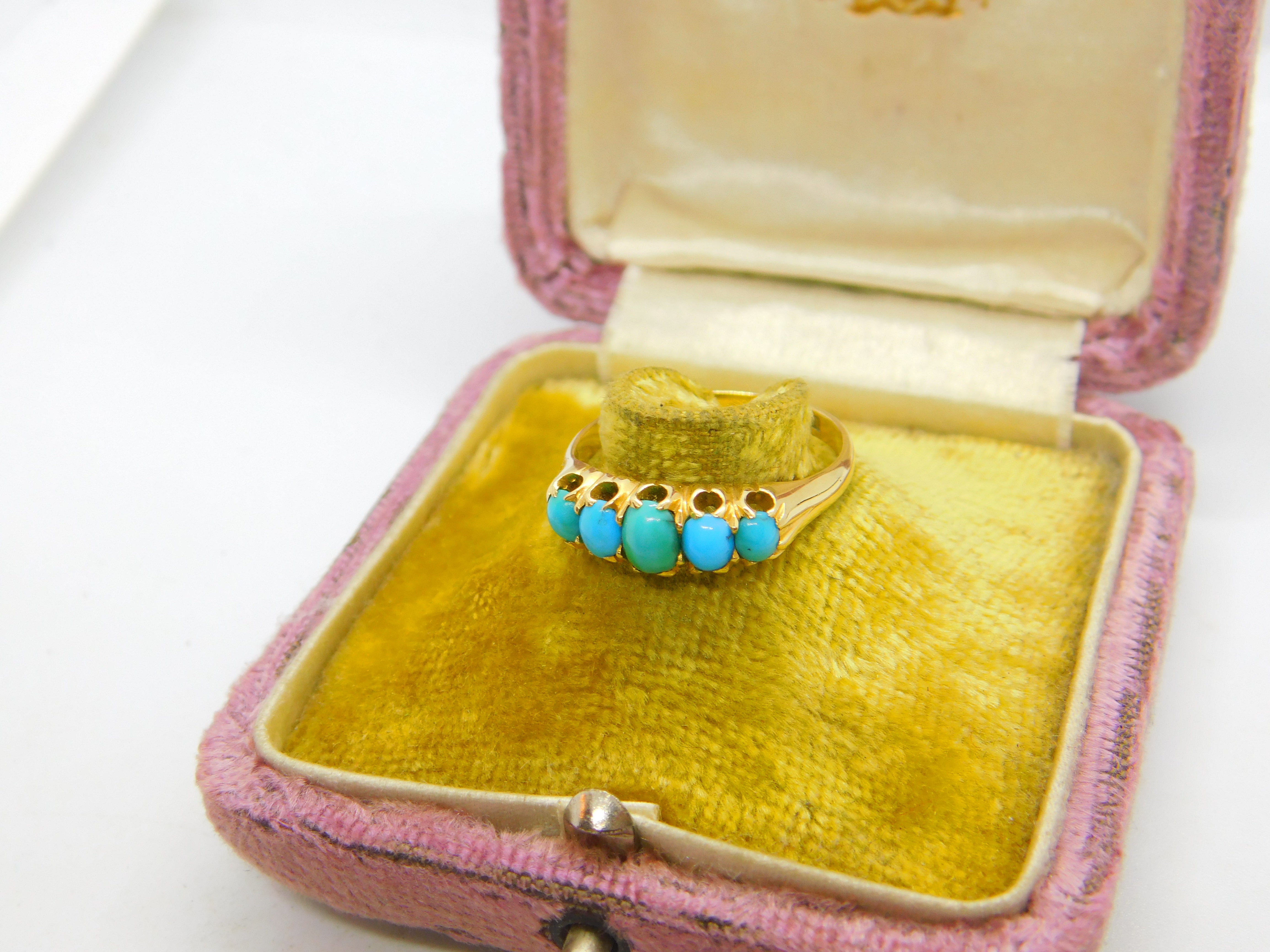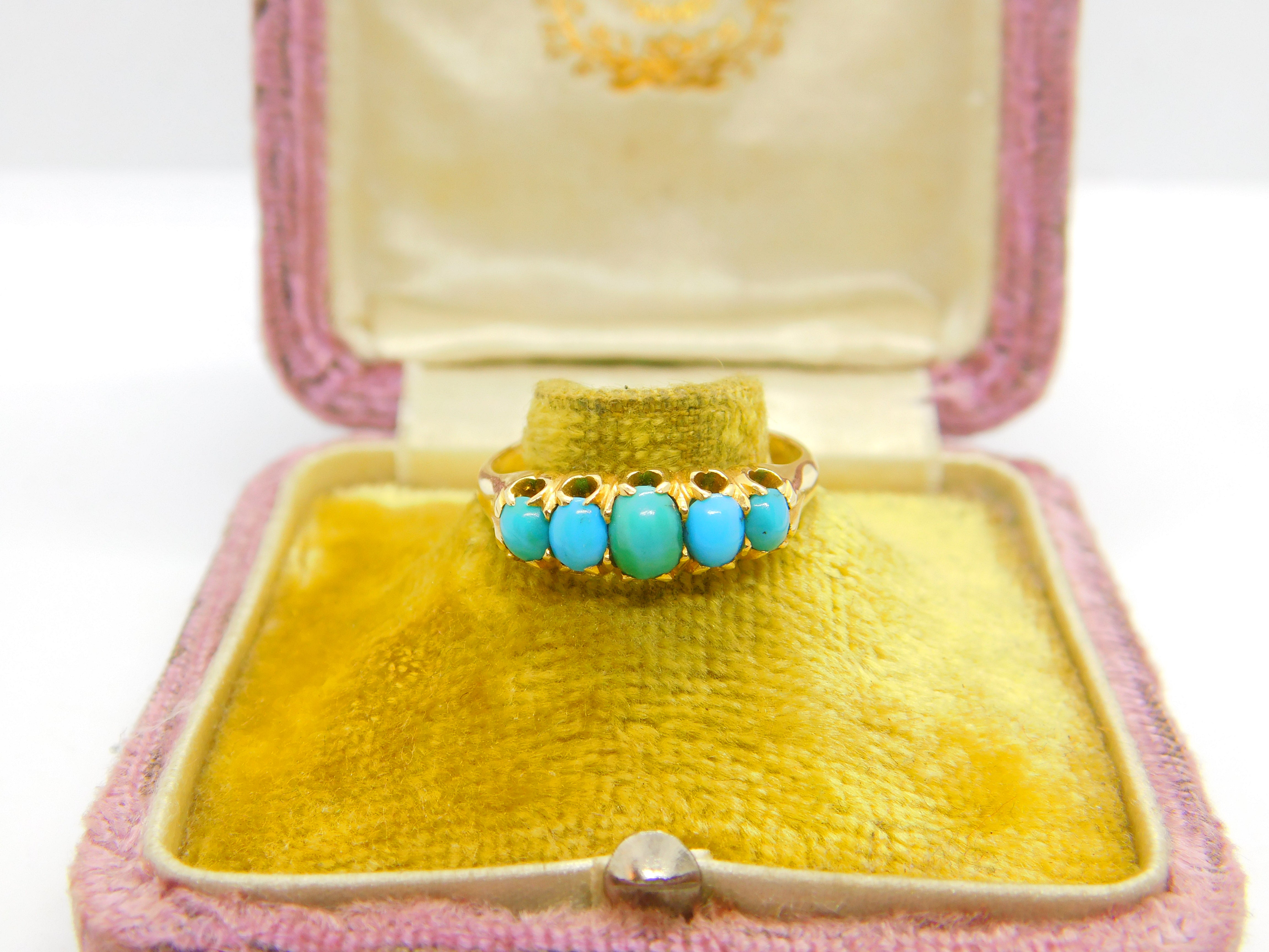 Details: A fantastic and wonderfully designed antique Victorian 18ct yellow gold and five-stone set cabochon turquoise band ring with lovely detailing hallmarked to the interior band c1890. Excellent condition. This is a wonderful item that would make a perfect gift or addition to any collection. The BOX pictured is for PRESENTATION ONLY and is NOT included in the listings but used to frame the pictures unless specifically stated otherwise.