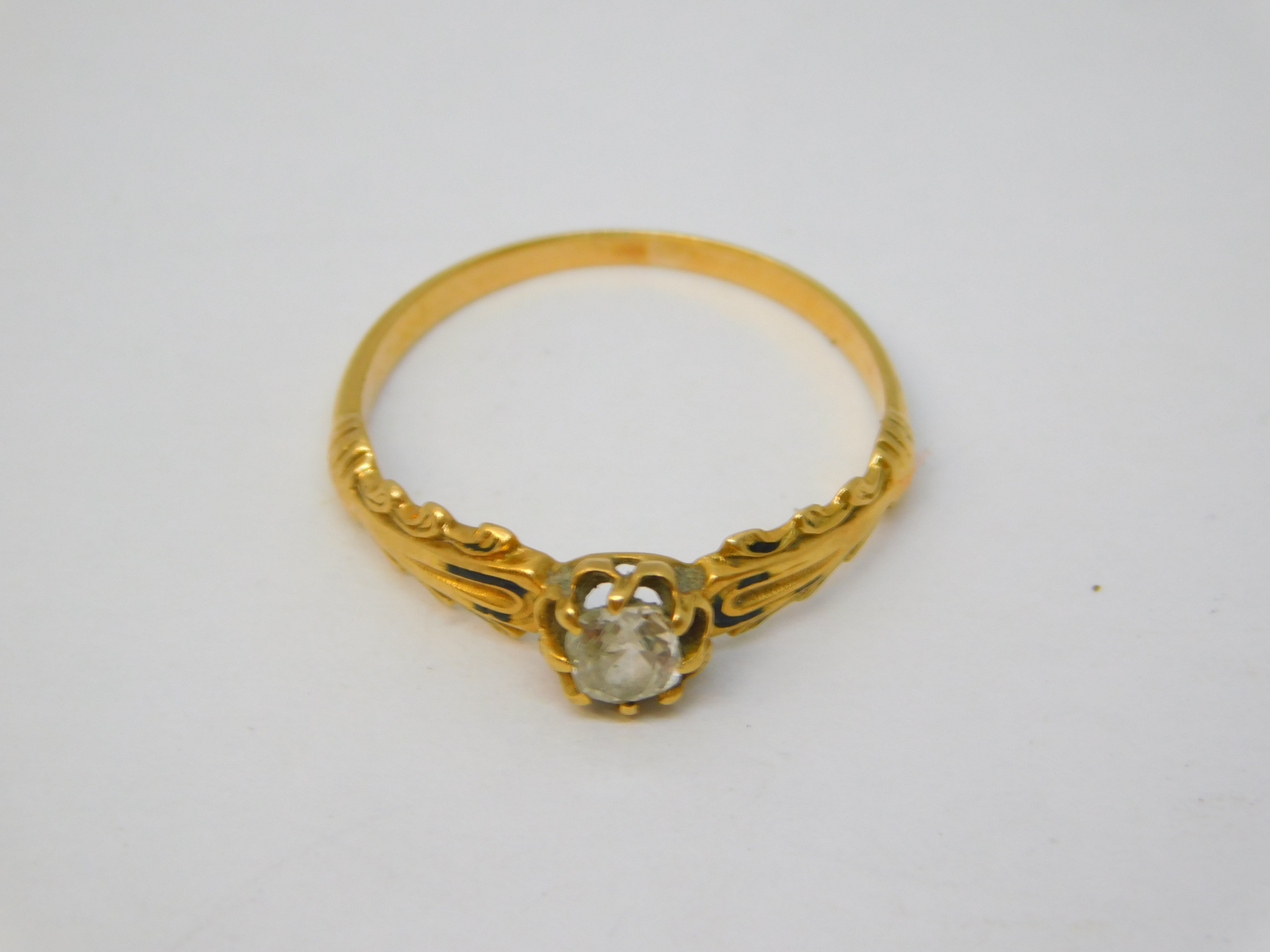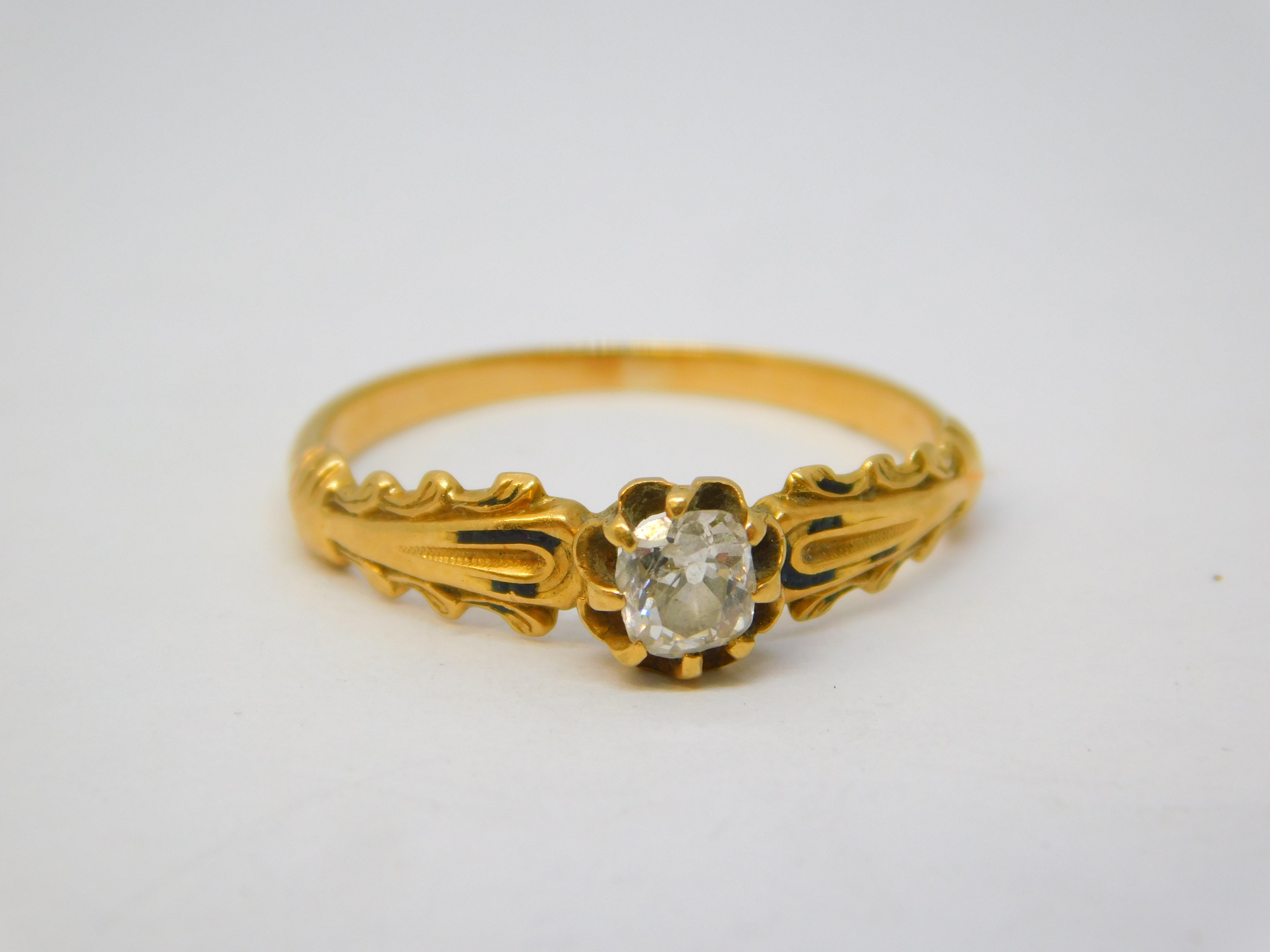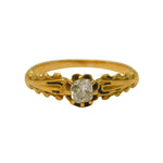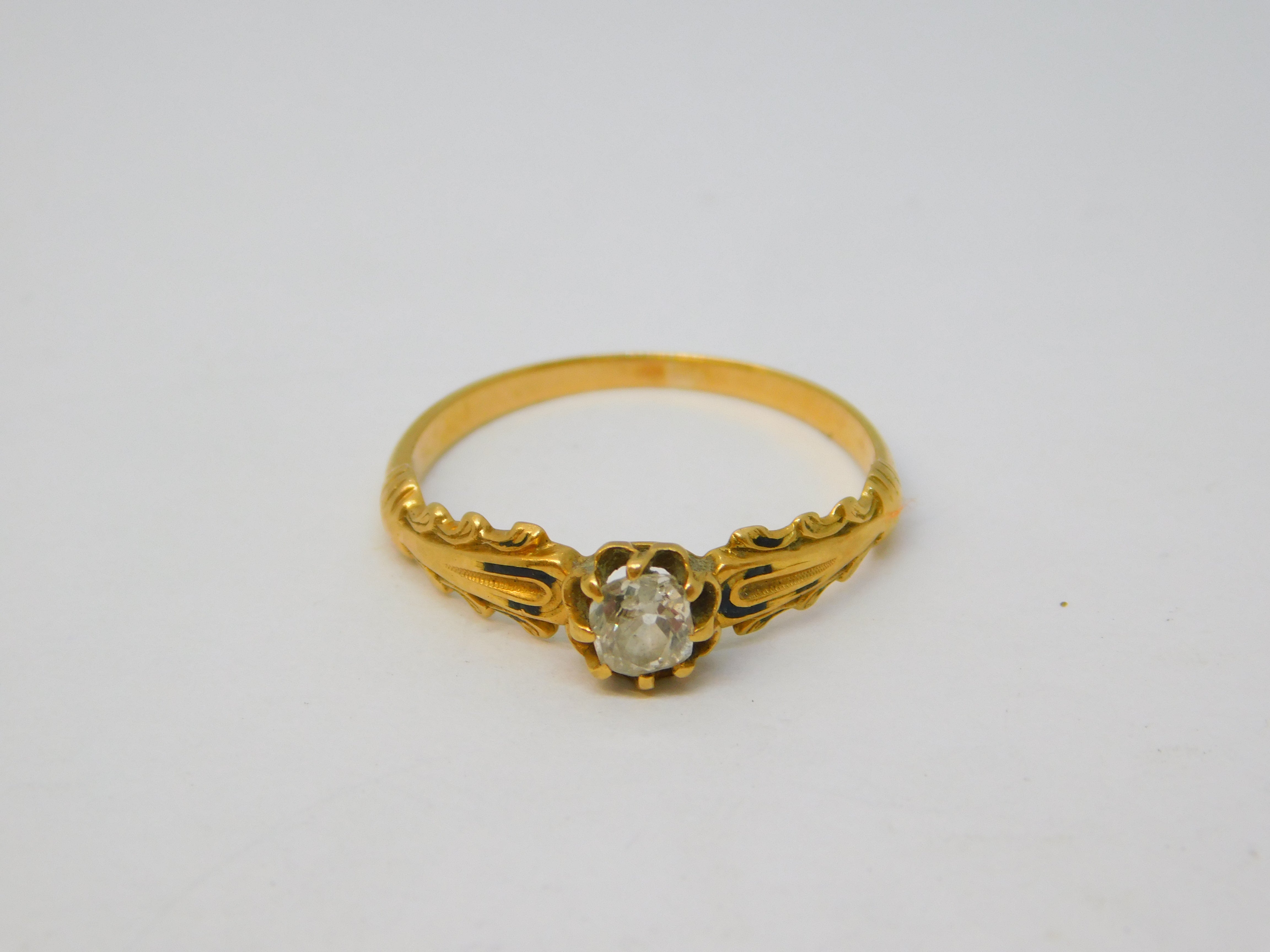 Details: A fantastic and wonderfully designed antique Victorian 18ct yellow gold mourning ring with lovely feather shoulders, set with 0.2ct old-cut diamond with lovely detailing dated c1840, the gold has been XRF tested as it is unmarked, the shoulders would have once been adorned with black enamel. This is a wonderful item that would make a perfect gift or addition to any collection.