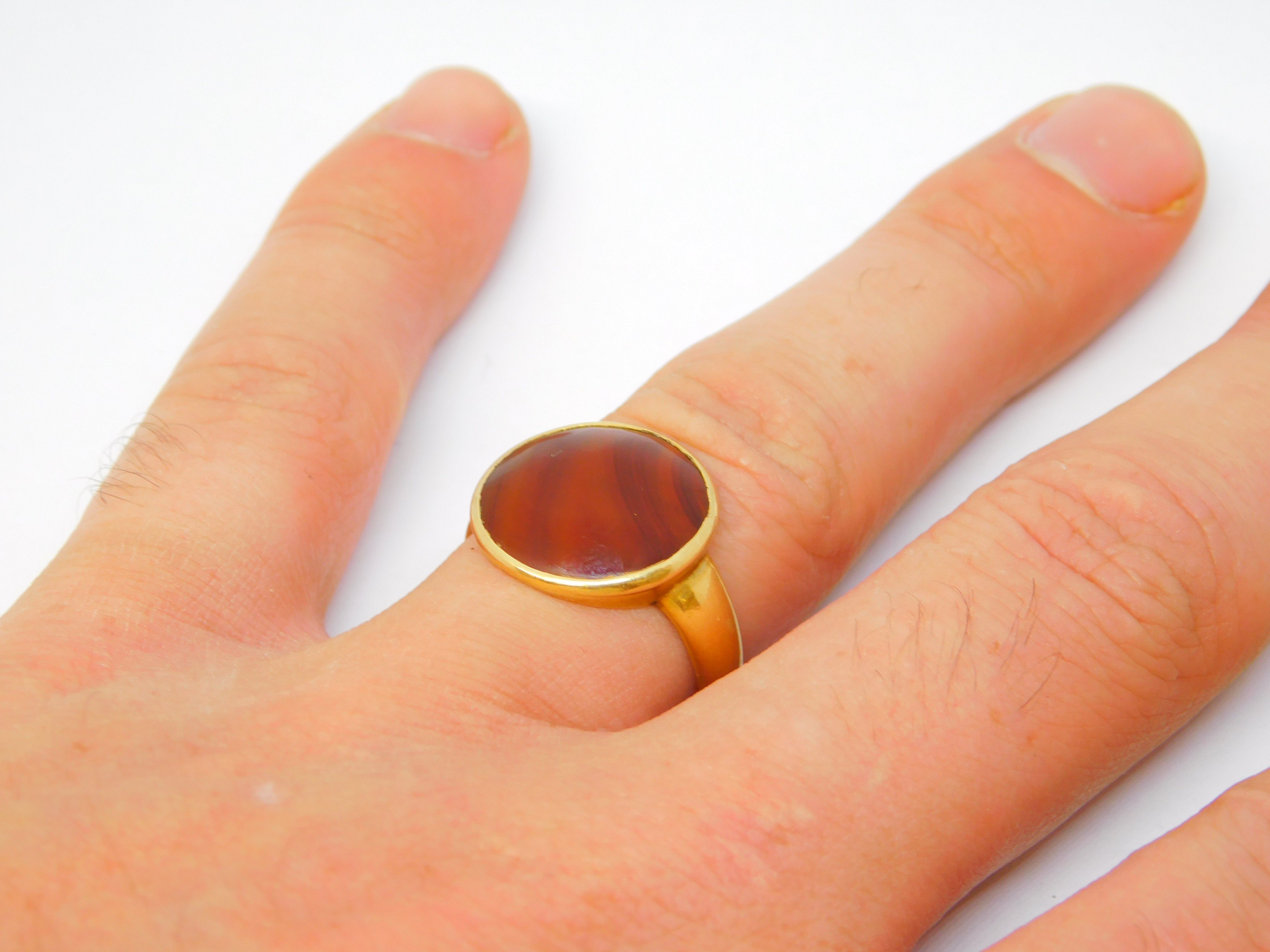 Details: A fantastic and wonderfully designed antique Victorian 18ct yellow gold signet ring set with carnelian red agate cabochon c1860, the gold has been XRF tested as it is unmarked. This is a wonderful item that would make a perfect gift or addition to any collection.
