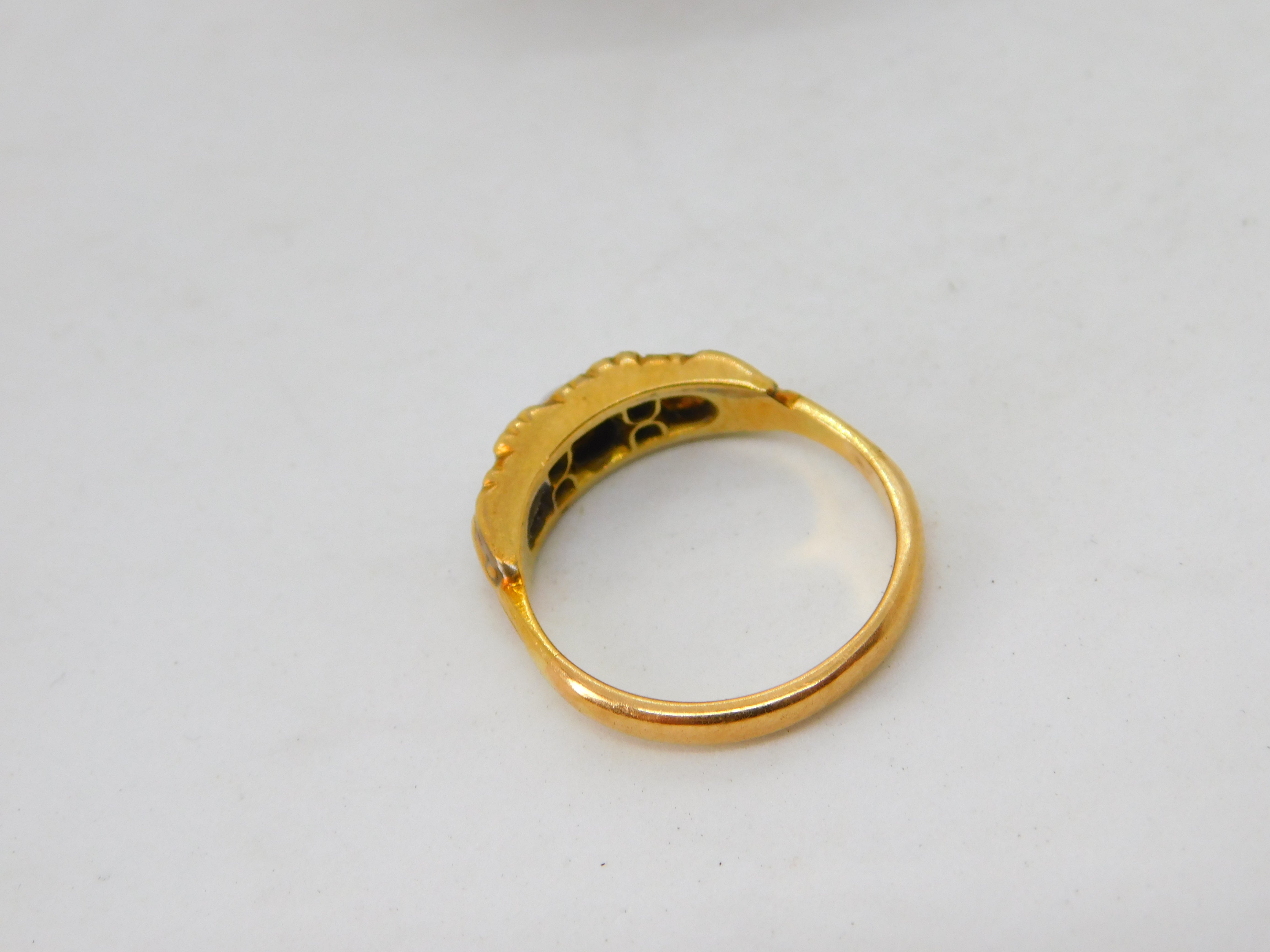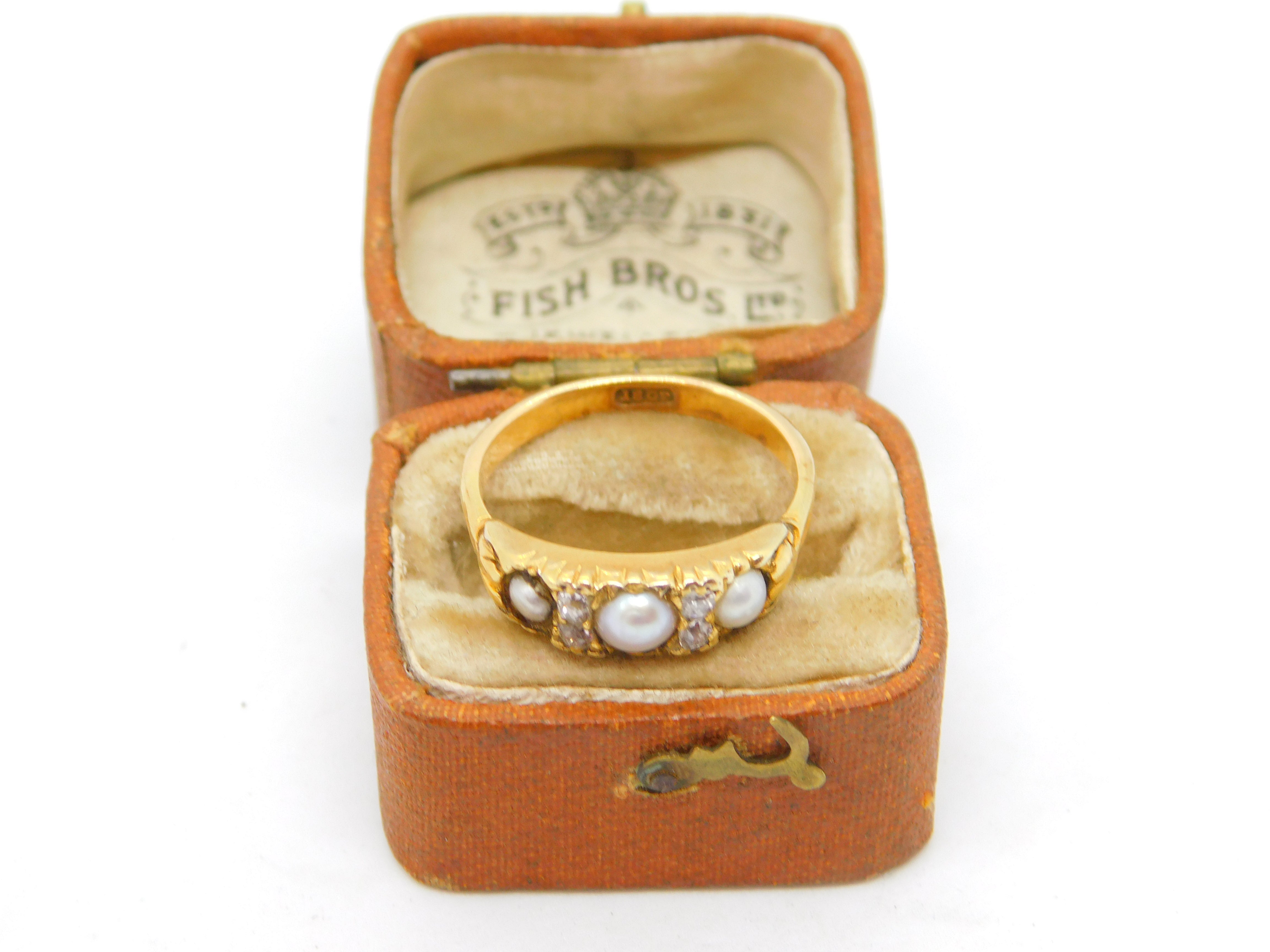 Details: A fantastic and wonderfully designed antique Victorian 18ct yellow gold dress ring set with four rose cut diamonds flanked by natural pearls hallmarked to the back of the band '18ct' c1890. The diamonds have been tesed. One of the pearls appears to have been refitted please see pictures. This is a wonderful item that would make a perfect gift or addition to any collection. The BOX pictured is for PRESENTATION ONLY and is NOT included in the listings but used to frame the pictures unless specifically stated otherwise.