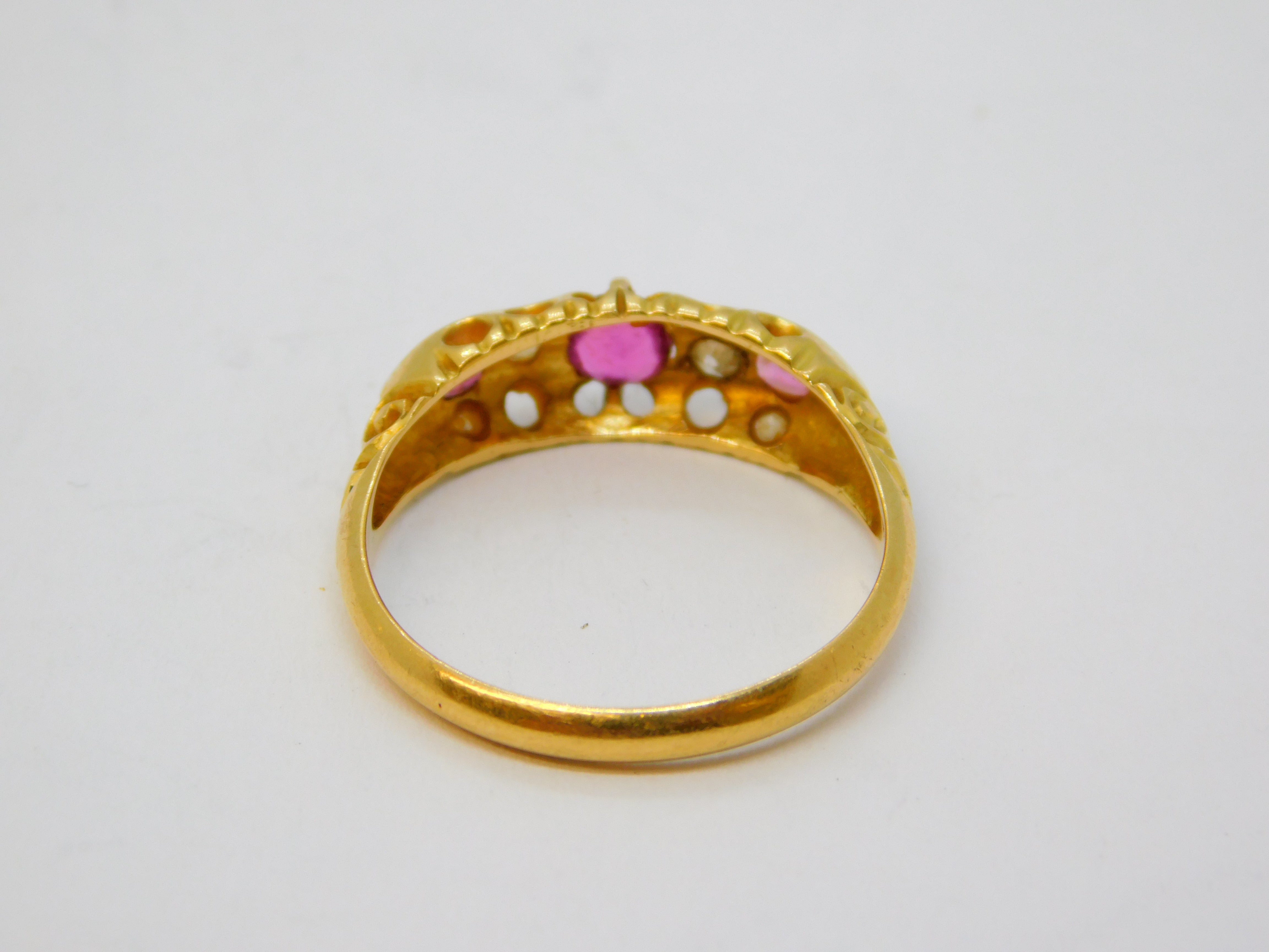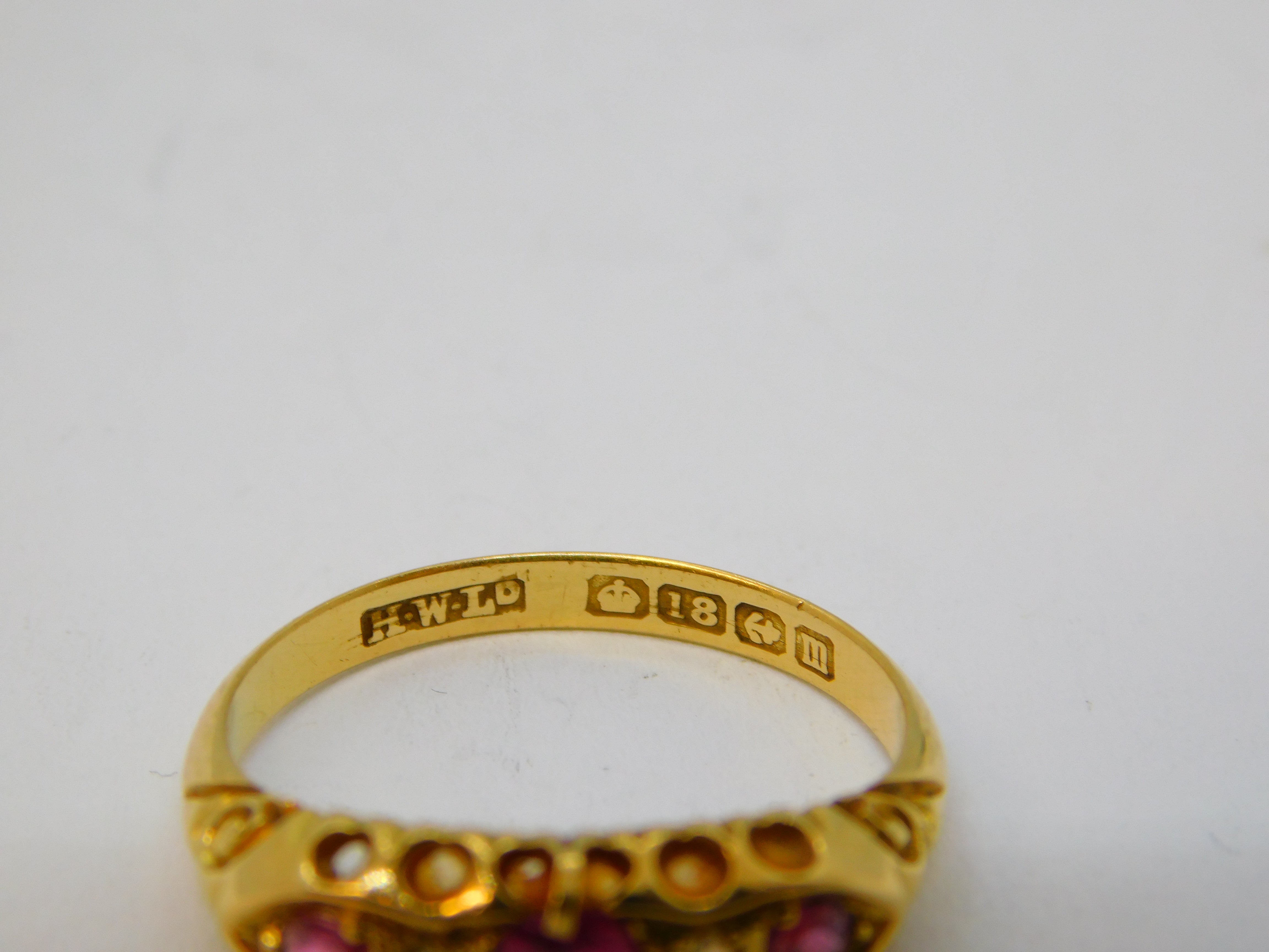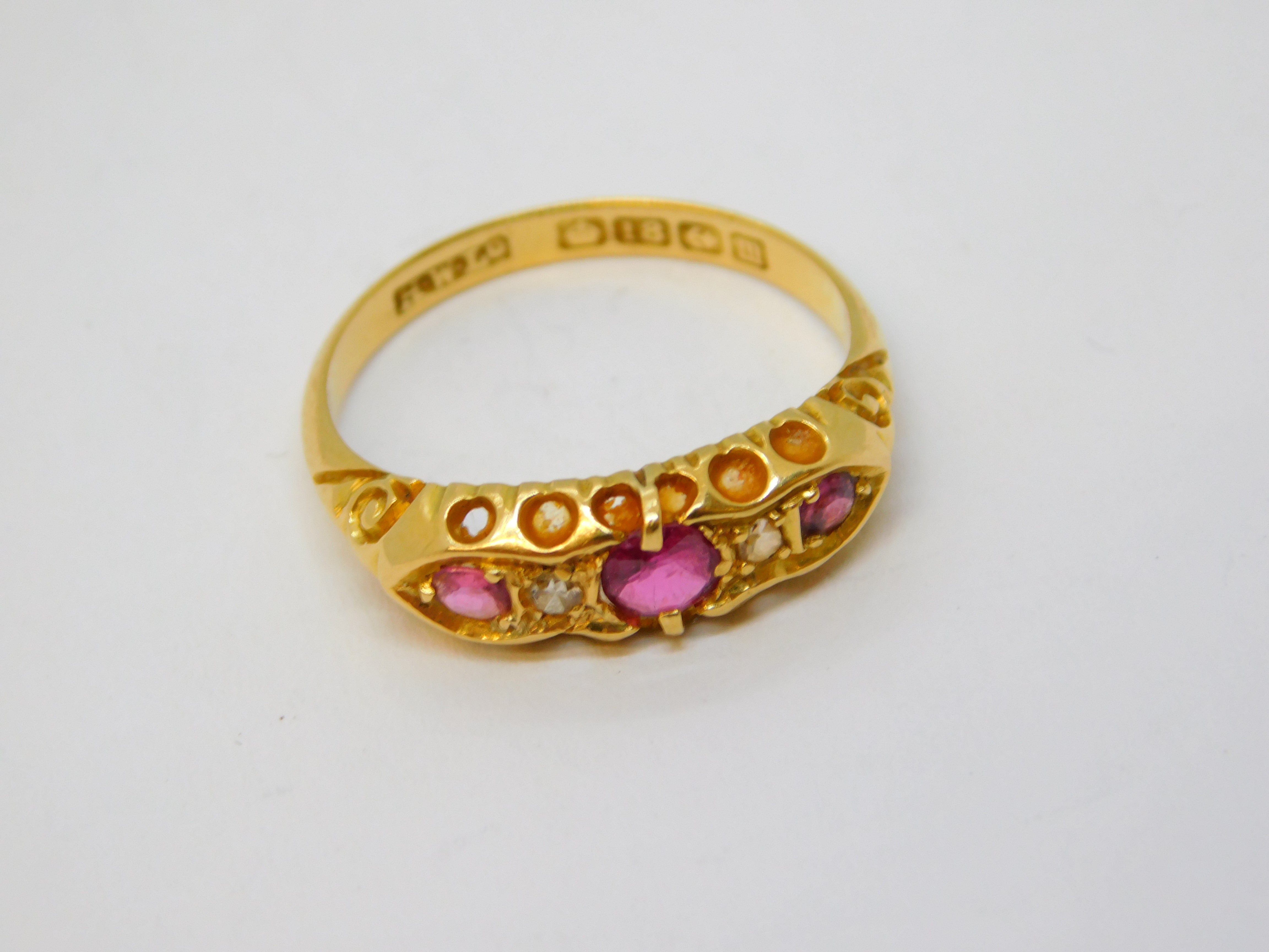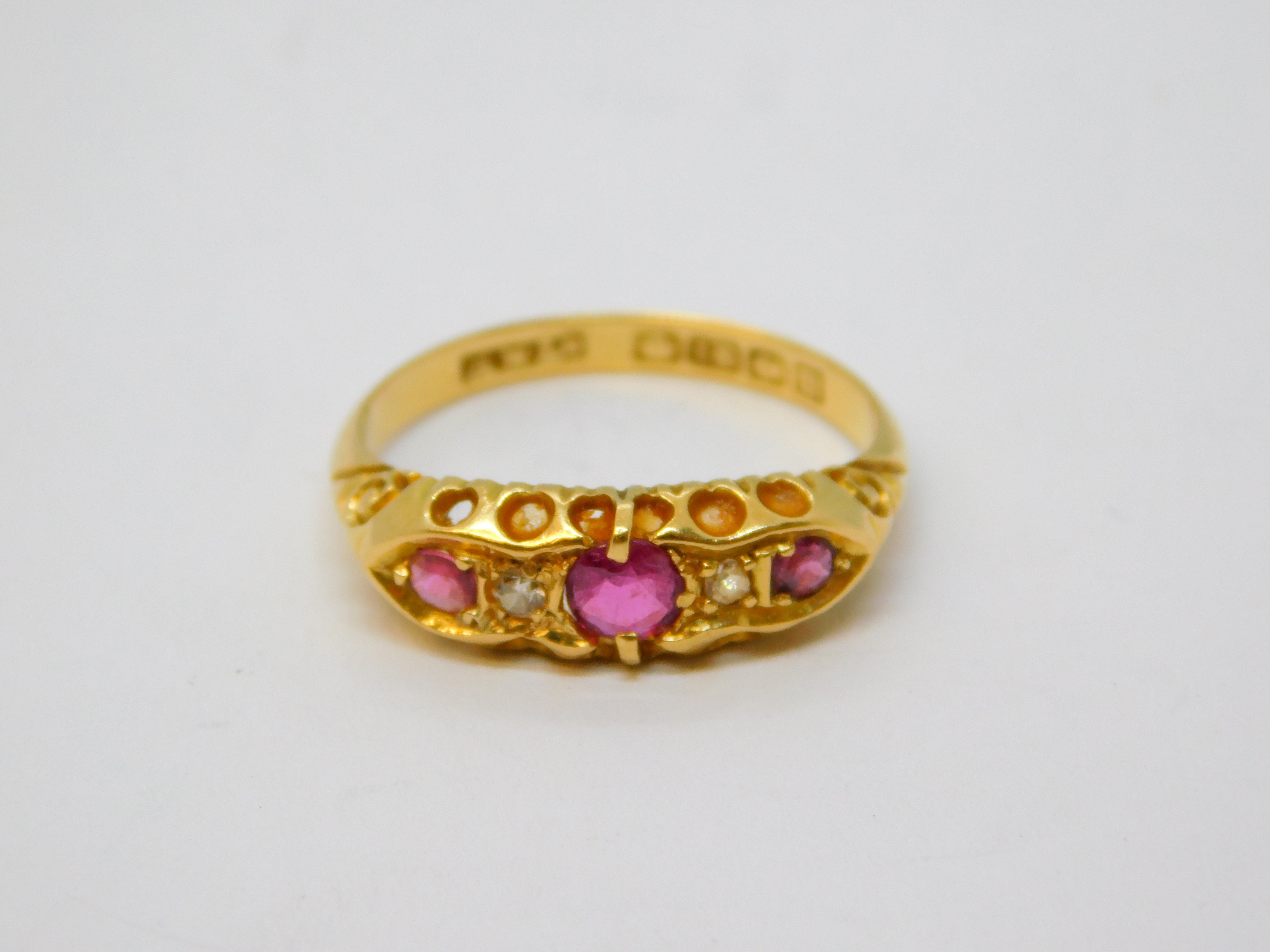Details: A fantastic and wonderfully designed antique late-Victorian 18ct yellow gold boat ring set with graduating ruby stones flanked with small diamonds hallmarked Birmingham 1886 to the interior, the stones have been tested. This is a wonderful item that would make a perfect gift or addition to any collection. We are more than happy to provide XRF reports for items upon request.