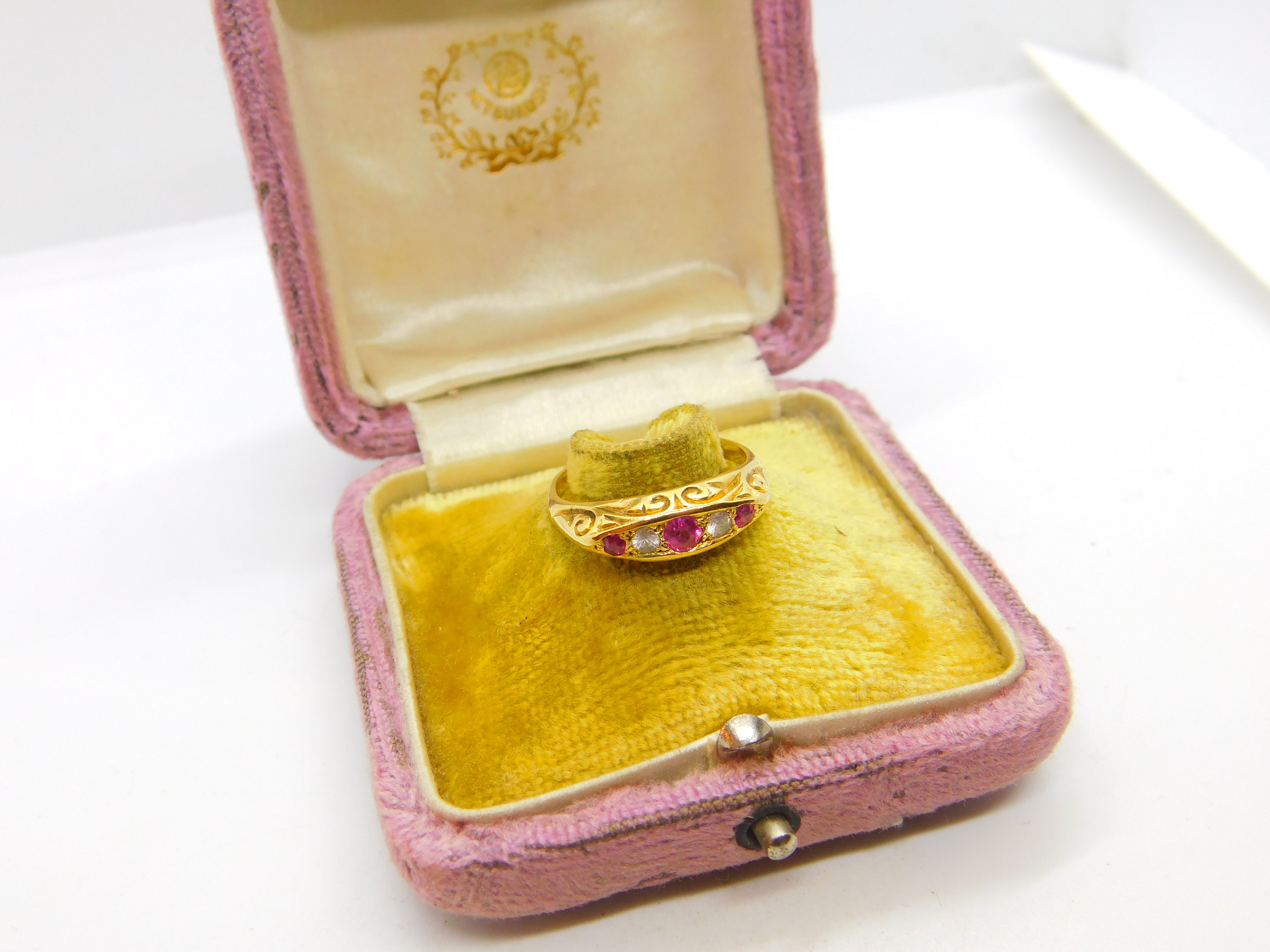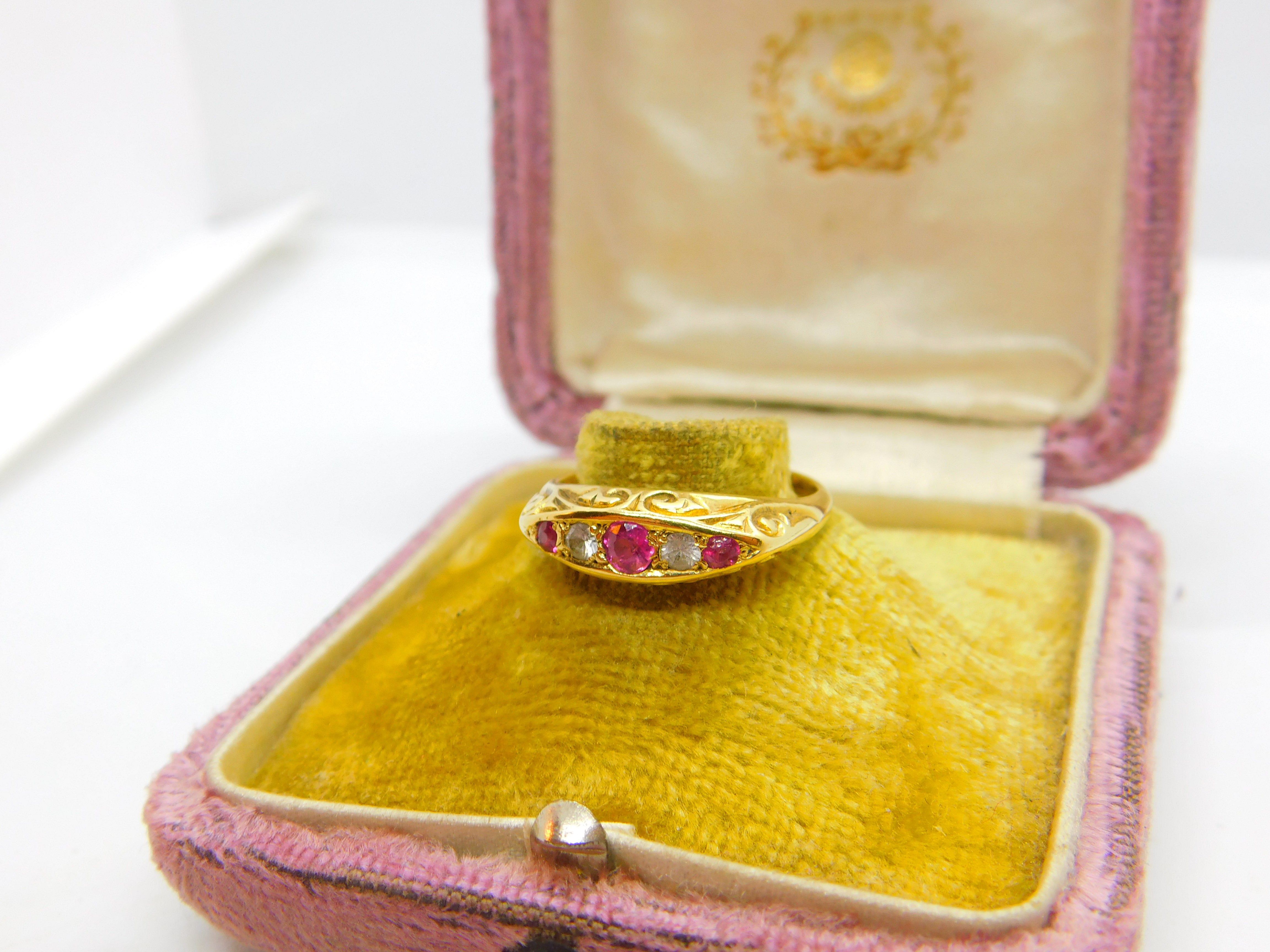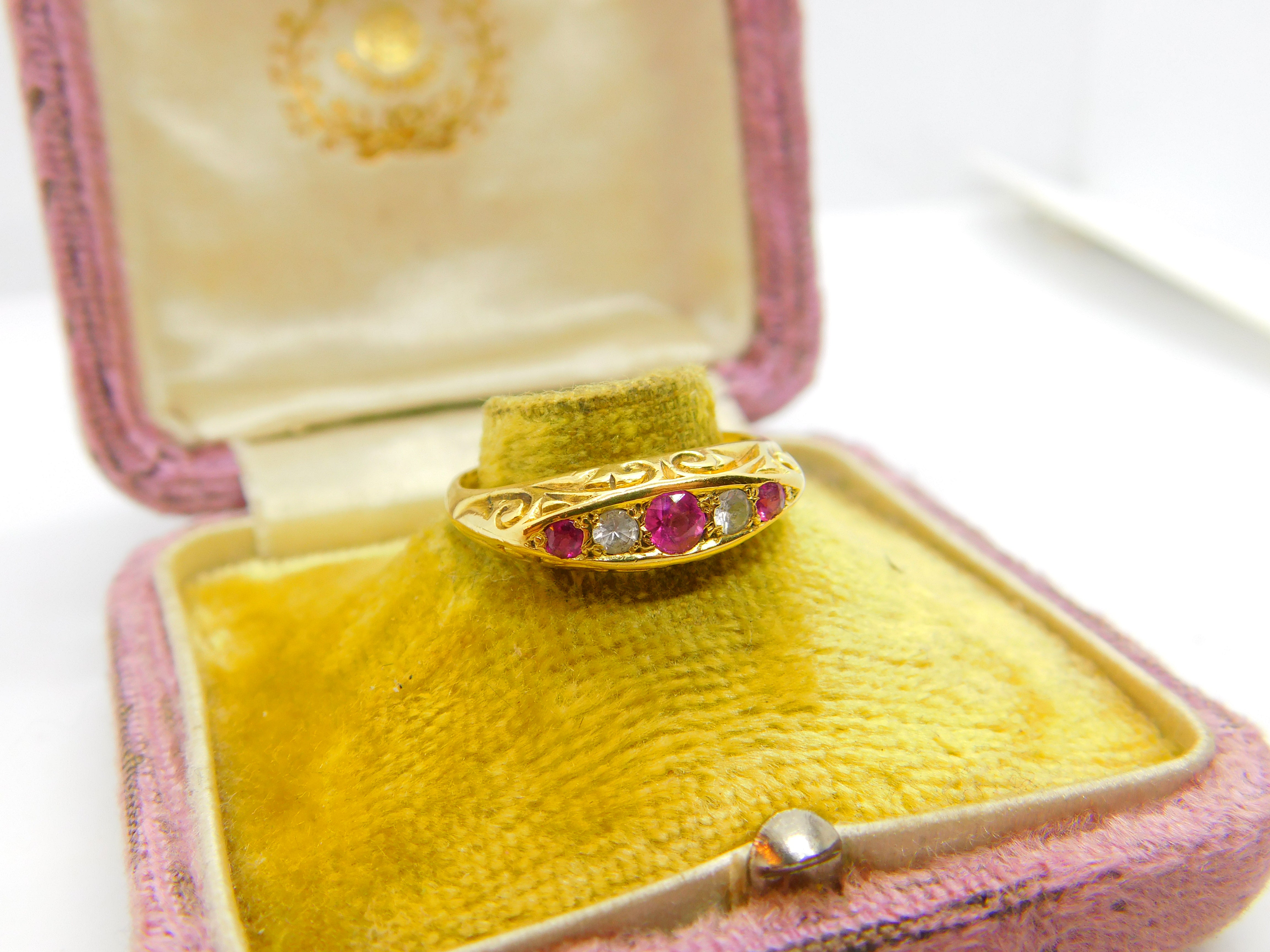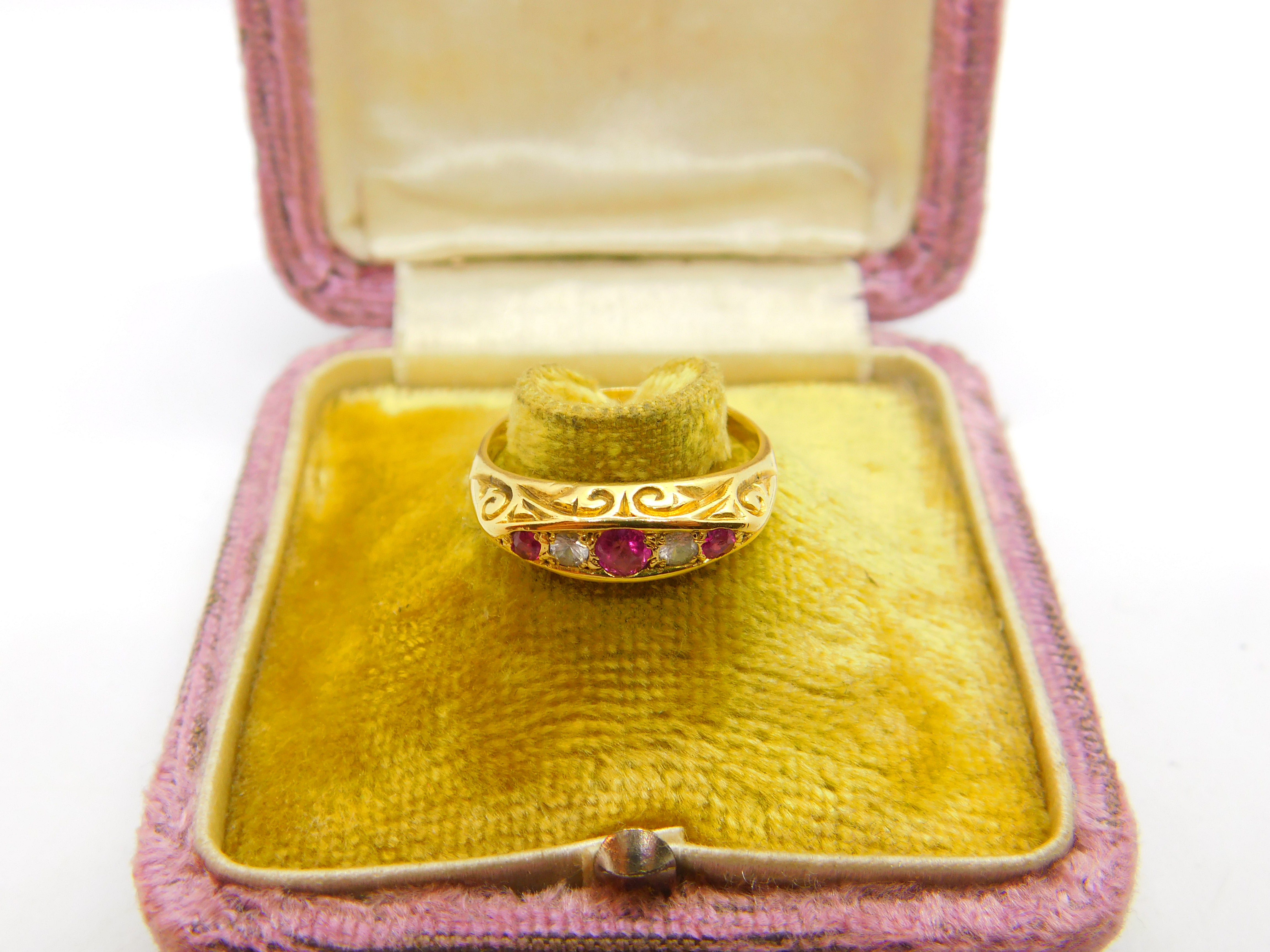 Details: A fantastic and wonderfully designed antique Victorian 18ct yellow gold boat ring set with natural ruby stones and white spinel stones hallmarked Birmingham 1872 to the interior band. This is a wonderful item that would make a perfect gift or addition to any collection. The BOX pictured is for PRESENTATION ONLY and is NOT included in the listings but used to frame the pictures unless specifically stated otherwise.