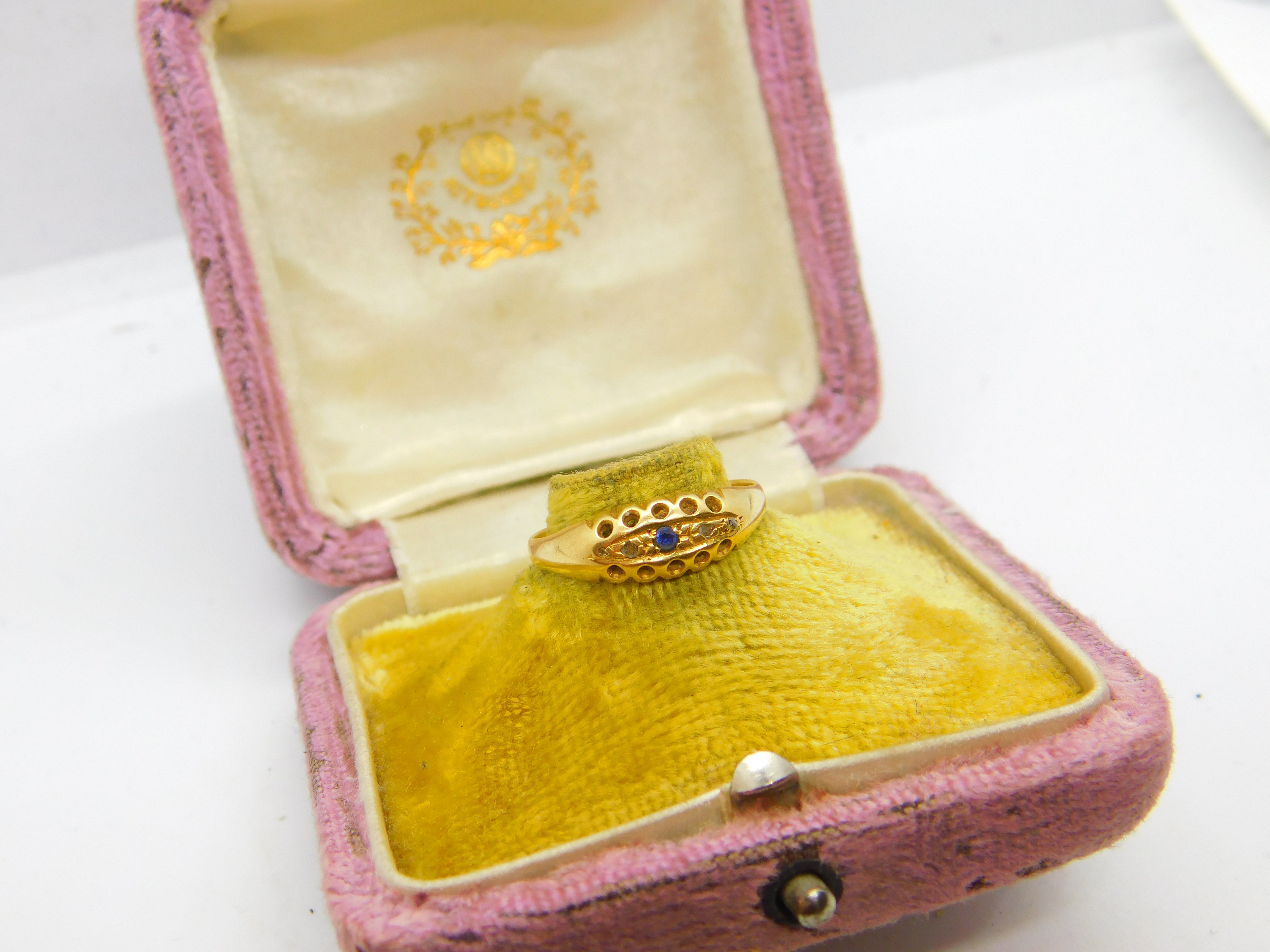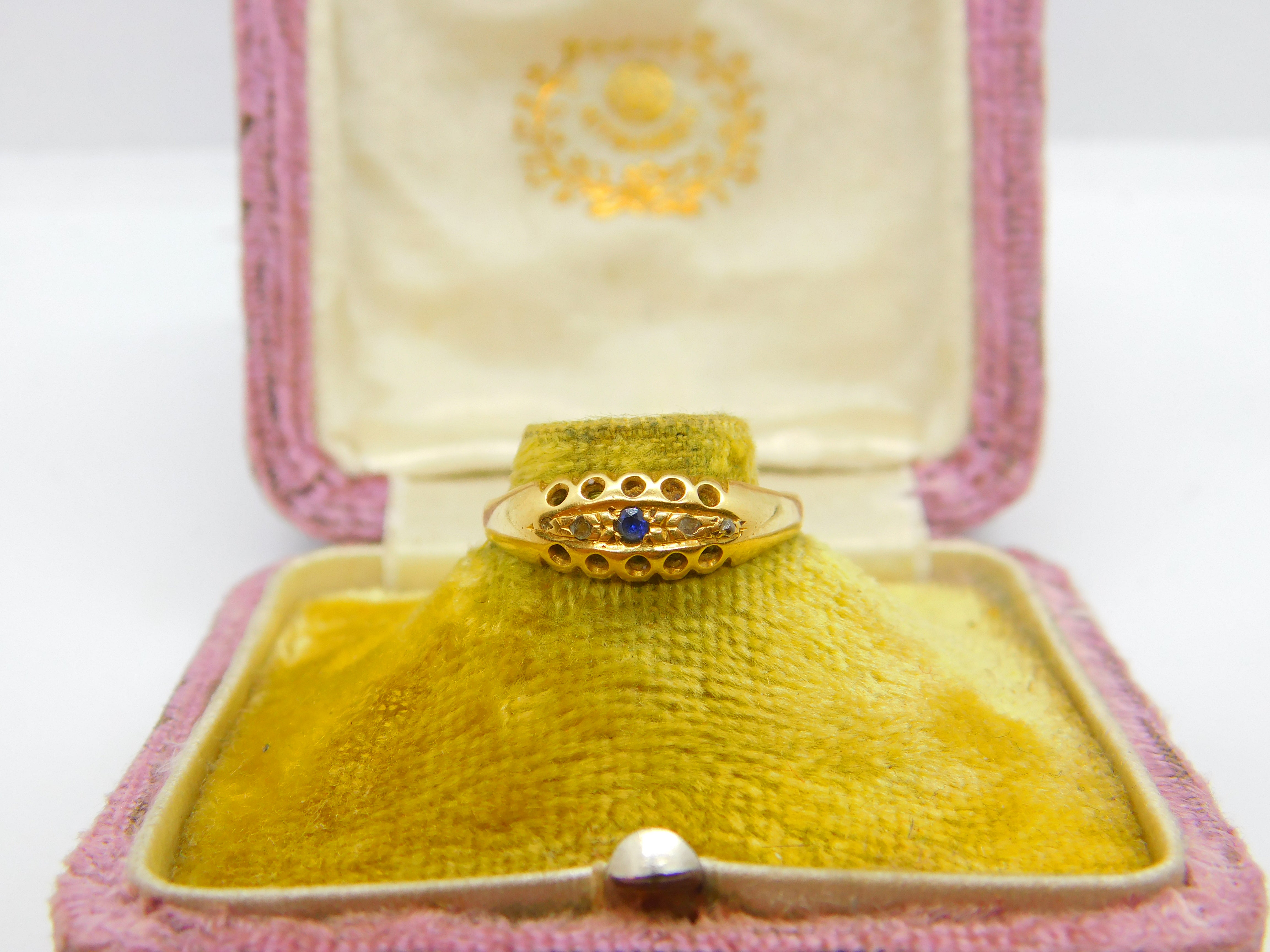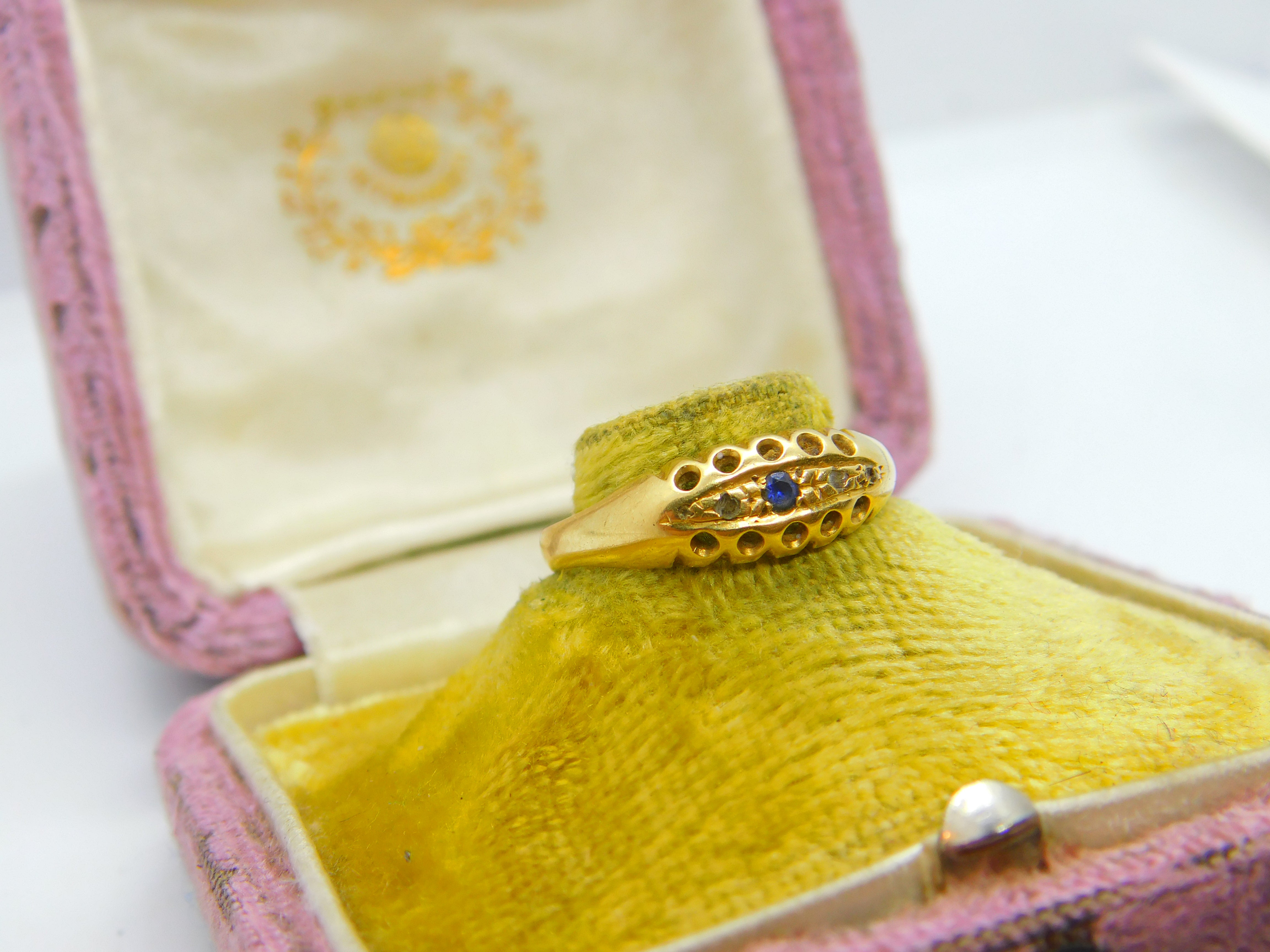 Details: A fantastic and wonderfully designed antique Victorian 18ct yellow gold boat ring set with sapphire & diamonds hallmarked Birmingham 1893 to the interior - the stones have been tested. This is a wonderful item that would make a perfect gift or addition to any collection. The BOX pictured is for PRESENTATION ONLY and is NOT included in the listings but used to frame the pictures unless specifically stated otherwise.