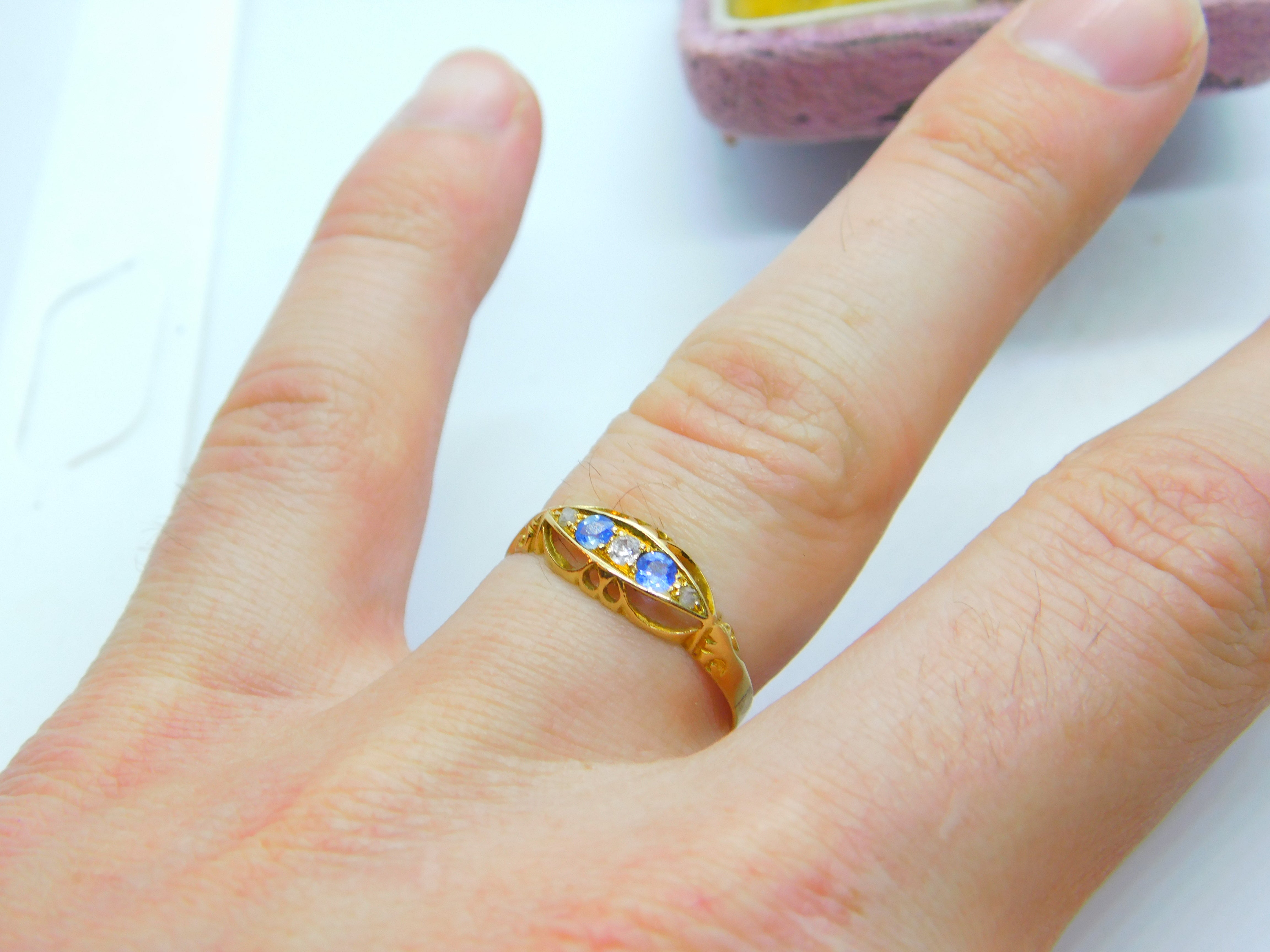Details: A fantastic and wonderfully designed antique Victorian 18ct yellow gold boat ring set with natural sapphires & diamonds hallmarked to the interior band c1890. The stones have been tested. This is a wonderful item that would make a perfect gift or addition to any collection. The BOX pictured is for PRESENTATION ONLY and is NOT included in the listings but used to frame the pictures unless specifically stated otherwise.