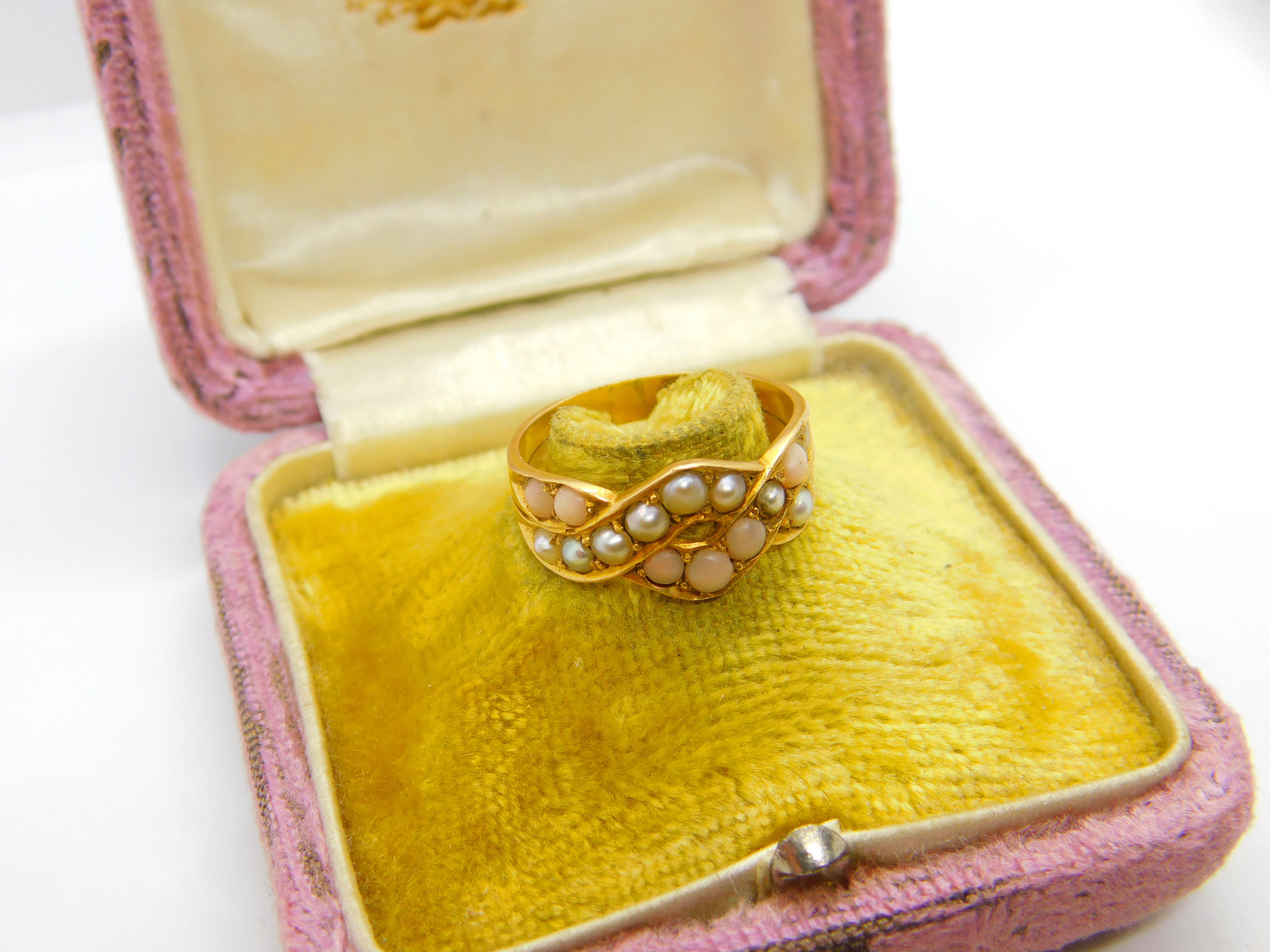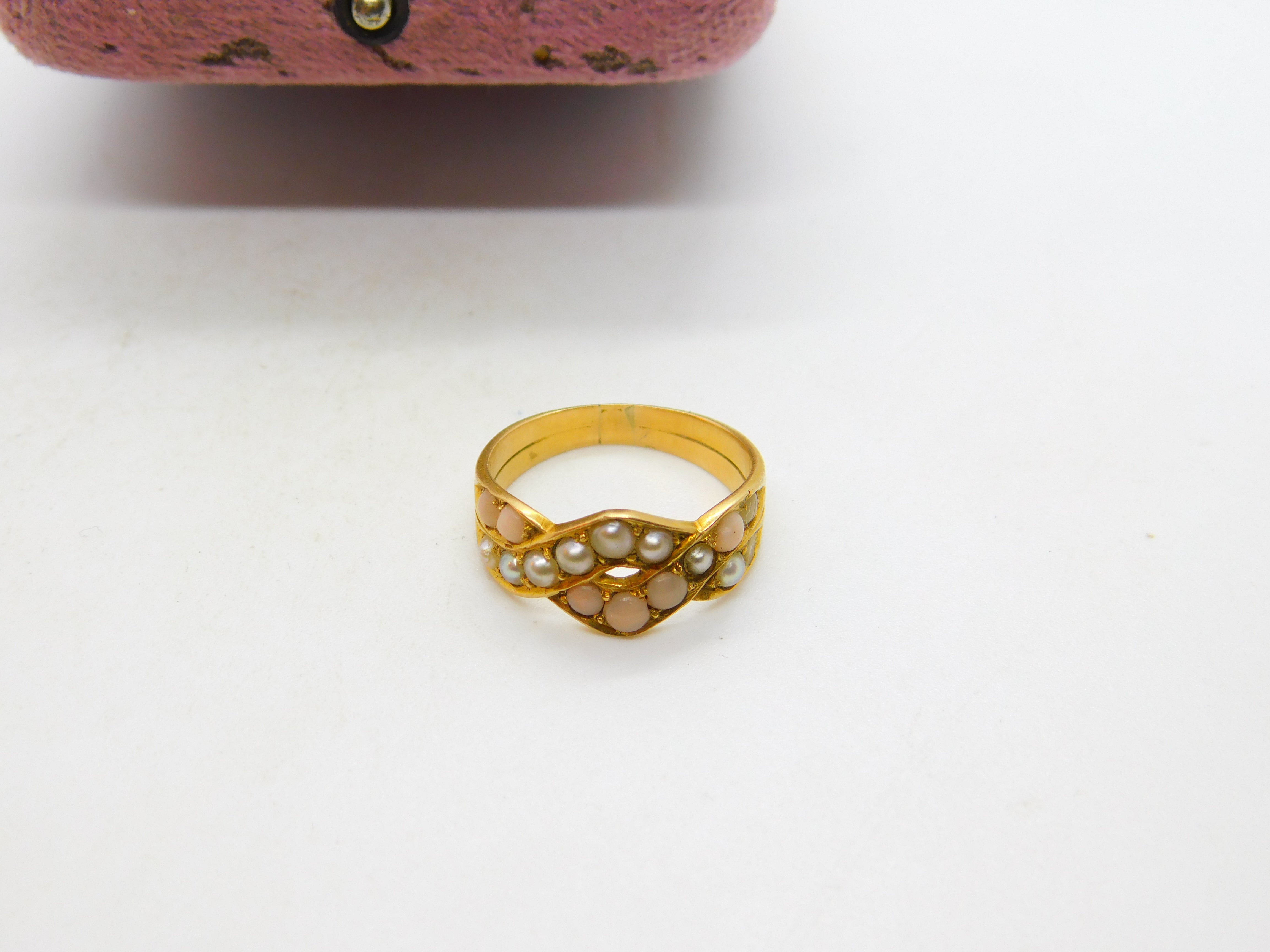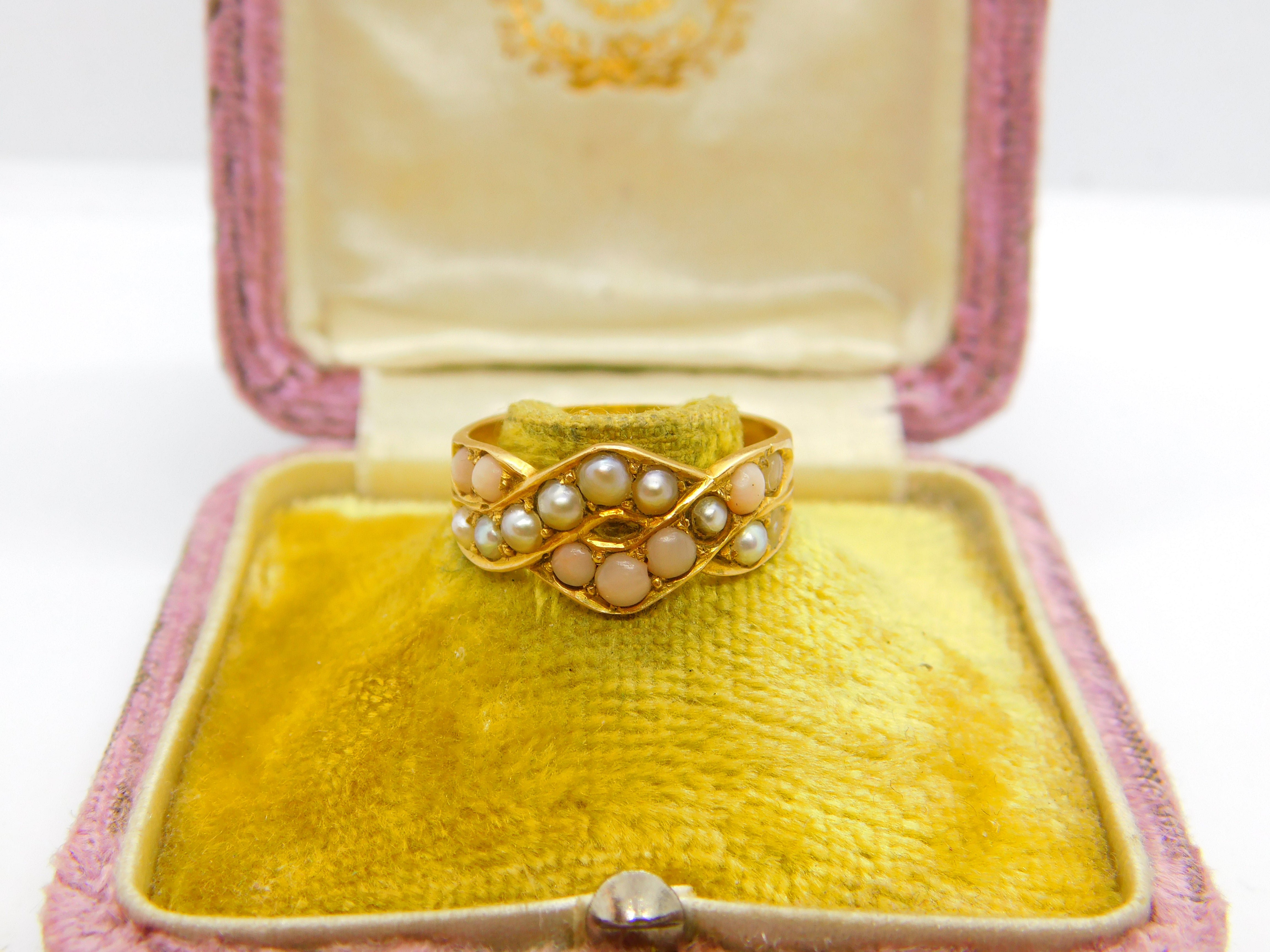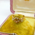 Victorian 18ct Yellow Gold, Seed Pearl & Coral Bead Crossover Ring c1860 Antique