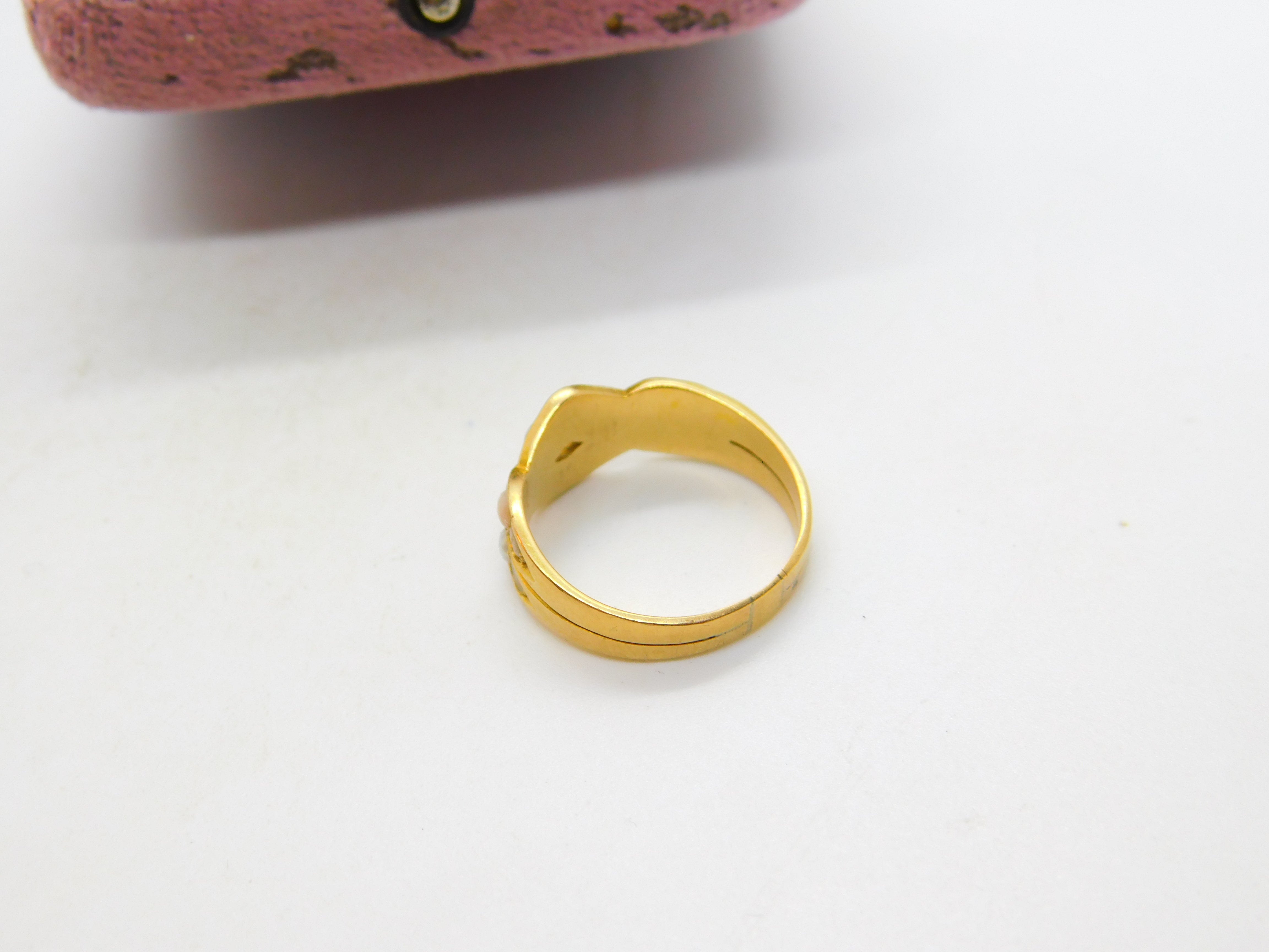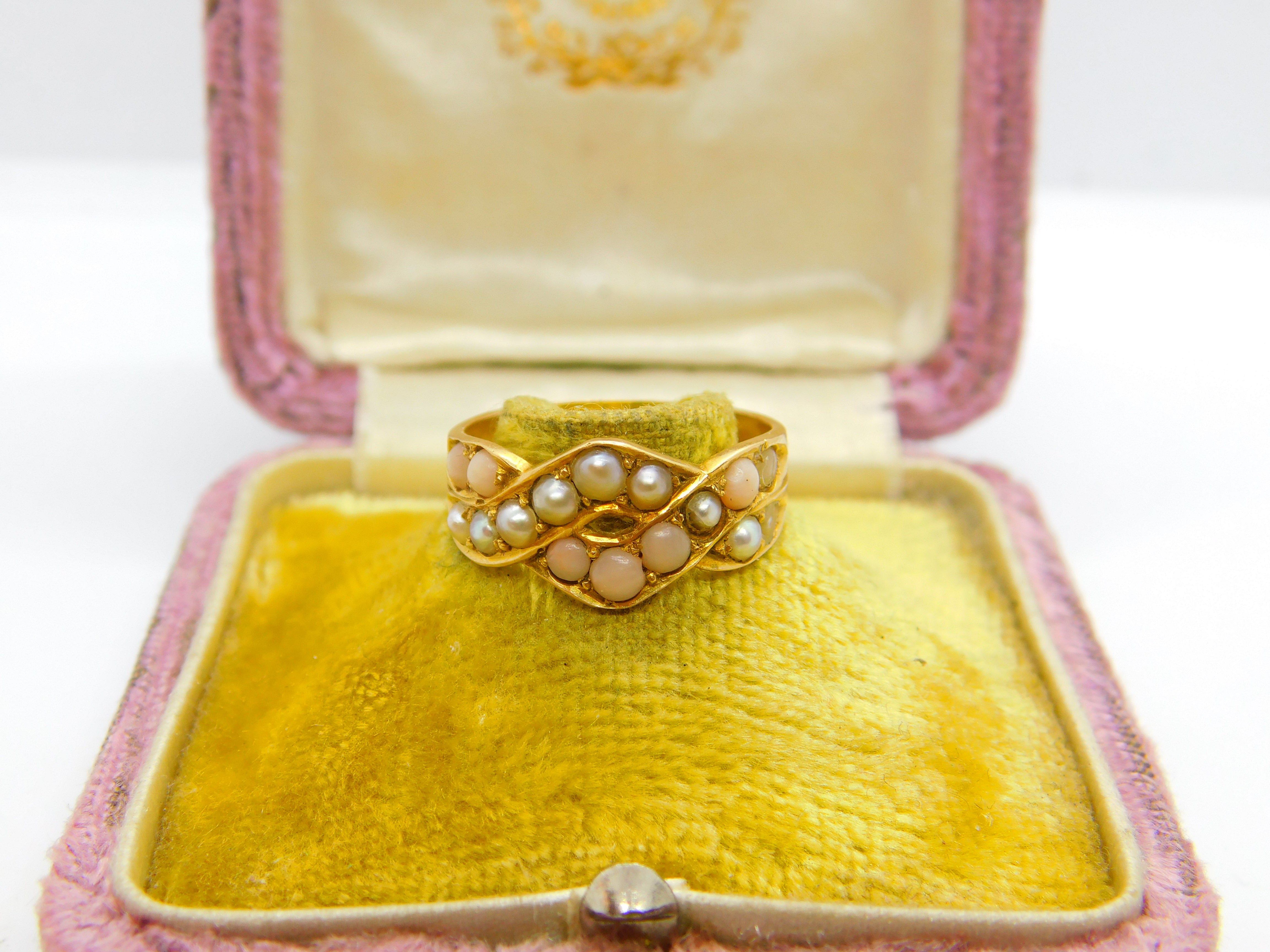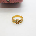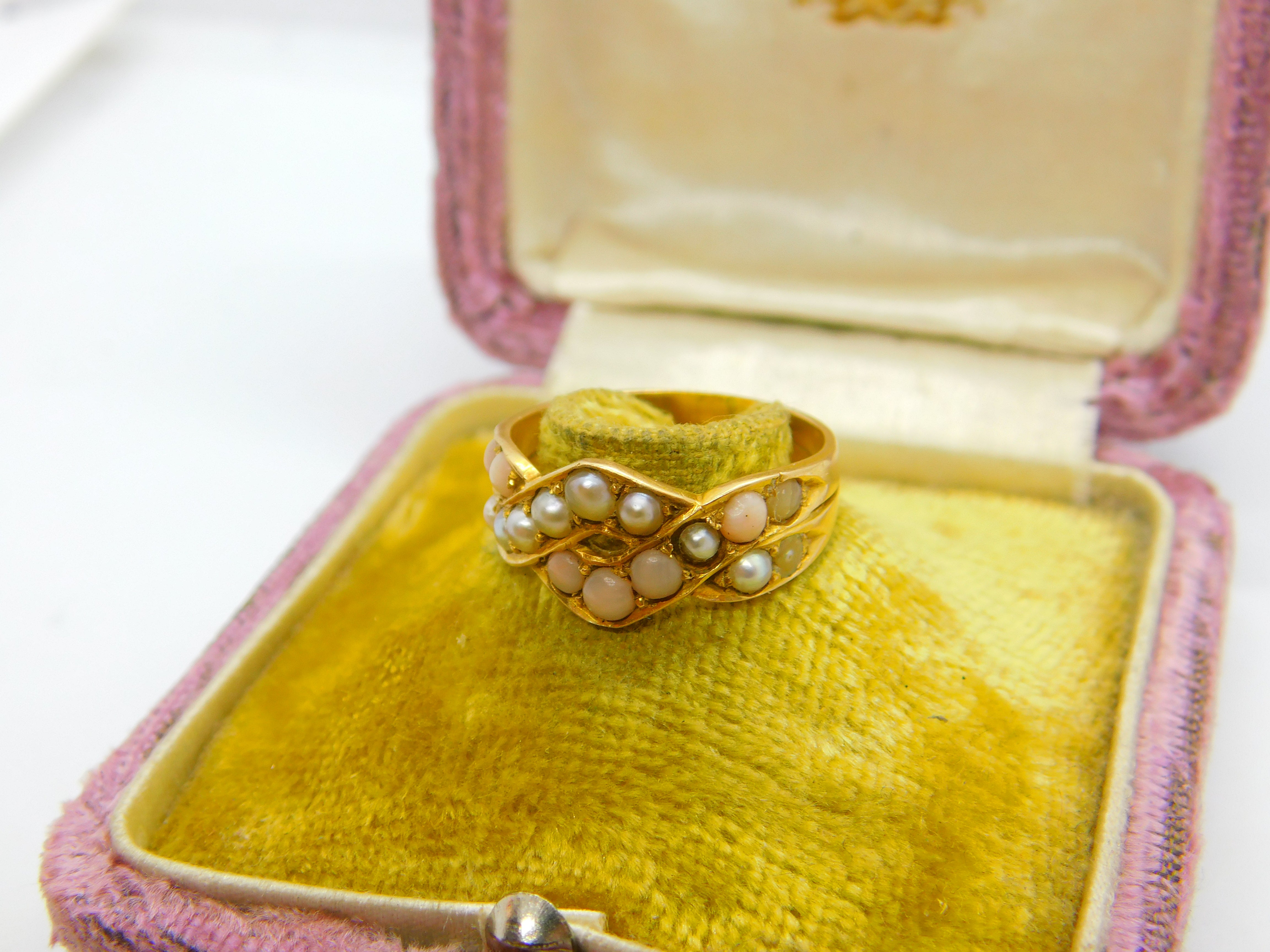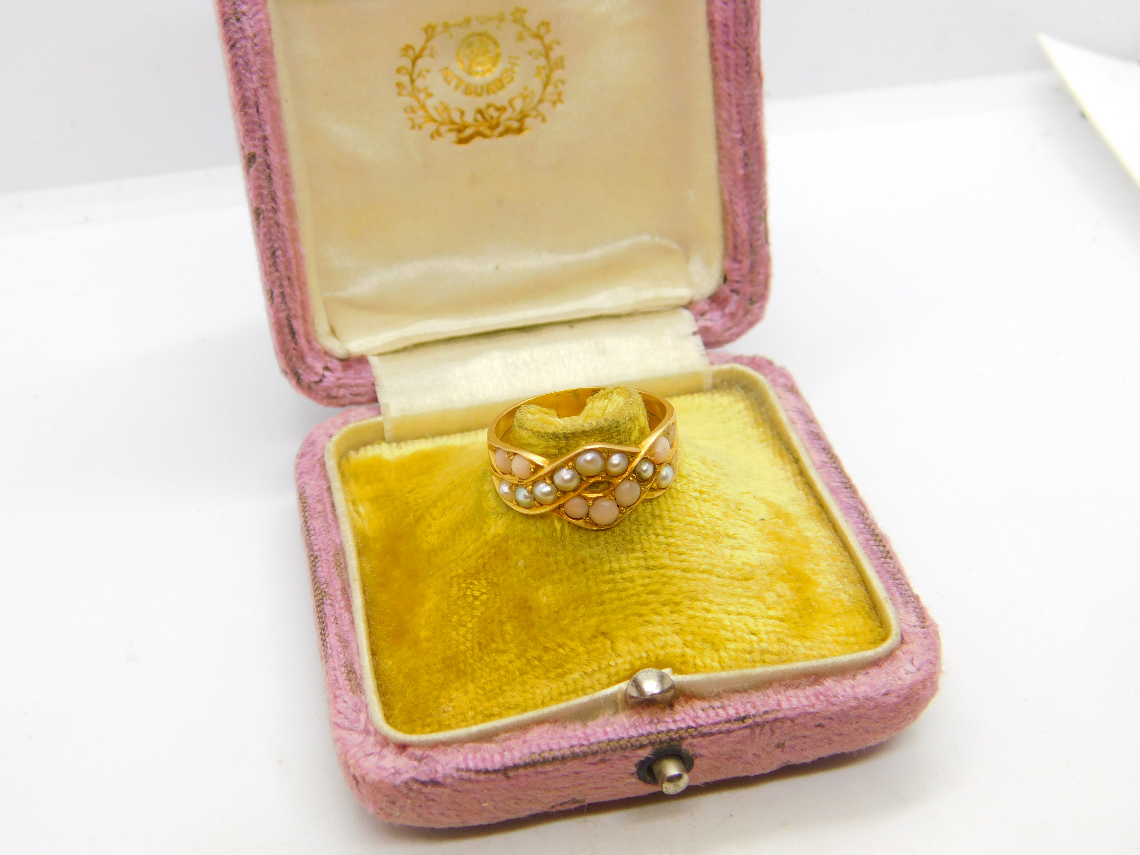 Victorian 18ct Yellow Gold, Seed Pearl & Coral Bead Crossover Ring c1860 Antique