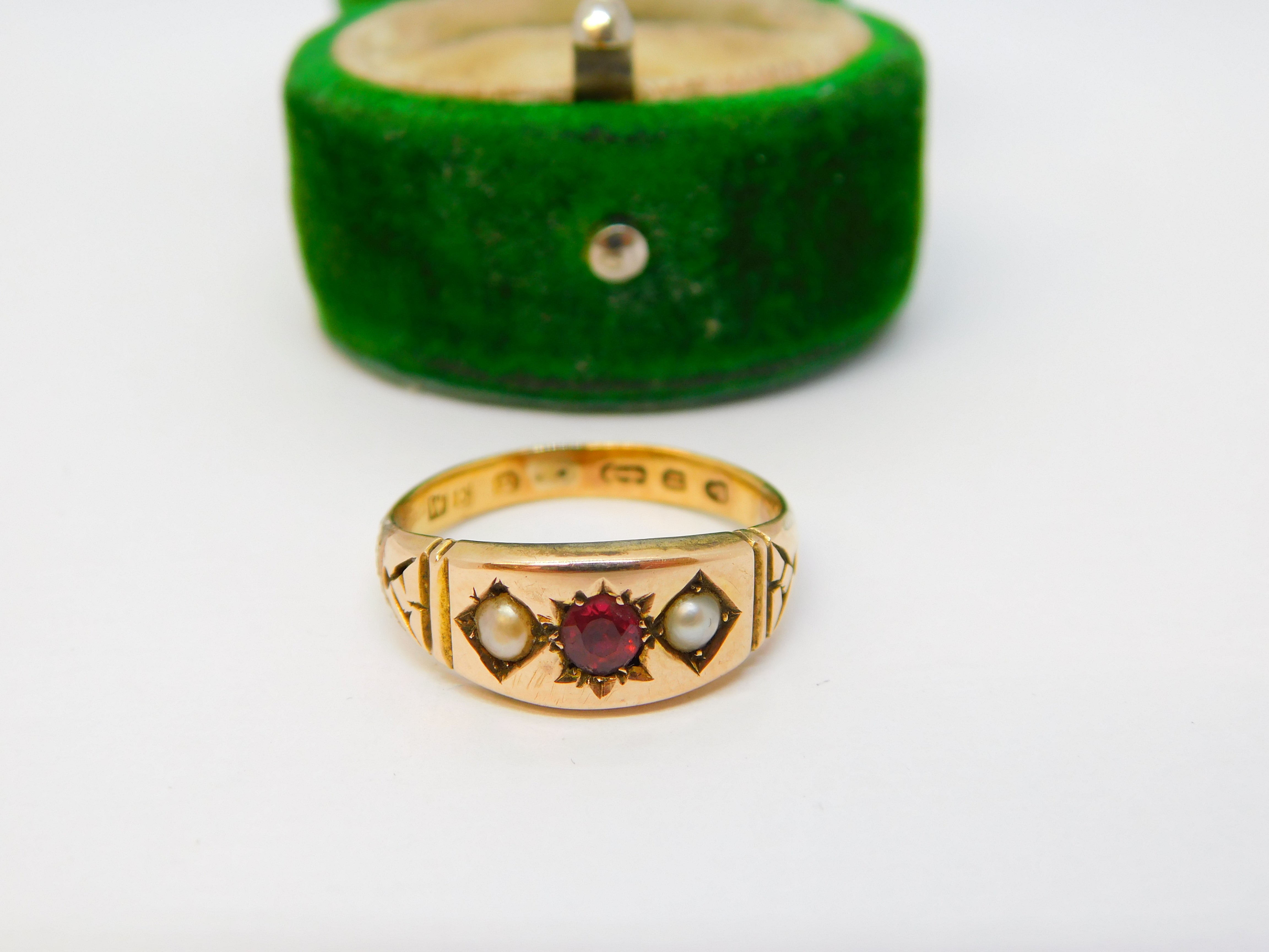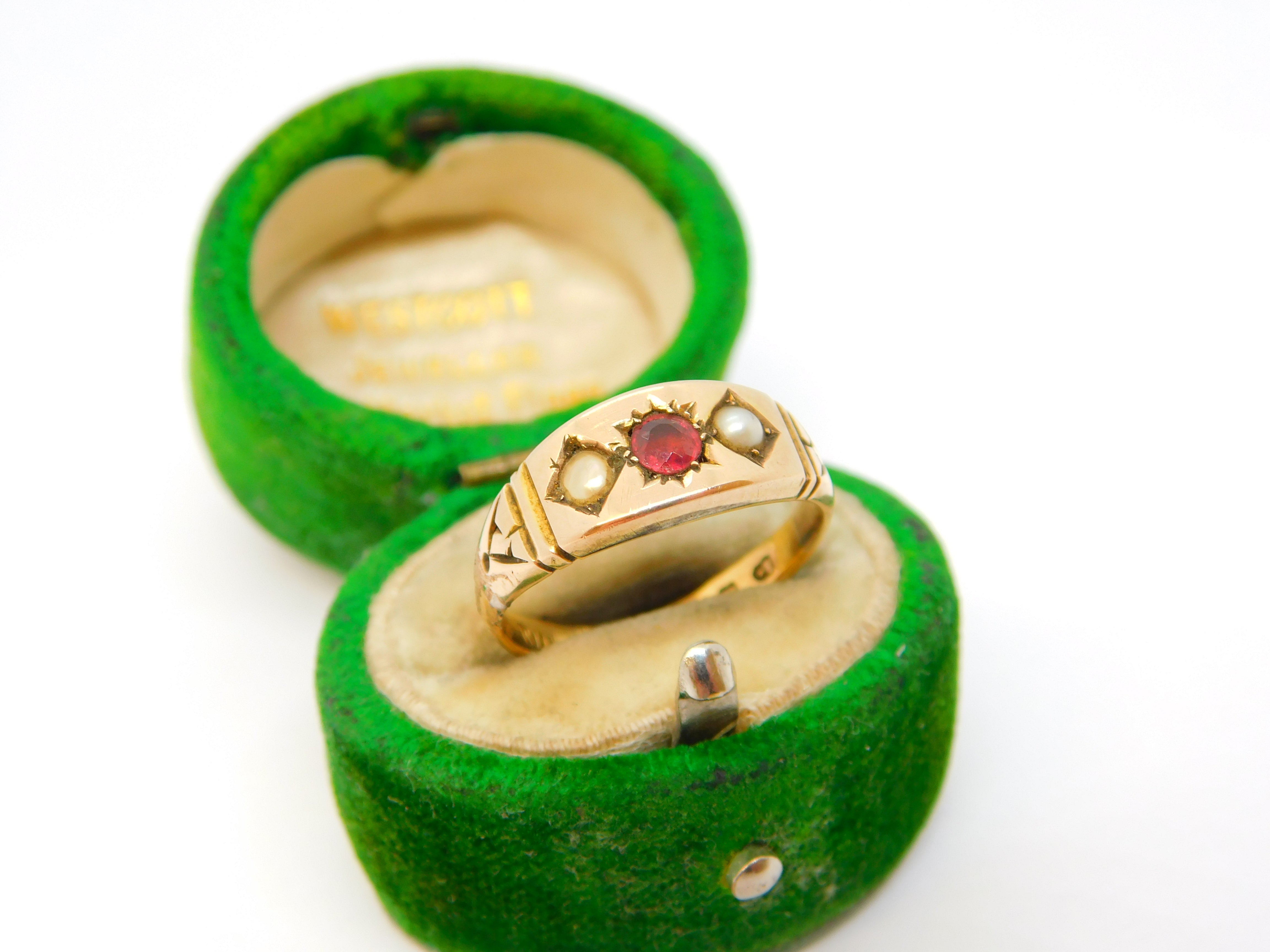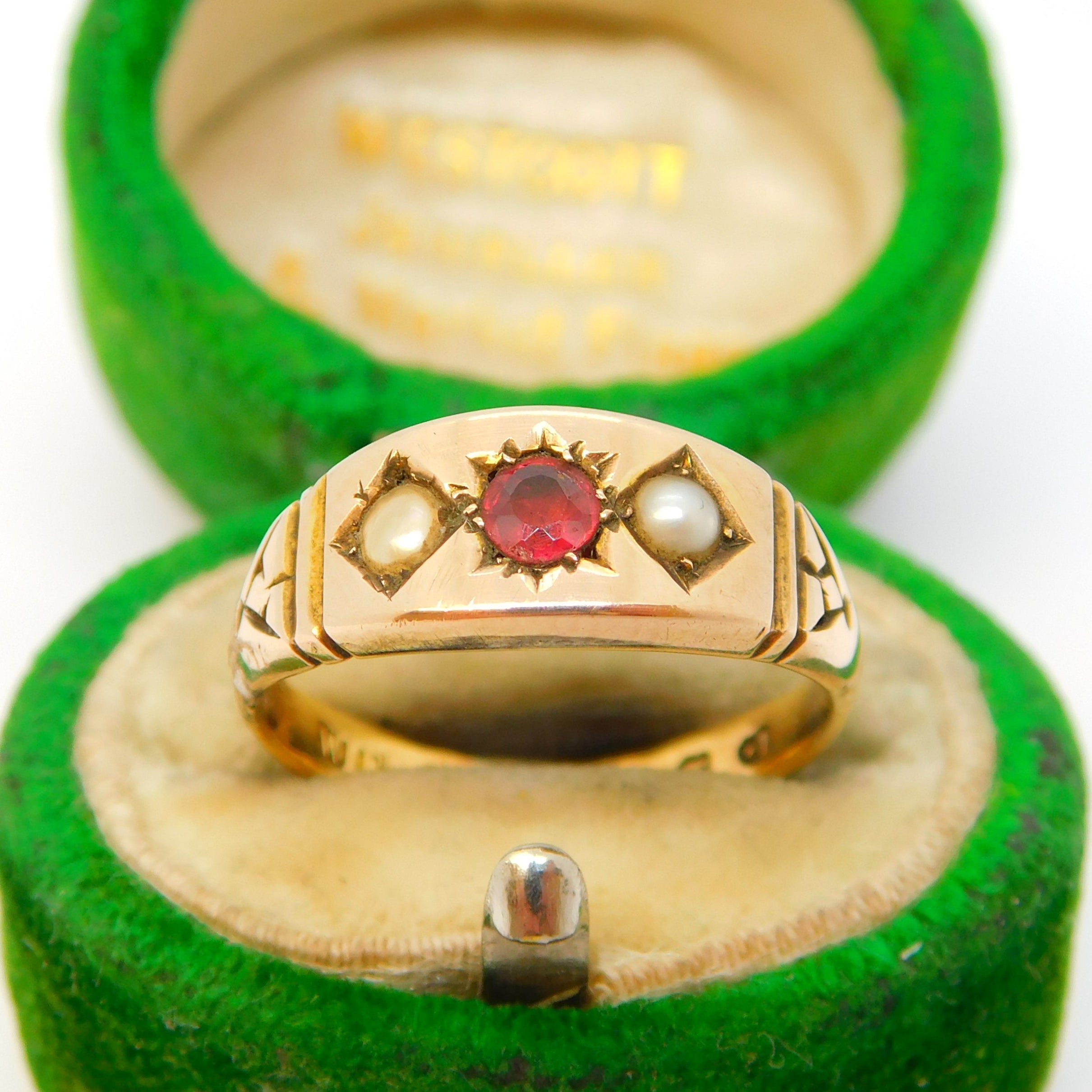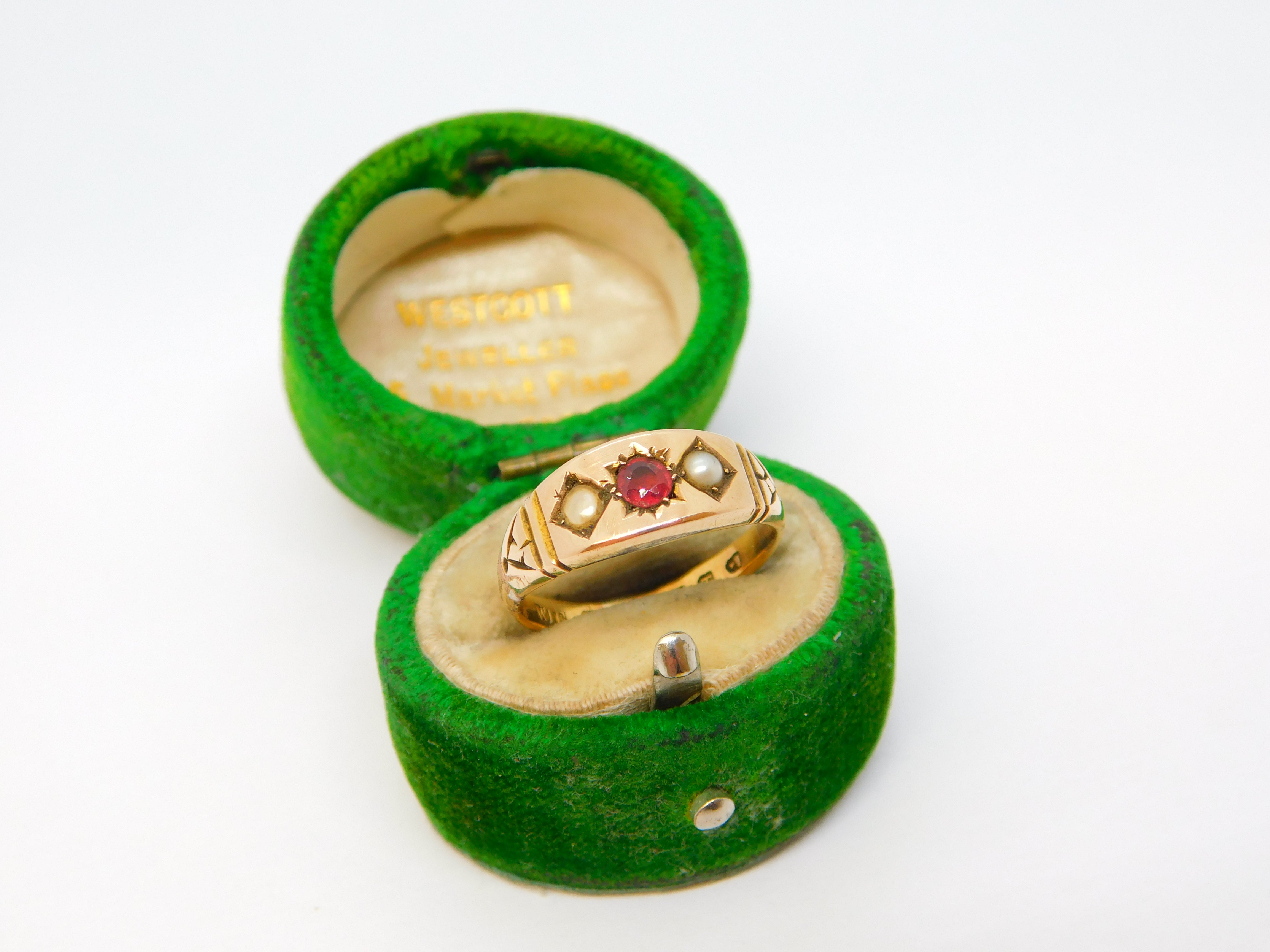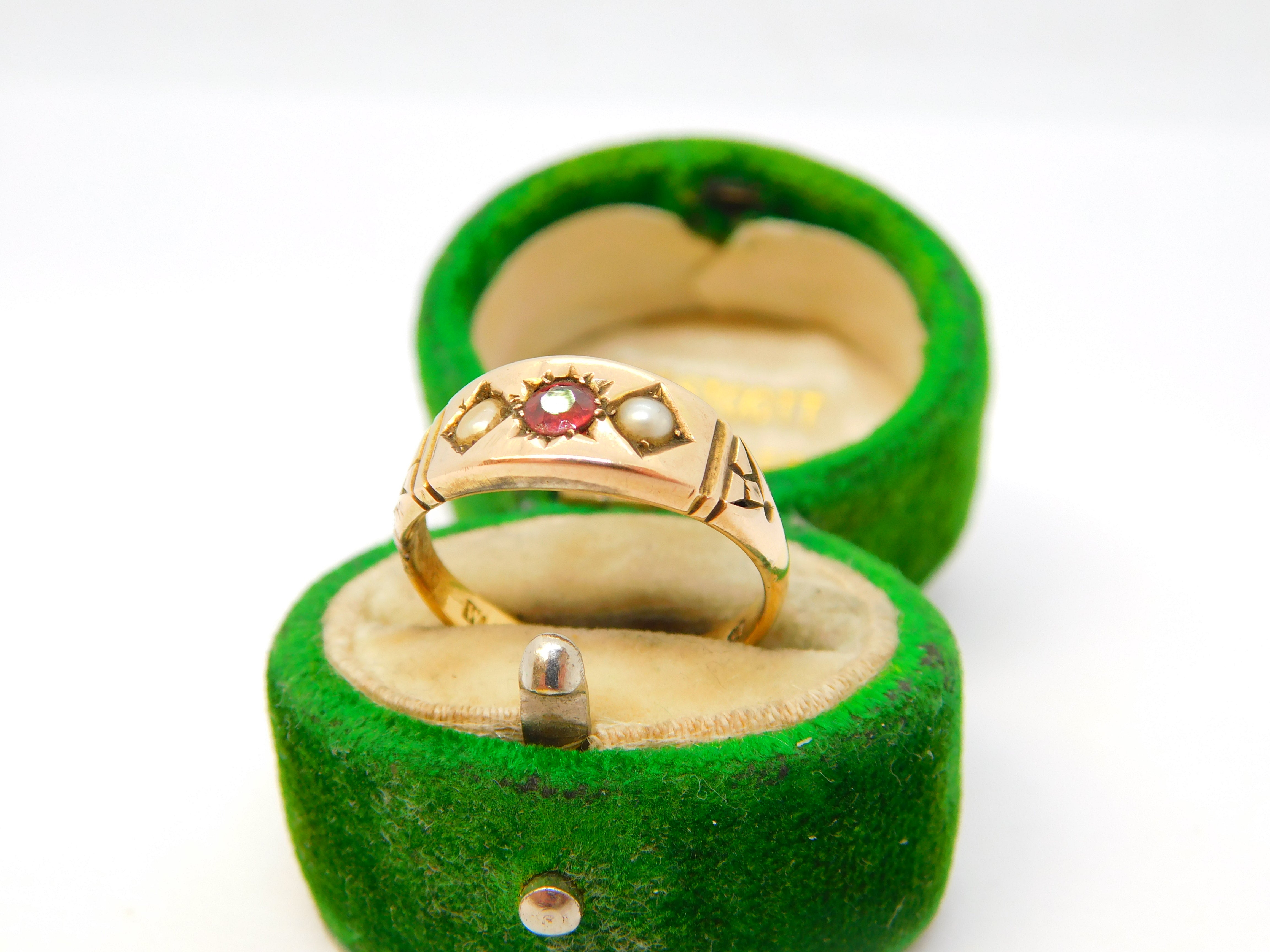 Details: A fantastic and wonderfully designed antique Victorian 22ct yellow gold boat ring set with garnet flanked by two seed pearls hallmarked Birmingham 1857. This is a wonderful item that would make a perfect gift or addition to any collection. The BOX pictured is for PRESENTATION ONLY and is NOT included in the listings but used to frame the pictures unless specifically stated otherwise.