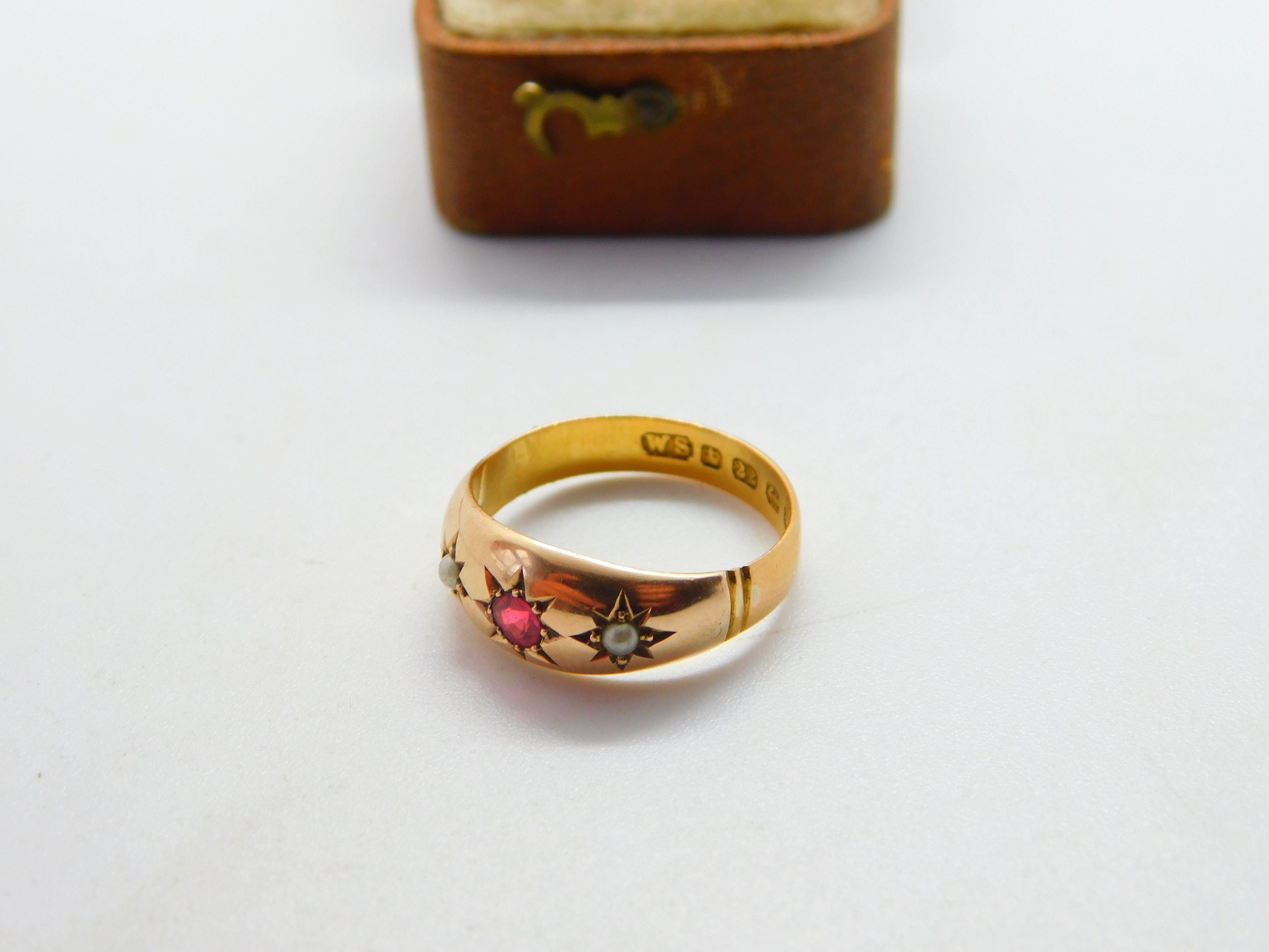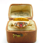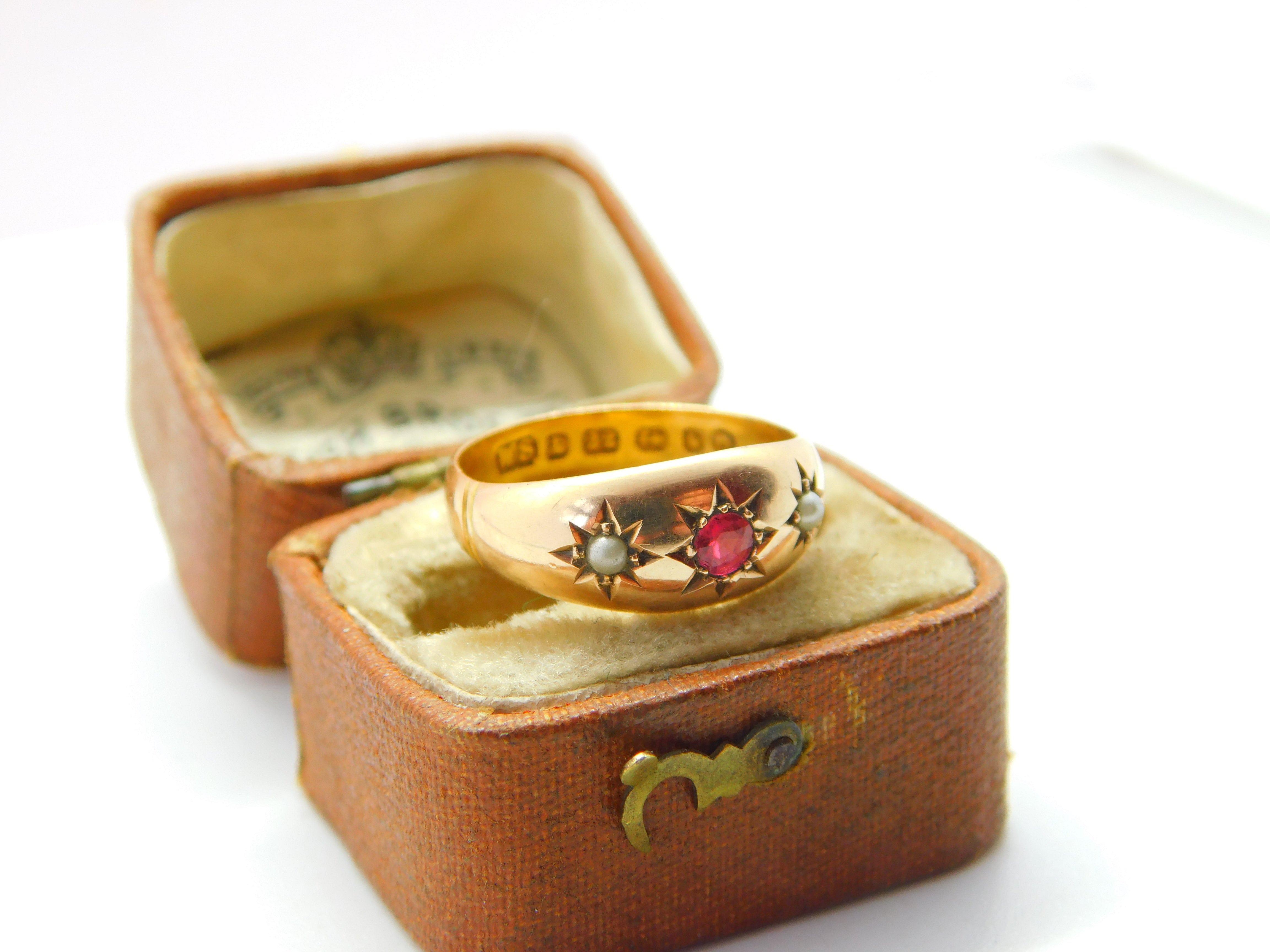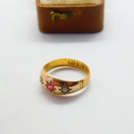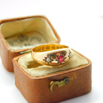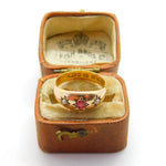 Victorian 22ct Yellow Gold, Ruby & Seed Pearl Boat Ring 1884 Birmingham Antique