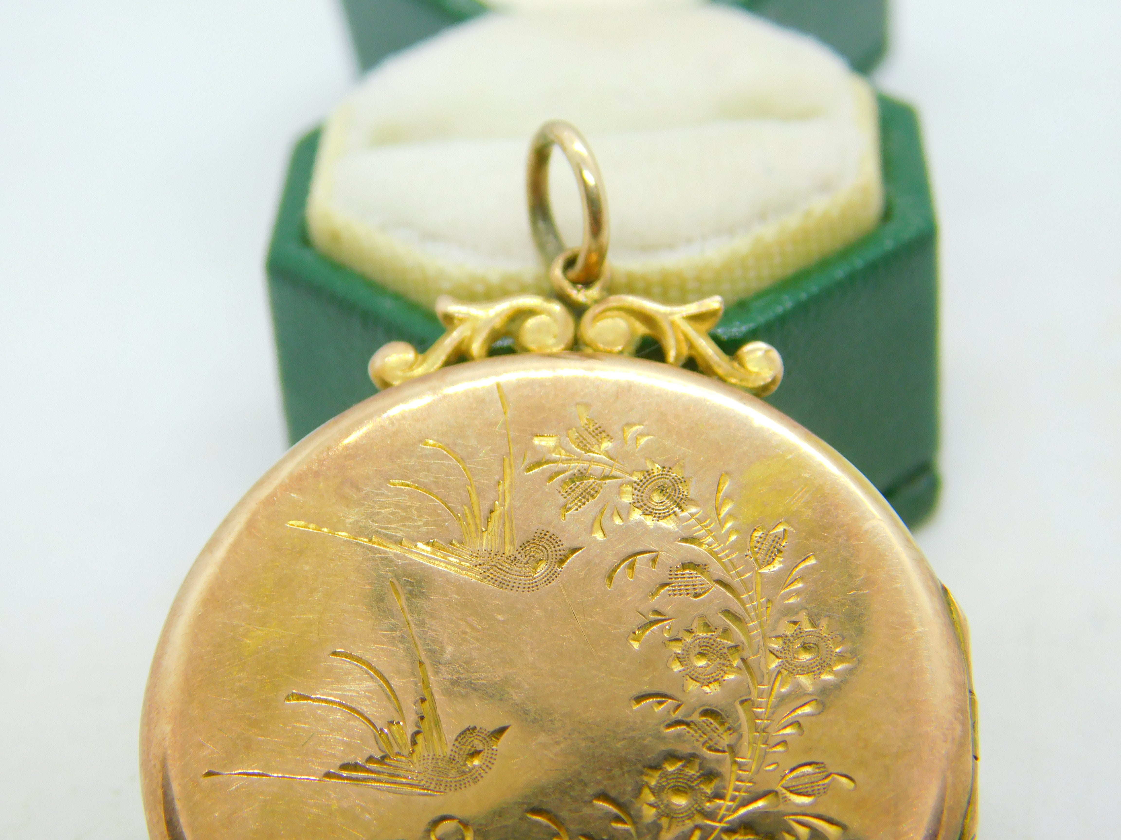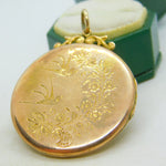 Details: A fantastic and wonderfully designed antique Victorian 9ct rose gold back & front circular locket pendant with charming swallow & flower pattern hallmarked to the reverse c1900. This is a wonderful item that would make a perfect gift or addition to any collection. The BOX pictured is for PRESENTATION ONLY and is NOT included in the listings but used to frame the pictures unless specifically stated otherwise.
