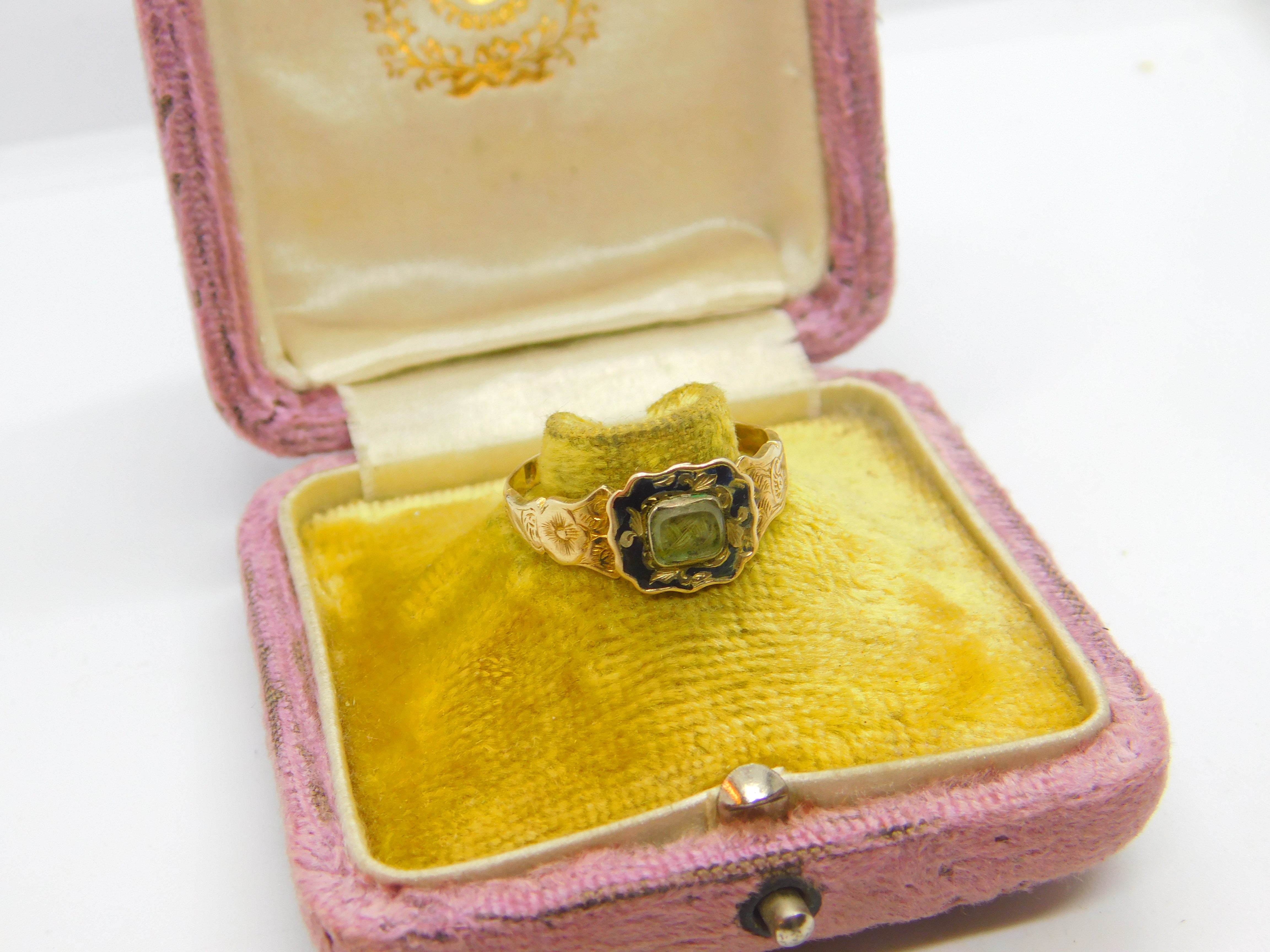 Victorian 9ct Gold, Black Enamel & Woven Hair Mourning Ring 1865 Birmingham