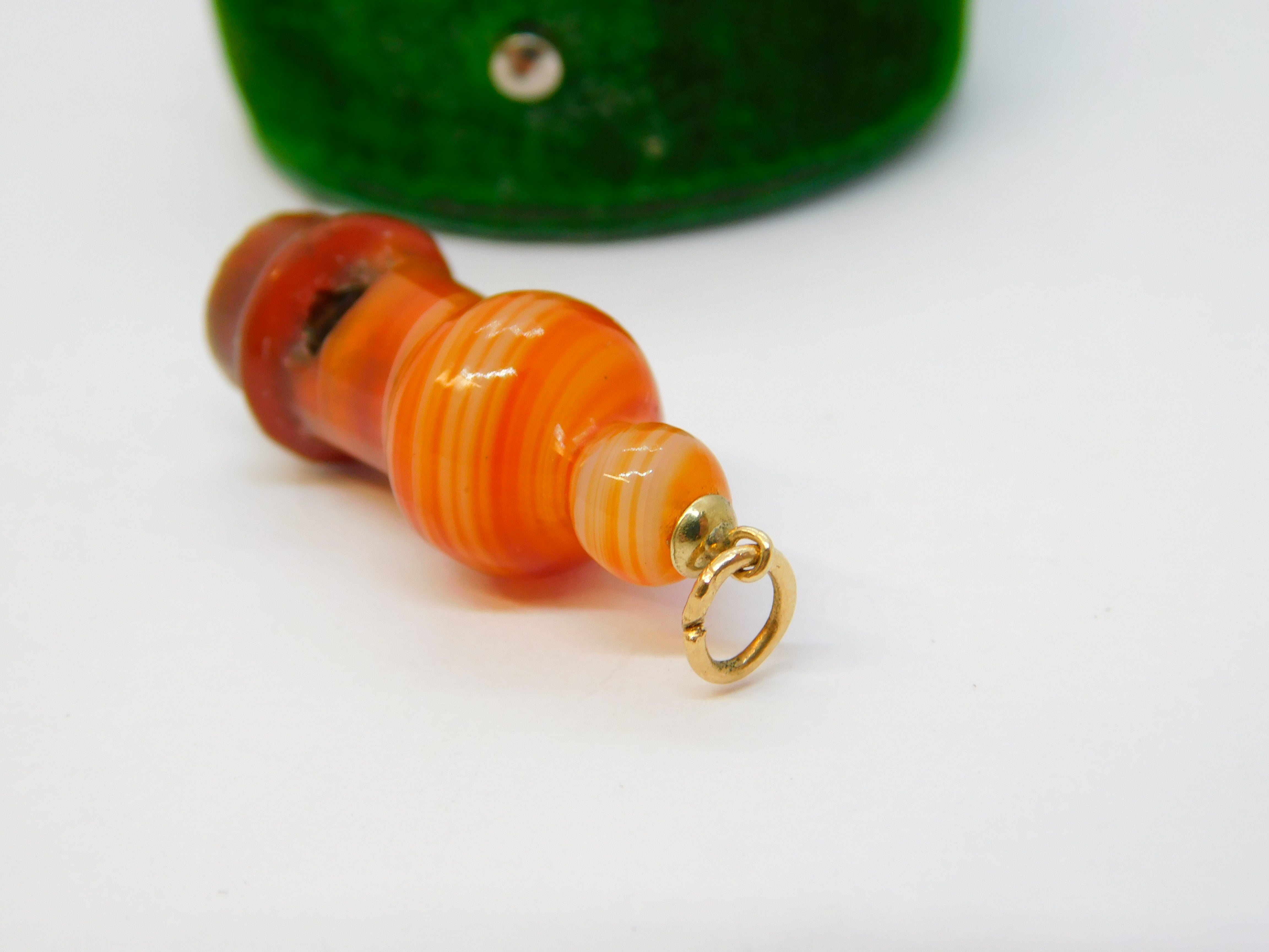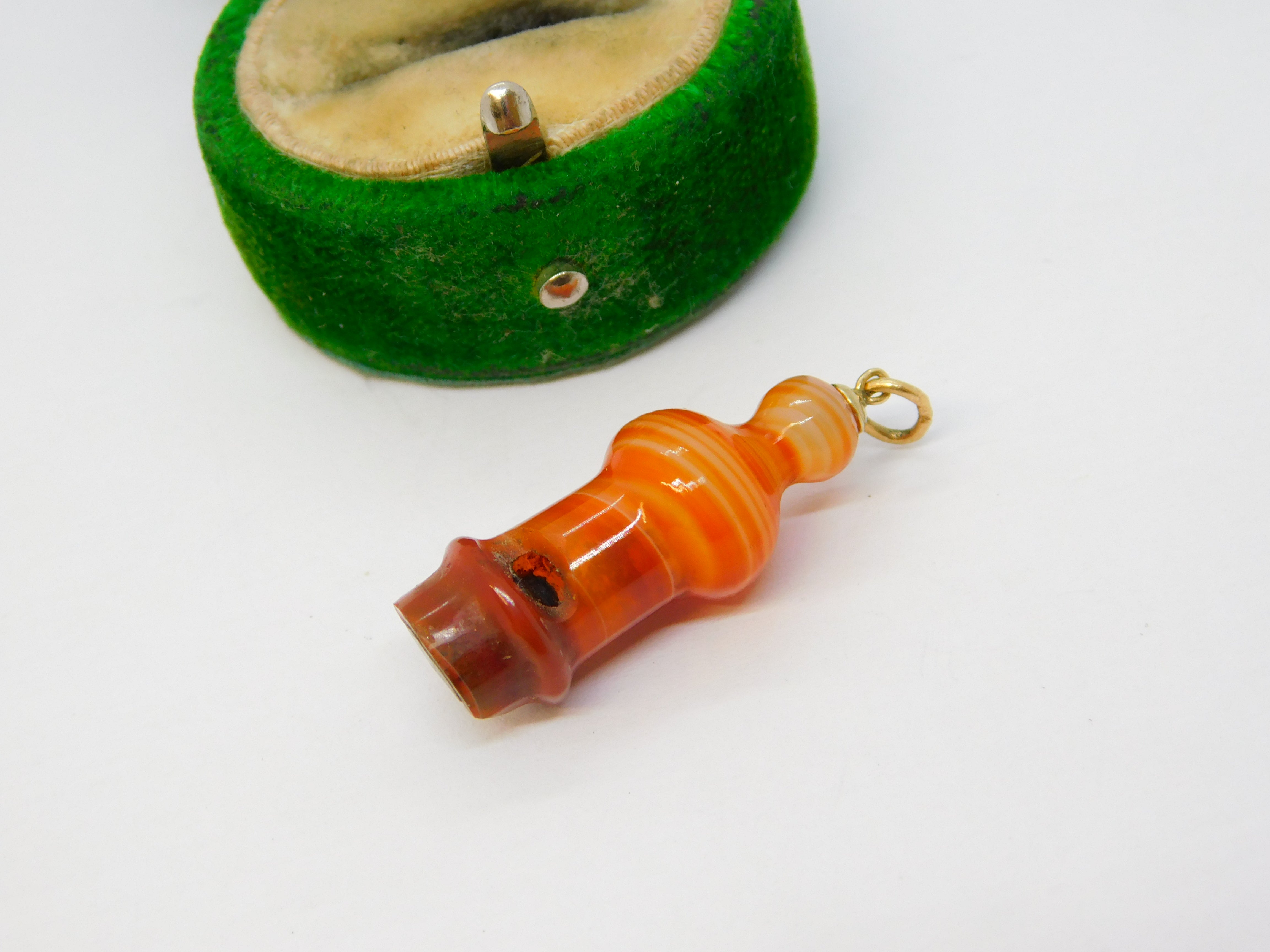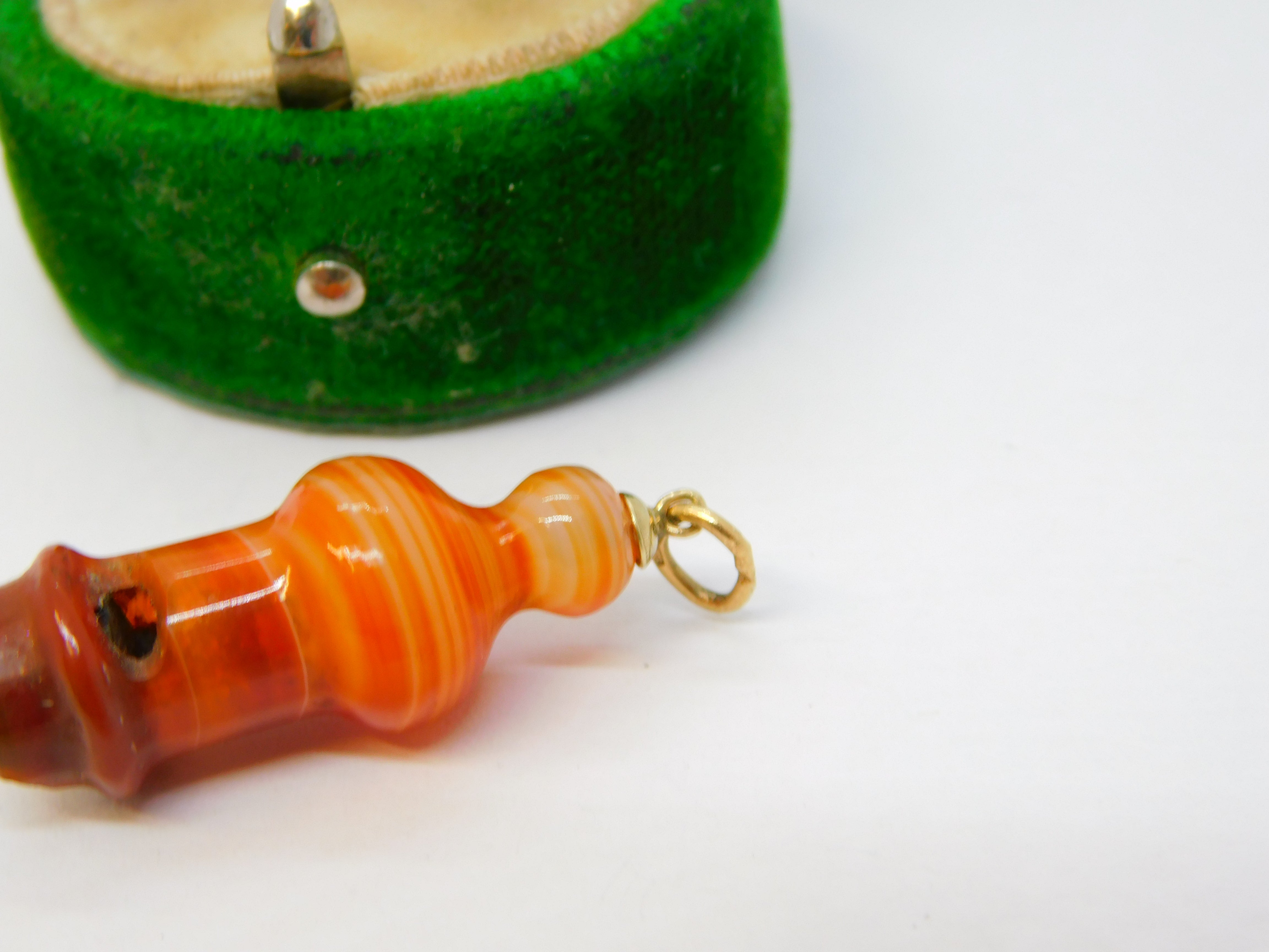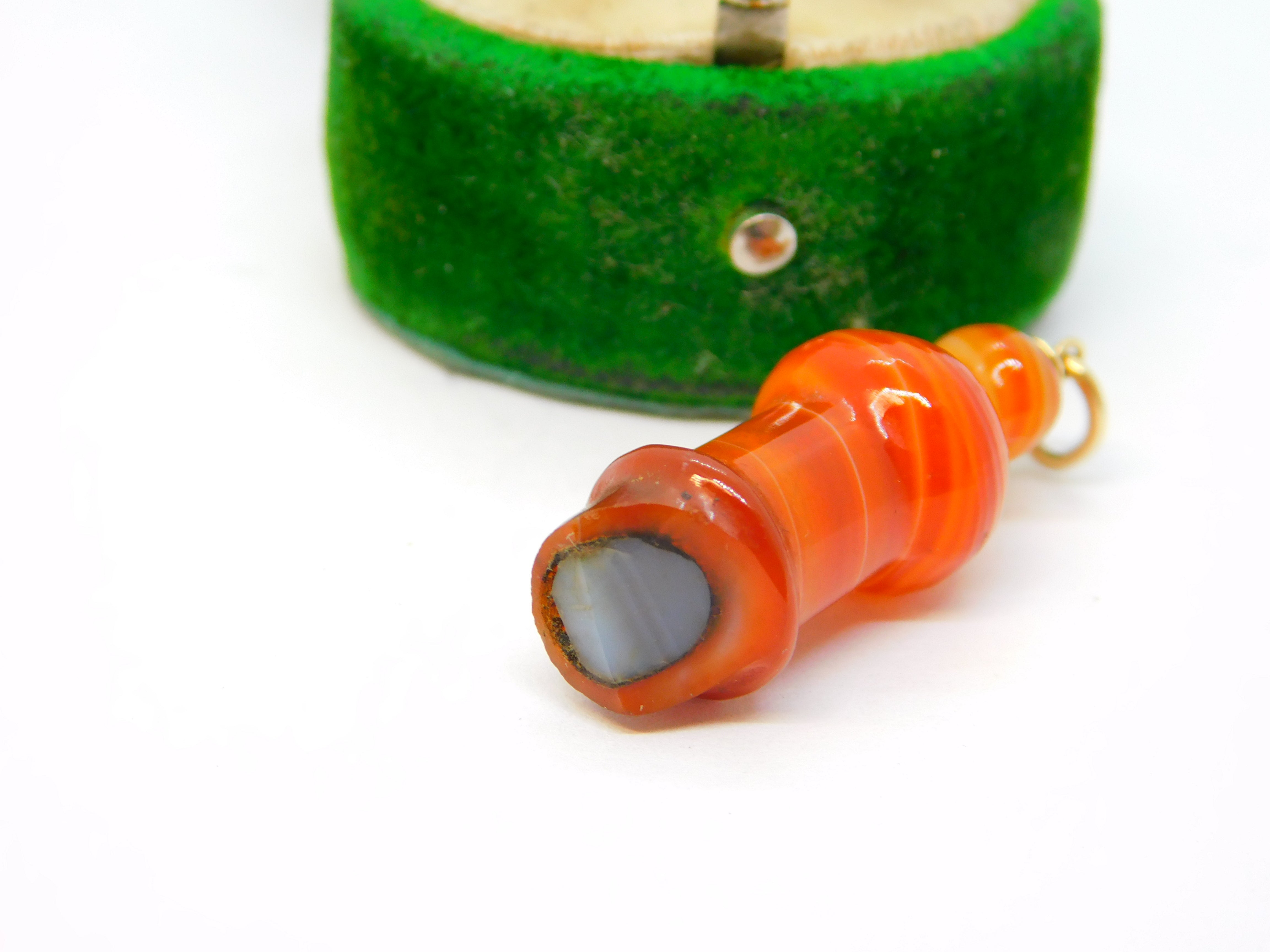 Details: A fantastic and wonderfully designed antique Victorian Scottish 9ct gold and carved red banded agate novelty whistle charm or pendant with lovely detailing c1860, the gold jump ring is hallmarked and is later. This is a wonderful item that would make a perfect gift or addition to any collection. The BOX pictured is for PRESENTATION ONLY and is NOT included in the listings but used to frame the pictures unless specifically stated otherwise.