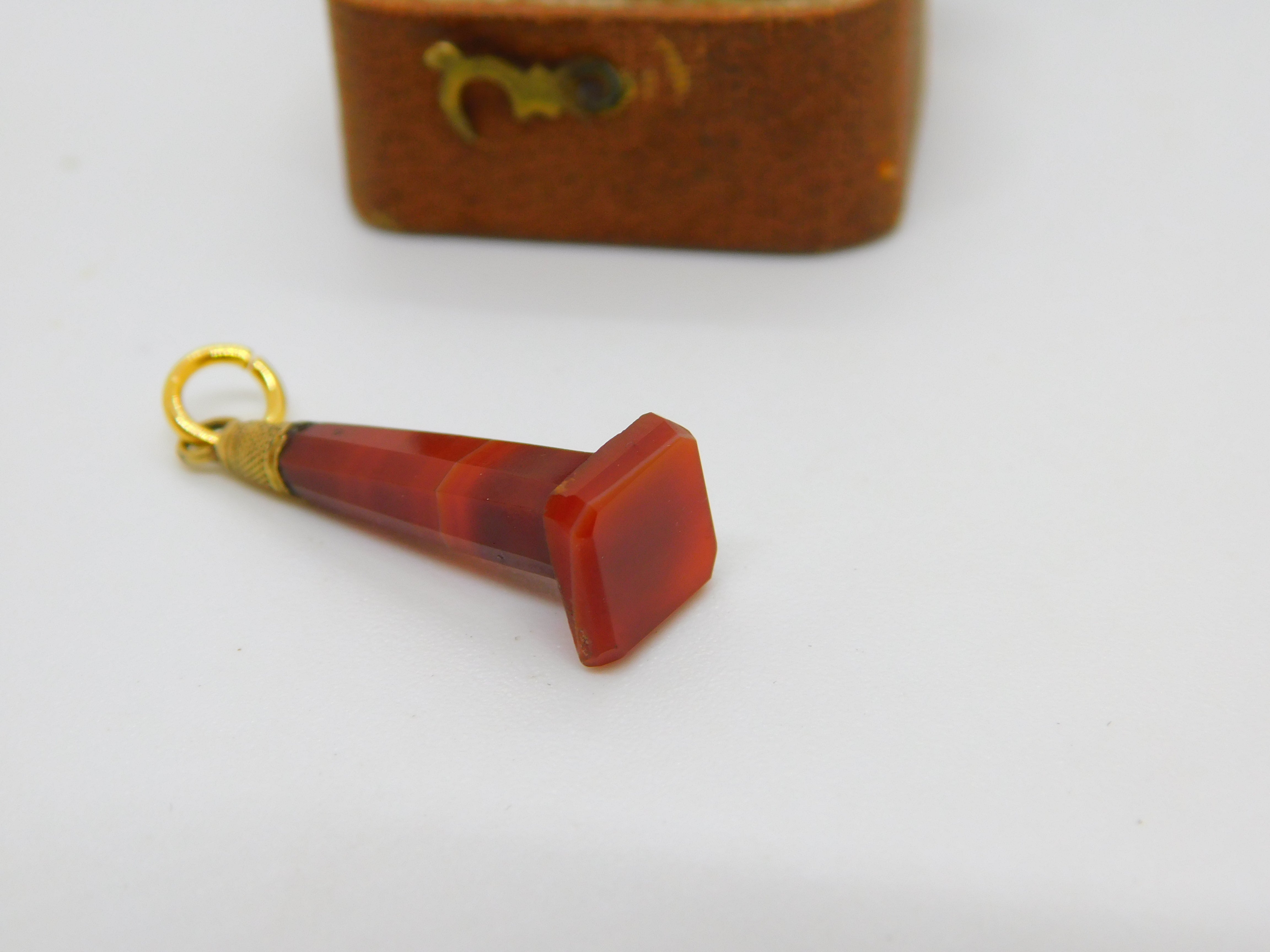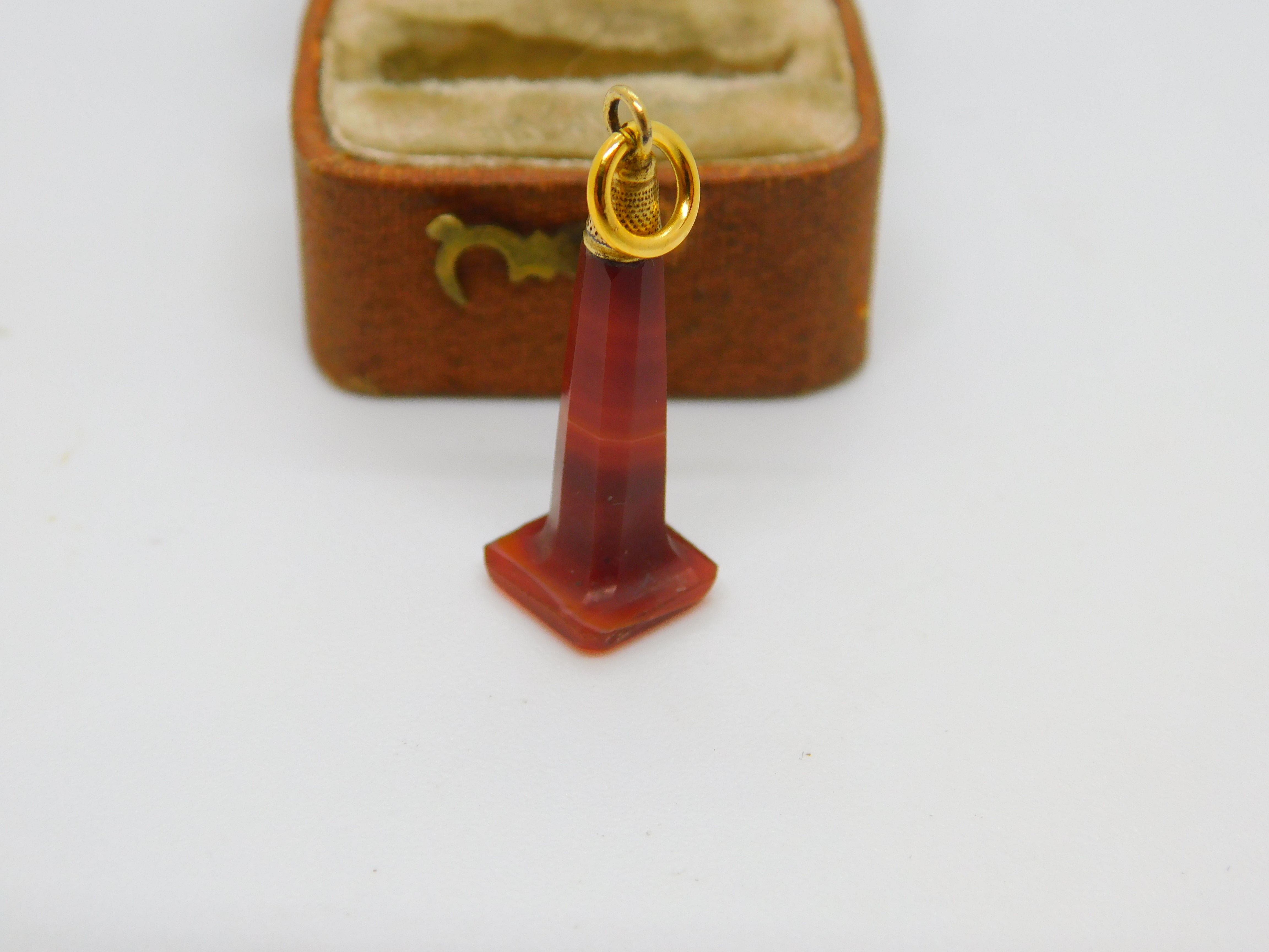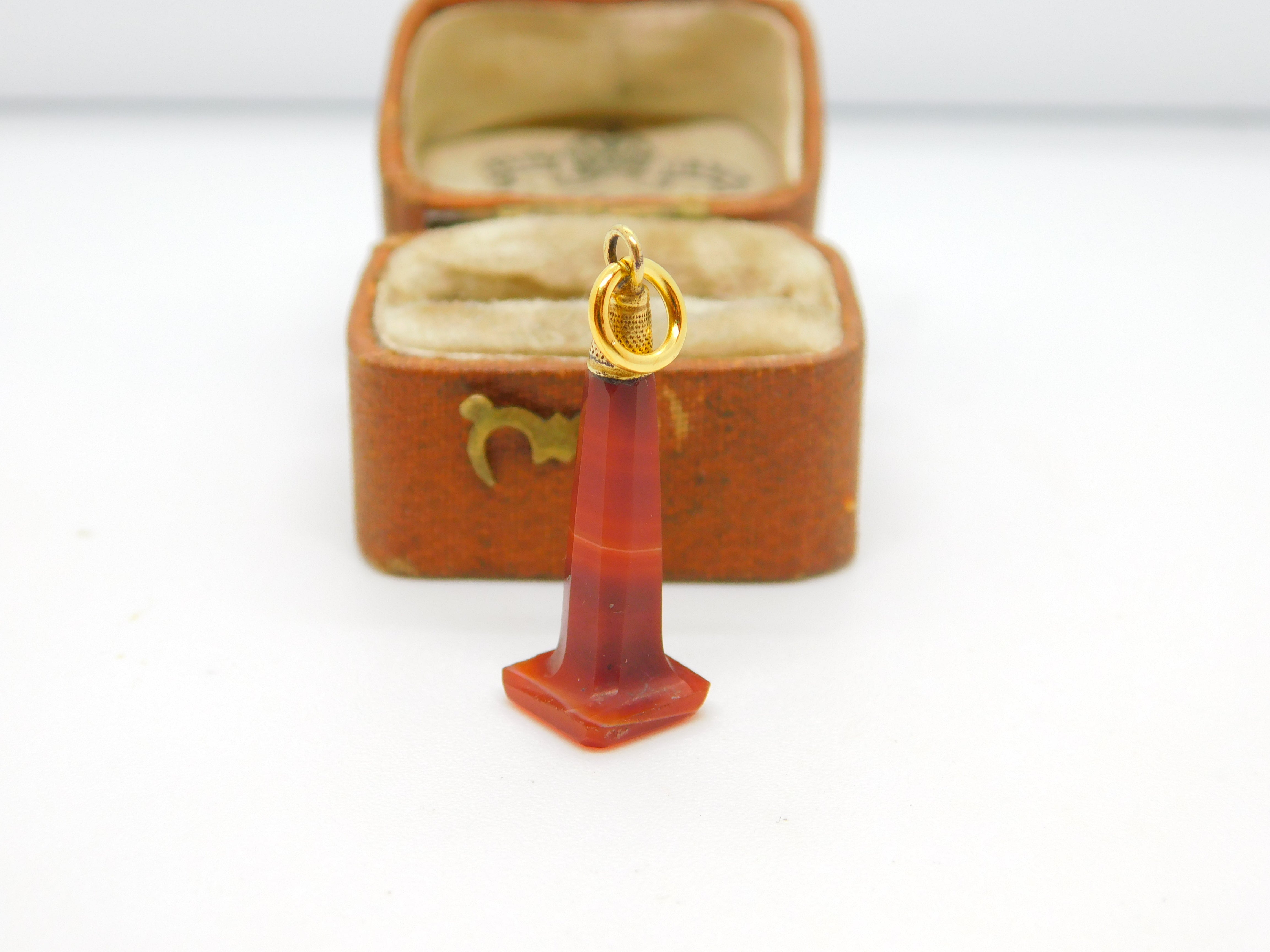 Victorian 9ct Gold & Carved Red Banded Agate Obelisk Fob Pendant c1860 Antique