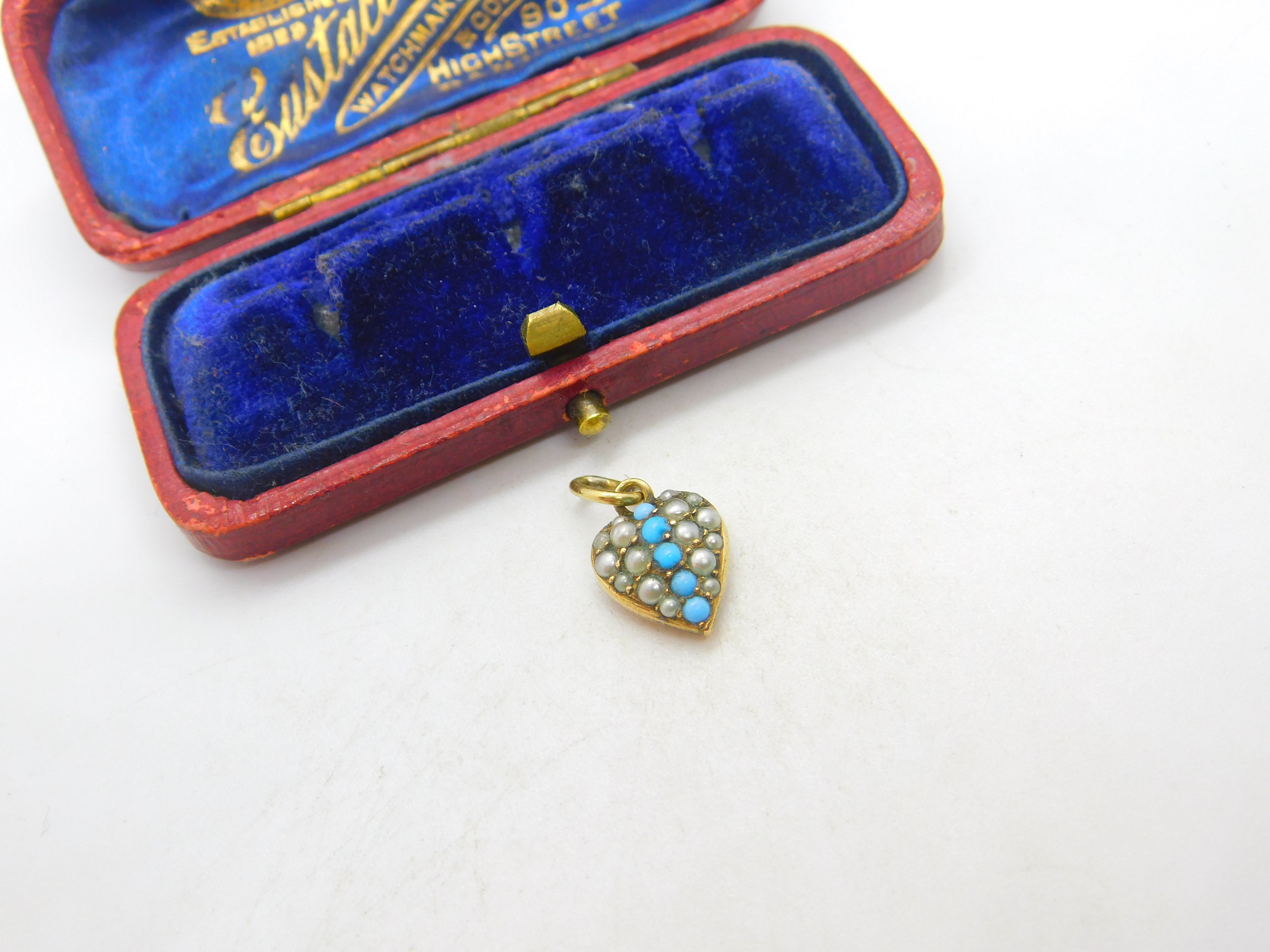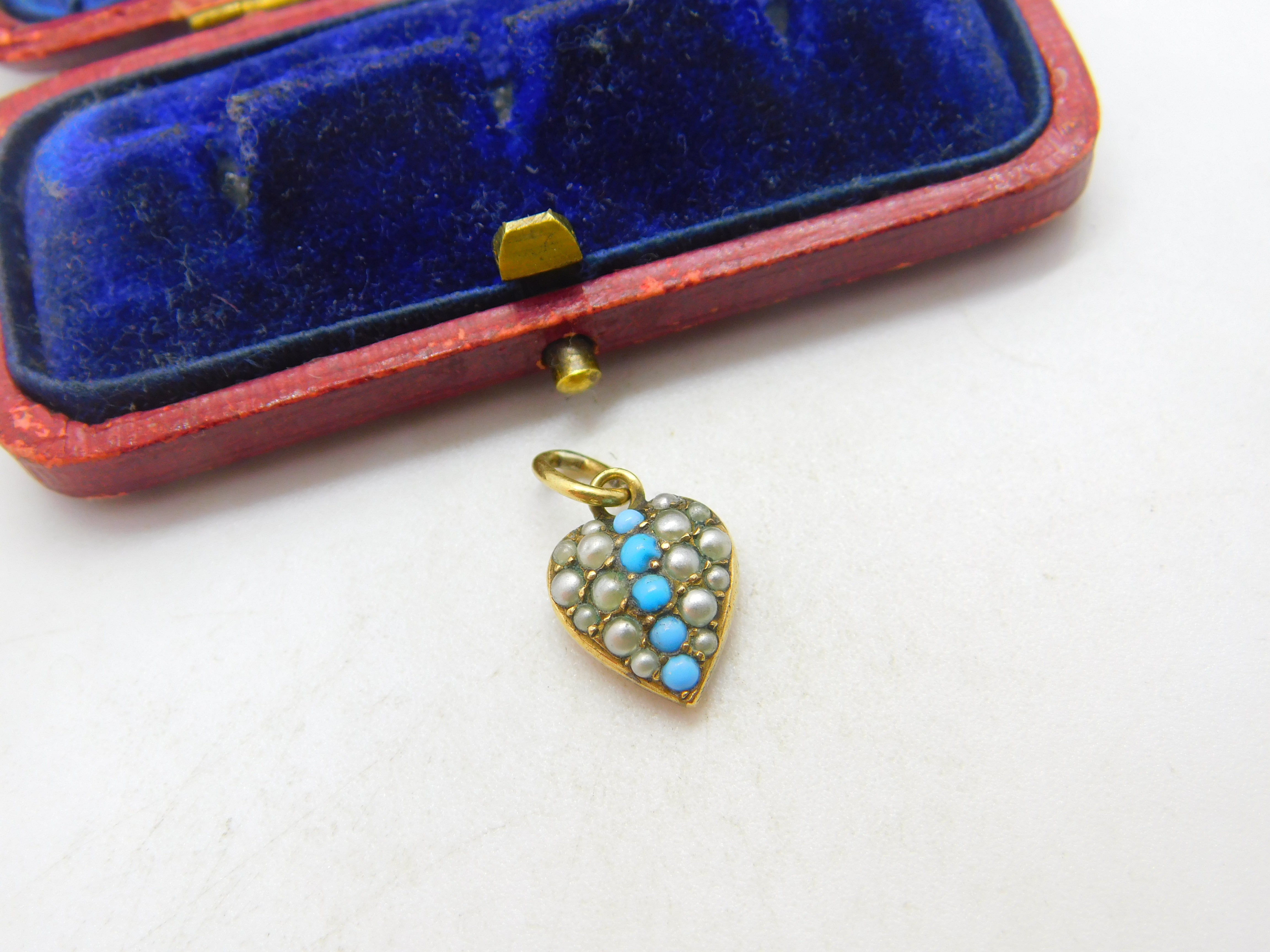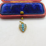 Victorian 9ct Gold Cased, Seed Pearl & Turquoise Heart Drop Pendant Antique