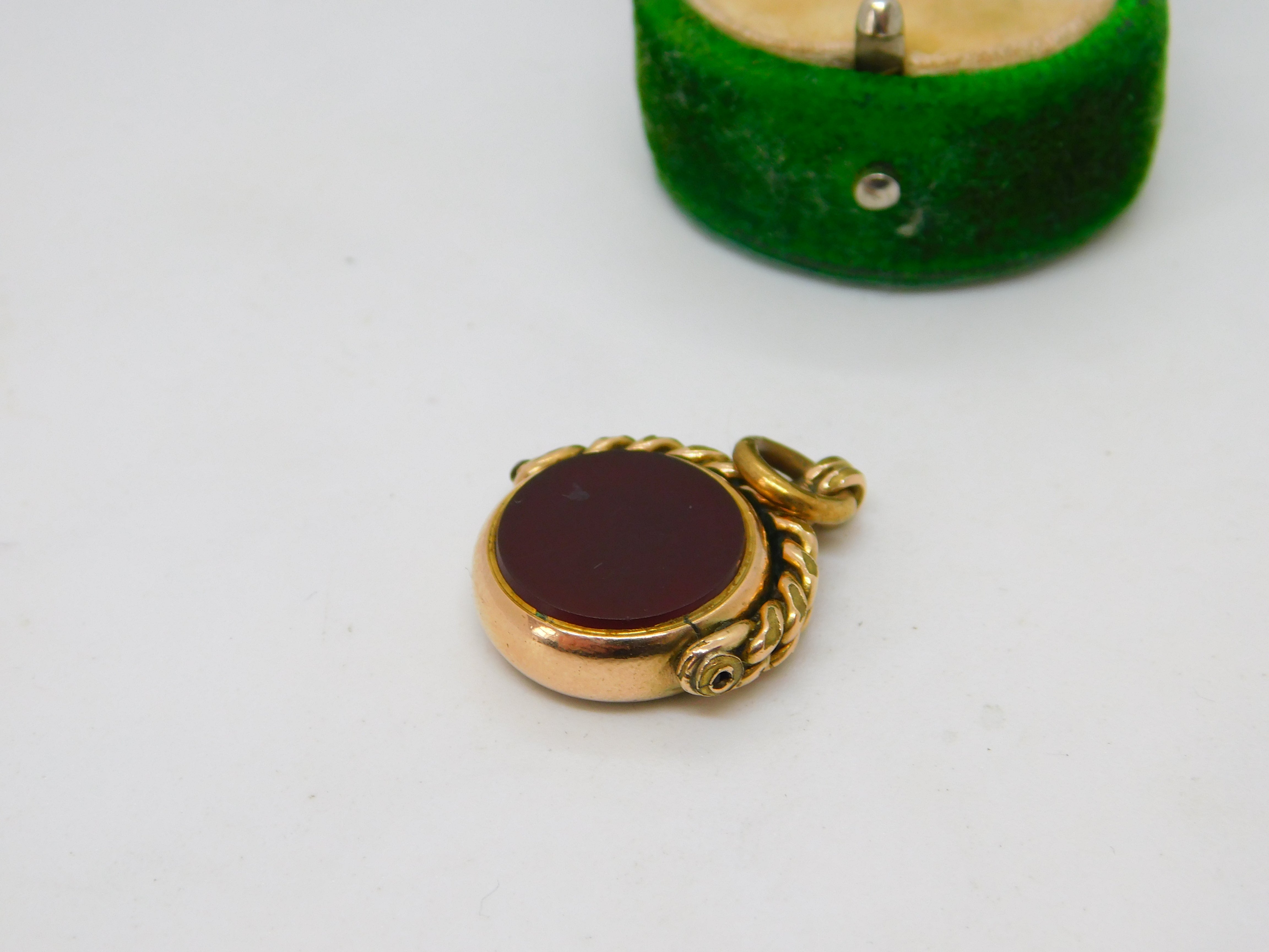 Details: A fantastic and wonderfully designed antique Victorian 9ct gold bloodstone & carnelian spinner fob pendant with rolled gold fixings c1890, the gold has been tested that holds the stones. This is a wonderful item that would make a perfect gift or addition to any collection. The BOX pictured is for PRESENTATION ONLY and is NOT included in the listings but used to frame the pictures unless specifically stated otherwise.