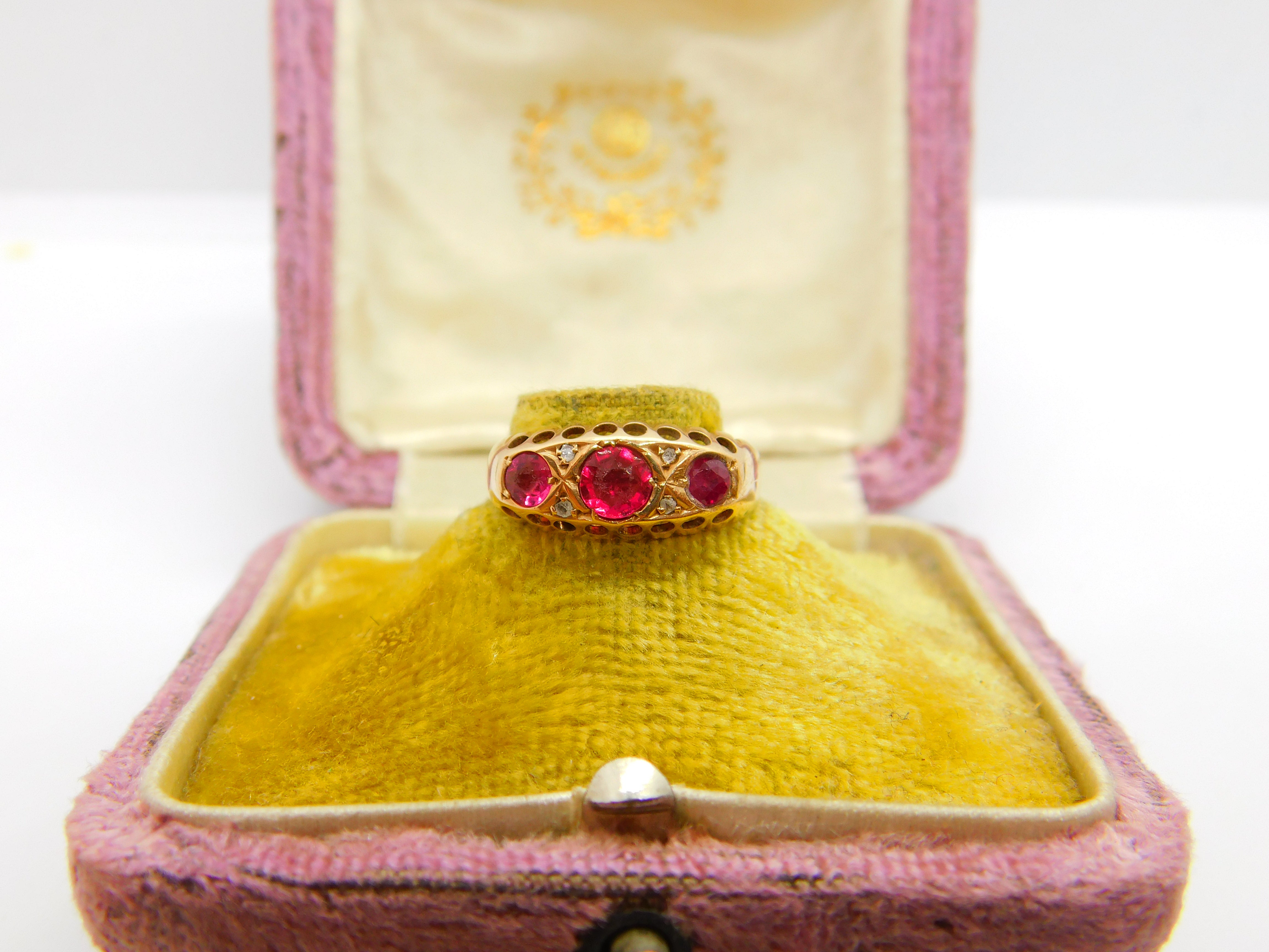 Details: A fantastic and wonderfully designed antique Victorian 9ct yellow gold boat ring set with rubies and diamonds (the central stone does not test as ruby and is slightly loose) hallmarked Chester c1890 to the interior band. This is a wonderful item that would make a perfect gift or addition to any collection. The BOX pictured is for PRESENTATION ONLY and is NOT included in the listings but used to frame the pictures unless specifically stated otherwise.