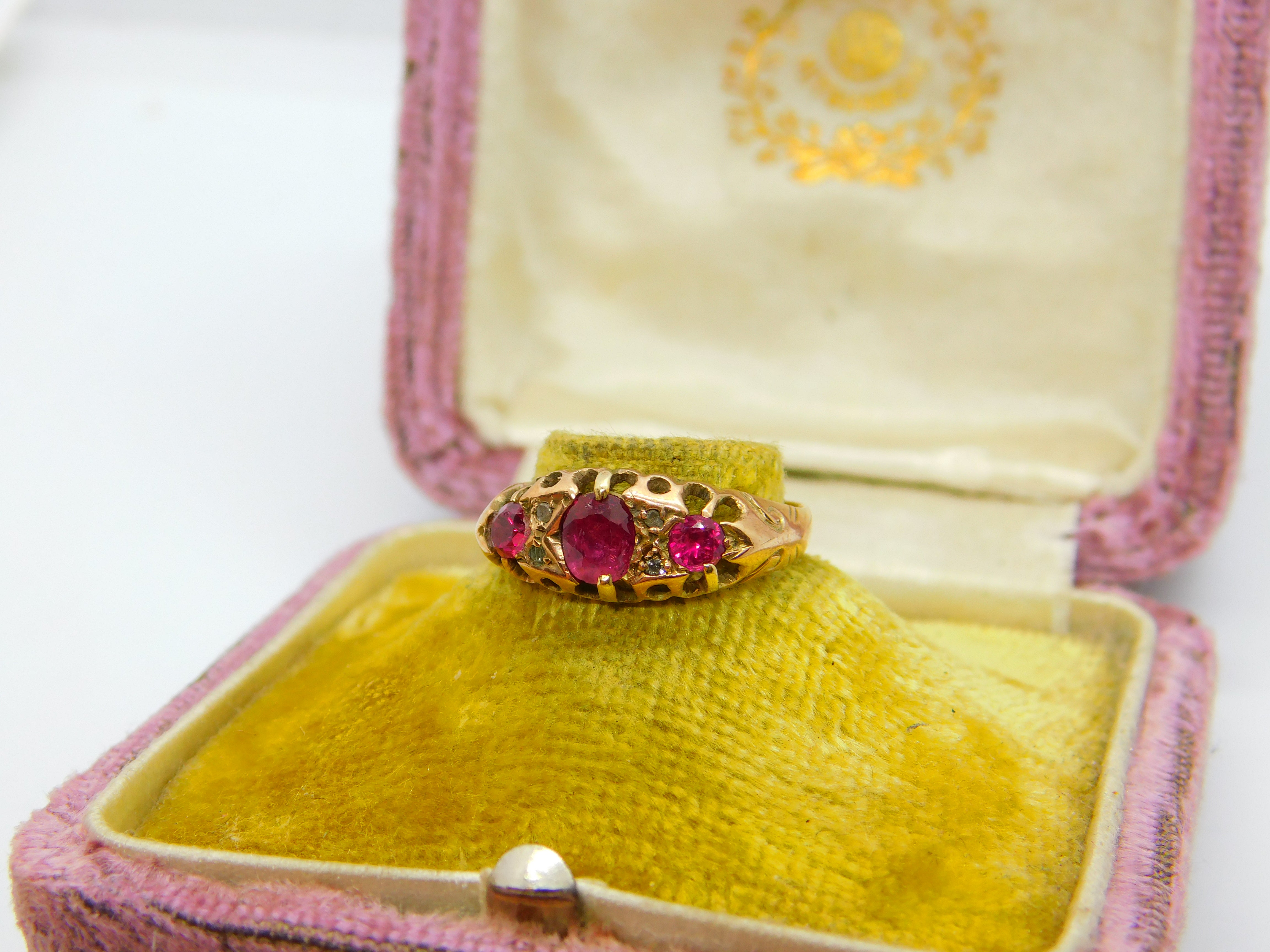Details: A fantastic and wonderfully designed antique Victorian 9ct yellow gold boat ring set with natural ruby and diamond stones hallmarked Birmingham, 1890. The stones have been tested. This is a wonderful item that would make a perfect gift or addition to any collection. The BOX pictured is for PRESENTATION ONLY and is NOT included in the listings but used to frame the pictures unless specifically stated otherwise.