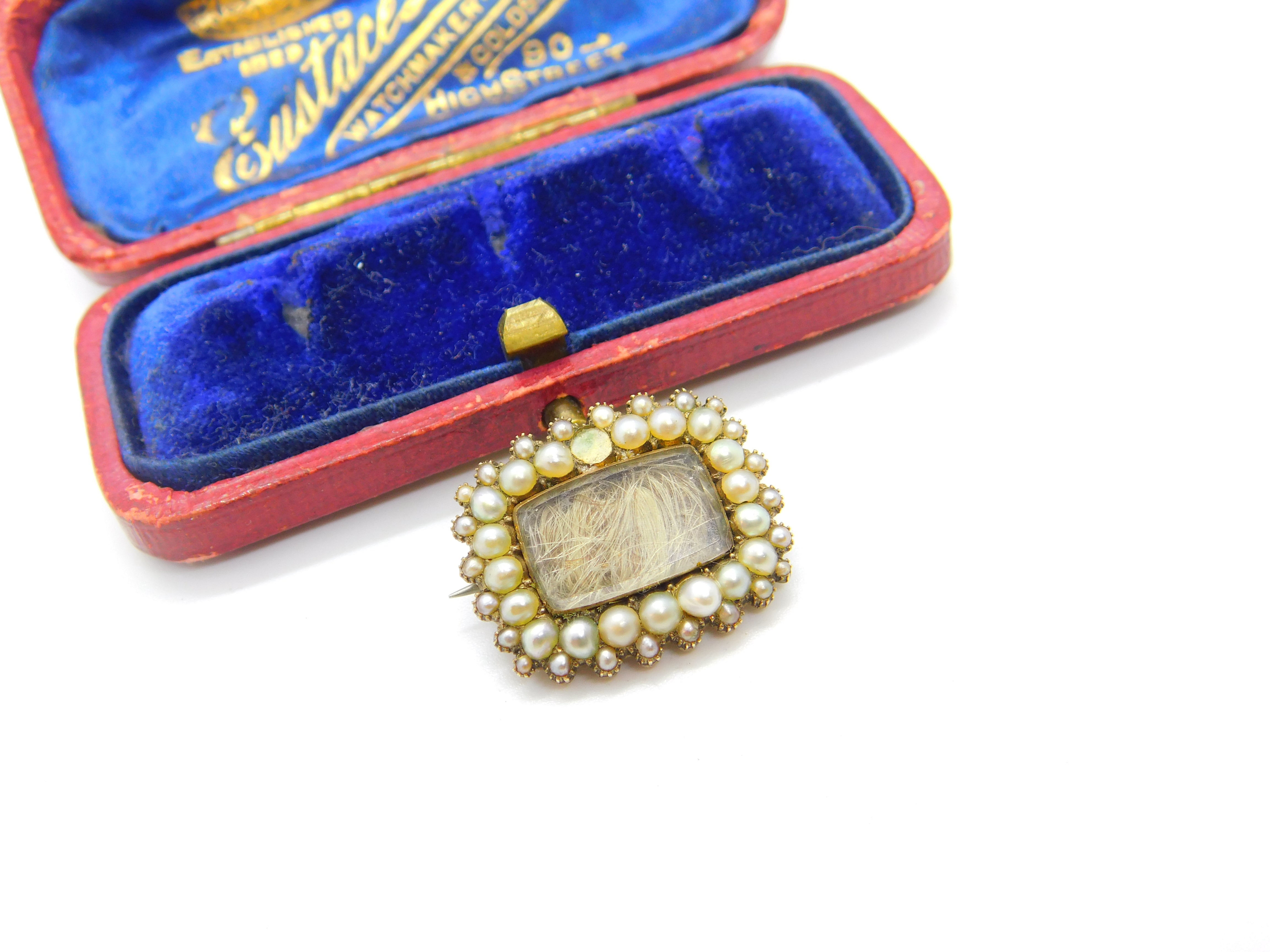 Details: A fantastic and wonderfully designed antique early Victorian 9ct gold, seed pearl and hair plait mourning brooch c1850 - missing one pearl although easily replaced and the gold has been XRF tested. This is a wonderful item that would make a perfect gift or addition to any collection. The BOX pictured is for PRESENTATION ONLY and is NOT included in the listings but used to frame the pictures unless specifically stated otherwise.