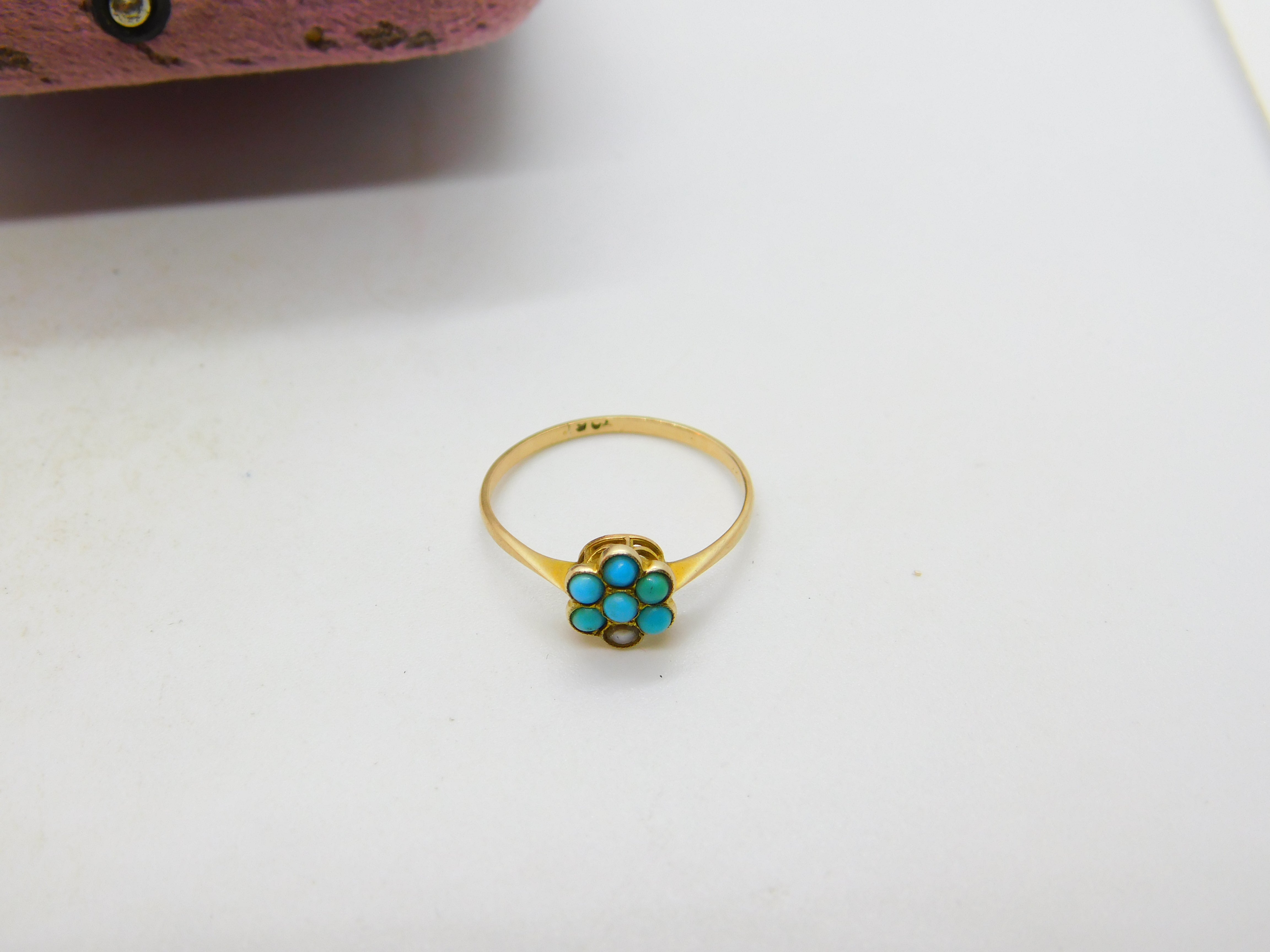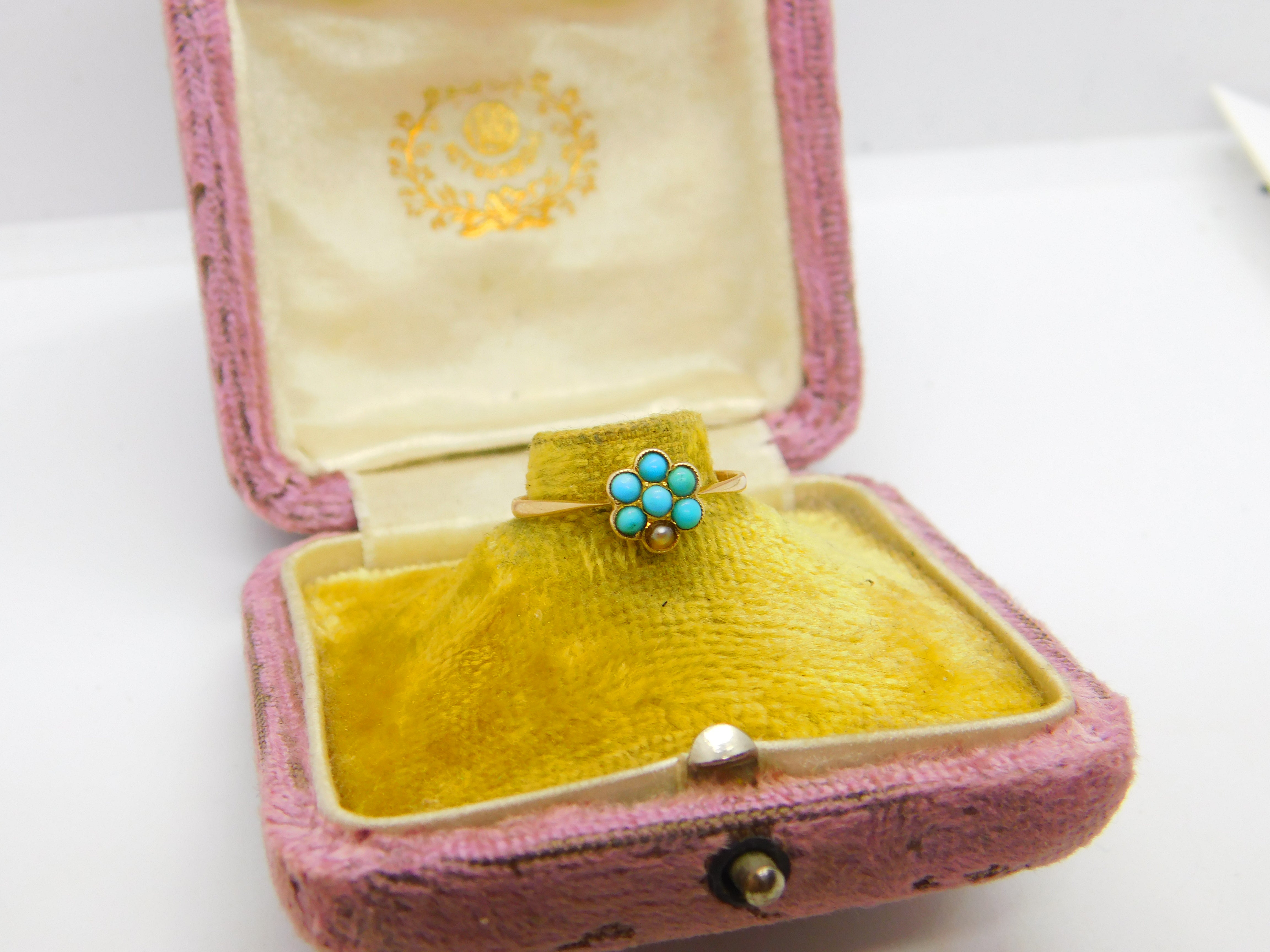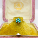 Victorian 9ct Gold, Seed Pearl & Turquoise Floral Cluster Ring c1890 Antique
