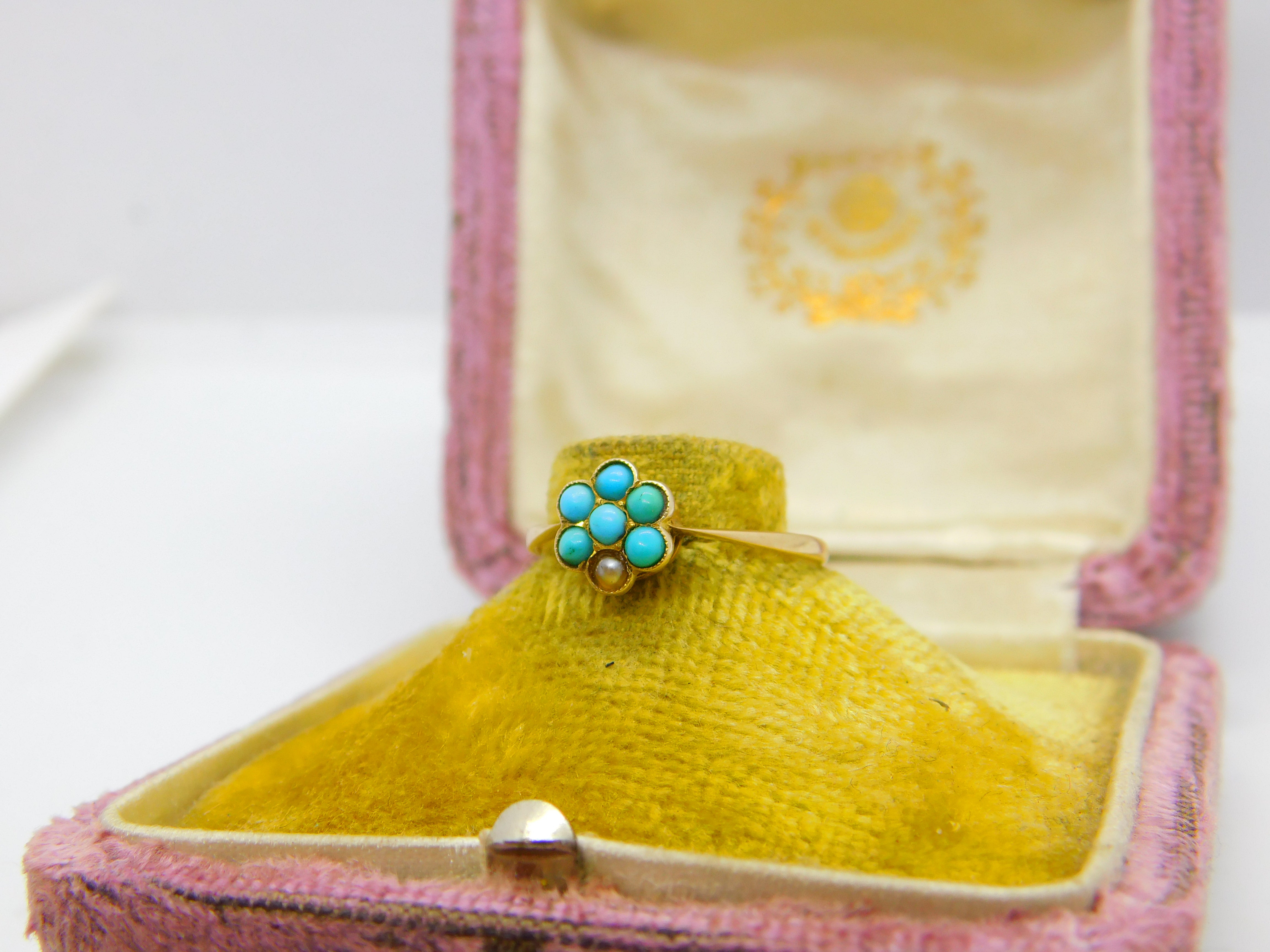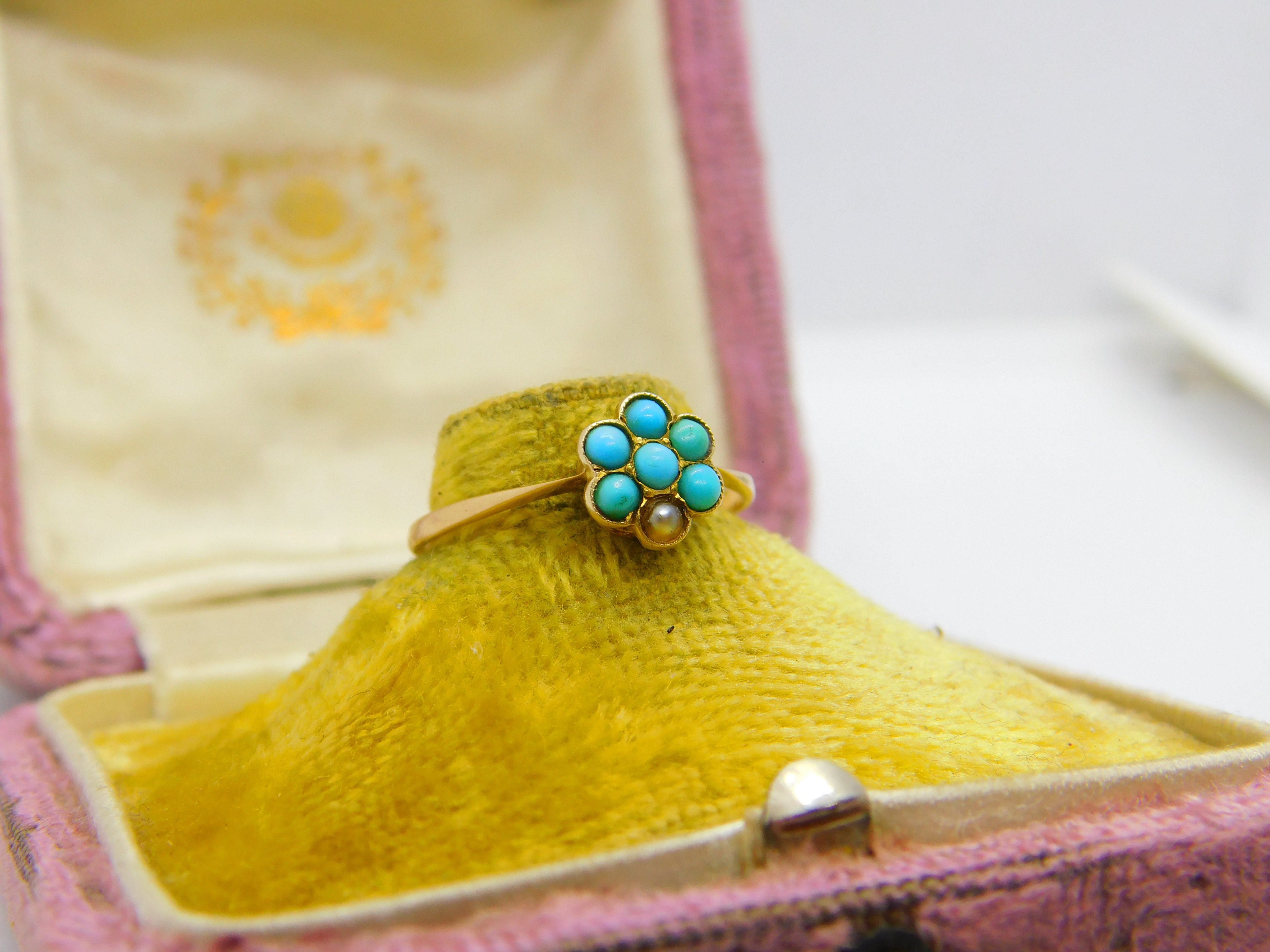 Details: A fantastic and wonderfully designed antique Victorian 9ct yellow gold, seed pearl & turquoise floral cluster ring c1890 marked to the interior band. This is a wonderful item that would make a perfect gift or addition to any collection. The BOX pictured is for PRESENTATION ONLY and is NOT included in the listings but used to frame the pictures unless specifically stated otherwise.