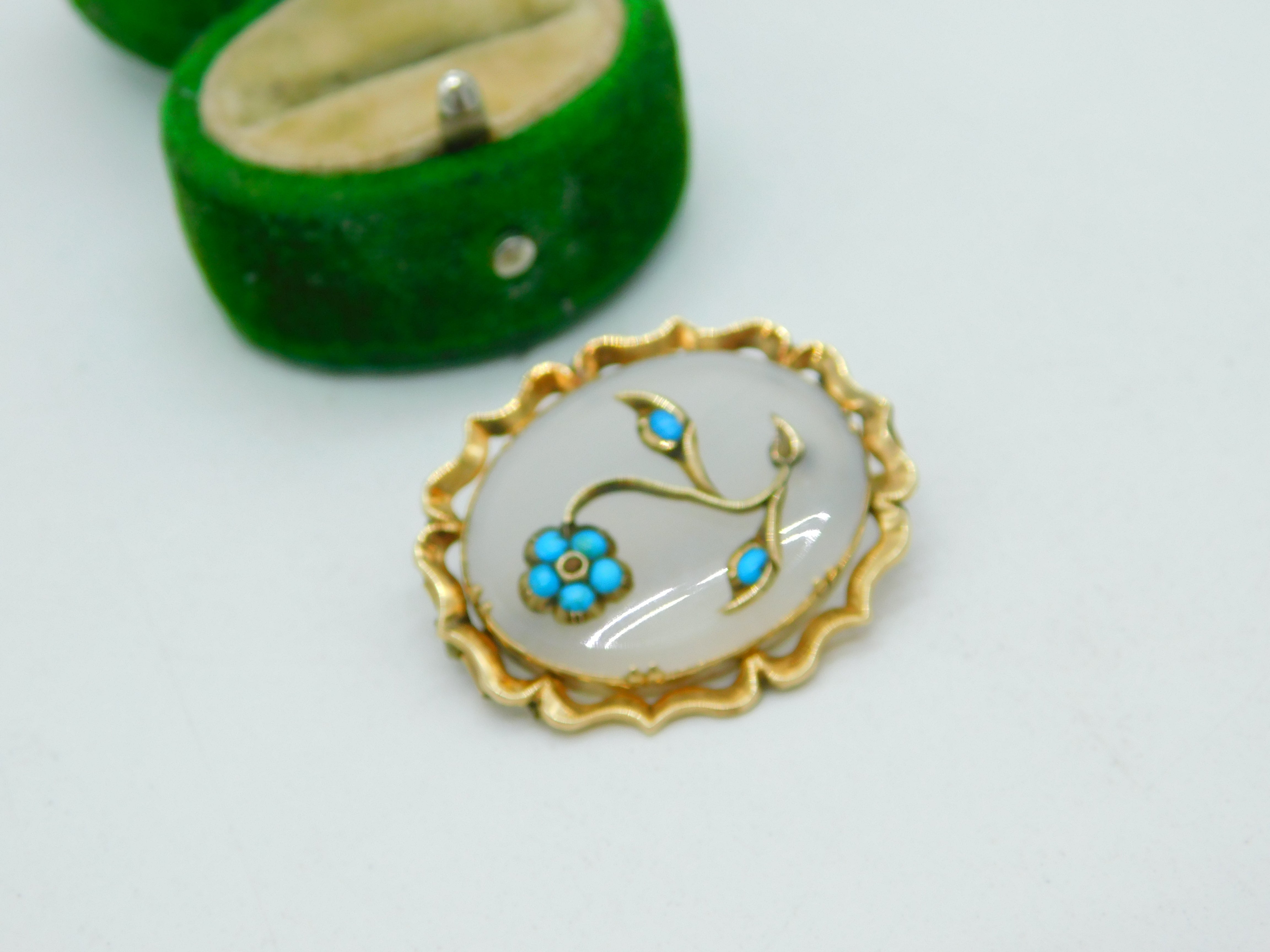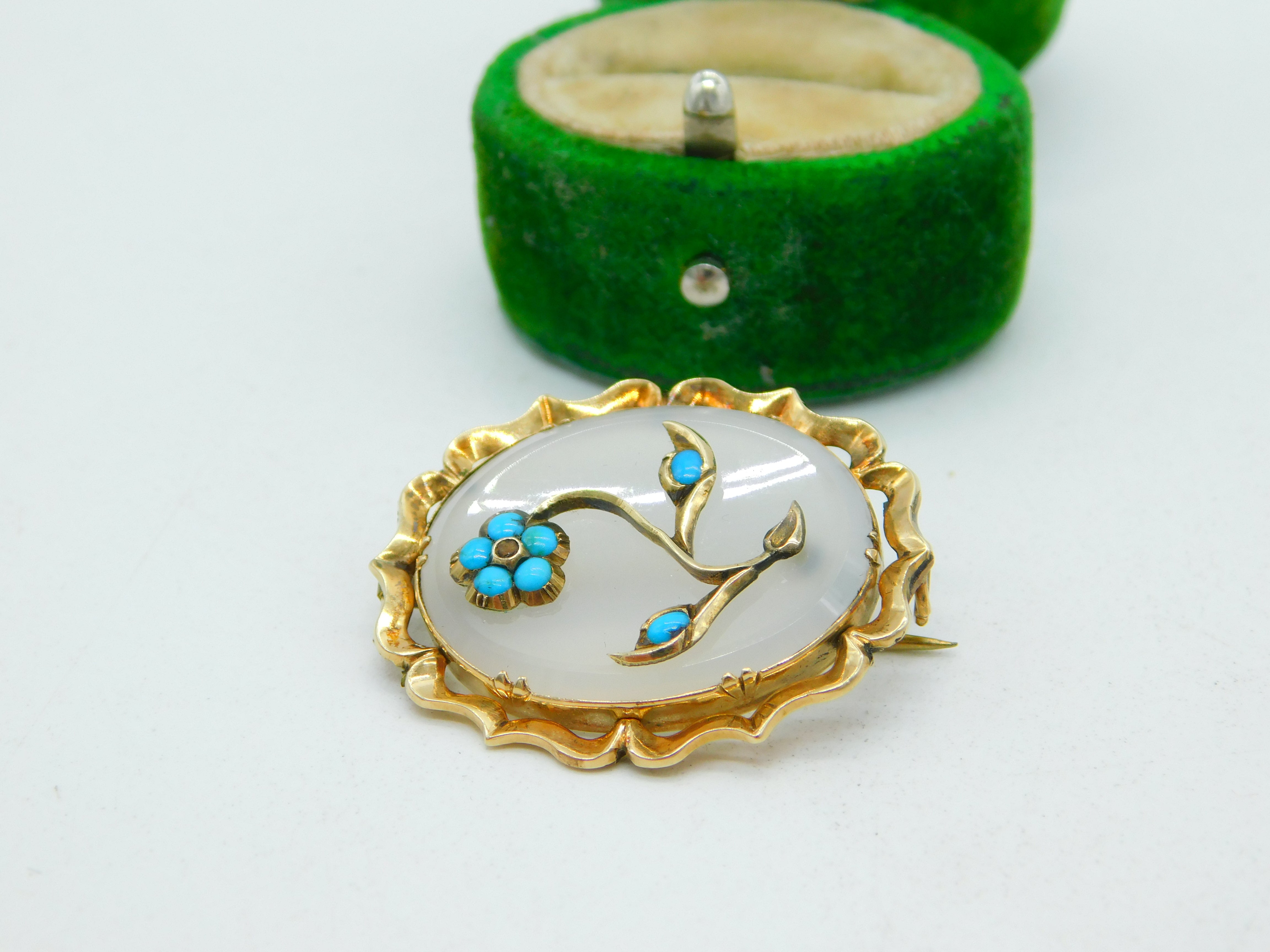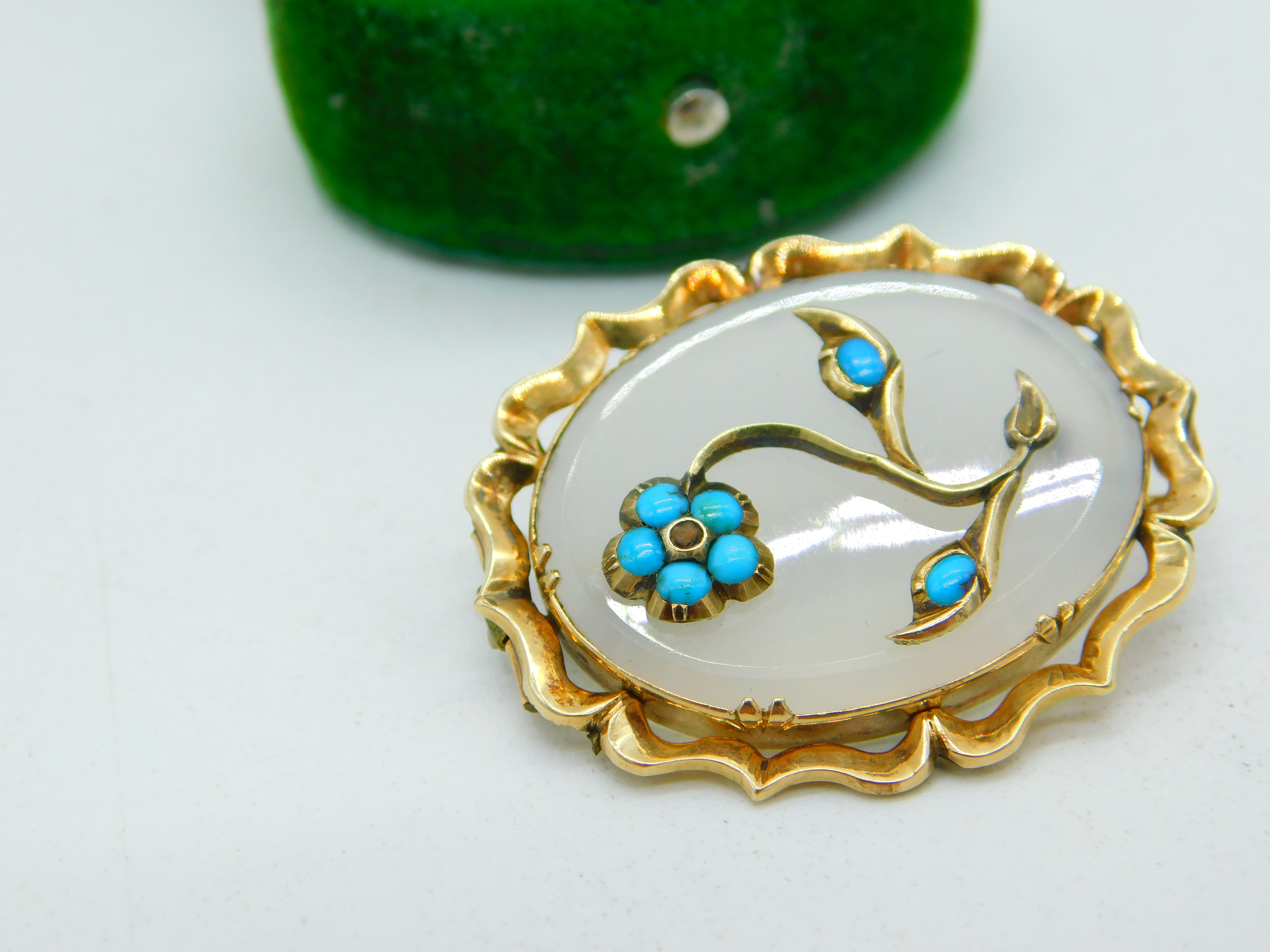 Details: A fantastic and wonderfully designed antique Victorian 9ct yellow gold, chalcedony agate and turquoise flower brooch c1860, the gold has been XRF tested as it is unmarked. This is a wonderful item that would make a perfect gift or addition to any collection. The BOX pictured is for PRESENTATION ONLY and is NOT included in the listings but used to frame the pictures unless specifically stated otherwise.