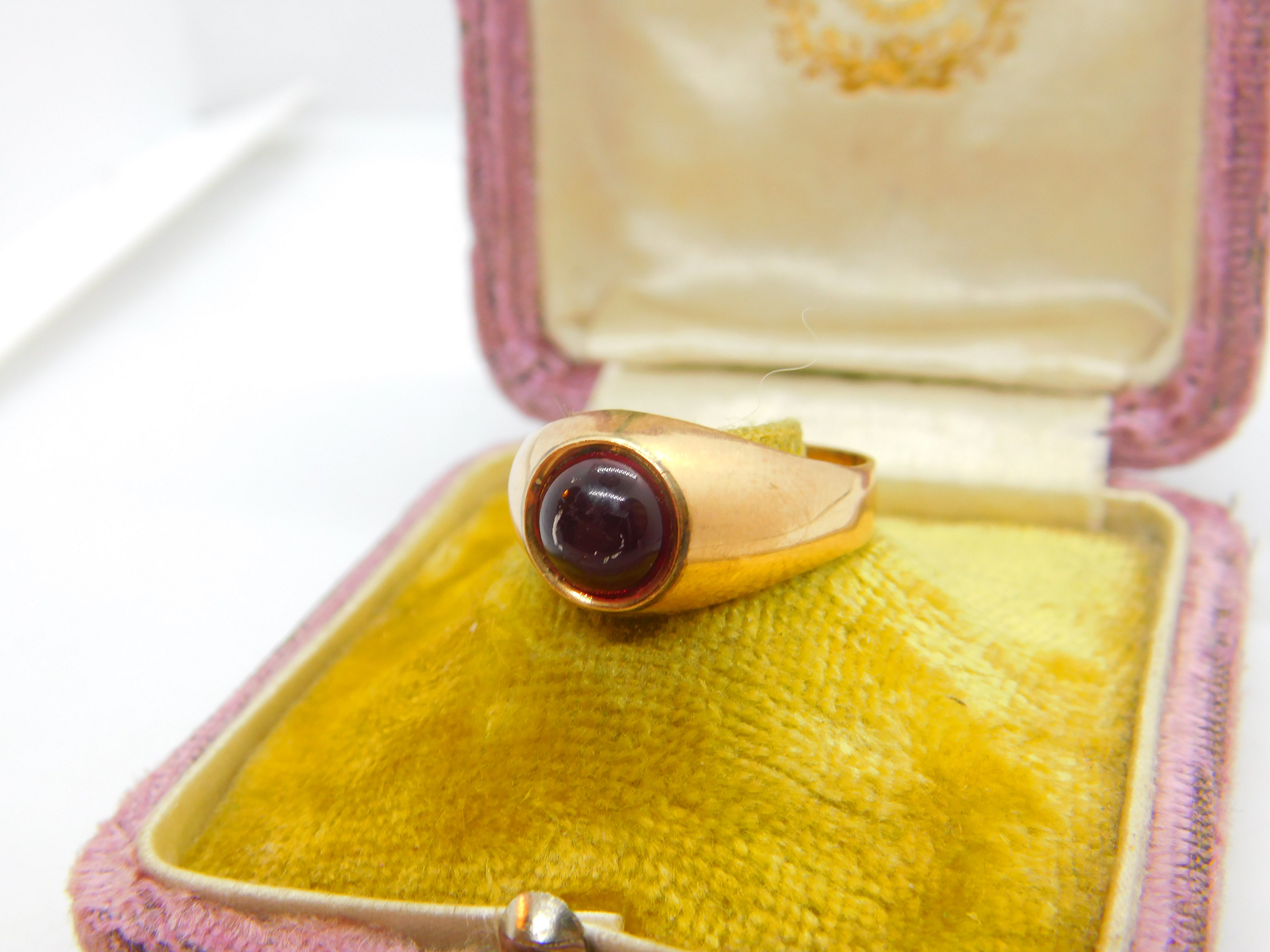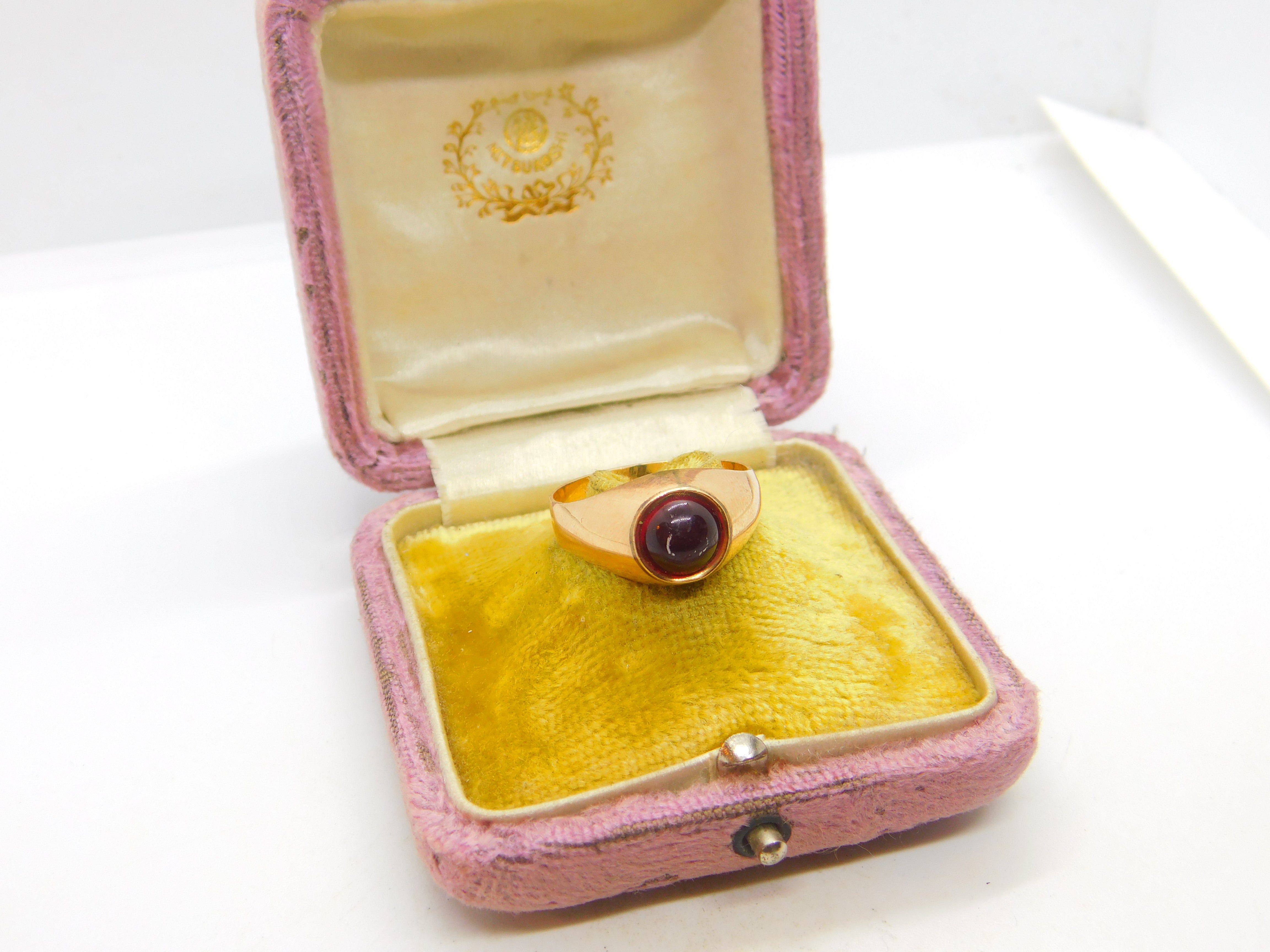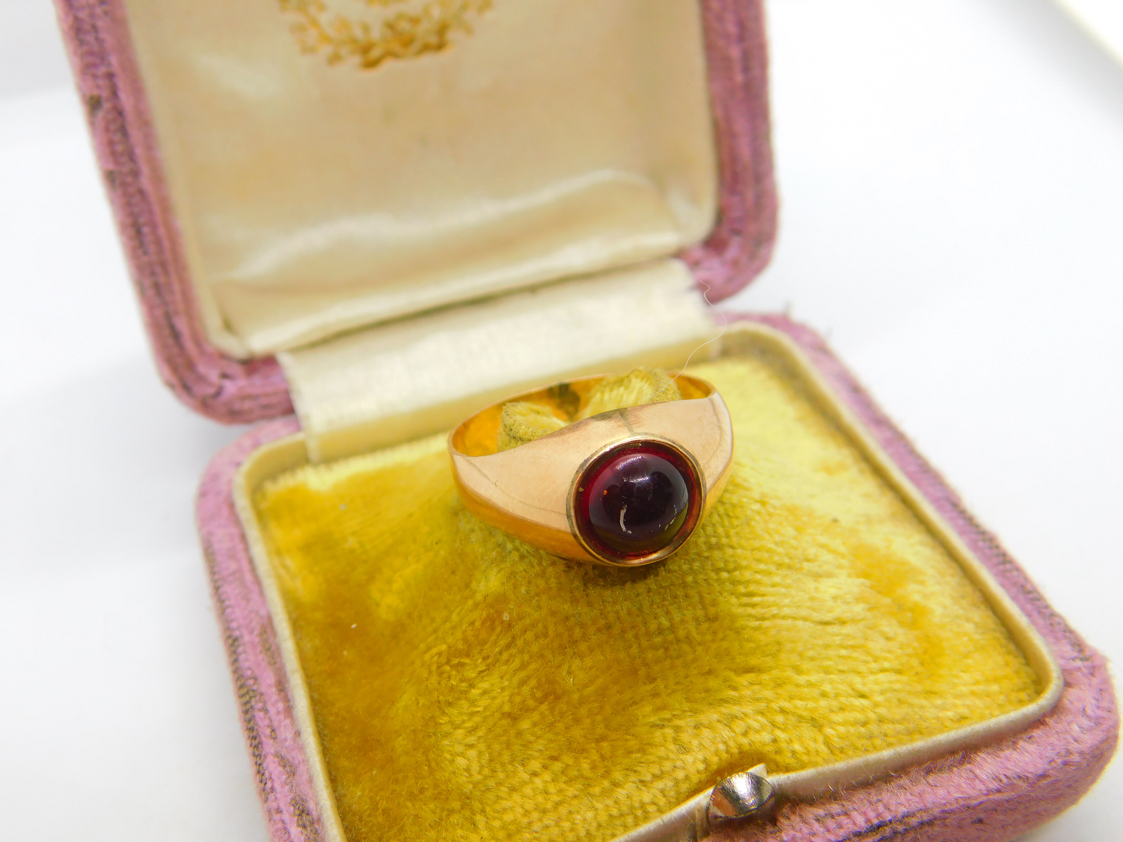 Details: A fantastic and wonderfully designed antique Victorian 9ct rose gold signet ring set with cabochon cut central garnet hallmarked to the outer band 14 and also 9 c1880. Please note the central stone has scratches. This is a wonderful item that would make a perfect gift or addition to any collection. The BOX pictured is for PRESENTATION ONLY and is NOT included in the listings but used to frame the pictures unless specifically stated otherwise.