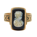 Details: A fantastic and wonderfully designed antique Victorian 9ct rose gold mourning ring with floral engraved shoulders, set with a wonderful carved black hardstone cameo depicting a female figure in classical style c1850s, the gold has been XRF tested as it is unmarked. This is a wonderful item that would make a perfect gift or addition to any collection. We are more than happy to provide XRF reports for items upon request.